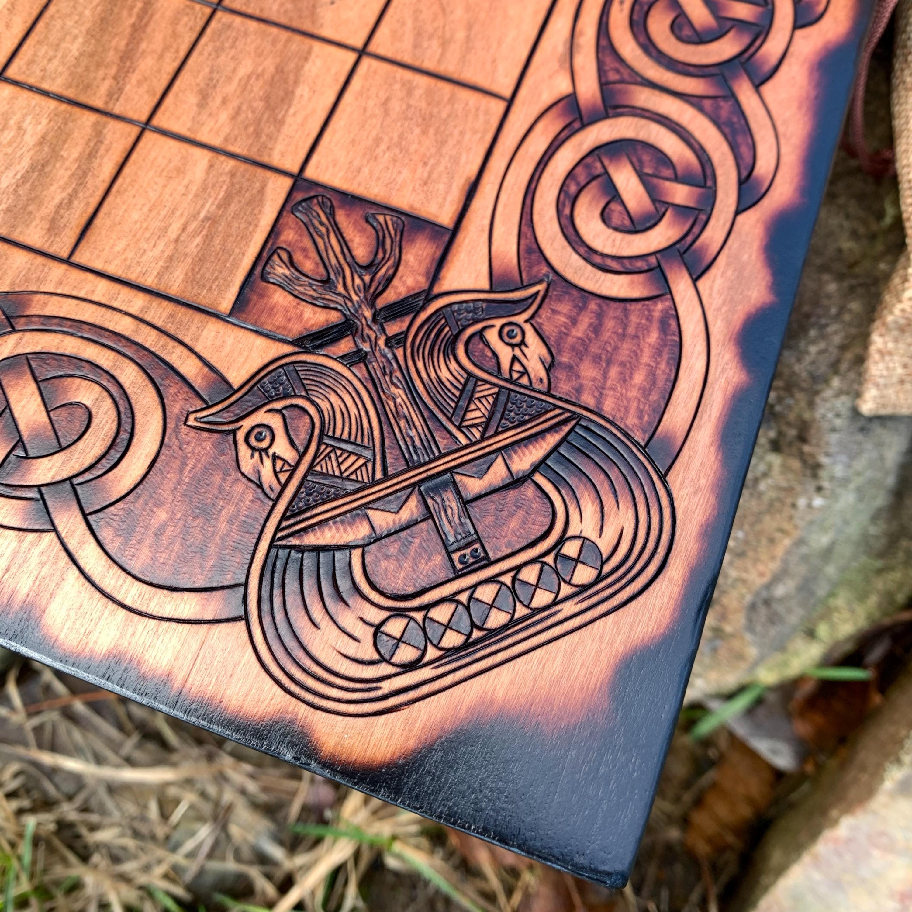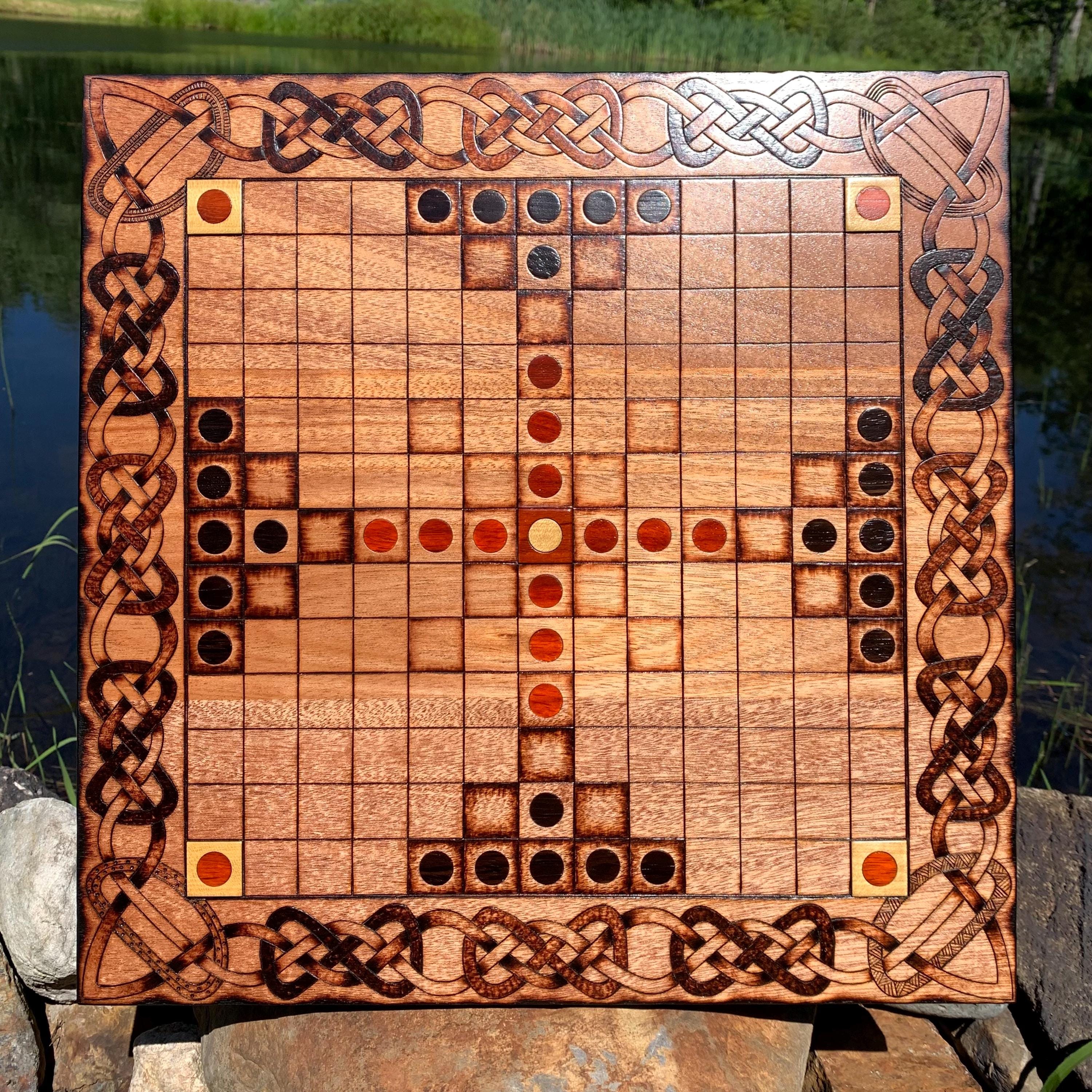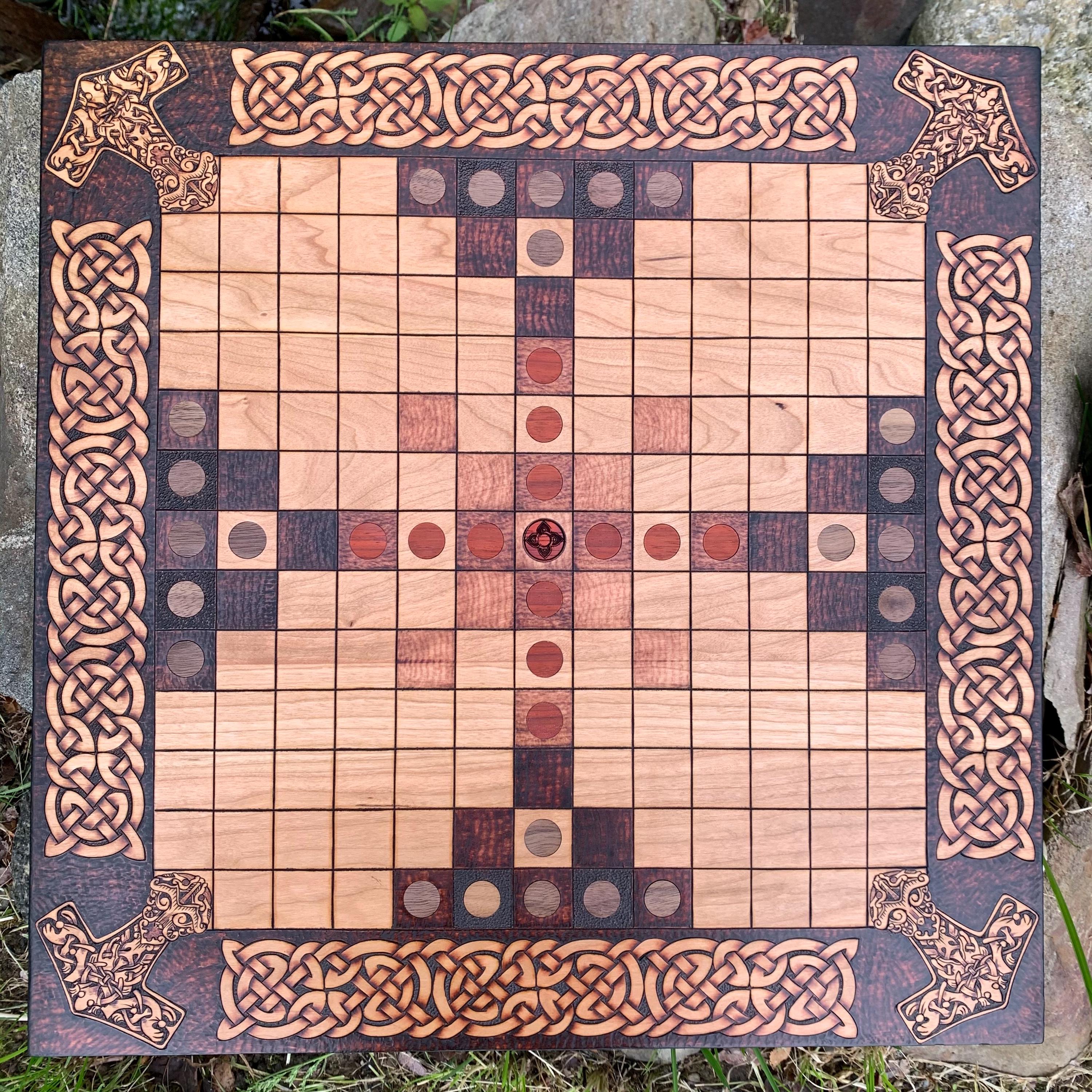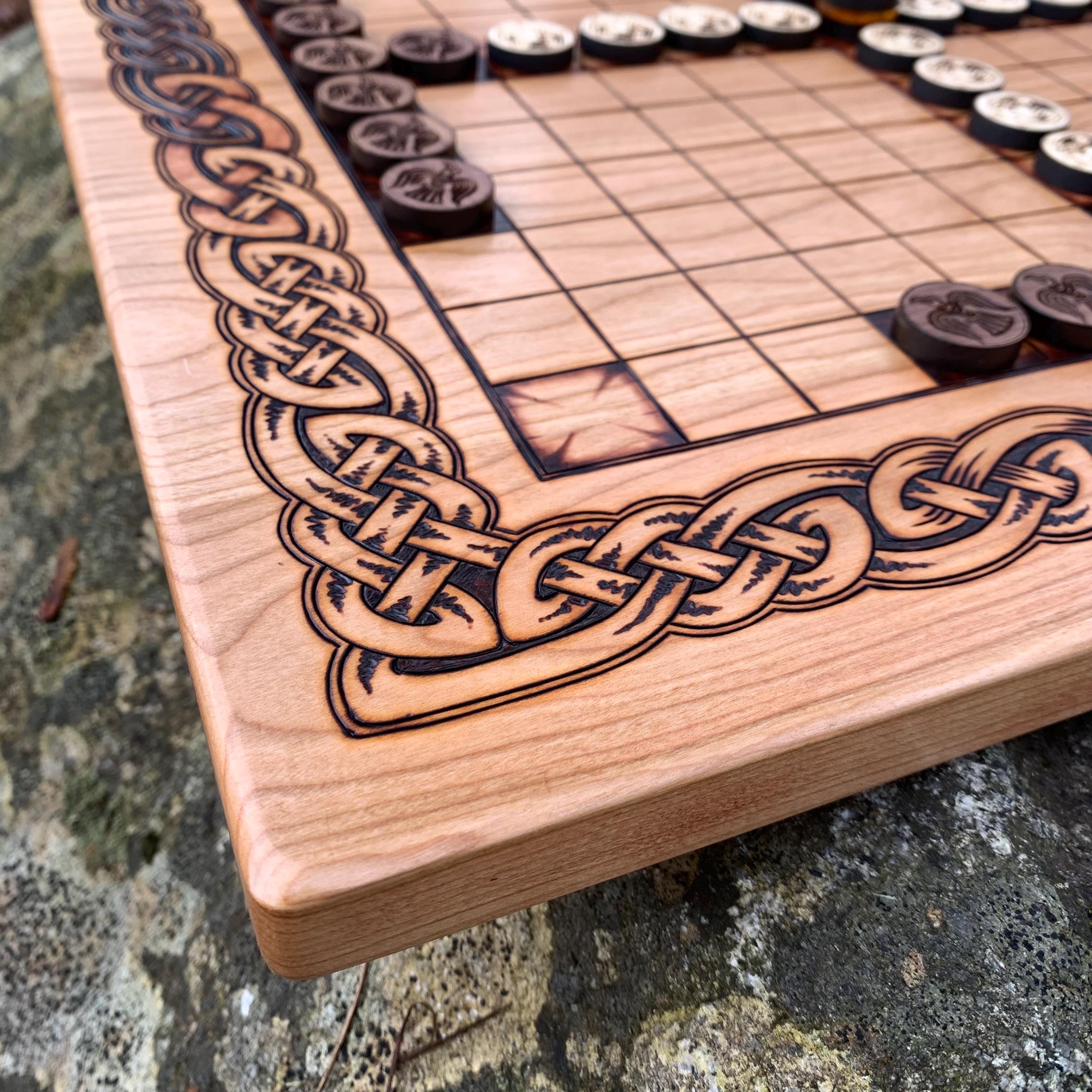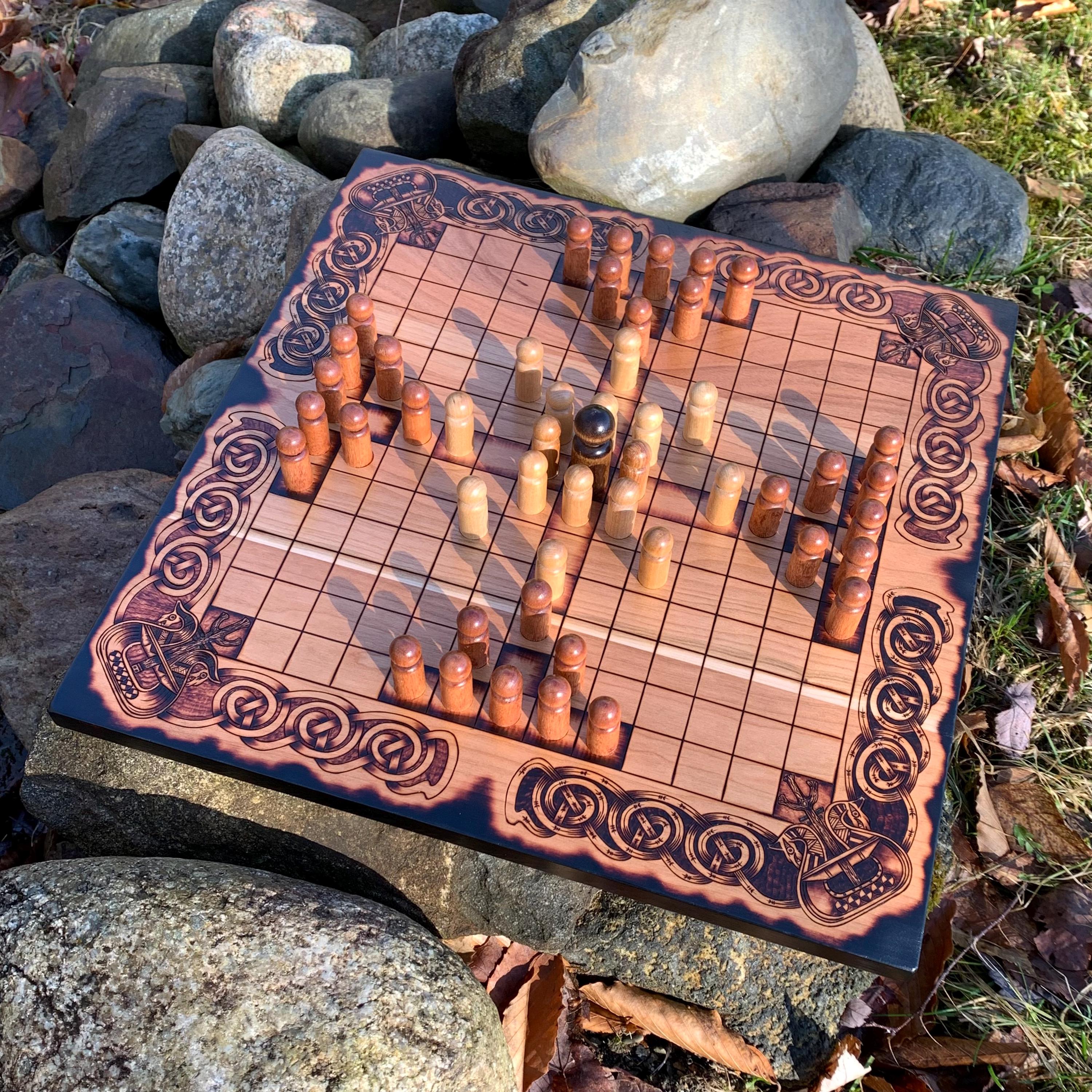 This handcrafted wooden game features historically-inspired artwork burned into the wood surface by hand, and many custom options to make each board created a unique and functional work of art. Hnefatafl, the game of the Vikings, is a strategy board game that traveled with Scandinavian explorers, traders, and raiders alike, and was adopted by many of the cultures they encountered. It is reputed to be one of the oldest games in the world, with origins that can be traced back to a game called Petteia, played by the ancient Greeks. This variant of Hnefatafl, with a play grid of 13x13 squares, is based upon a discovered board fragment from the Gokstad ship burial in Norway. Hnefatafl is an intriguing way to learn strategy and tactics, as well as an excellent means to spend quality time with a friend or family member. Each board is created uniquely from the next and is sure to bring enjoyment for generations to come.
