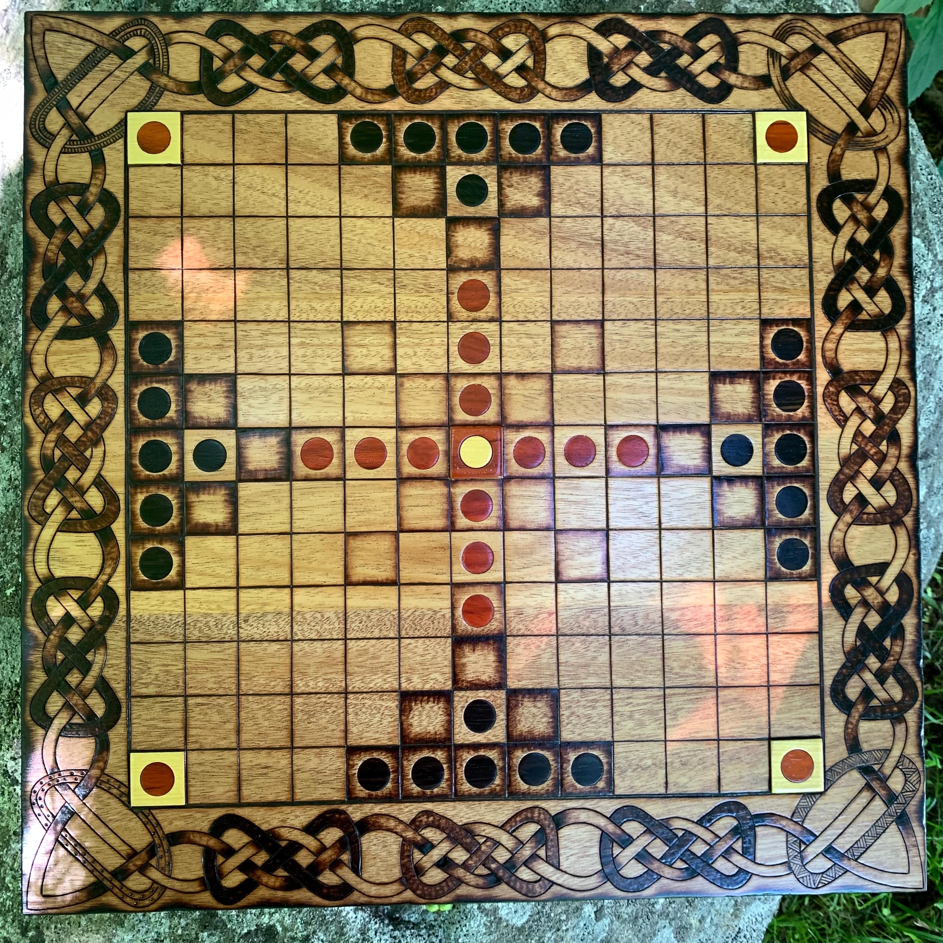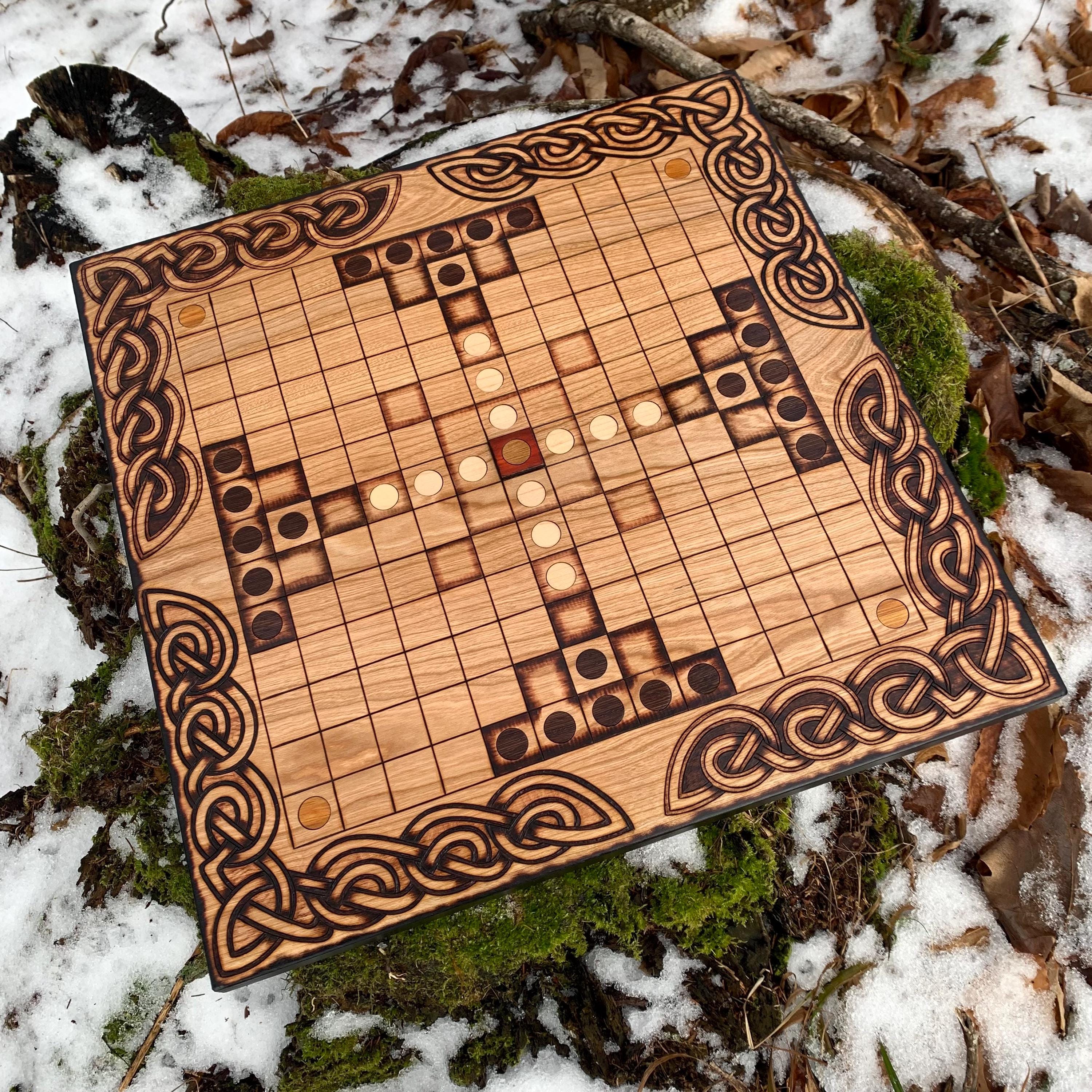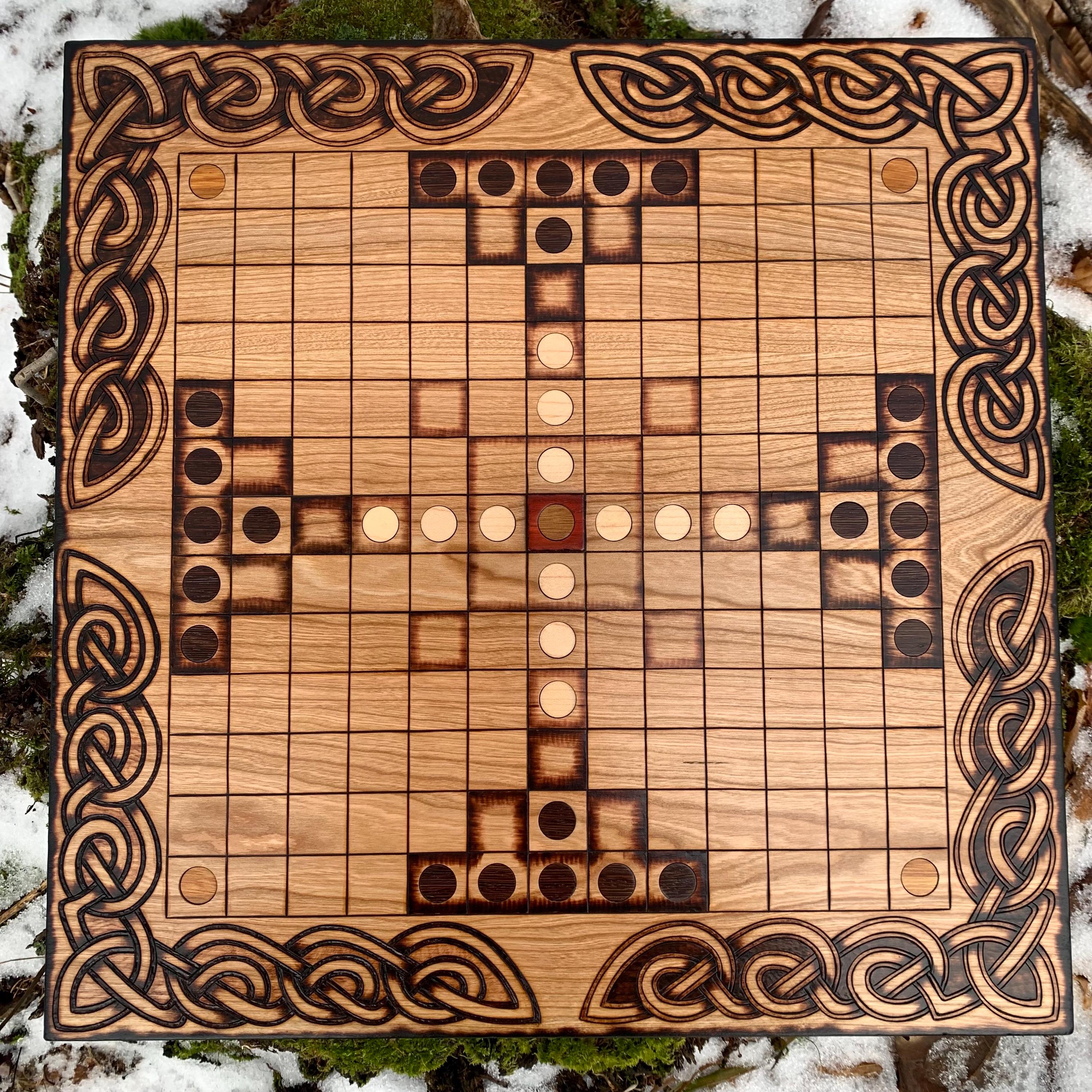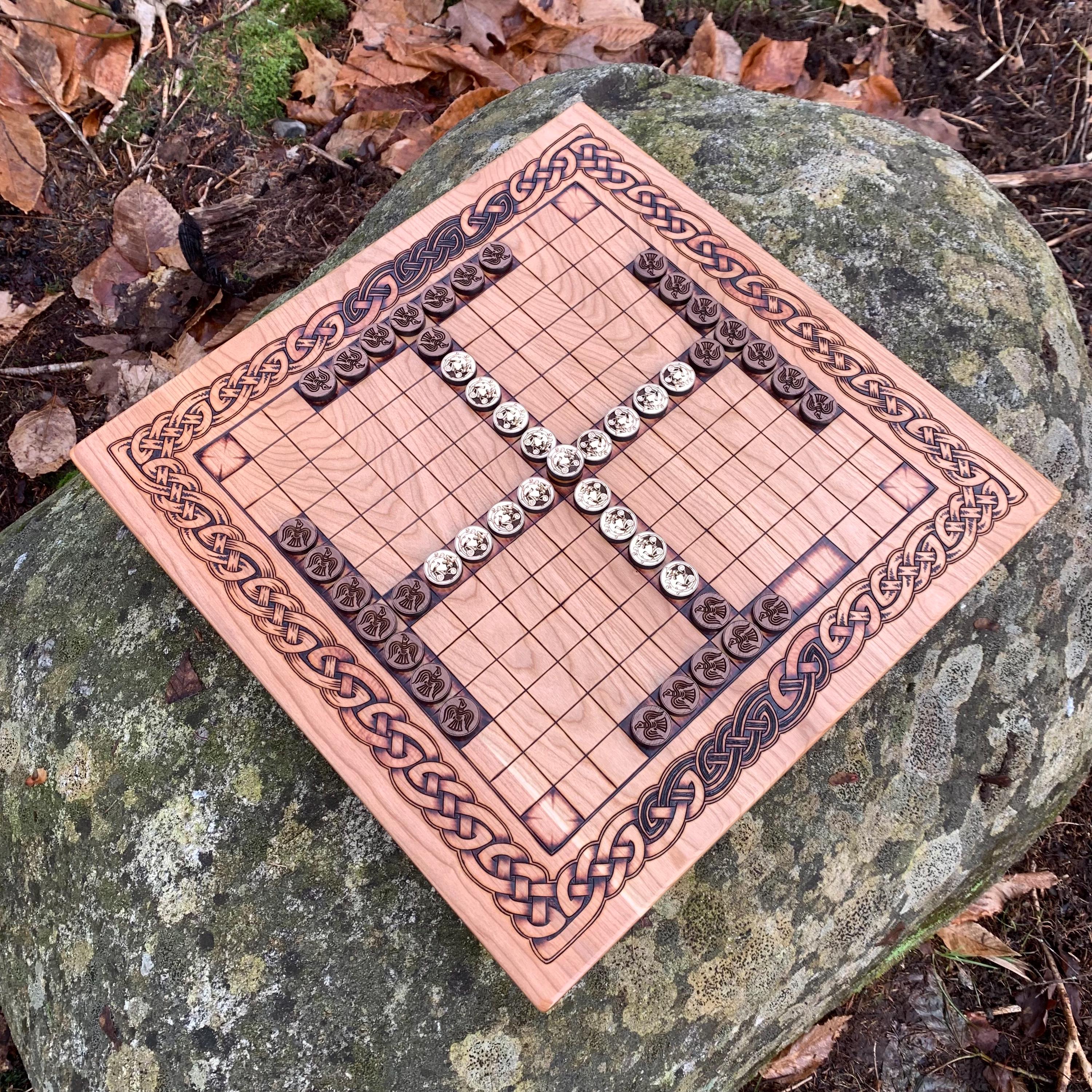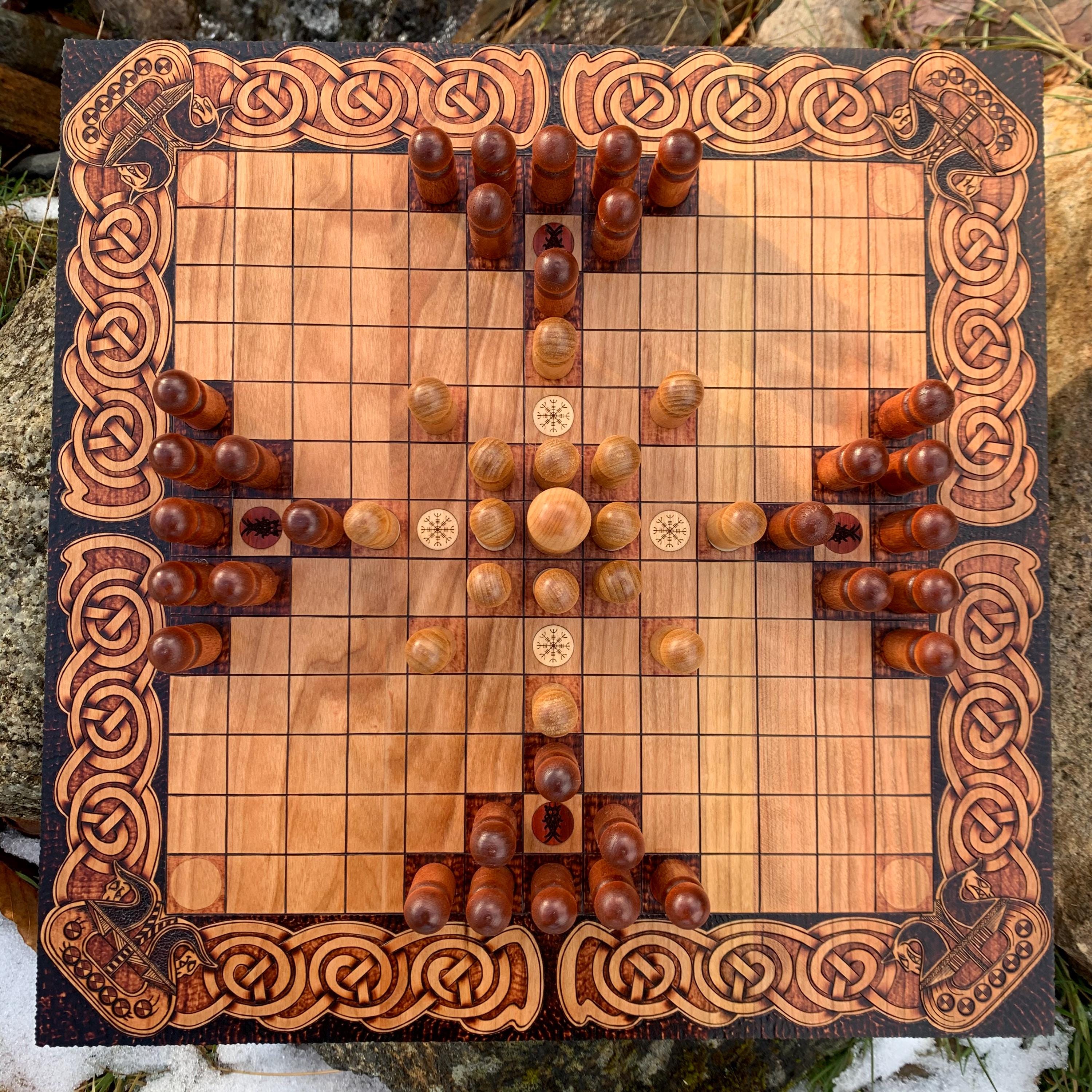 This handcrafted wooden game features historically-inspired artwork burned into the wood surface by hand, and many custom options to make each board created a unique and functional work of art. Hnefatafl, the game of the Vikings, is a strategy board game that traveled with Scandinavian explorers, traders, and raiders alike, and was adopted by many of the cultures they encountered. It is reputed to be one of the oldest games in the world, with origins that can be traced back to a game called Petteia, played by the ancient Greeks. This variant of Hnefatafl, with a play grid of 13x13 squares, is based upon a discovered board fragment from the Gokstad ship burial in Norway. Hnefatafl is an intriguing way to learn strategy and tactics, as well as an excellent means to spend quality time with a friend or family member. Each board is created uniquely from the next and is sure to bring enjoyment for generations to come.