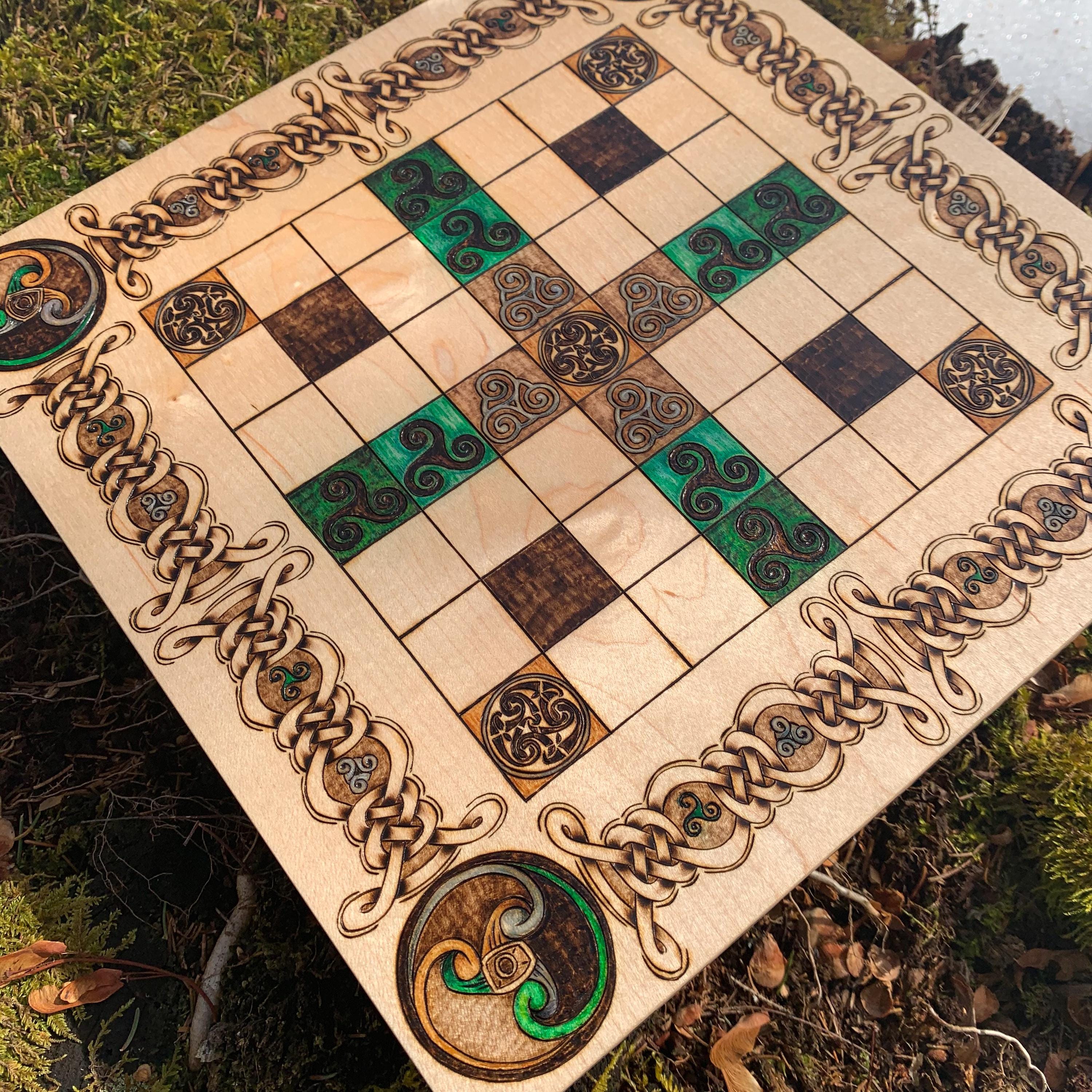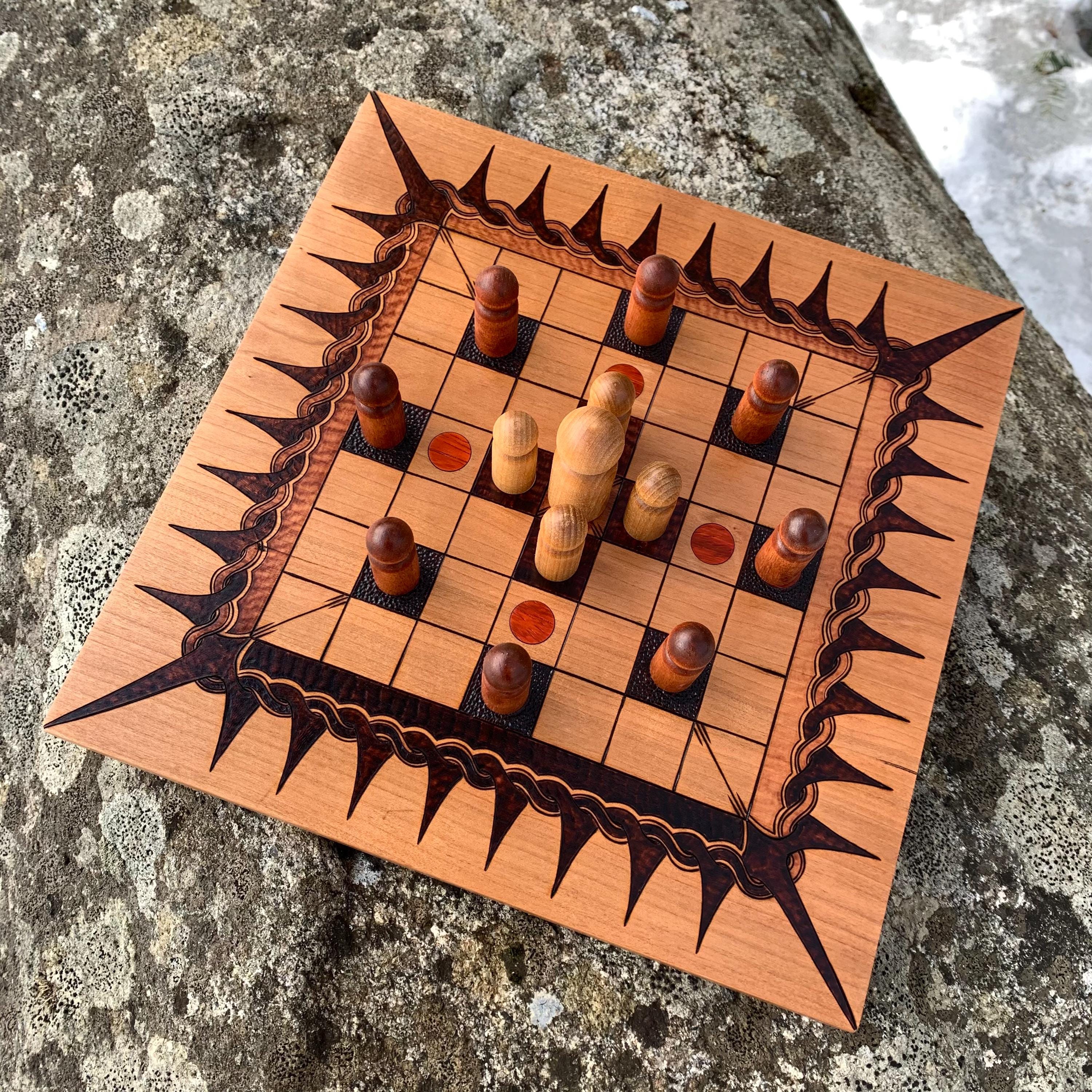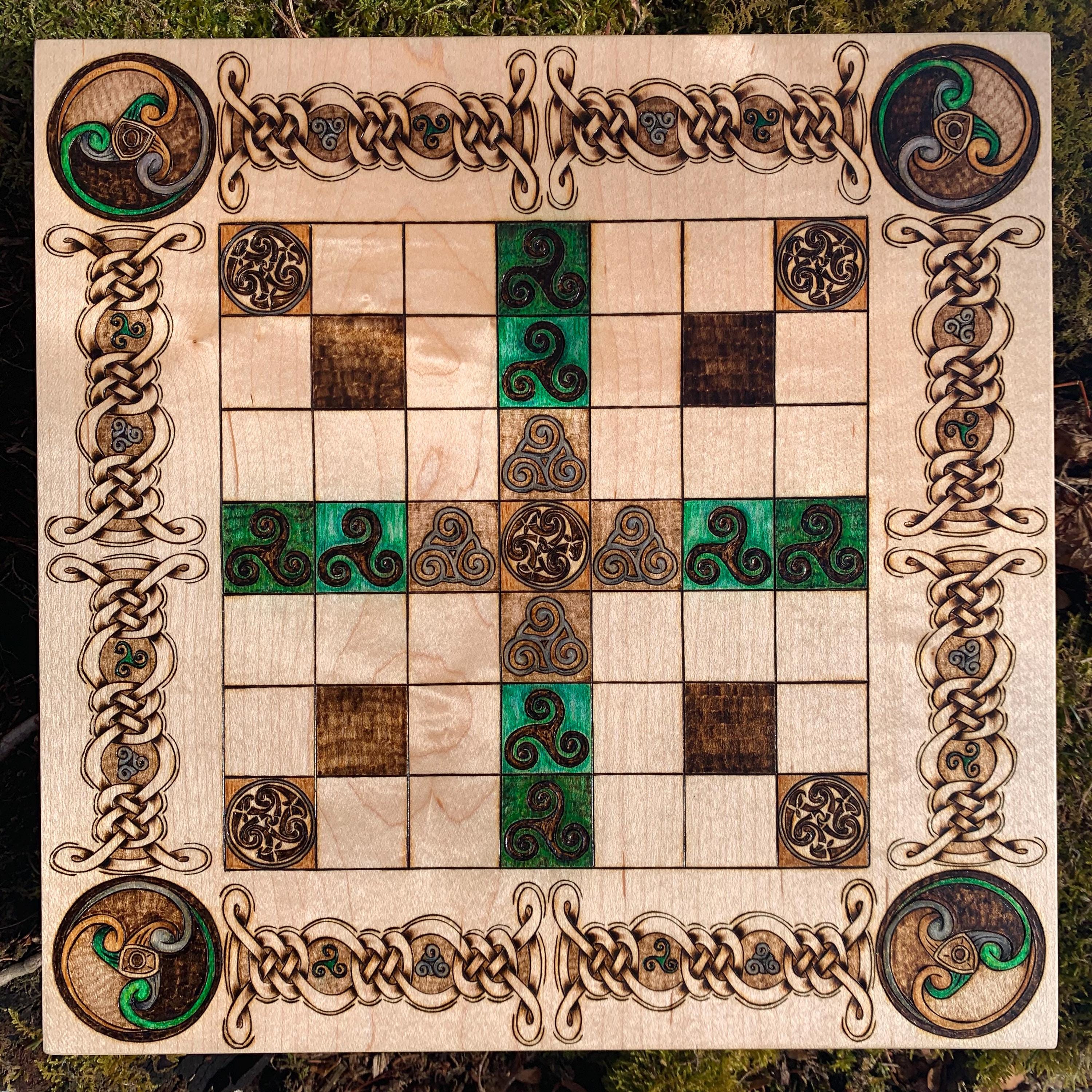 This handcrafted wooden game features historically-inspired artwork burned into the wood surface by hand, and many custom options to make each board created a unique and functional work of art. Hnefatafl, the game of the Vikings, is a strategy board game that traveled with Scandinavian explorers, traders, and raiders alike, and was adopted by many of the cultures they encountered. It is reputed to be one of the oldest games in the world, with origins that can be traced back to a game called Petteia, played by the ancient Greeks. This variant of Hnefatafl, with a play grid of 7x7 squares, was well received by the ancient Irish populace, having been introduced by the Norse occupation of the isles during the early Viking Age. Hnefatafl is an intriguing way to learn strategy and tactics, as well as an excellent means to spend quality time with a friend or family member. Each board is created uniquely from the next, with heirloom potential, and sure to please players and collectors alike for decades to come.