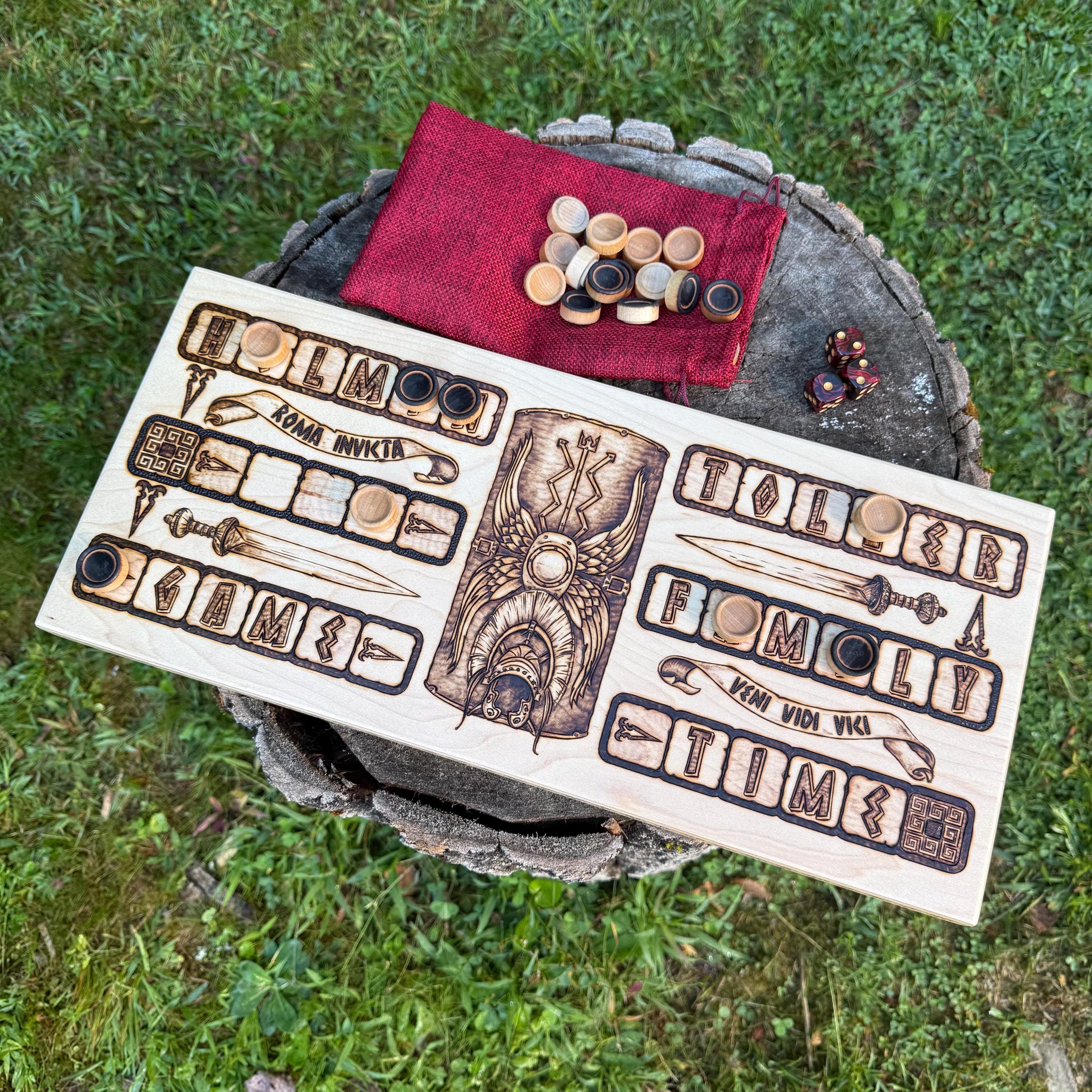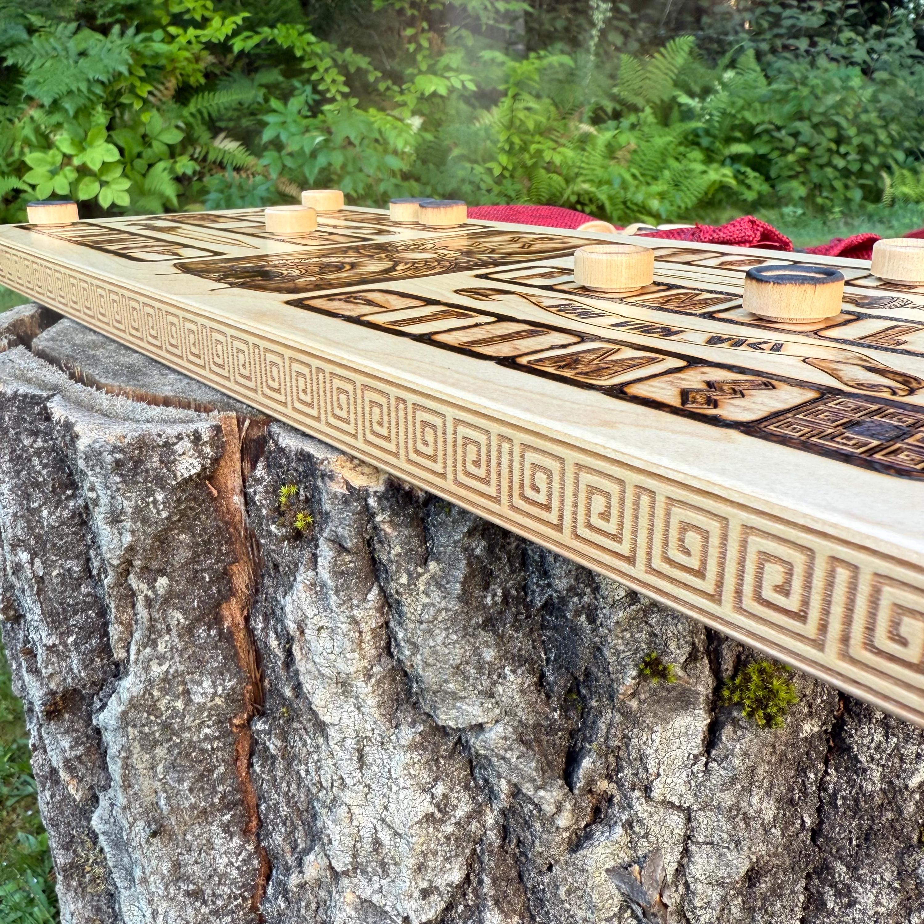 Ludus Duodecim Scriptorum, also known as Duodecim Scripta, or XII Scripta, is a traditional board game of Roman origin. Ancient Rome was known for its advancements in architecture, government, and art, to name a few; they also adopted or created many great games to pass the time. Completely handcrafted, this modern interpretation of the ancient Roman game is created from hardwood, either cherry or maple, and features wood burned historically-inspired artwork to convey popular themes from Roman society. A fast paced racing game involving opponent player captures and dice rolls to dictate movement, this game will bring many hours of enjoyment to the avid traditional board gamer as well as enthusiasts of Roman history. A functional piece of art that will stand the test of time as surely as the ancient game has endured over the centuries, and much more portable in this version, as opposed to the stone tables used during the days of the Empire!