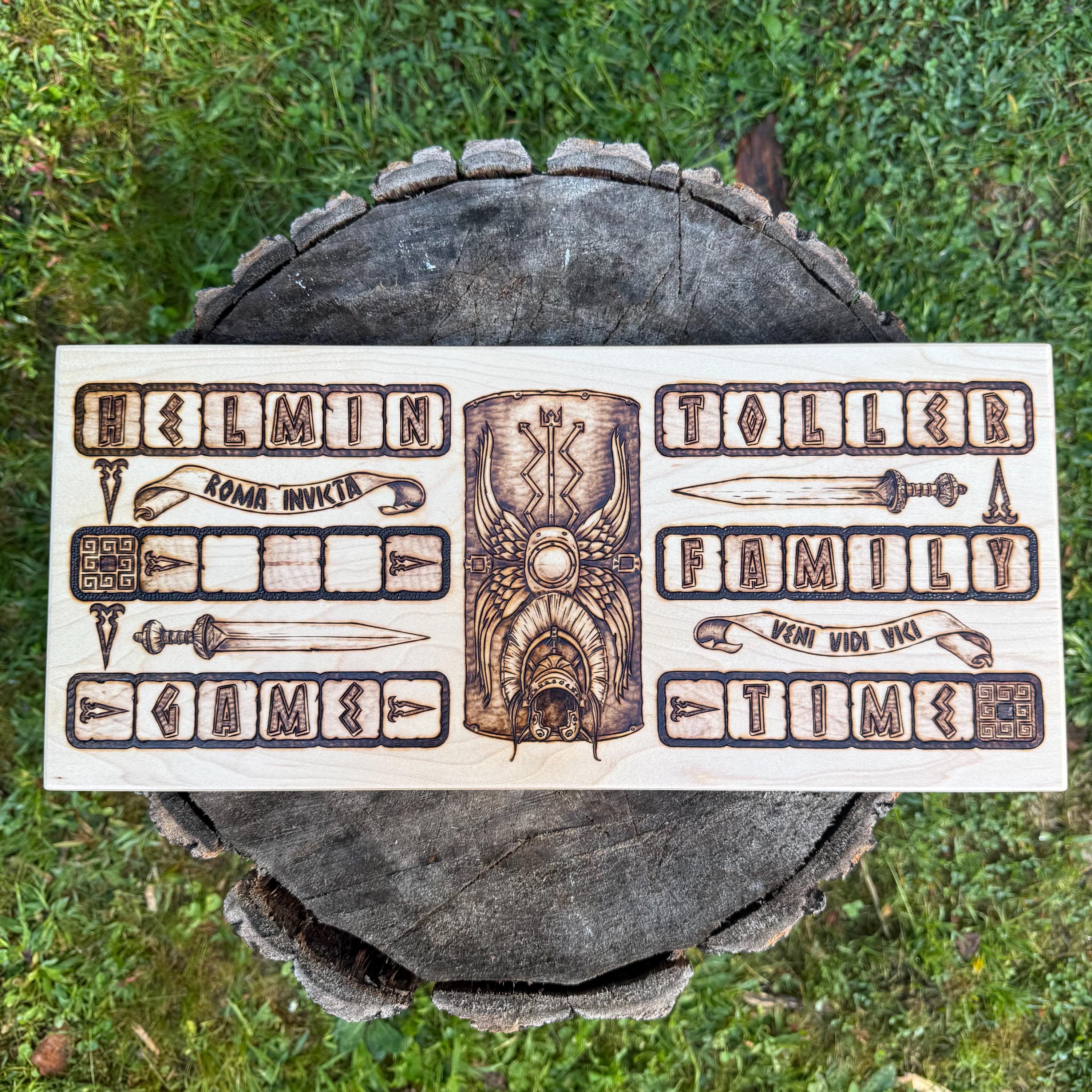 Four designs are available, representing different classes of Roman society: Centurion, Citizen, Gladiator, and Senator. Each social class will have it's own definable artwork - Centurion will feature implements of war and of the Legions (shields, helms, vexillum, pilum, and the gladius sword). Citizen will feature examples of architecture and art (column scrollwork, pottery decorations, musical instruments, and building silhouettes). Gladiator will feature details from the harsh life and death found in the arenas (galea/helms, cestus, sika, parmula/shield, and the gladius graecus). Senator will feature aspects or personas of ancient Roman government (scrolls, busts of famous individuals, ornate lecterns, etc.) An example of each design theme is featured in the photos. Additionally, Latin words or phrases and small thematic designs (selected by artist unless otherwise requested in Personalization) are burned into the appropriate areas on the track as an indication of the course players must follow.