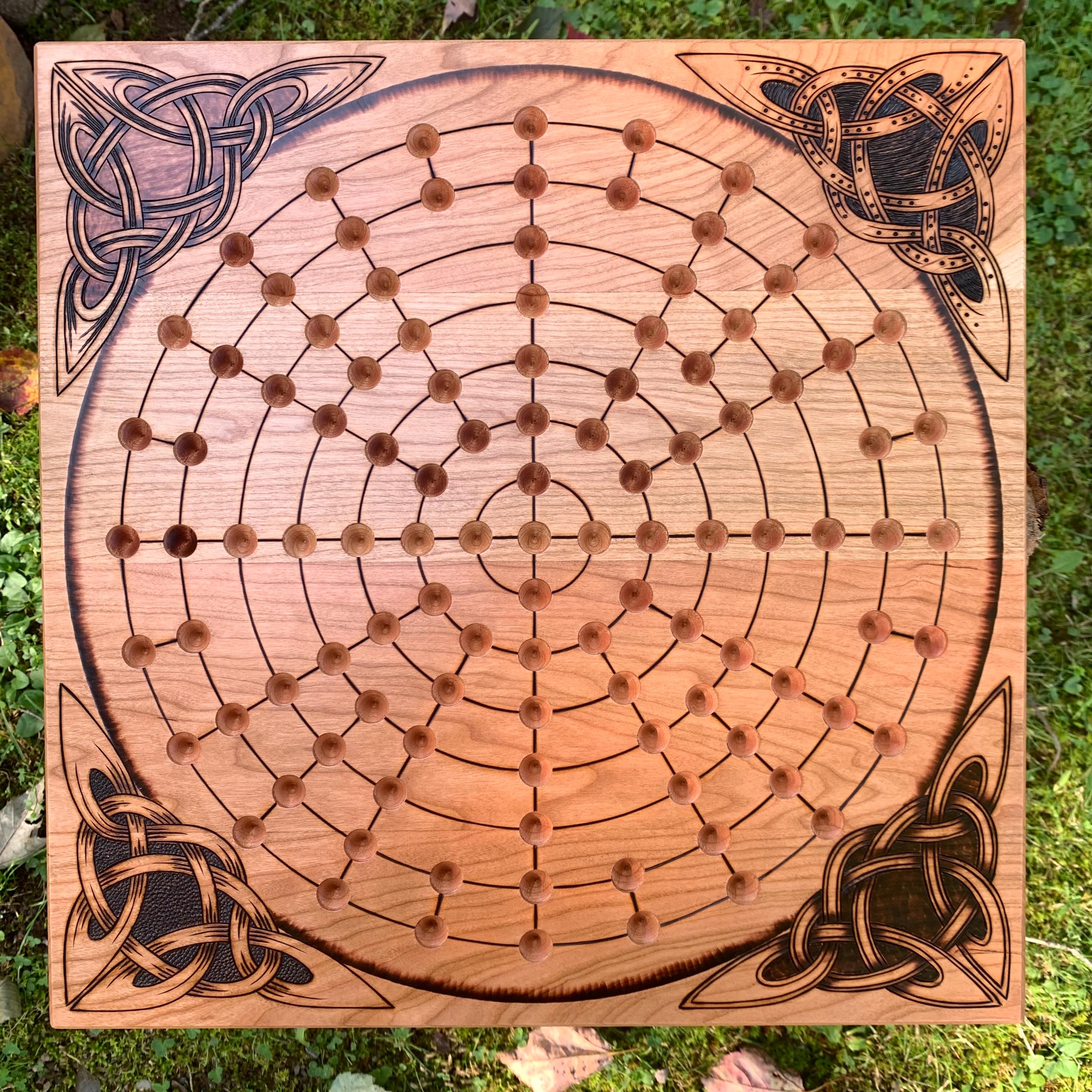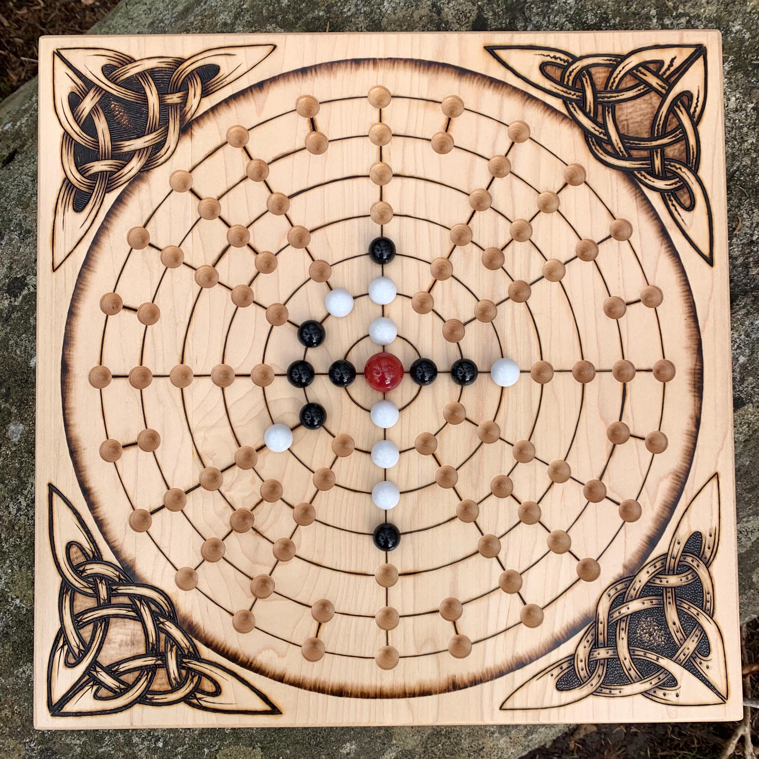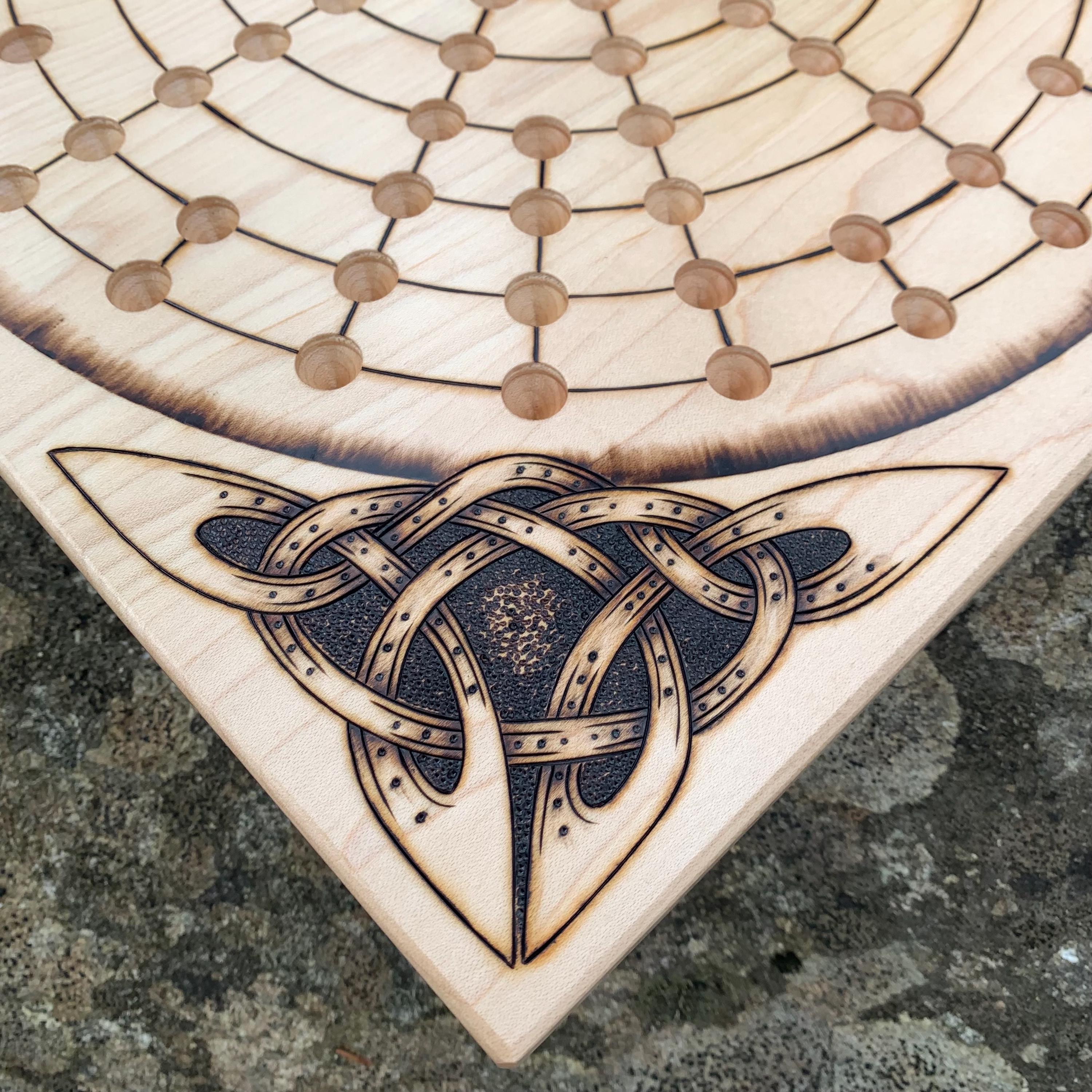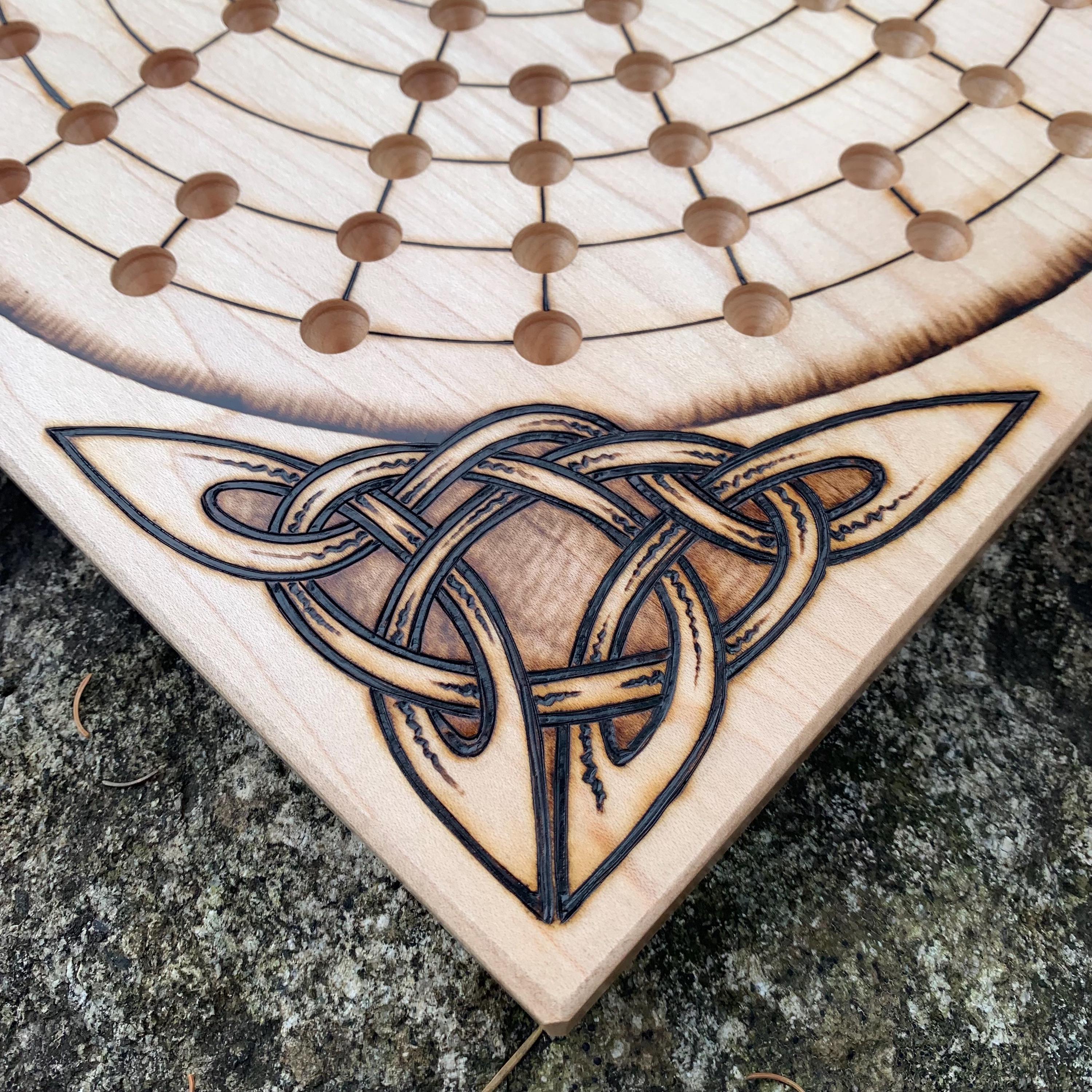 This exquisite wooden board game is a wonderful addition to any game enthusiast's collection. Fidchell (meaning "wood knowledge") is an ancient Celtic board game, deeply rooted in the history of the Irish and Welsh alike. Also known as "Gwyddbwyll" and "Faerie Chess", the layout and premise of the game is linked to Celtic symbolism, mythology, and even the ancient Celtic calendar. The game itself is intensely challenging despite its simple premise, and has a high potential of repeated and variable play. Each Fidchell game board is created as a functional piece of art with heirloom potential, built to last for generations - a splendid way to spend quality time with a friend or family member.