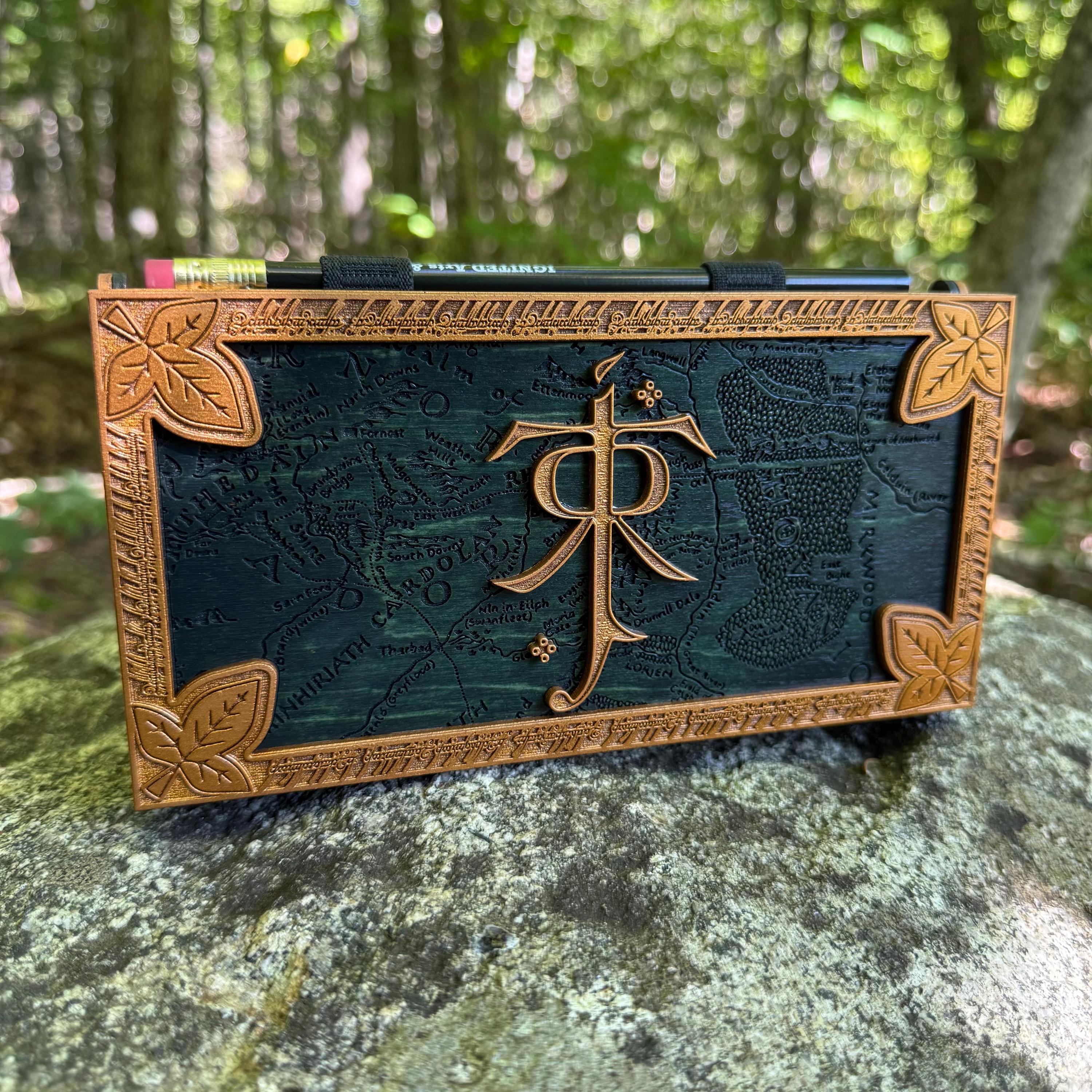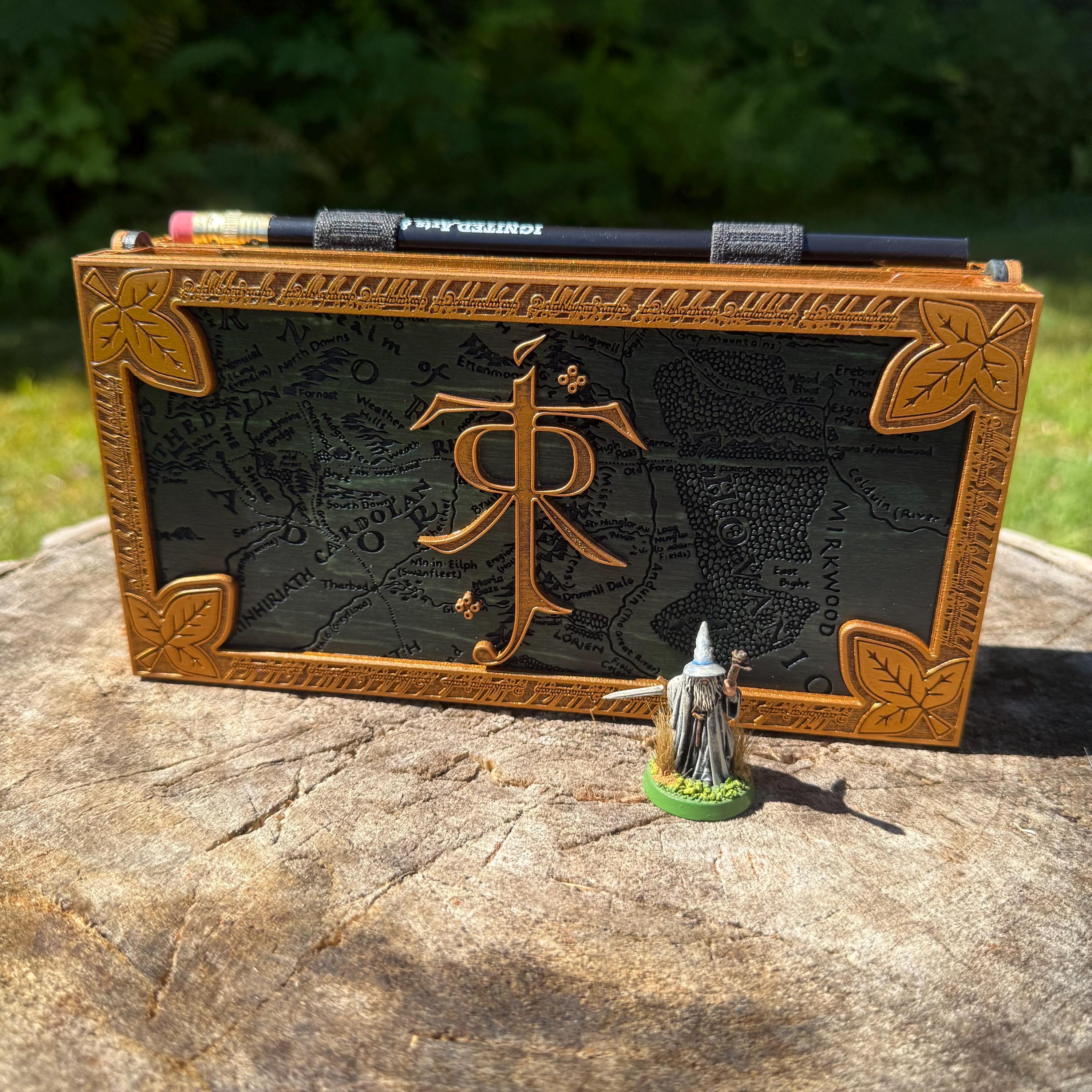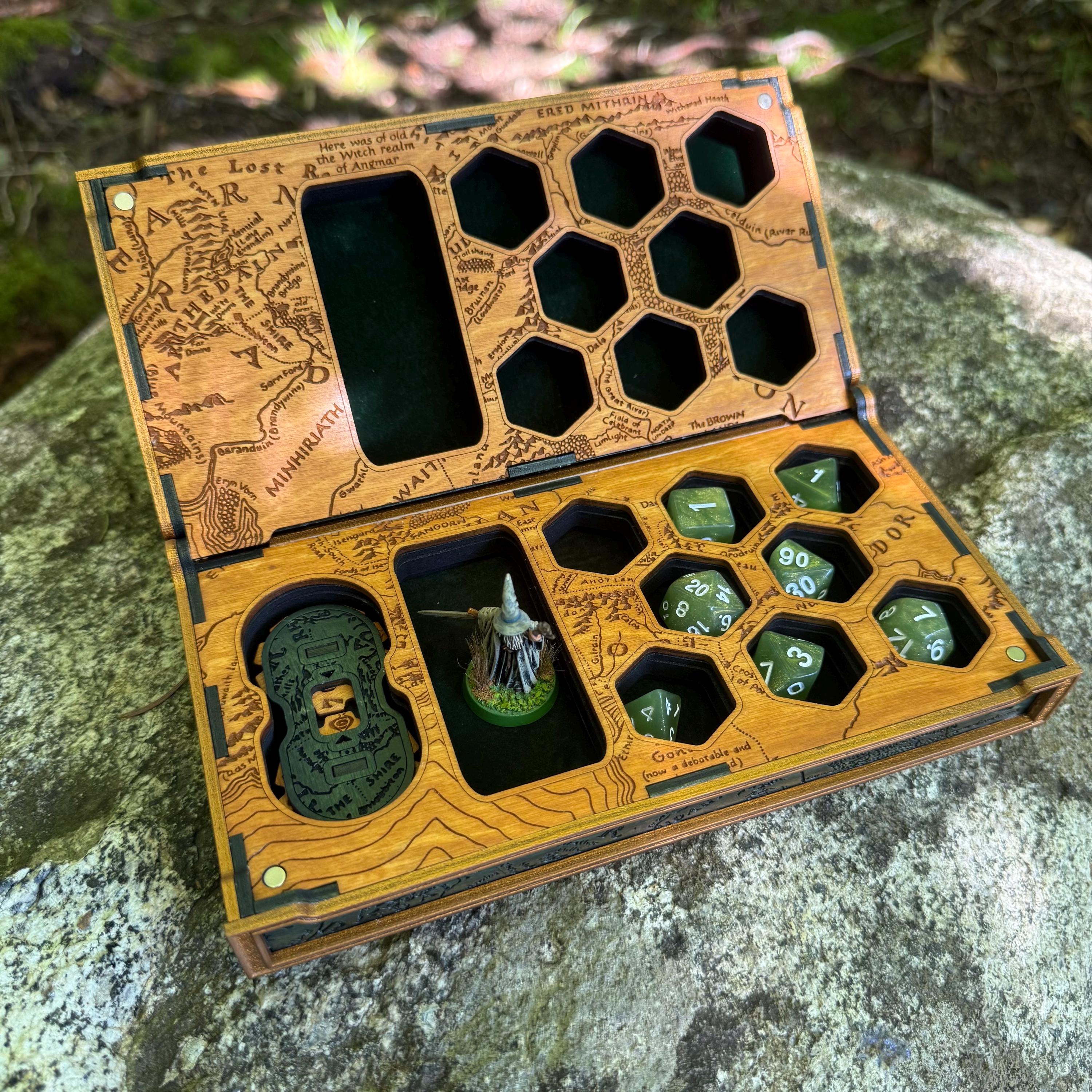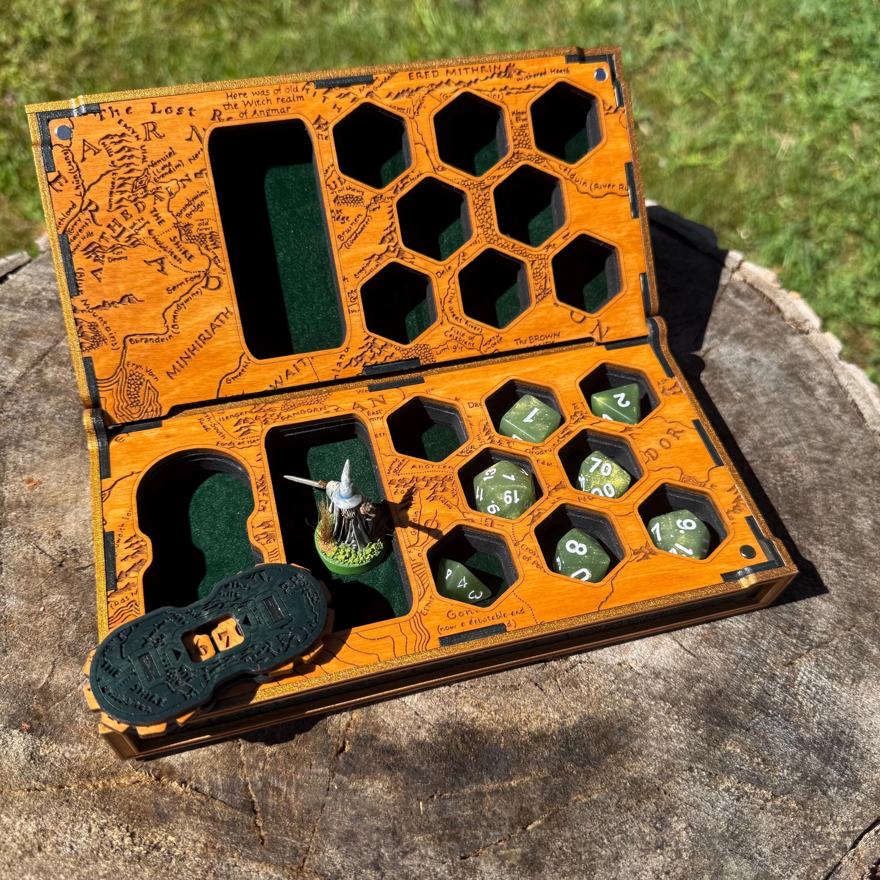 Show your love for Tolkien's wondrously immersive Middle Earth with this handcrafted wooden RPG character and dice case. This beautifully engraved and hand finished case will store and protect the basic necessary items for RPG gamers - character miniature, dice, and writing utensil; and comes complete with a two-digit hit point counter which is kept in an integrated storage area within. Created from birch plywood, with an incorporated hinge system and reinforced assembly, for a durable and reliable case sure to witness many adventurous campaigns! Safely and securely store your favorite dice and miniature within this case, featuring interior areas lined with soft velvet and EVA foam, as well as a secure magnetic closure - perfect for traveling the road as it goes ever on!