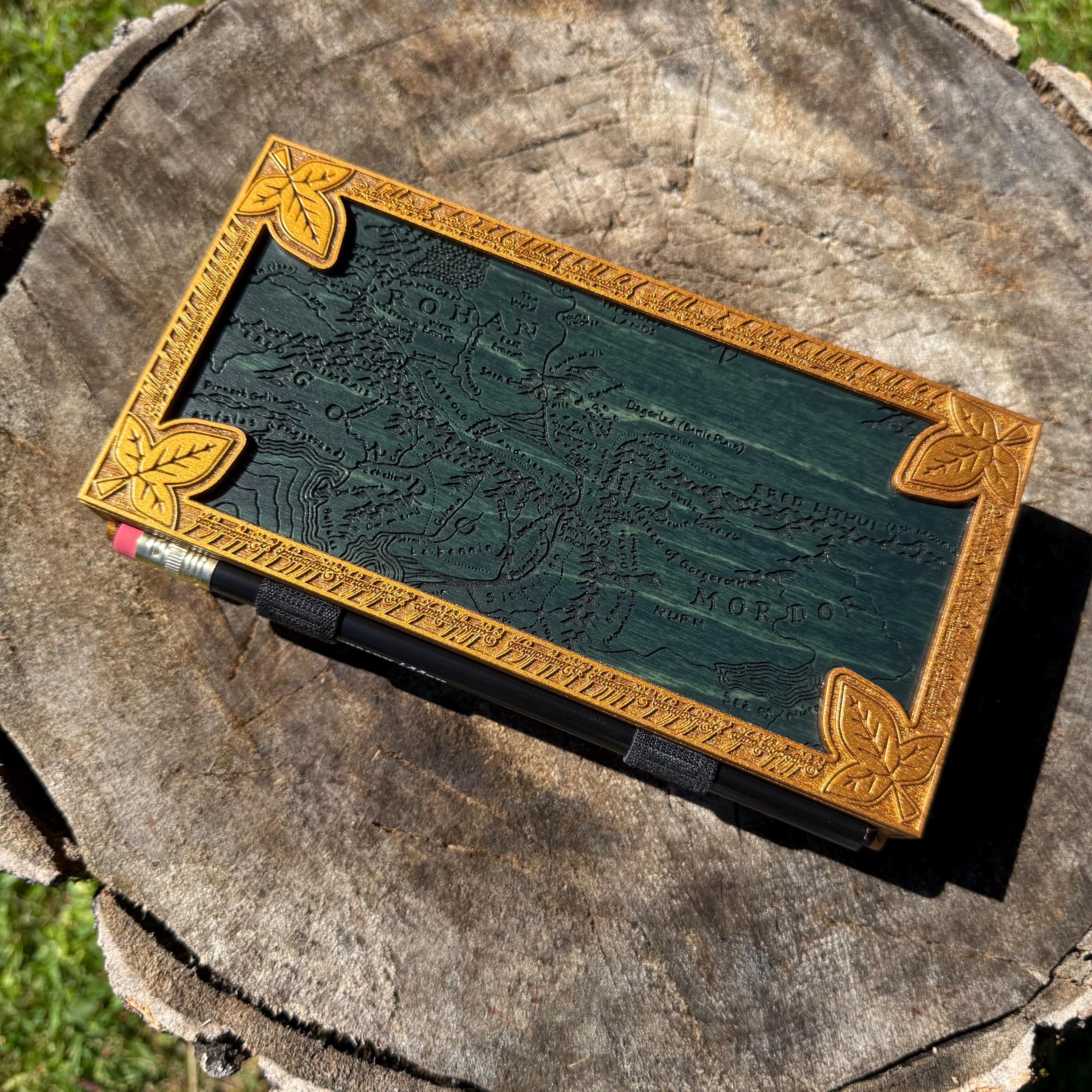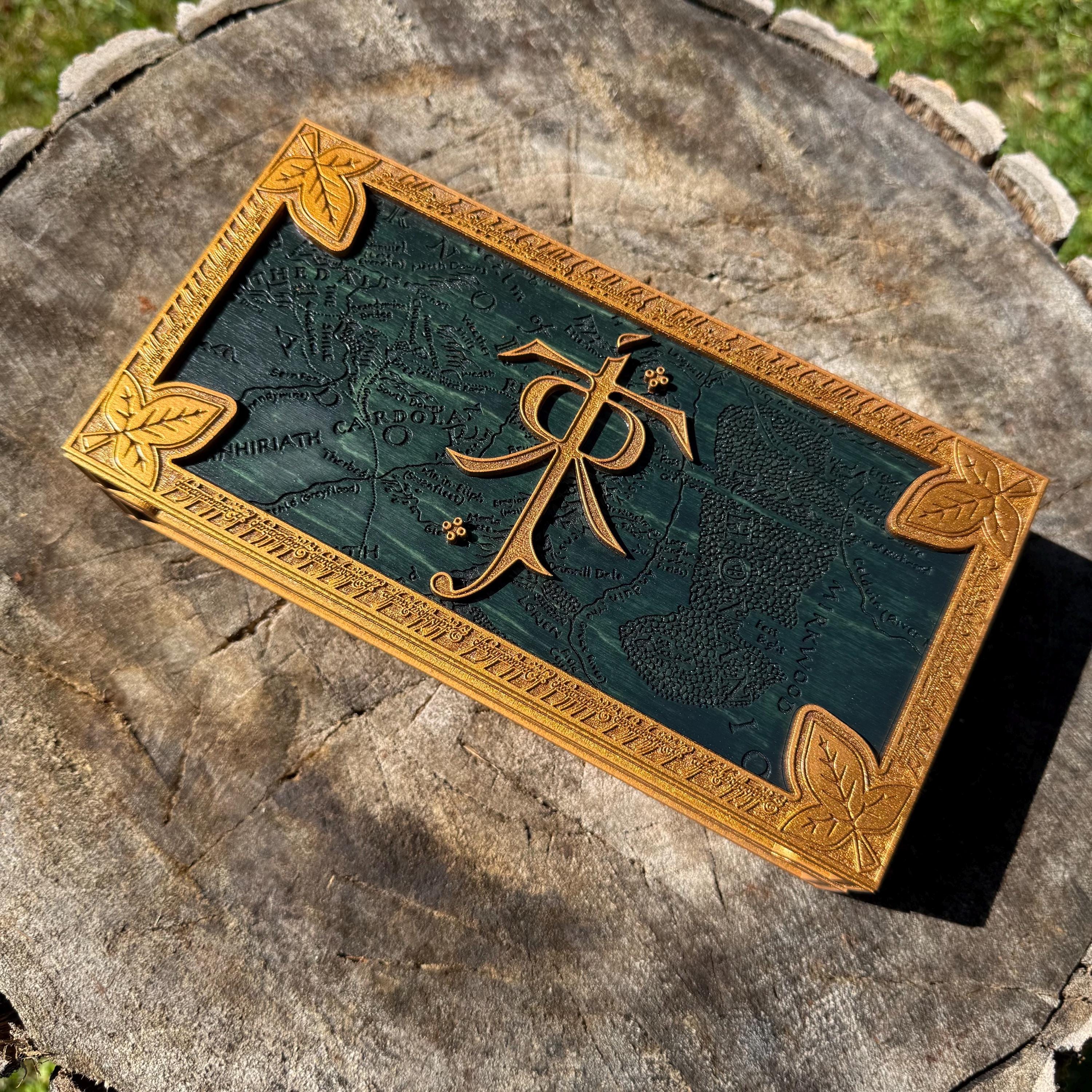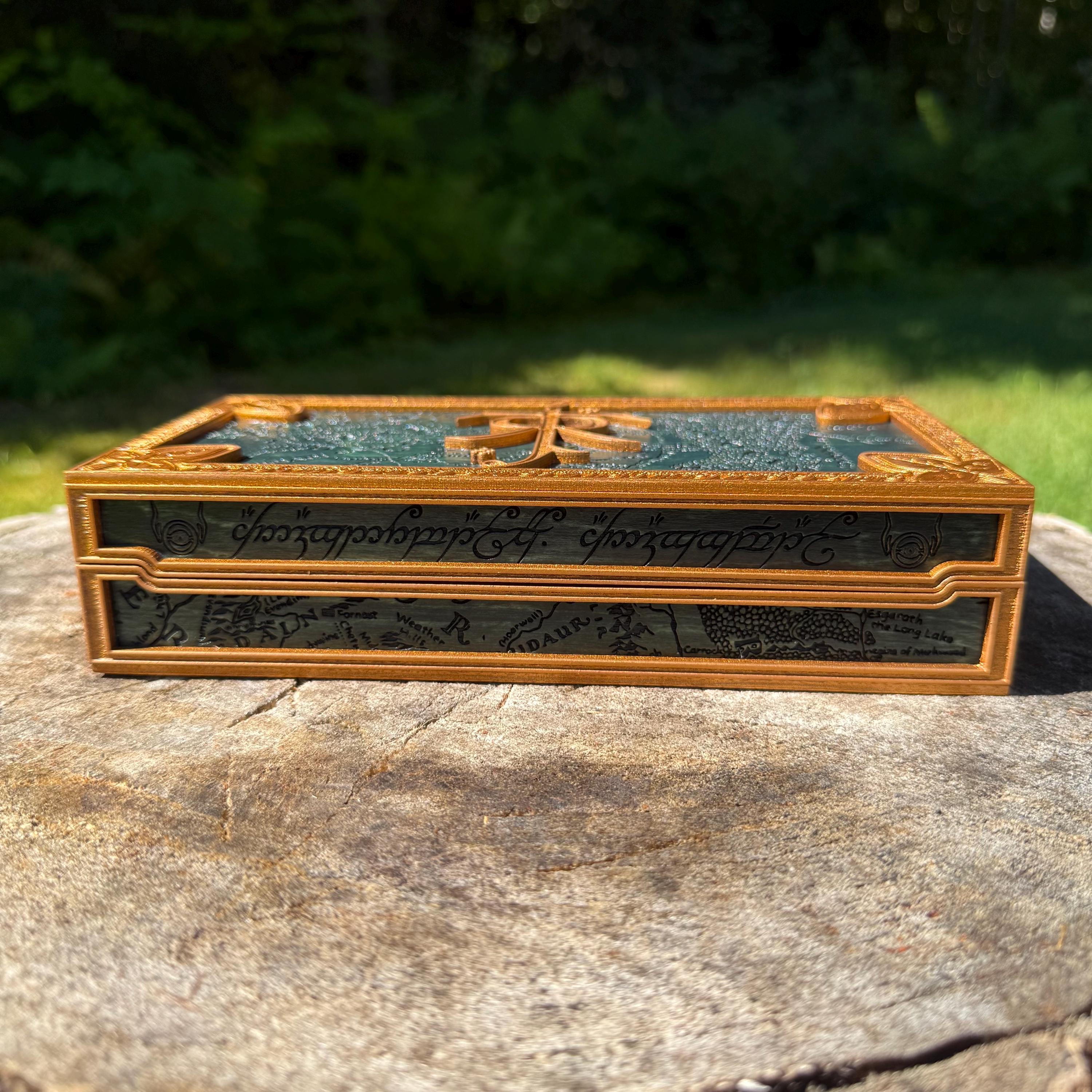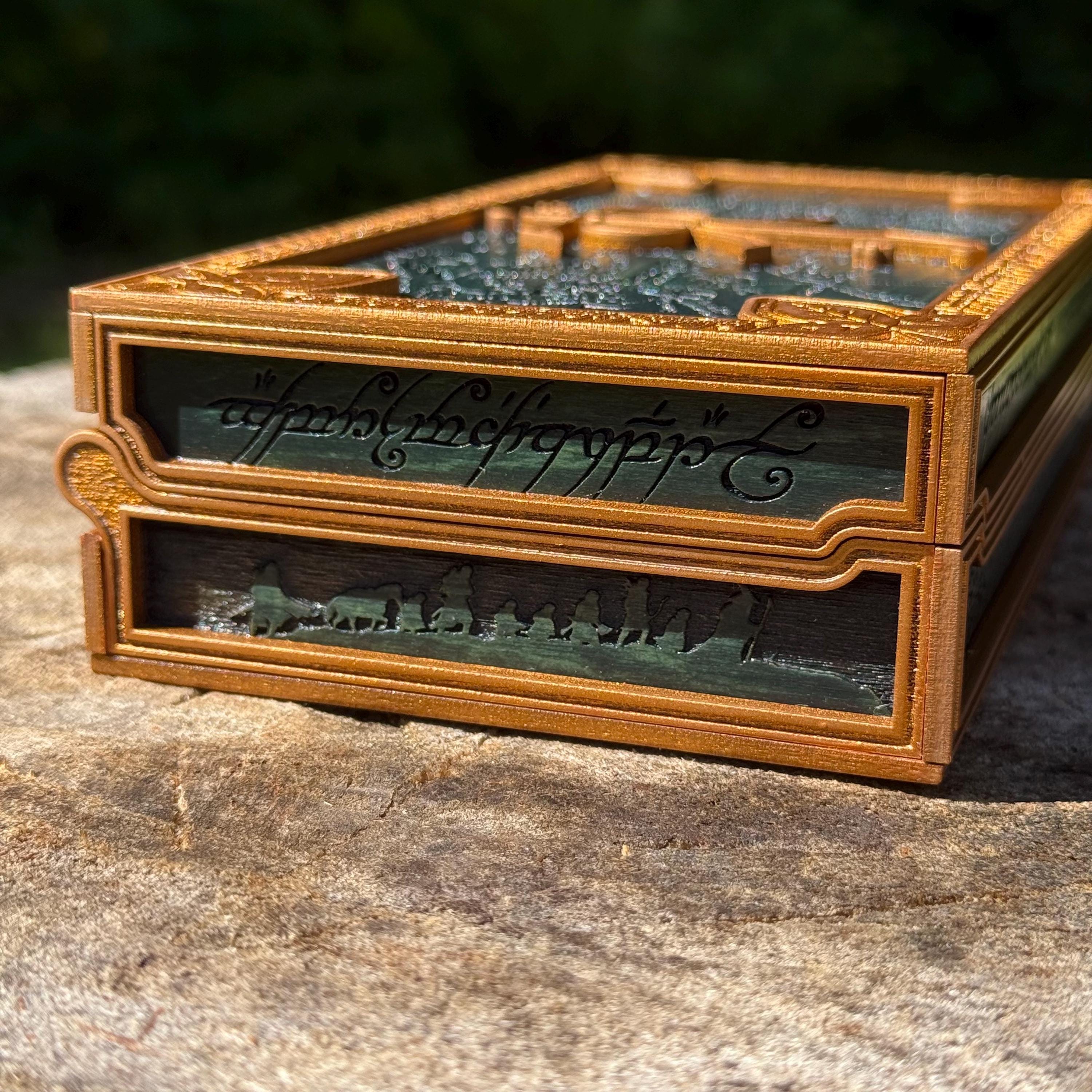 Show your love for Tolkien's wondrously immersive Middle Earth with this handcrafted wooden RPG character and dice case. This beautifully engraved and hand finished case will store and protect the basic necessary items for RPG gamers - character miniature, dice, and writing utensil; and comes complete with a two-digit hit point counter which is kept in an integrated storage area within. Created from birch plywood, with an incorporated hinge system and reinforced assembly, for a durable and reliable case sure to witness many adventurous campaigns! Safely and securely store your favorite dice and miniature within this case, featuring interior areas lined with soft velvet and EVA foam, as well as a secure magnetic closure - perfect for traveling the road as it goes ever on!
