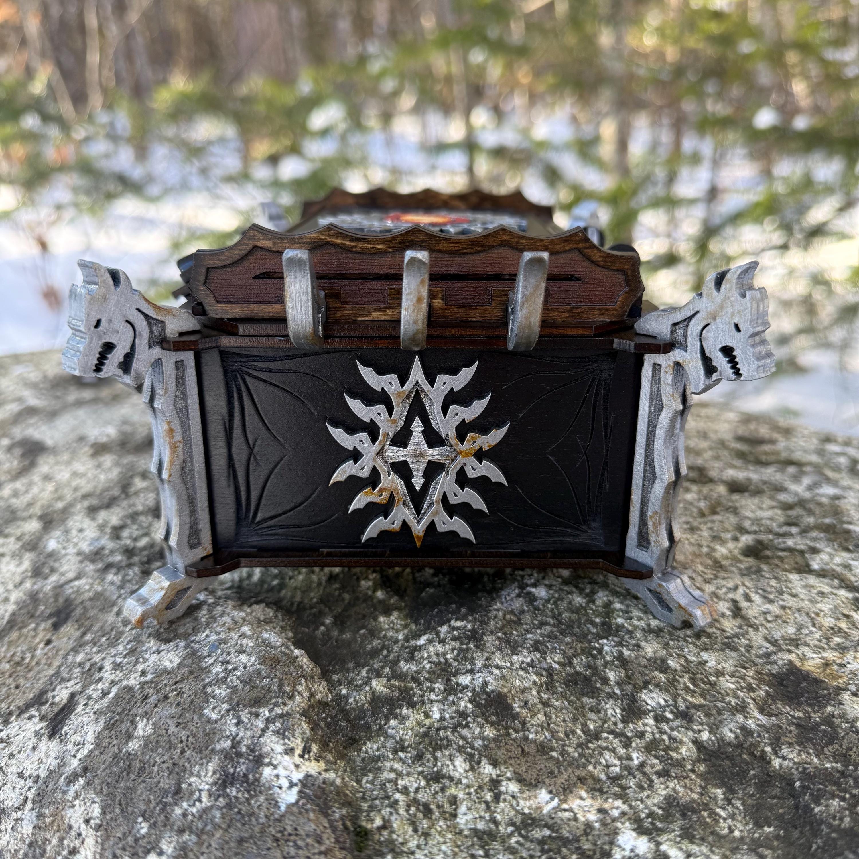 This artistically inspired wooden chest somewhat resembles the Nord sarcophagi found throughout the province of Skyrim in the popular game "Elder Scrolls V: Skyrim". With its distinctive similarities, it's not difficult to imagine a similar box actually being featured in the game! Handcrafted from birch plywood, with high resolution laser-engraved artwork and a dual staining process as an extra level of detail. Due to the manner of its construction, this small chest is very resilient and durable, with double layers at important structural points and reinforcement to all the joined pieces. Key components and details of the chest are hand-painted to create a truly beautiful and unique appearance for each creation. The interior of the chest is lined with jeweler's velvet as added protection to the items stored within; the rotating latch features a magnetic closure. This small chest is perfect for fans of Elder Scrolls, Skyrim, dragons, and/or uniquely styled boxes. Very suitable for the storage of gaming dice, small valuables, coins, vials of frostbite venom, briar hearts, etc.