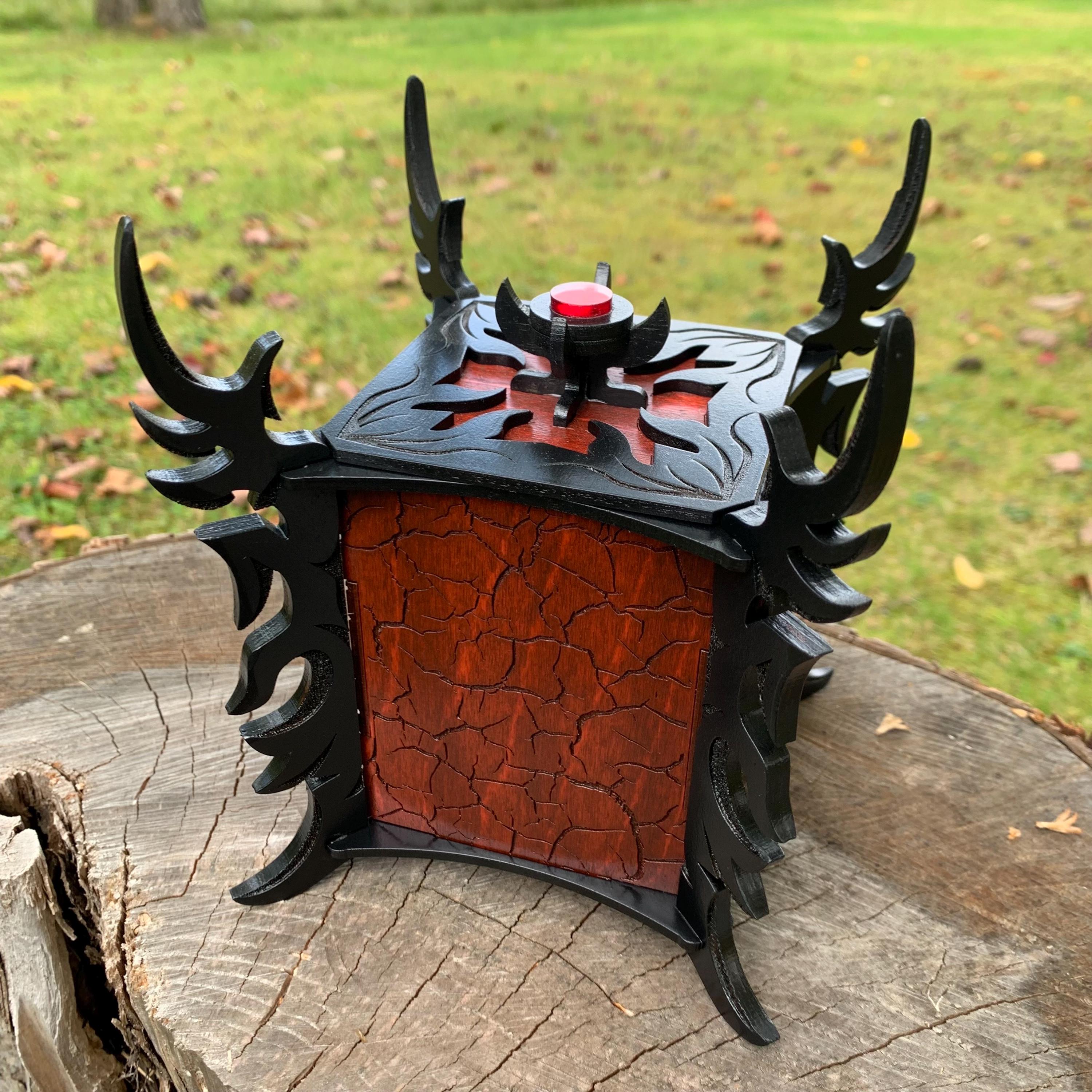 This Elder Scrolls-inspired wooden box possesses a very strong Daedric resemblance, based upon the armor and weapons of the immortal beings and their servants depicted in the Elder Scrolls Universe. Created from birch plywood, with high resolution laser engraved artwork and a dual staining process for an extra level of detail. Due to the manner of its construction, this box is very resilient and durable, with double layers at important structural points and reinforcement to all the joined pieces. The interior is lined with velvet as an extra protection for the items stored within. This small coffer is perfect for fans and admirers of the Elder Scrolls, Skyrim, the Daedra, and/or just uniquely styled boxes. Very suitable for the storage of gaming dice, small valuables, coins, jewels, briar hearts, etc.