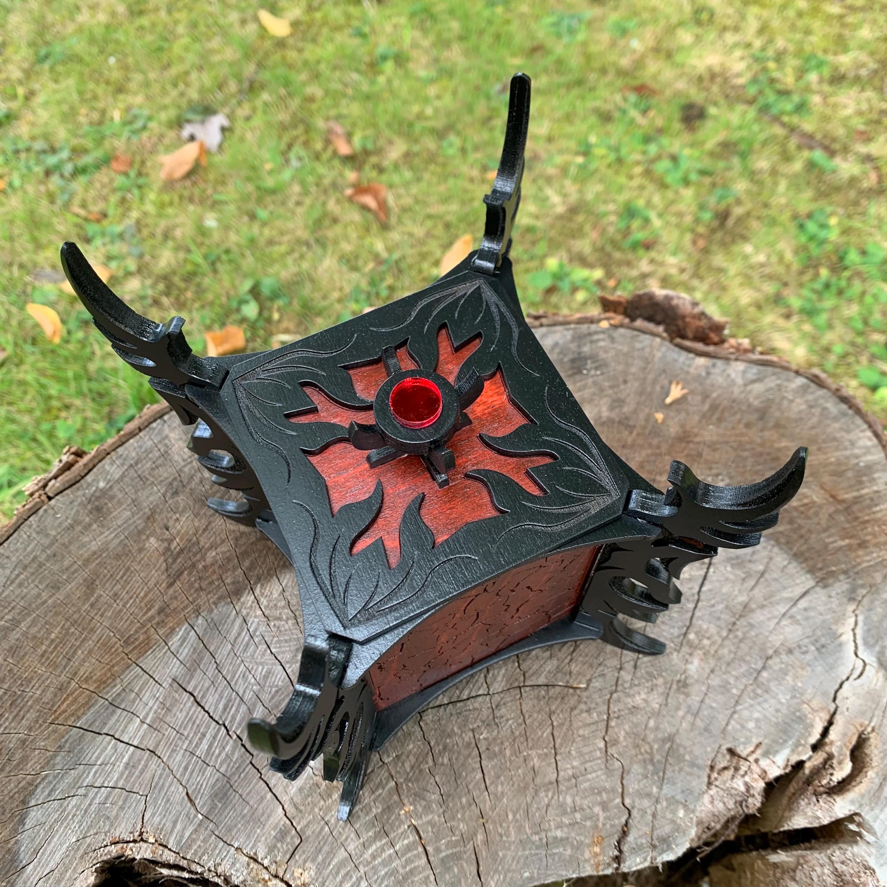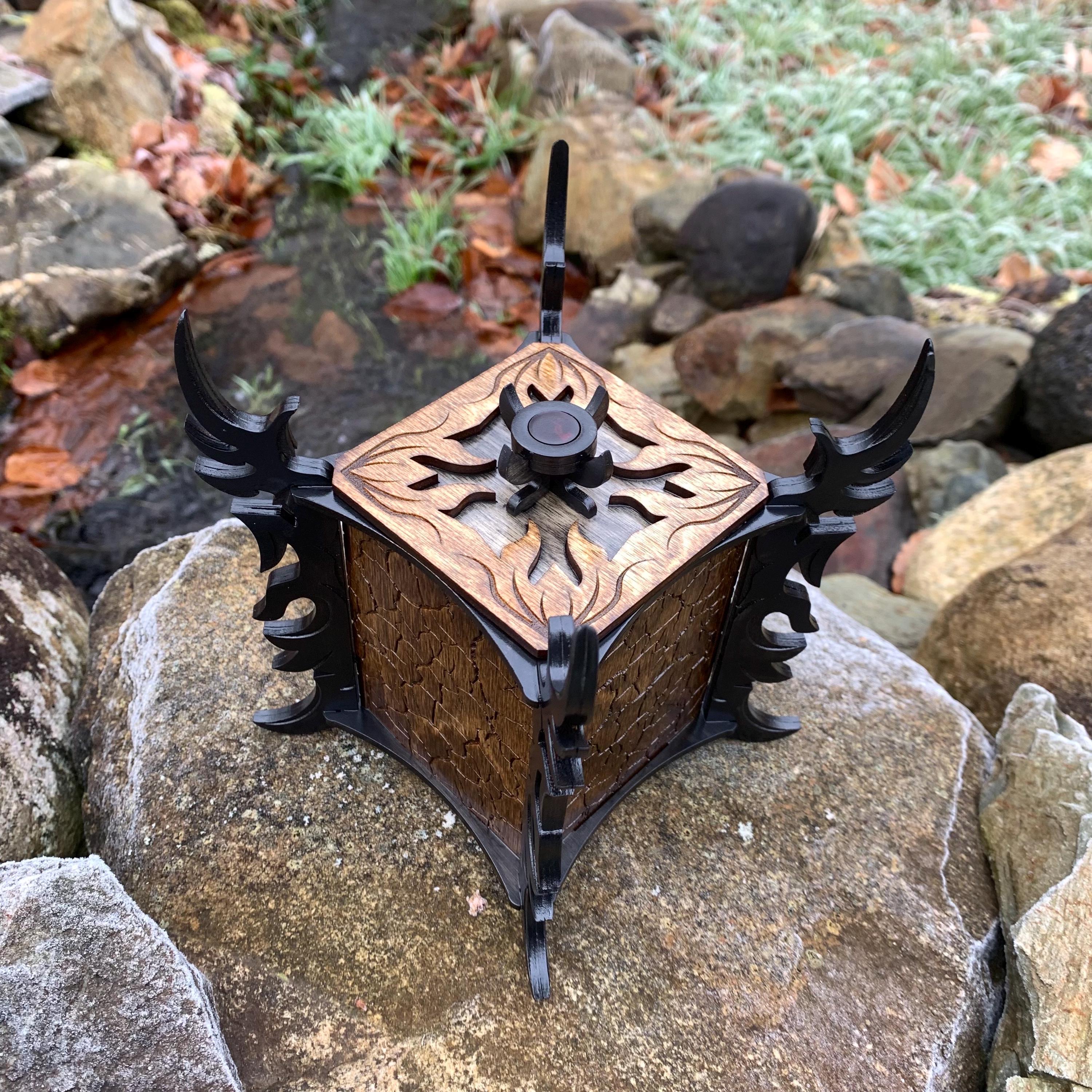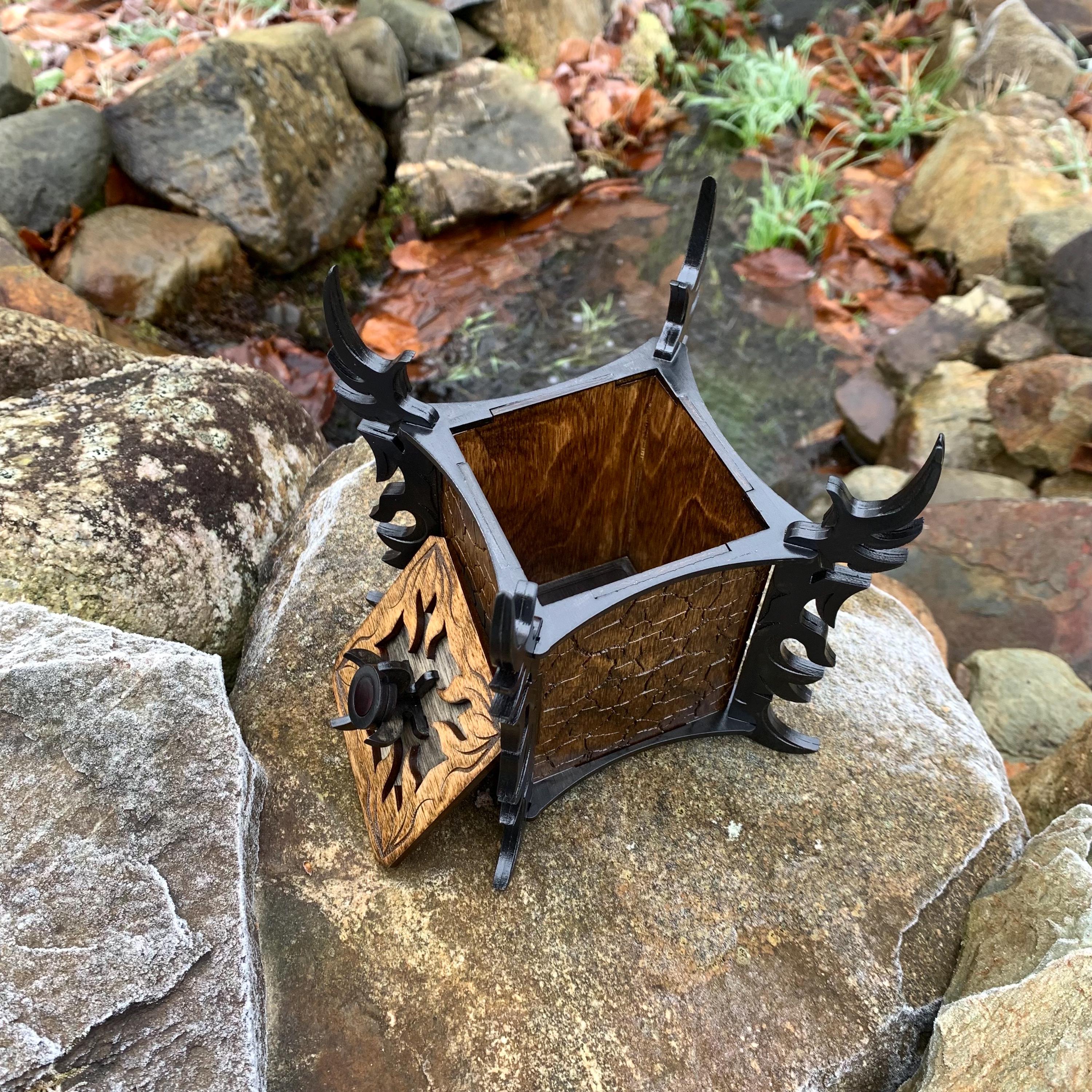 • CUSTOMIZATIONS AVAILABLE: selectable stain colors for the box walls and top underpanel; stain colors are limited to those listed in the drop-down options selector. In all creations, the four corner assemblies and decorative frames will be stained black. Additionally, the sides of the box may be decorated with letters from the Daedric alphabet, to personalize the coffer with its owner's initials or a four-letter acronym. The Daedric letters will be created from birch ply, stained black, and superimposed over the existing 'cracked' texture (see listing photos for an example). Please select your Personalization option from the drop-down selector, then use the Personalization section to request your desired letters. Requests for 2 letters will have those letters installed on opposite sides of the box.