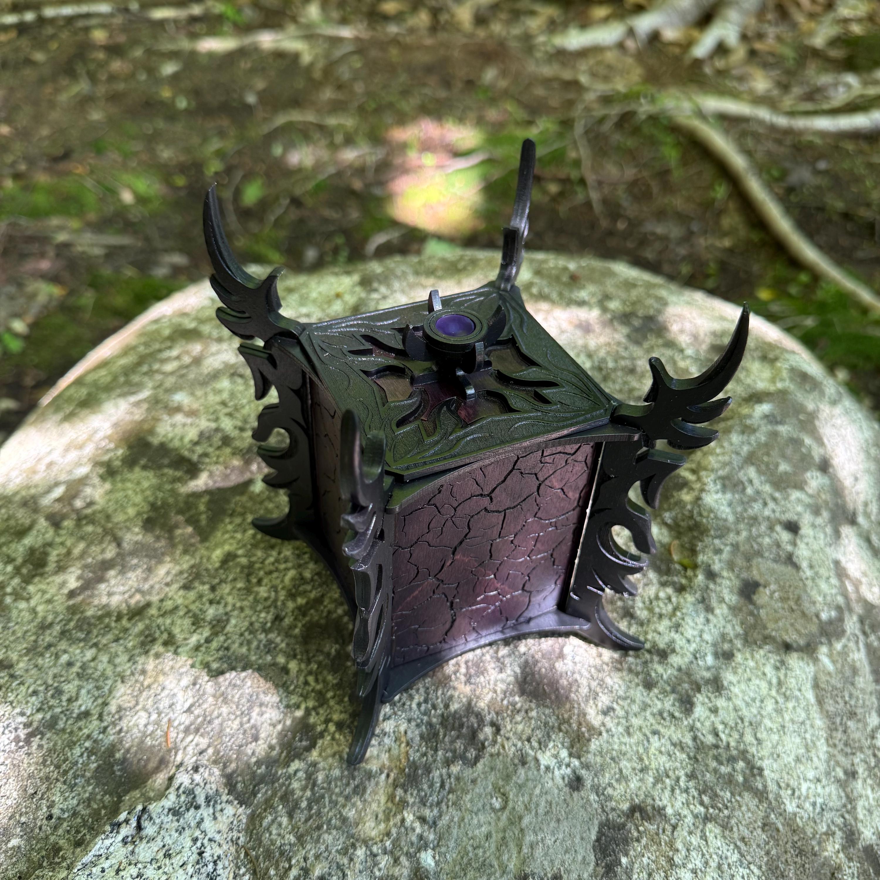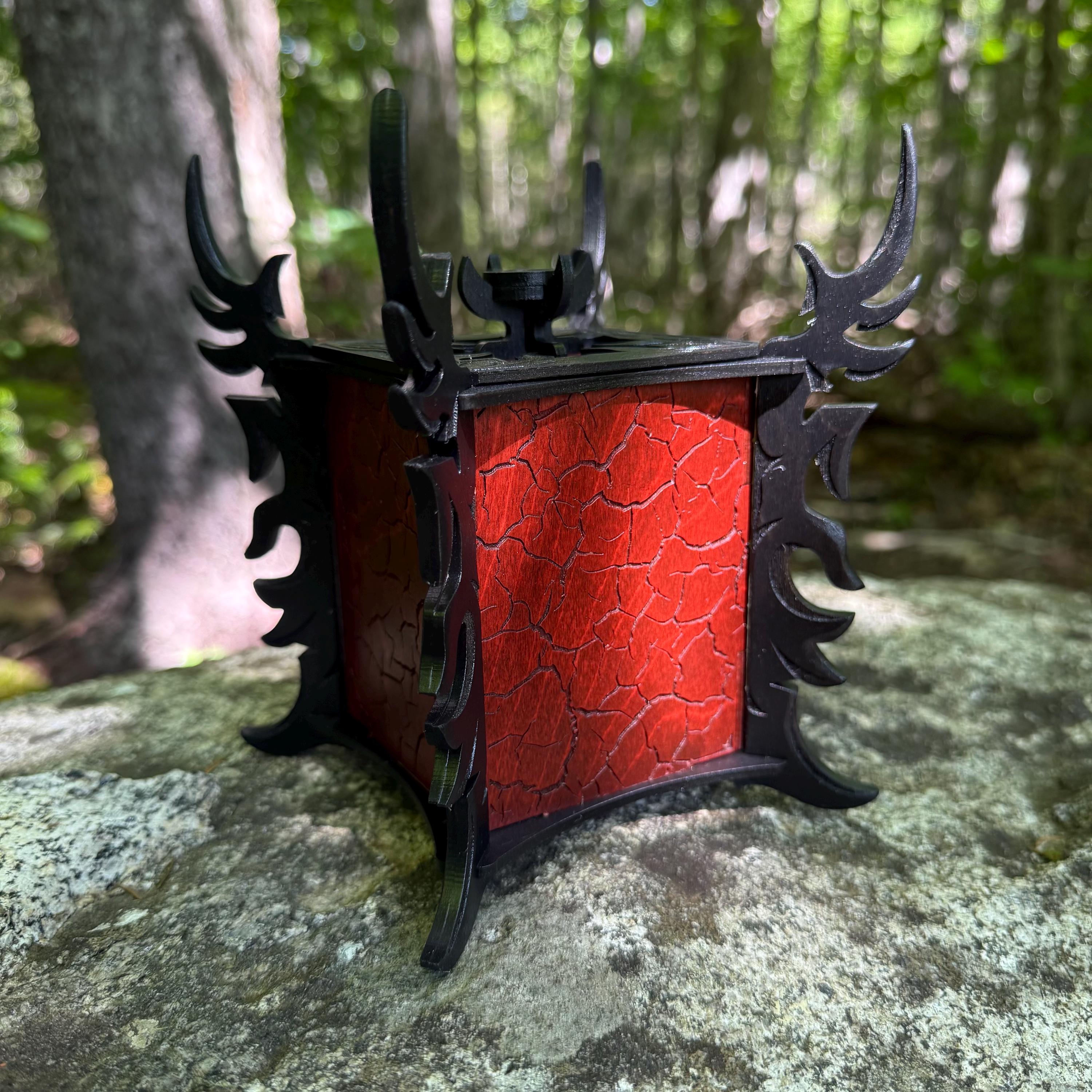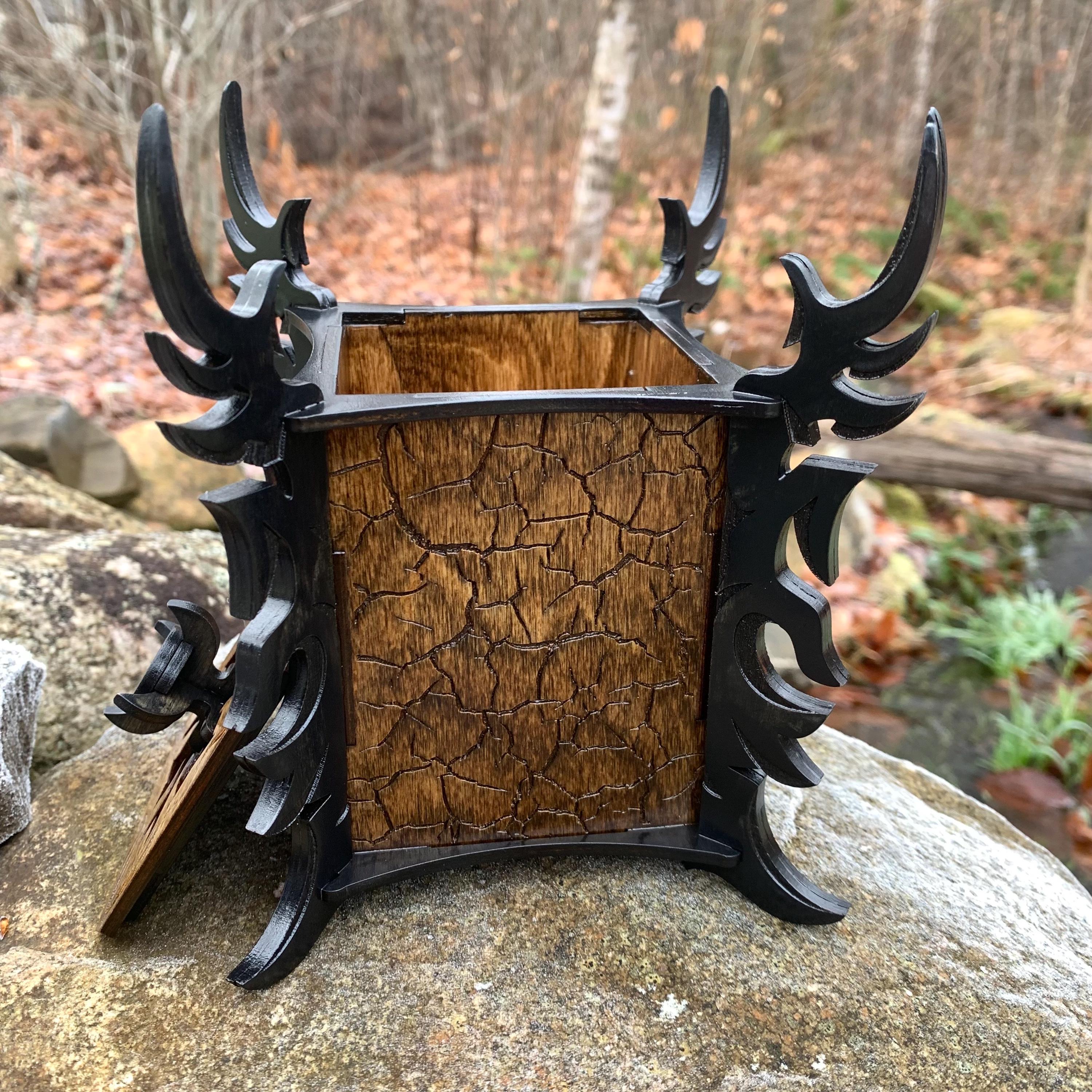 • CUSTOMIZATIONS AVAILABLE: selectable stain colors for the box walls and top underpanel; stain colors are limited to those listed in the drop-down options selector. In all creations, the four corner assemblies and decorative frames will be stained black. Additionally, the sides of the box may be decorated with letters from the Daedric alphabet, to personalize the coffer with its owner's initials or a four-letter acronym. The Daedric letters will be created from birch ply, stained black, and superimposed over the existing 'cracked' texture (see listing photos for an example). Please select your Personalization option from the drop-down selector, then use the Personalization section to request your desired letters. Requests for 2 letters will have those letters installed on opposite sides of the box.