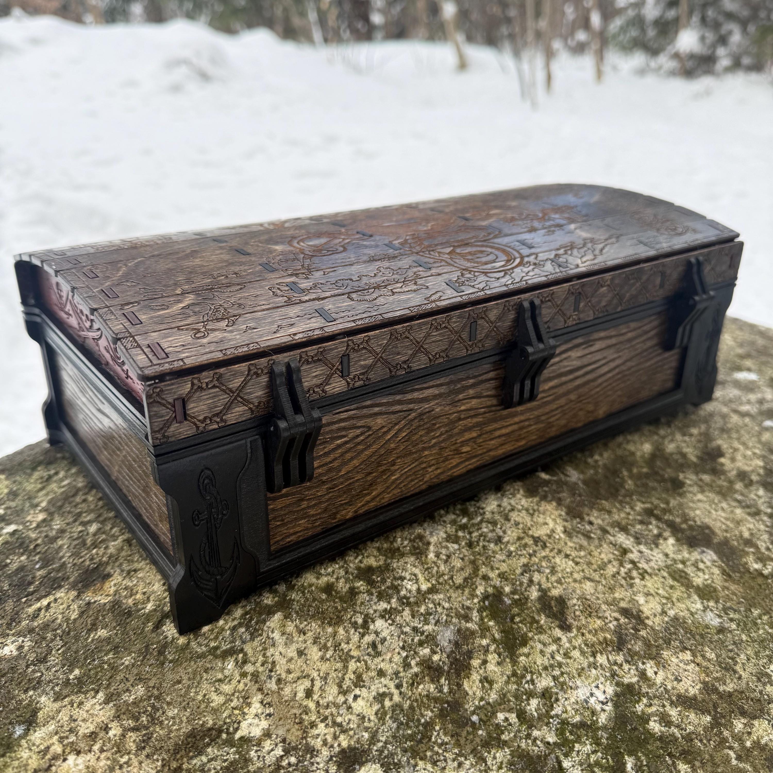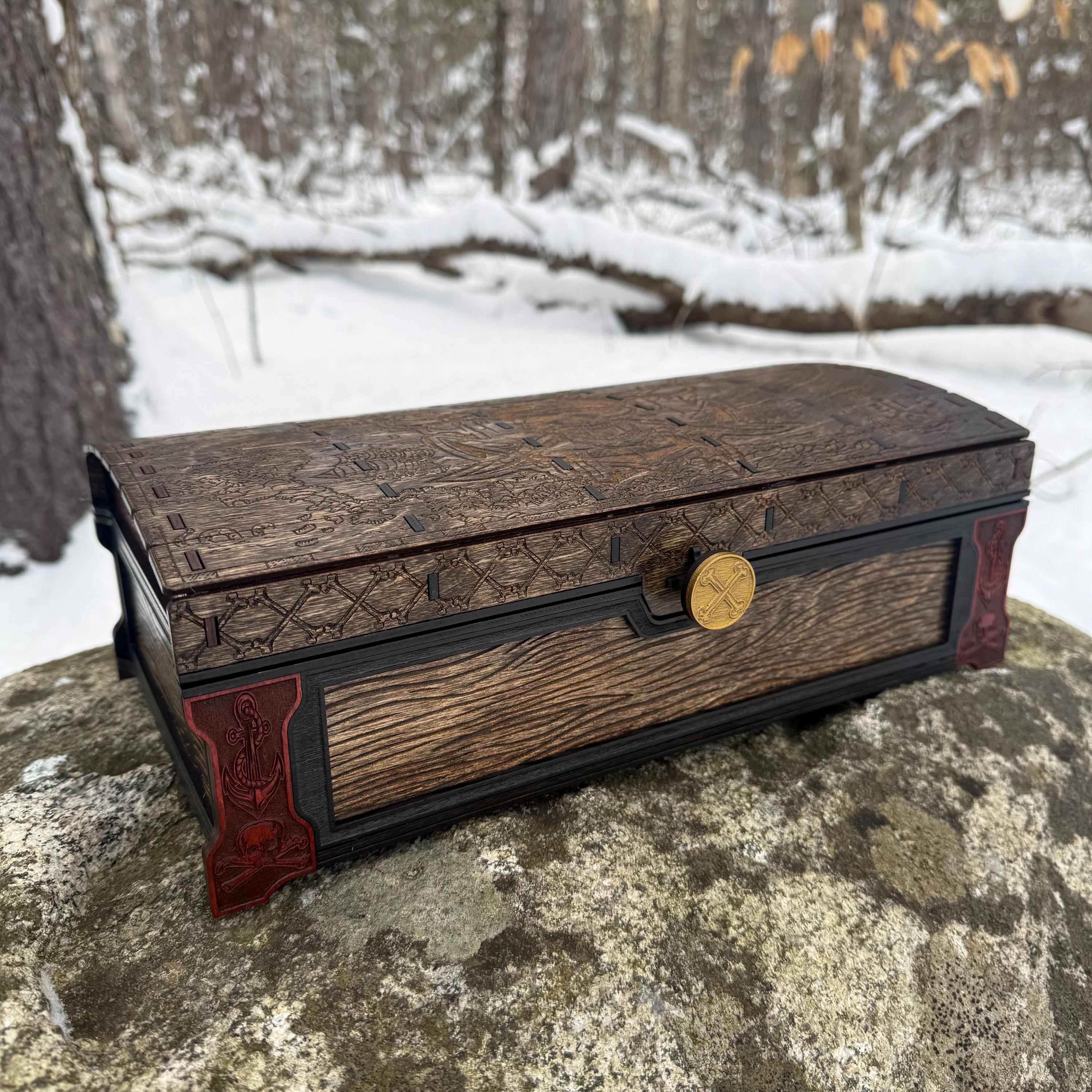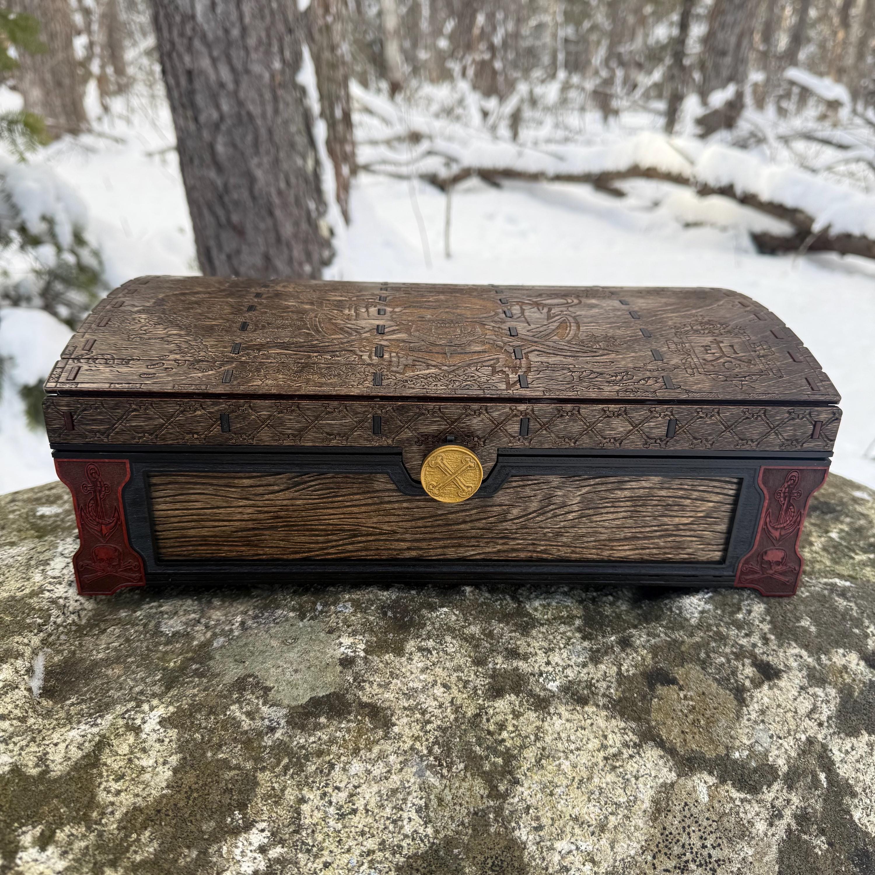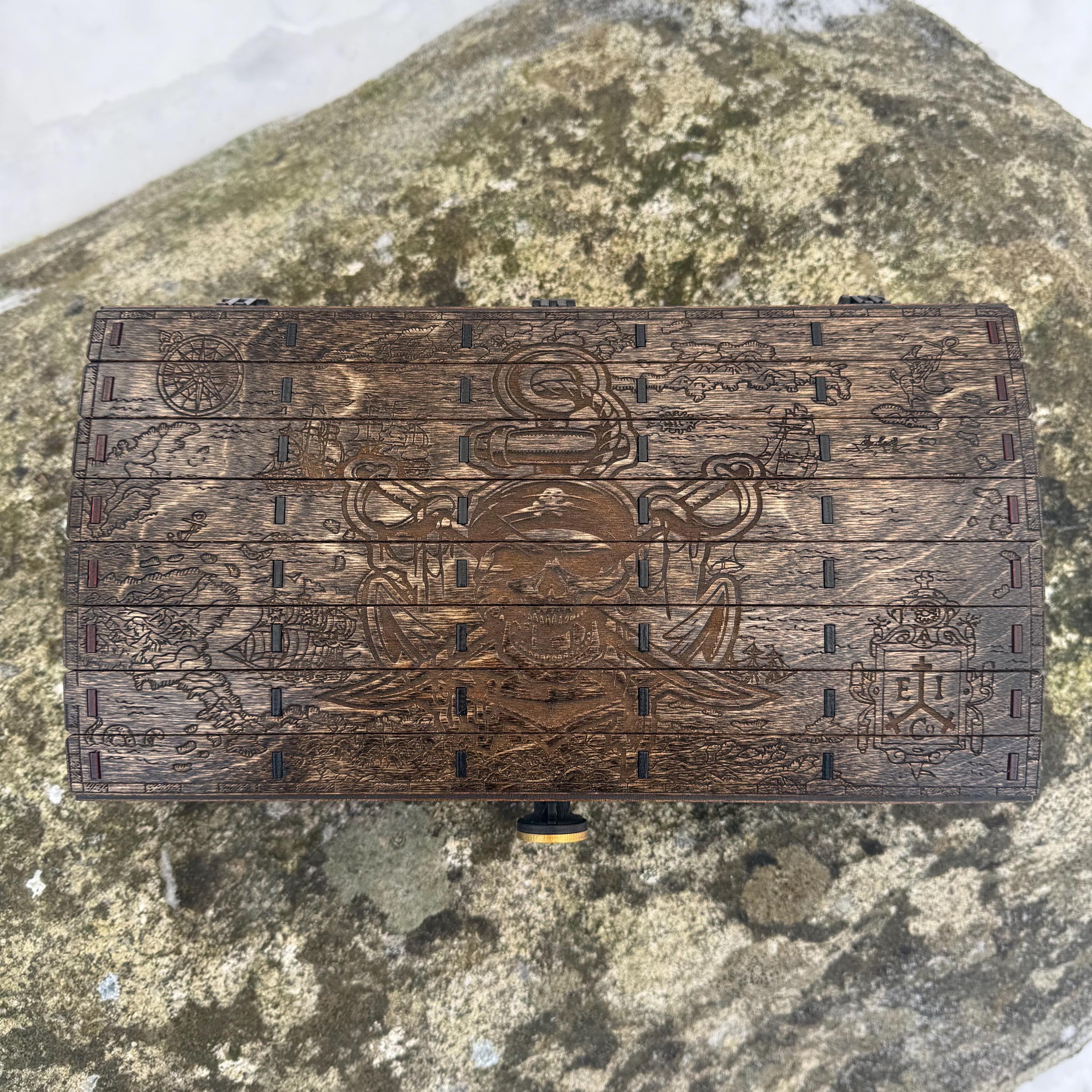 This handsome wooden chest, adorned with a piratical skull and crossbones imposed over a nautical map, is perfect as a keepsake box, gaming case, or any other function a small treasure chest could accomplish. Created from 1/8-inch grade "BB" birch plywood, with high resolution laser engraved artwork and a dual staining process for an extra level of detail. Due to the manner of its construction, this chest is very resilient and durable, with double layers at important structural points and bracing that also lends greatly to its appearance. The top is hinged with a clever wooden hinge system. As an added elegant touch, the interior is padded with EVA foam and lined in jeweler's velvet as further protection for the items stored within. Powerful N52 magnets keep the lid securely closed. This chest would make a great gift for enthusiasts of the Pirate Age, and sure to last for many generations - certainly longer than the Golden Age of Piracy itself!