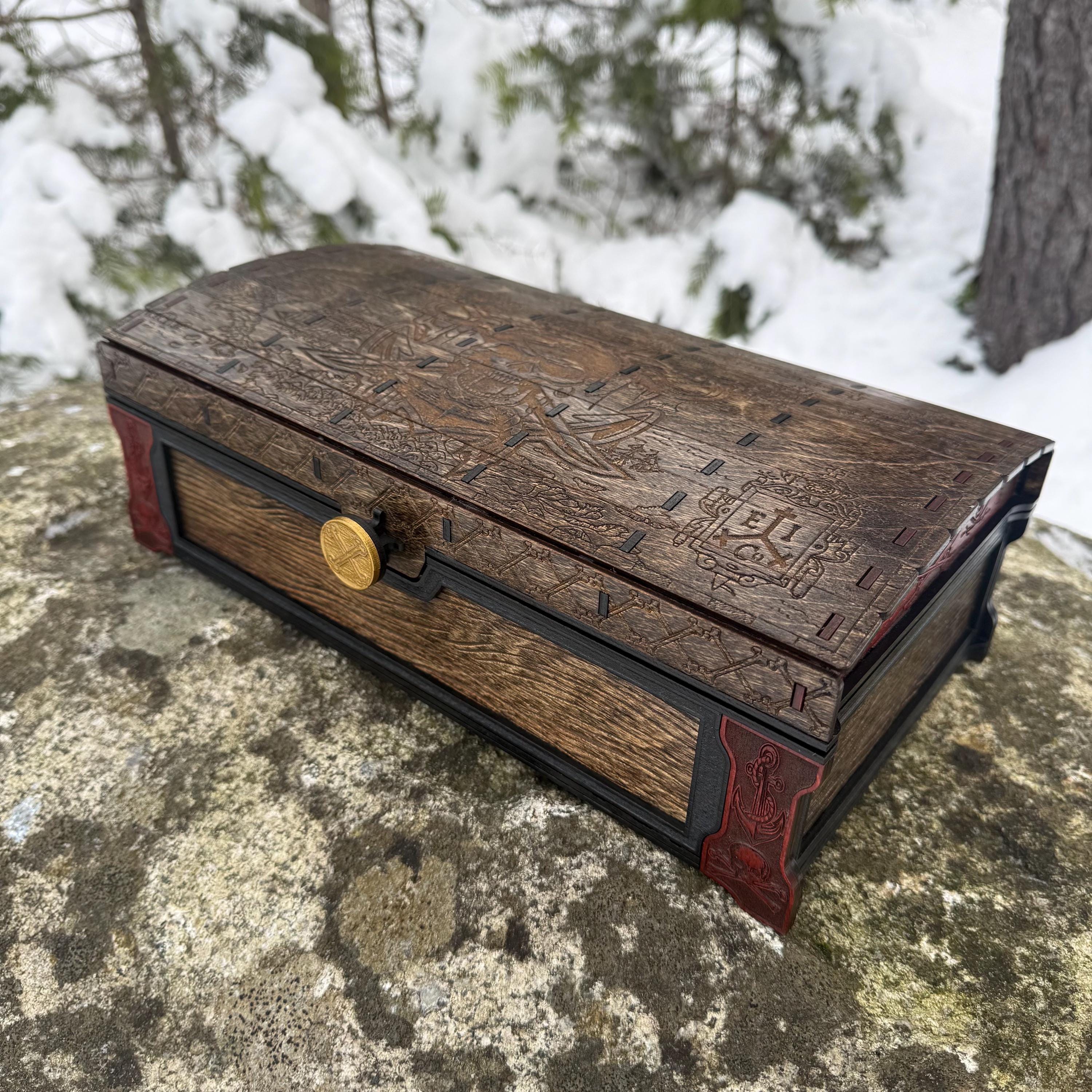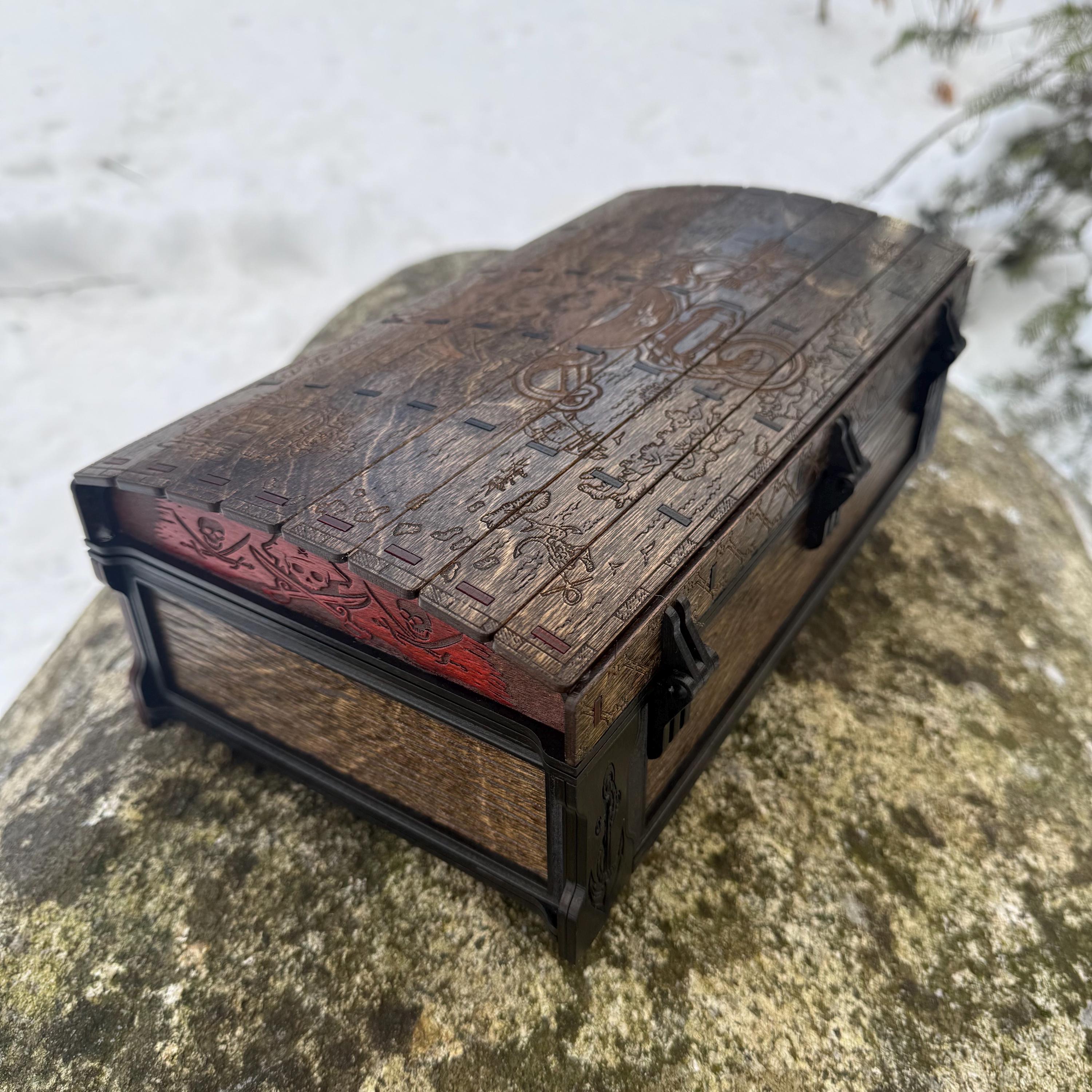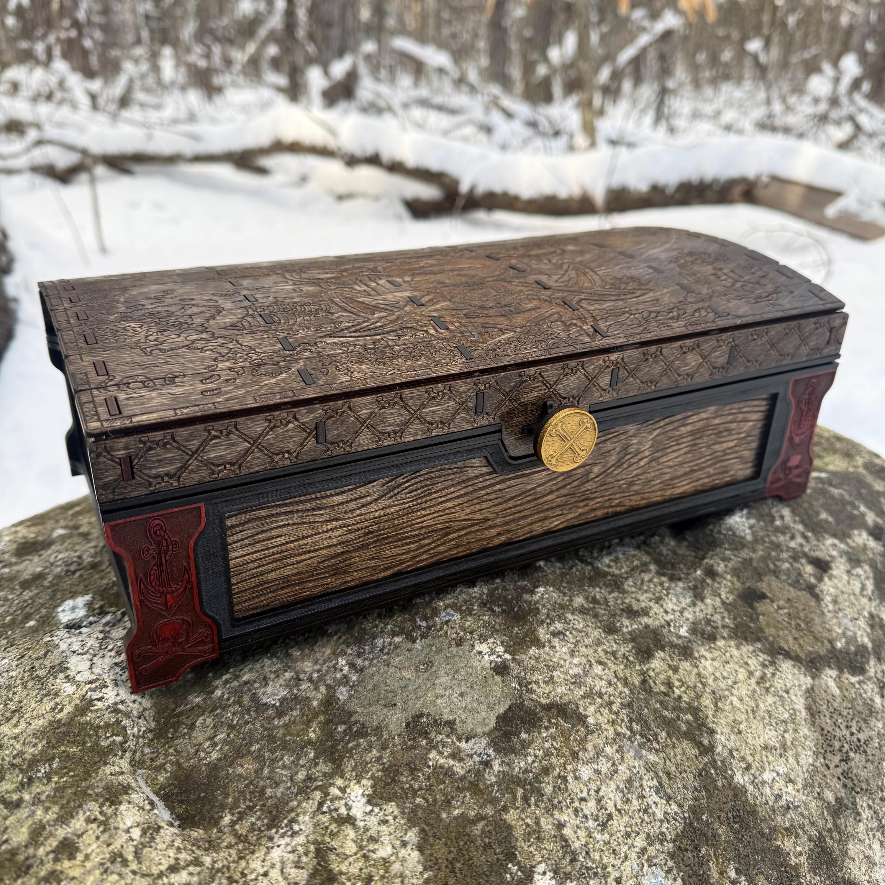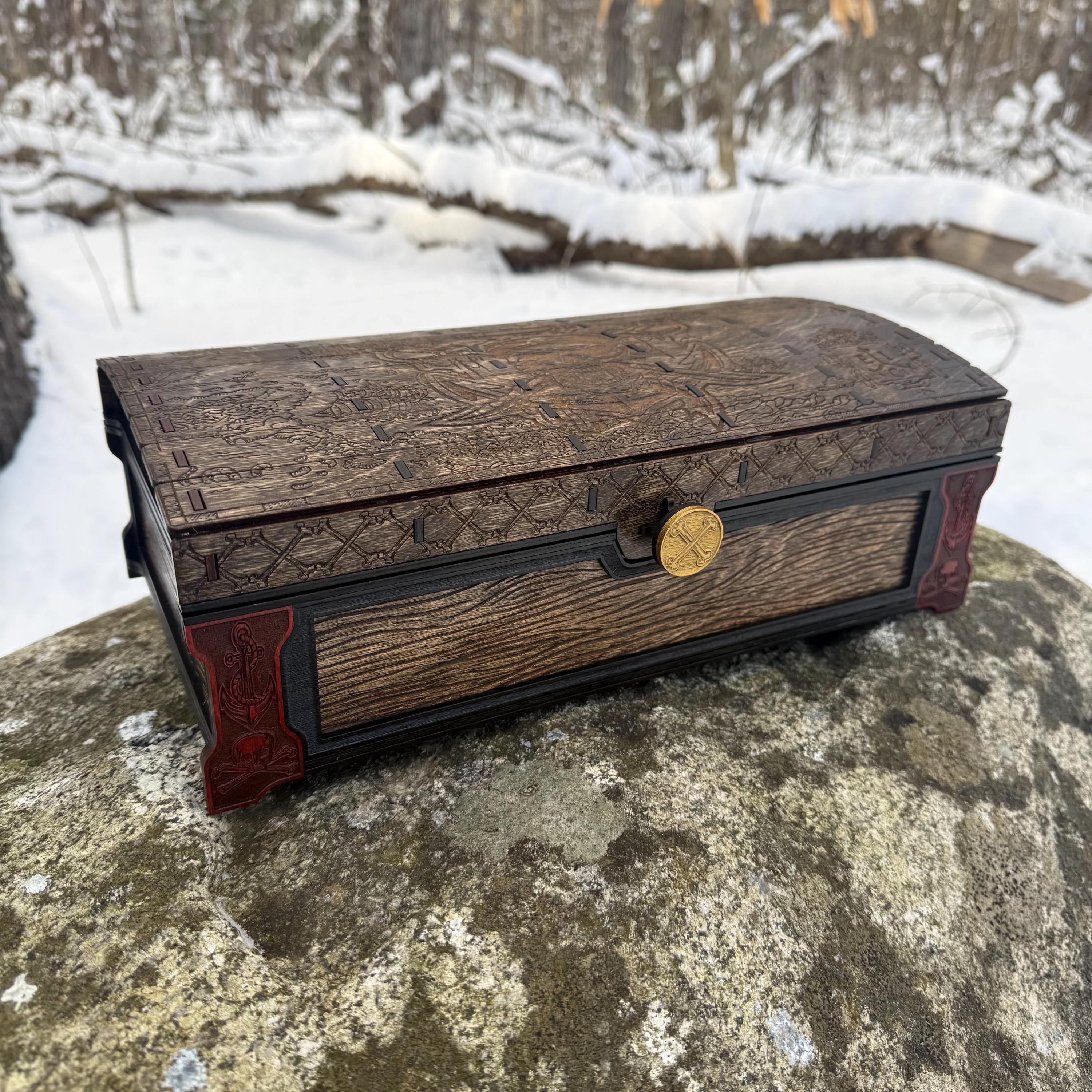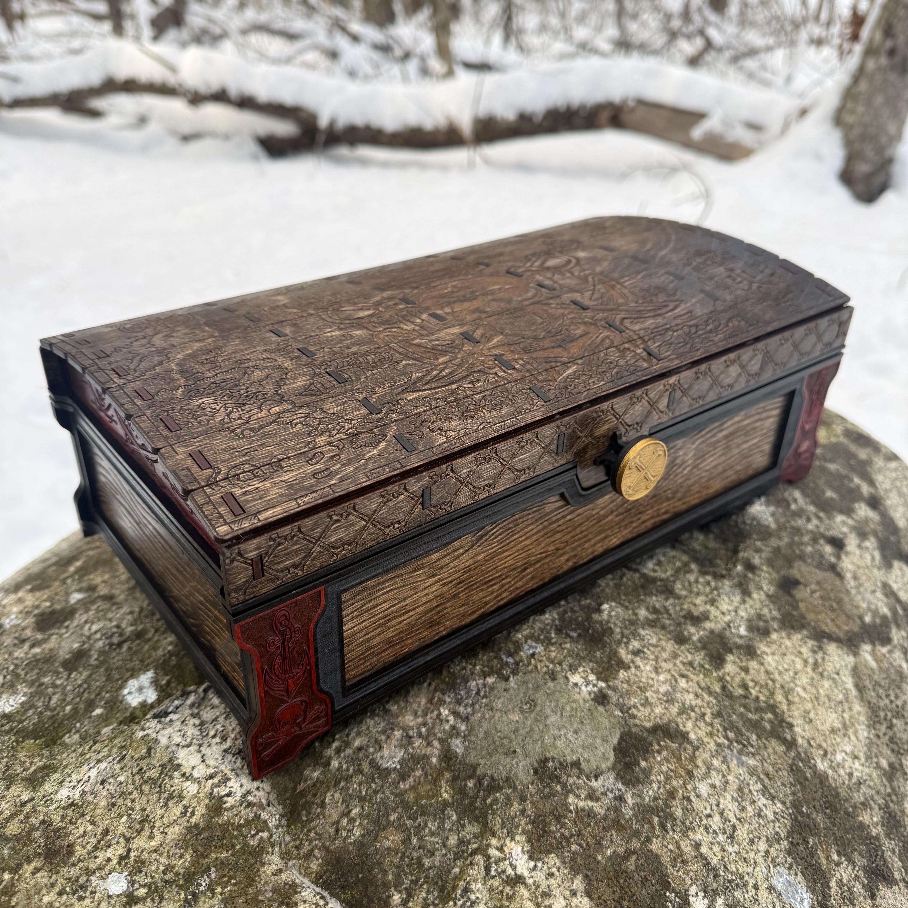 This handsome wooden chest, adorned with a piratical skull and crossbones imposed over a nautical map, is perfect as a keepsake box, gaming case, or any other function a small treasure chest could accomplish. Created from 1/8-inch grade "BB" birch plywood, with high resolution laser engraved artwork and a dual staining process for an extra level of detail. Due to the manner of its construction, this chest is very resilient and durable, with double layers at important structural points and bracing that also lends greatly to its appearance. The top is hinged with a clever wooden hinge system. As an added elegant touch, the interior is padded with EVA foam and lined in jeweler's velvet as further protection for the items stored within. Powerful N52 magnets keep the lid securely closed. This chest would make a great gift for enthusiasts of the Pirate Age, and sure to last for many generations - certainly longer than the Golden Age of Piracy itself!