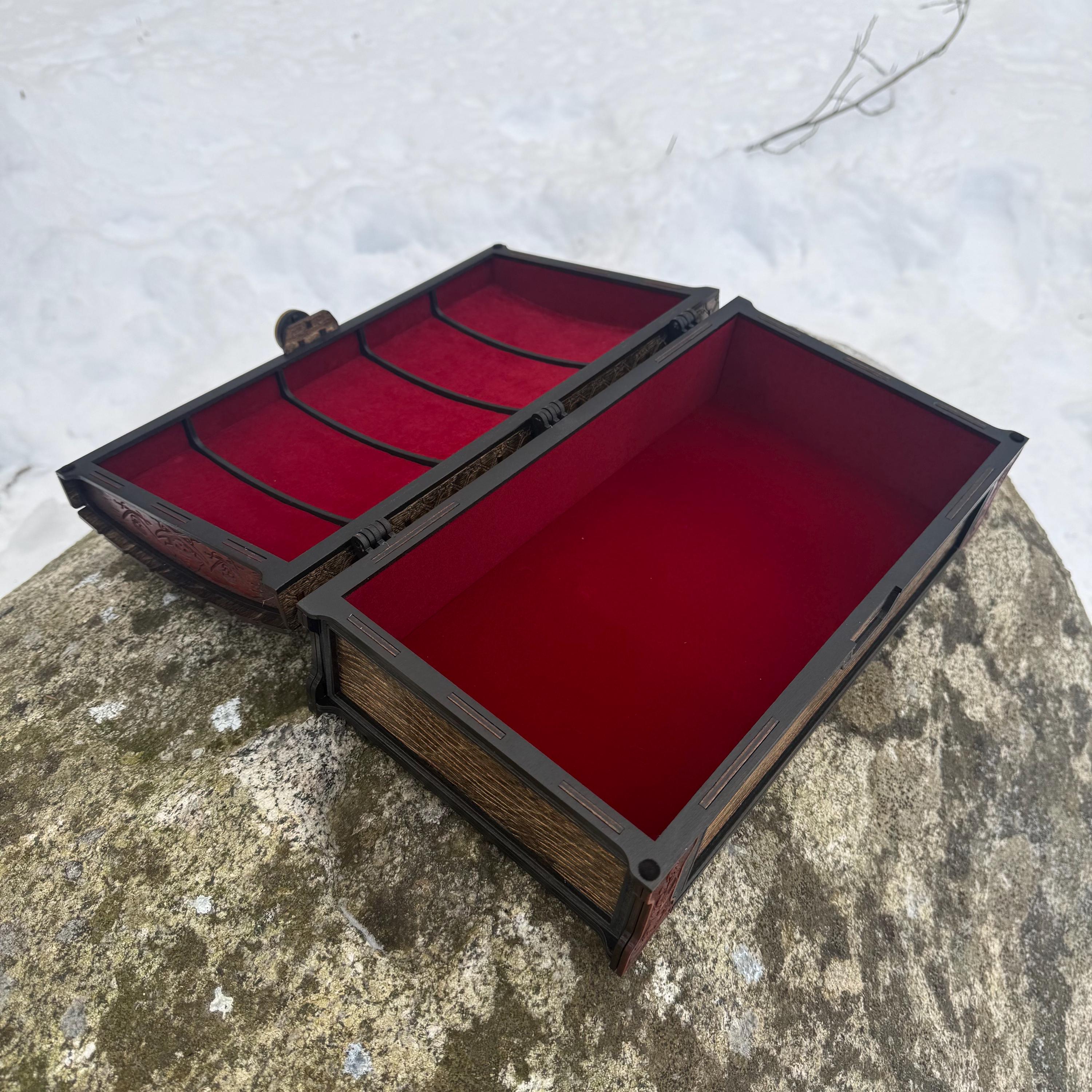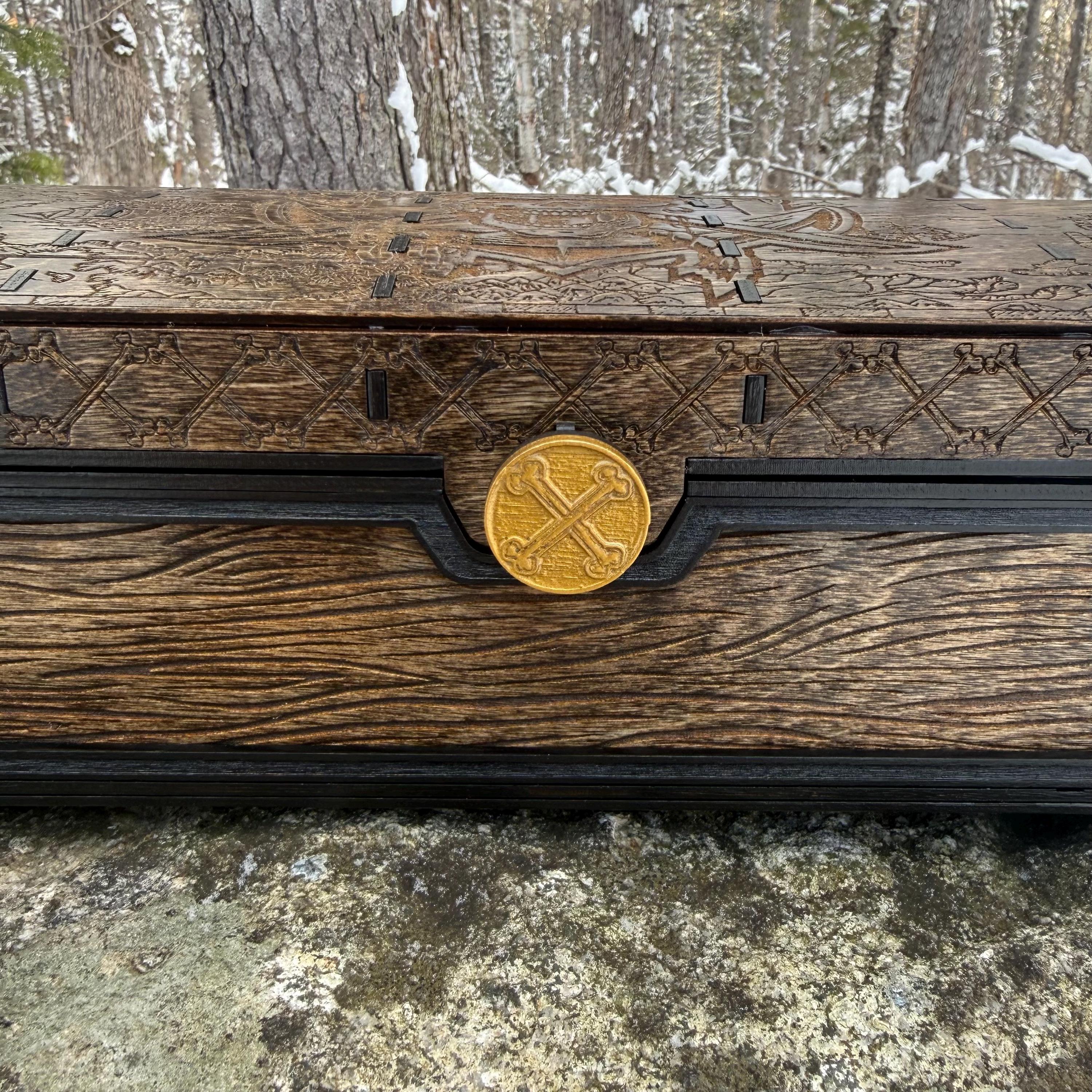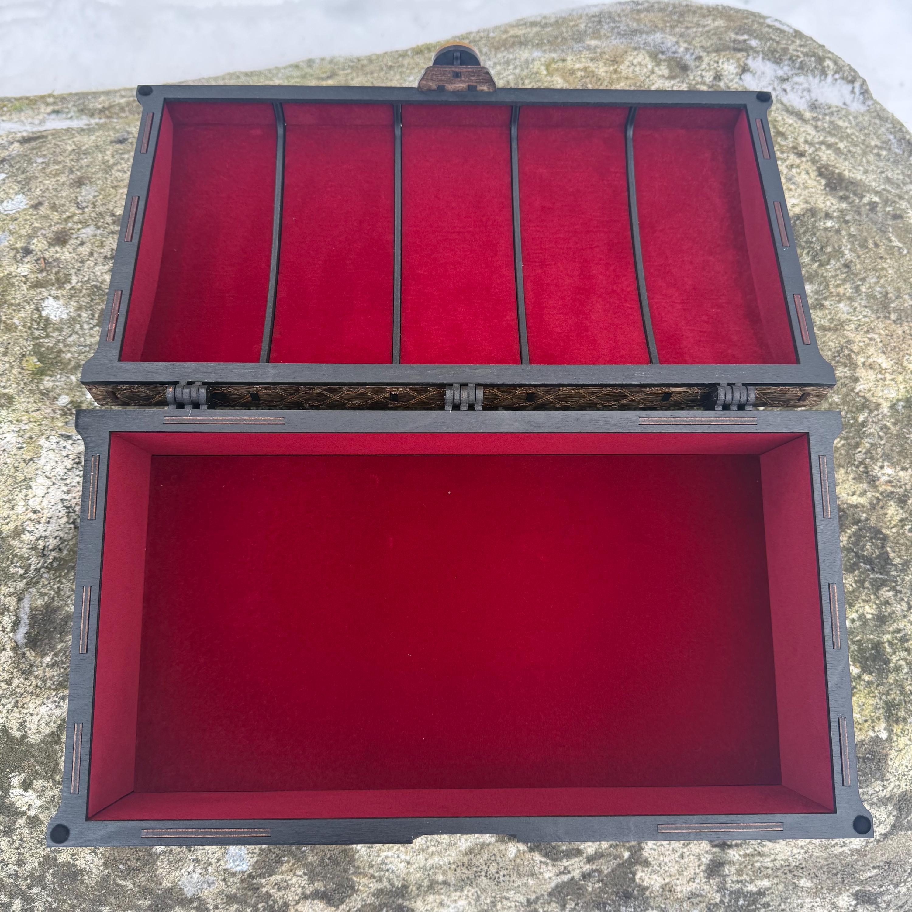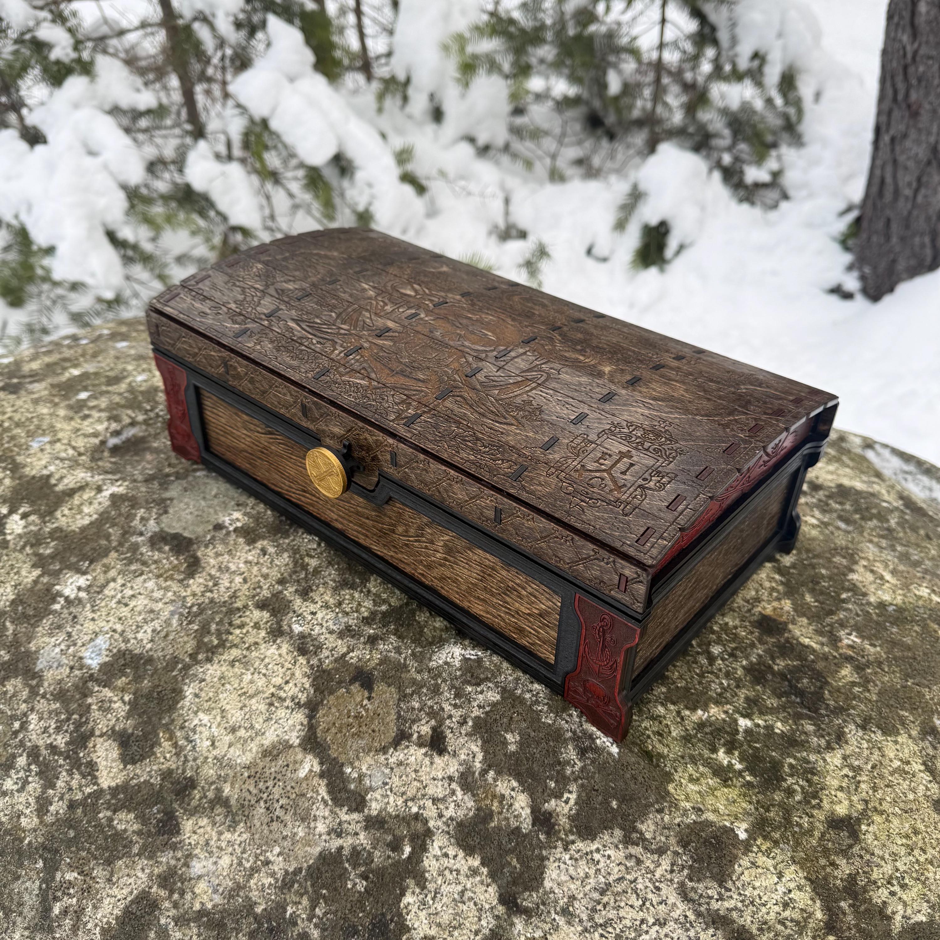 This handsome wooden chest, adorned with a piratical skull and crossbones imposed over a nautical map, is perfect as a keepsake box, gaming case, or any other function a small treasure chest could accomplish. Created from 1/8-inch grade "BB" birch plywood, with high resolution laser engraved artwork and a dual staining process for an extra level of detail. Due to the manner of its construction, this chest is very resilient and durable, with double layers at important structural points and bracing that also lends greatly to its appearance. The top is hinged with a clever wooden hinge system. As an added elegant touch, the interior is padded with EVA foam and lined in jeweler's velvet as further protection for the items stored within. Powerful N52 magnets keep the lid securely closed. This chest would make a great gift for enthusiasts of the Pirate Age, and sure to last for many generations - certainly longer than the Golden Age of Piracy itself!