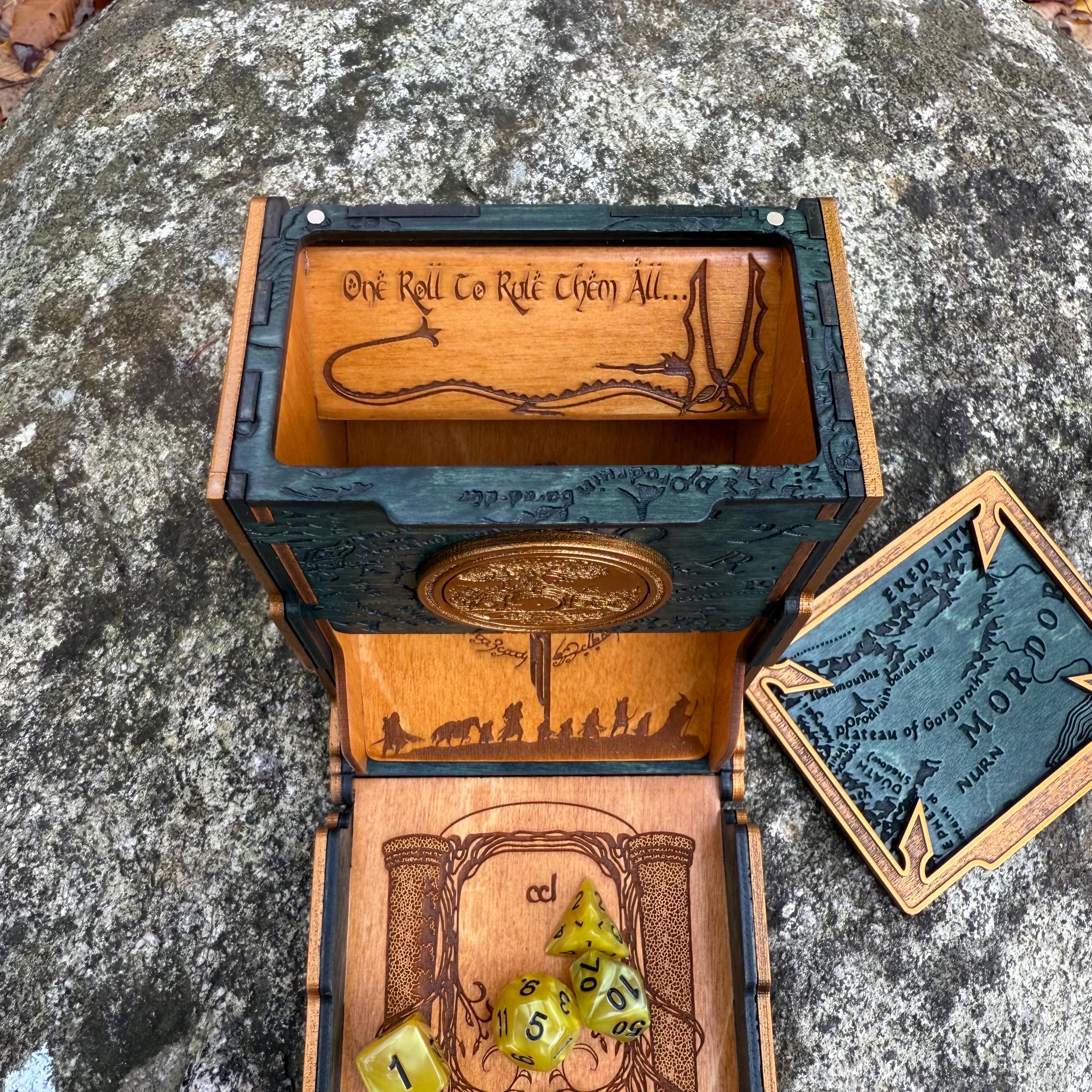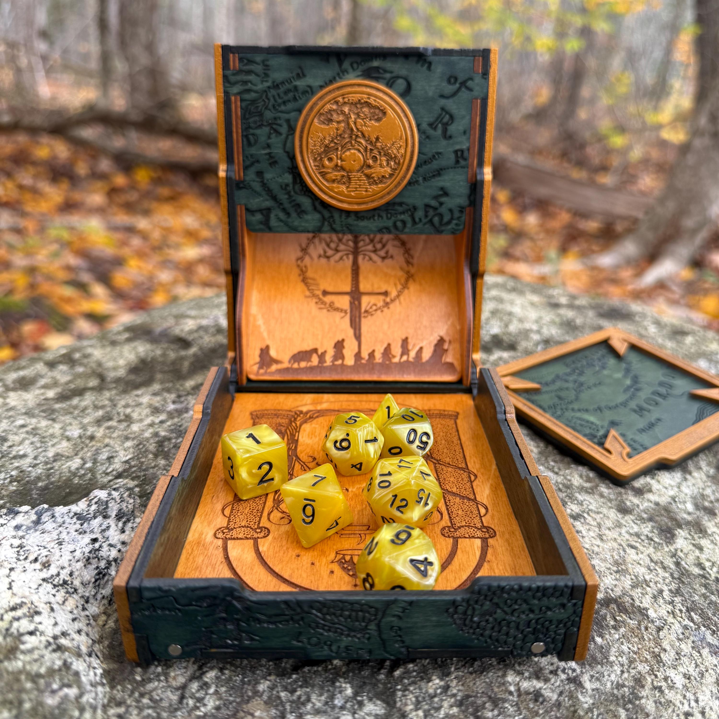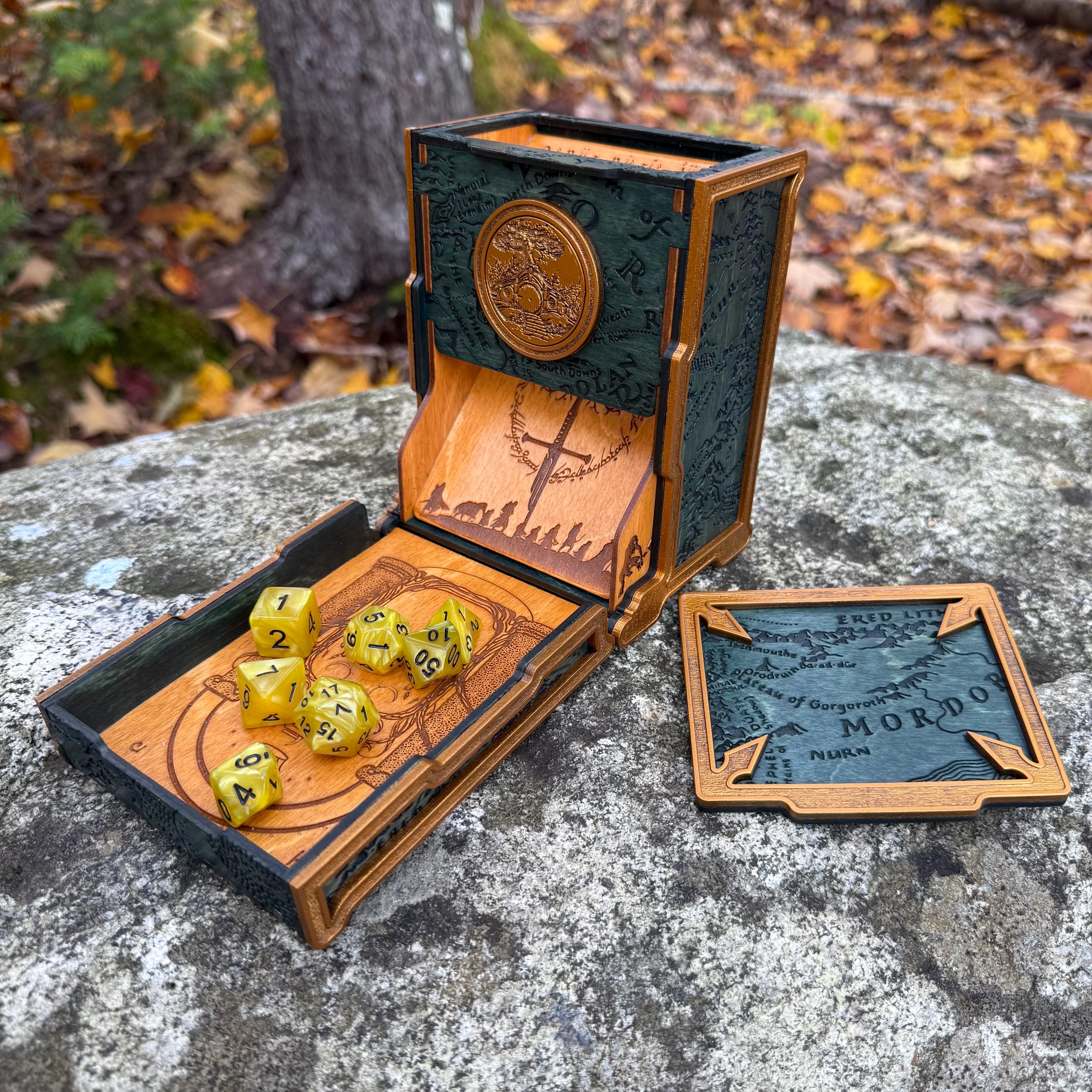 Display your love for Professor Tolkien and his greatest creation, the world of Middle-Earth, with this handcrafted and wonderfully embellished wooden dice tower! Each "Tolkien's Legacy" dice tower is laser engraved with recognizable and iconic images from Middle Earth, as well as Tolkien's runic signature and a few pieces of his own artwork, all superimposed or integrated over a Middle Earth map background texture. This tower also features a magnetic lid top which locks the tray in the upright position, allowing for storage of dice or other small gaming components within! Perfect for players of fantasy RPGs, Ares Games' "War of the Ring", or as a gift for that special someone who loves Middle-Earth!