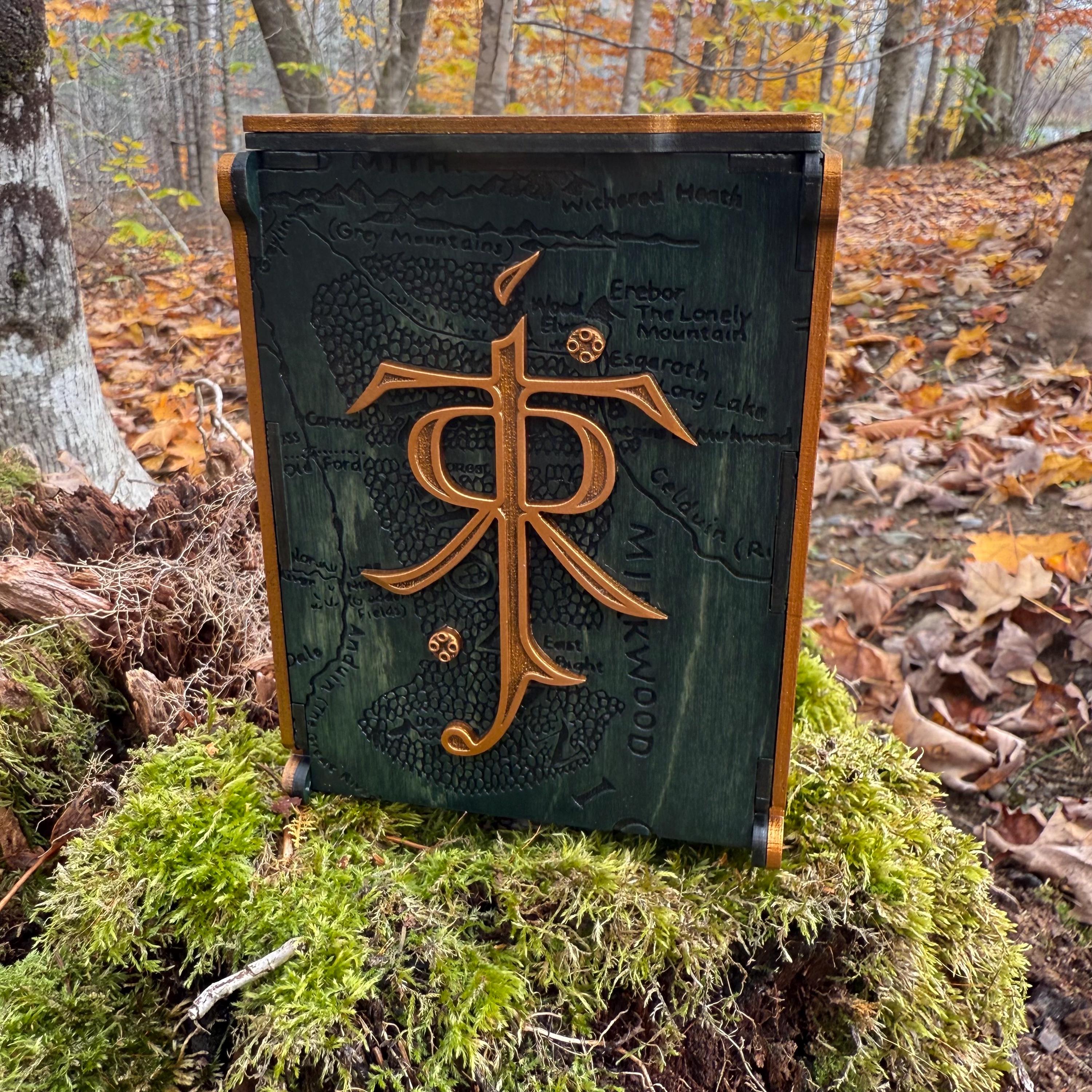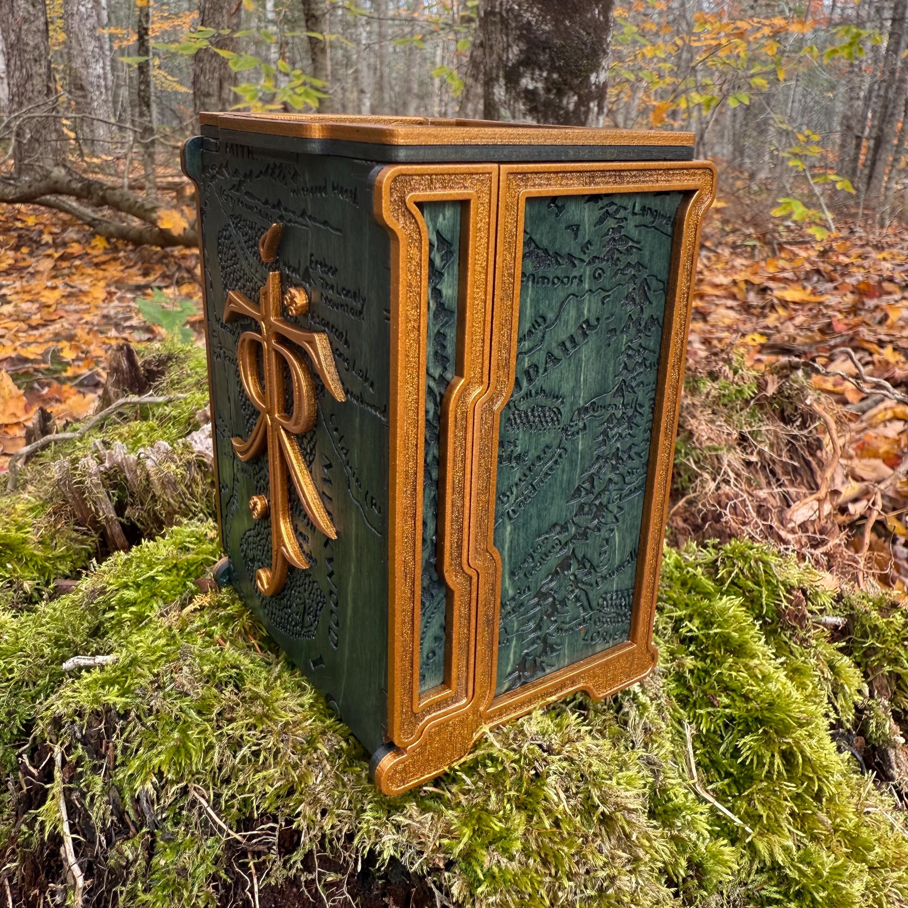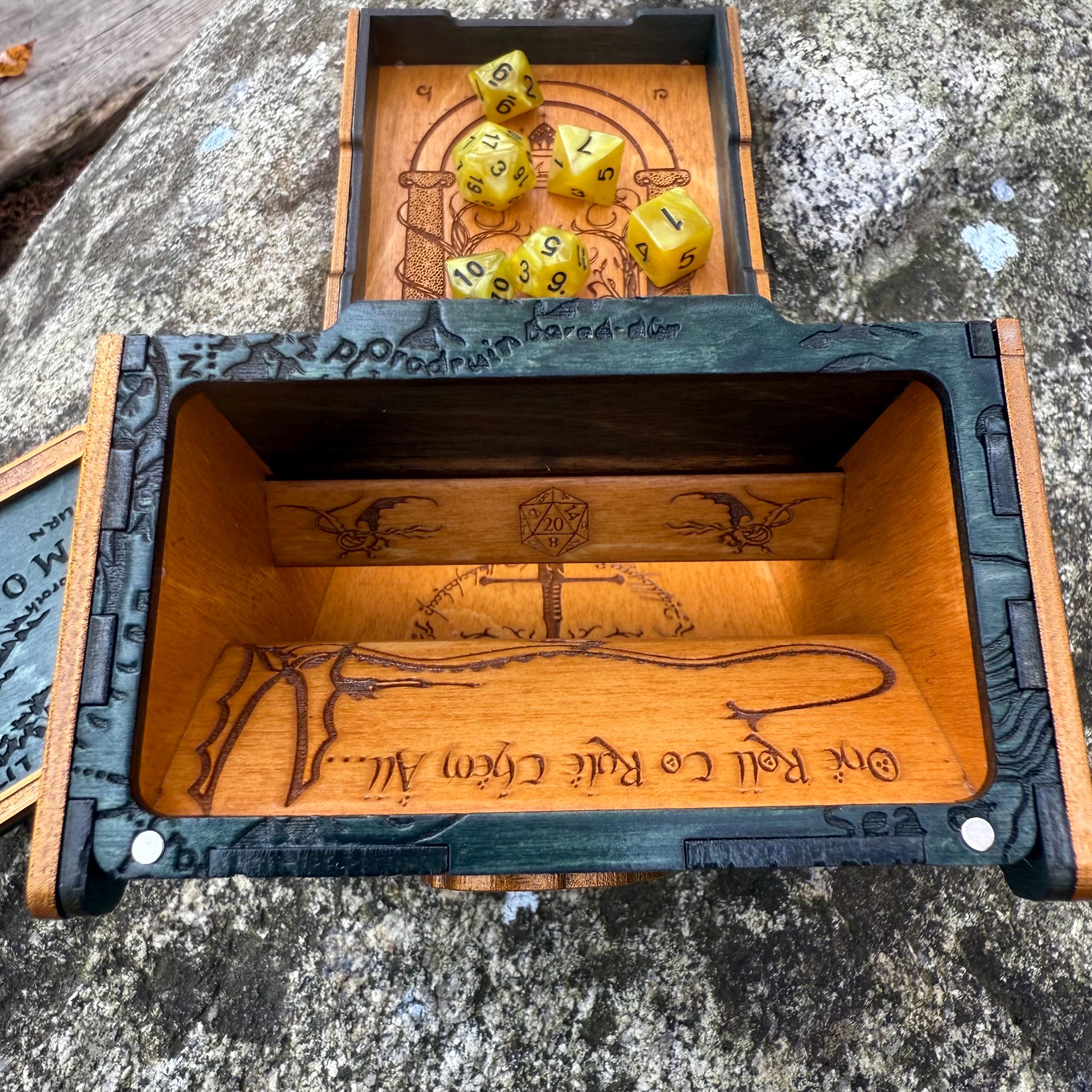 Display your love for Professor Tolkien and his greatest creation, the world of Middle-Earth, with this handcrafted and wonderfully embellished wooden dice tower! Each "Tolkien's Legacy" dice tower is laser engraved with recognizable and iconic images from Middle Earth, as well as Tolkien's runic signature and a few pieces of his own artwork, all superimposed or integrated over a Middle Earth map background texture. This tower also features a magnetic lid top which locks the tray in the upright position, allowing for storage of dice or other small gaming components within! Perfect for players of fantasy RPGs, Ares Games' "War of the Ring", or as a gift for that special someone who loves Middle-Earth!