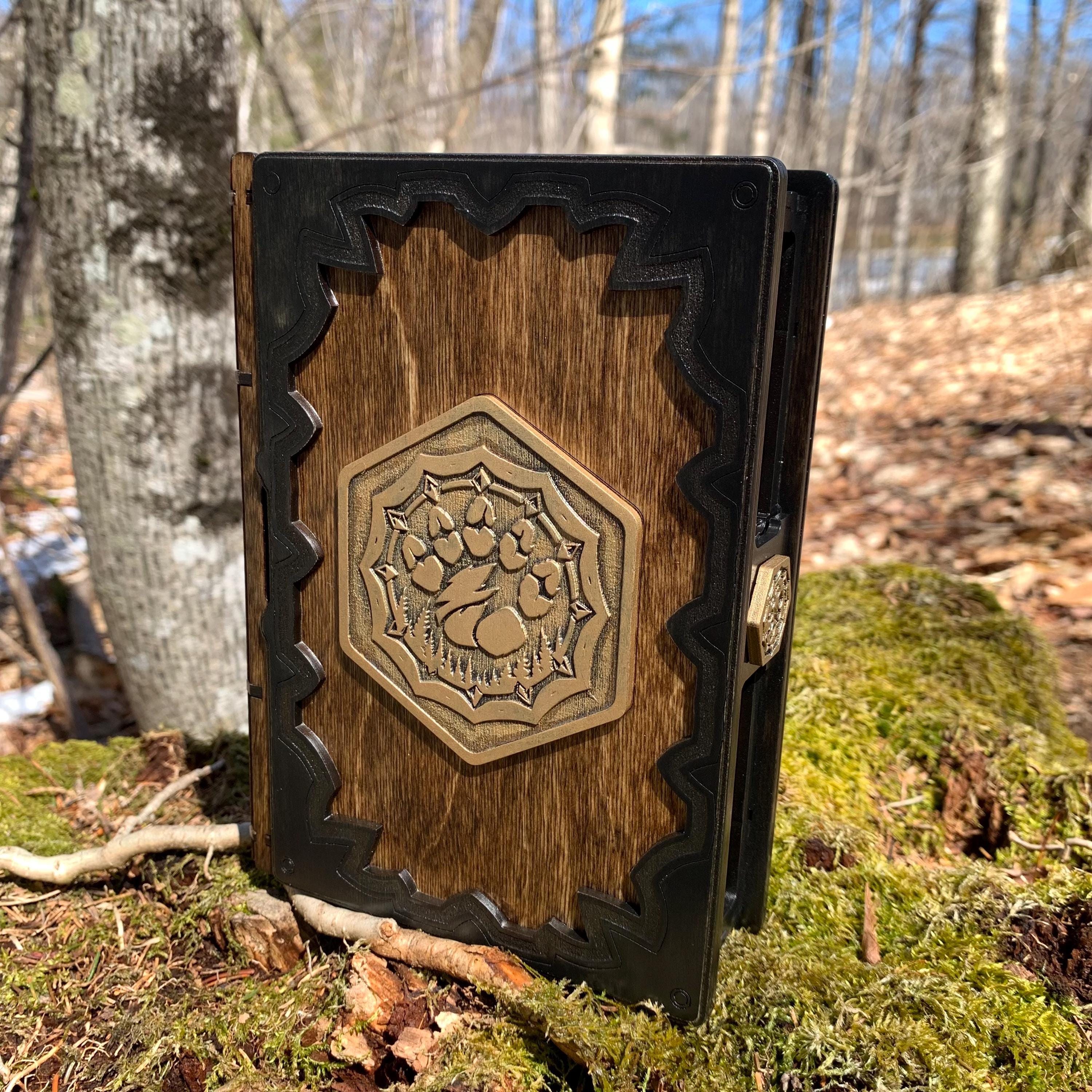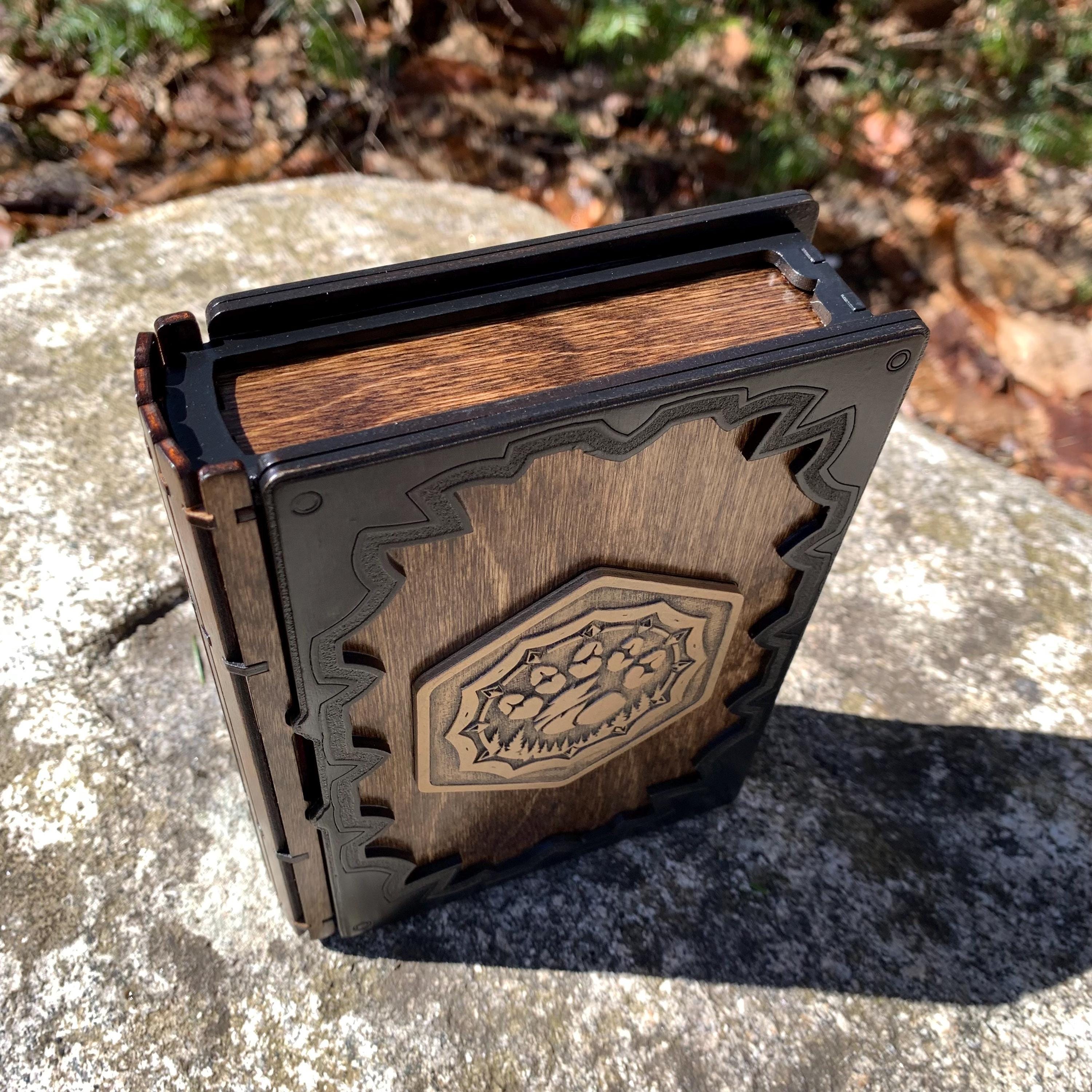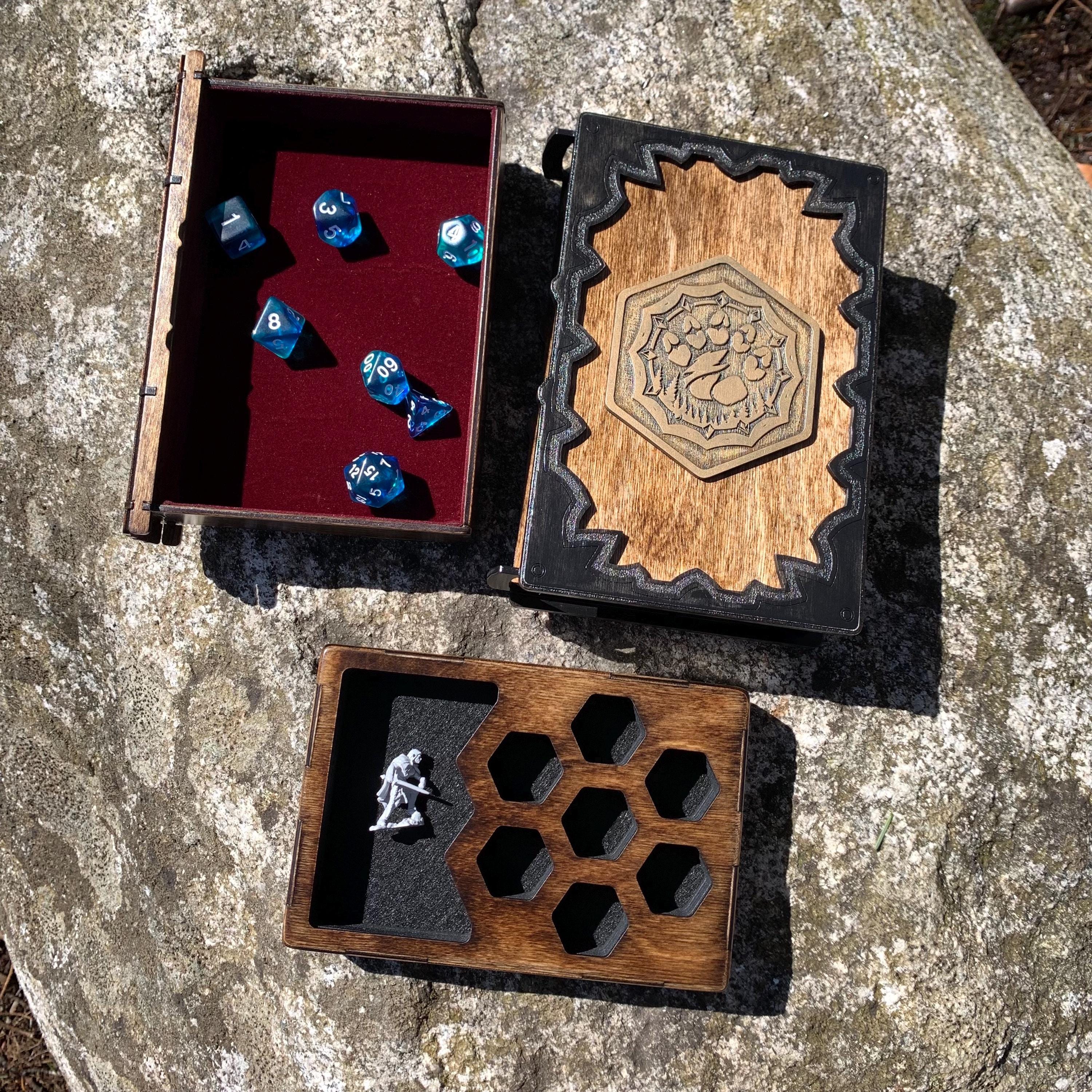 Protect and transport your RPG character miniature and favorite set of gaming dice with this beautiful wooden dice vault and miniature caddy. The "Tome of Heroes" is a book-box format case made from resilient birch plywood, featuring a velvet-lined removable storage tray within an interior sliding drawer. Removing the internal storage tray allows players to use the drawer to roll their dice, making this case a very functional addition to any RPG enthusiast's collection. Each creation may be customized to indicate a player character's class and race by use of highly detailed, laser-engraved and painted medallions, one for each 'cover' of the tome. A smaller character class medallion will adorn the exterior frame edge. The sliding storage drawer magnetizes to the exterior frame when closed, keeping the items within secure and ready for travel. The Tome of Heroes is sure to last many game nights, and many campaigns to come!