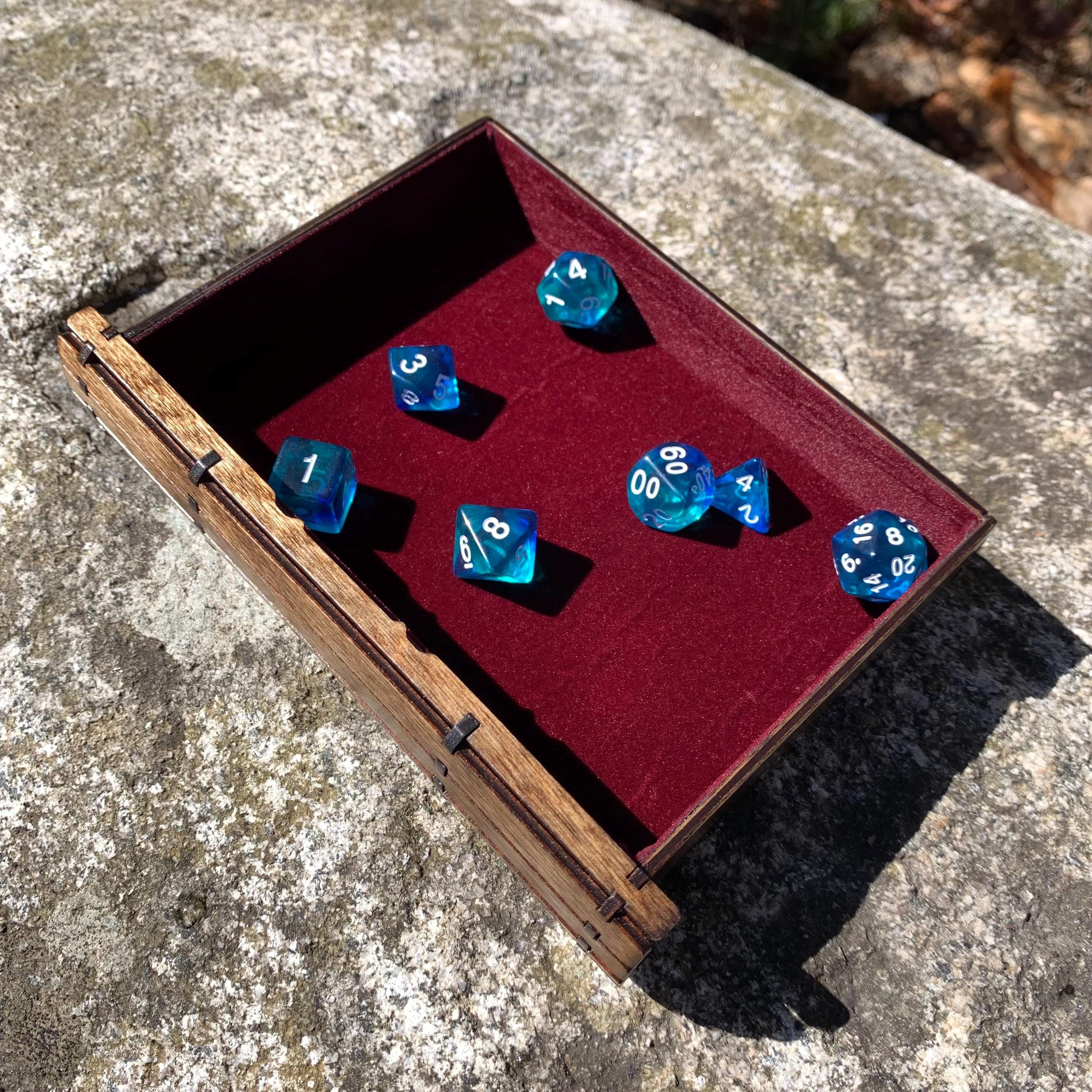 • MEASUREMENTS: 7x5x2 inches [LxWxH] (completed/assembled product); Dice storage compartments will accommodate most standard-sized polyhedral dice. Please contact me if you intend to store sharp-edge crafted resin dice within the tray, so that I may increase the size of the compartments to compensate for the slightly larger size.