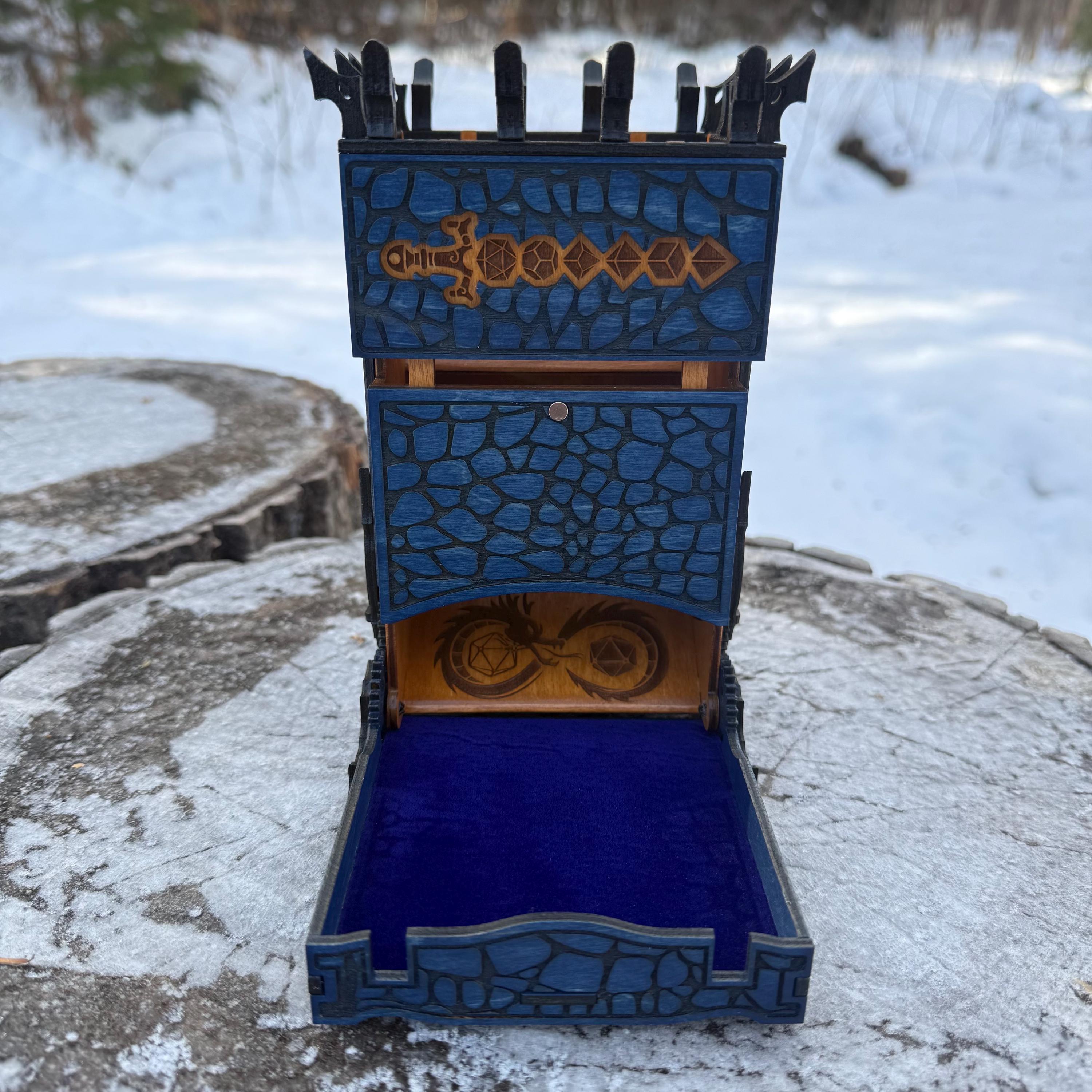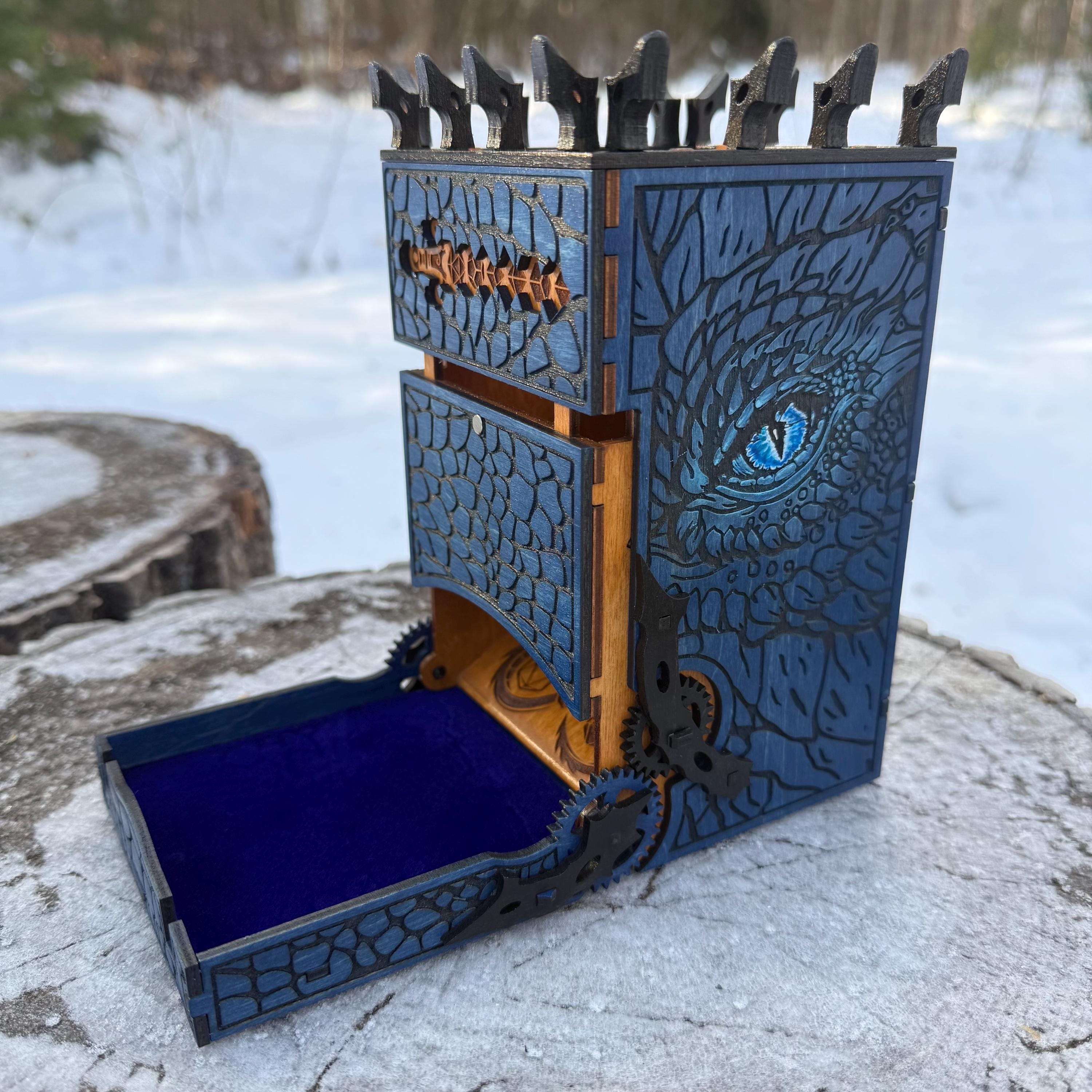 Crafted by the finest Gnomish Artificers, this dragon-themed folding dice tower will make an excellent addition to any player's RPG gear! Perfect for players of fantasy RPGs, boardgames, or as a gift for that special gamer in your life who regularly leads a life of imaginative adventure! Created from quality birch plywood, hand-stained, painted and detailed, with a velvet-lined tray and gears that actually turn and interact, this dice tower is both eye-catching and fully functional - certain to witness many a nat20 over the years!
