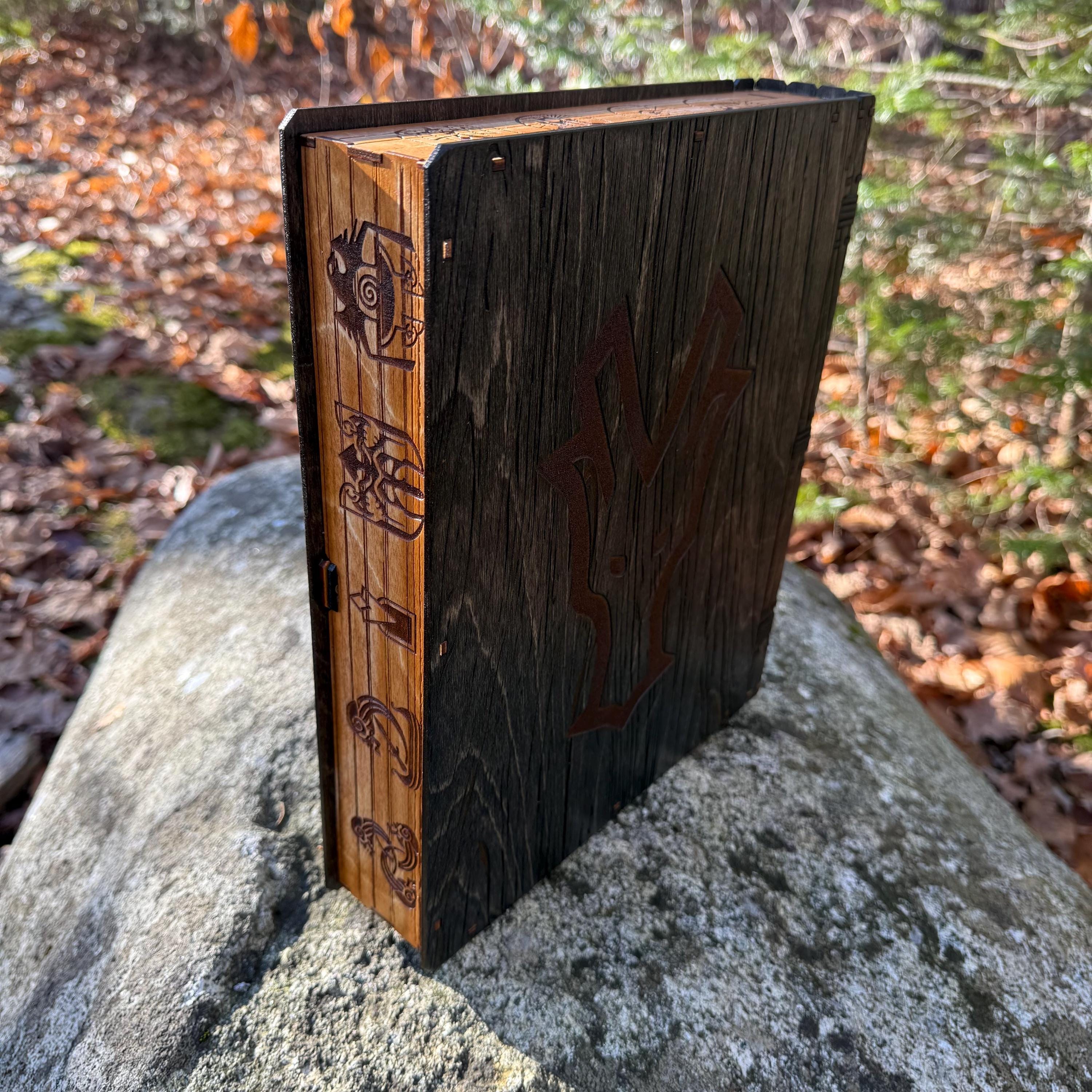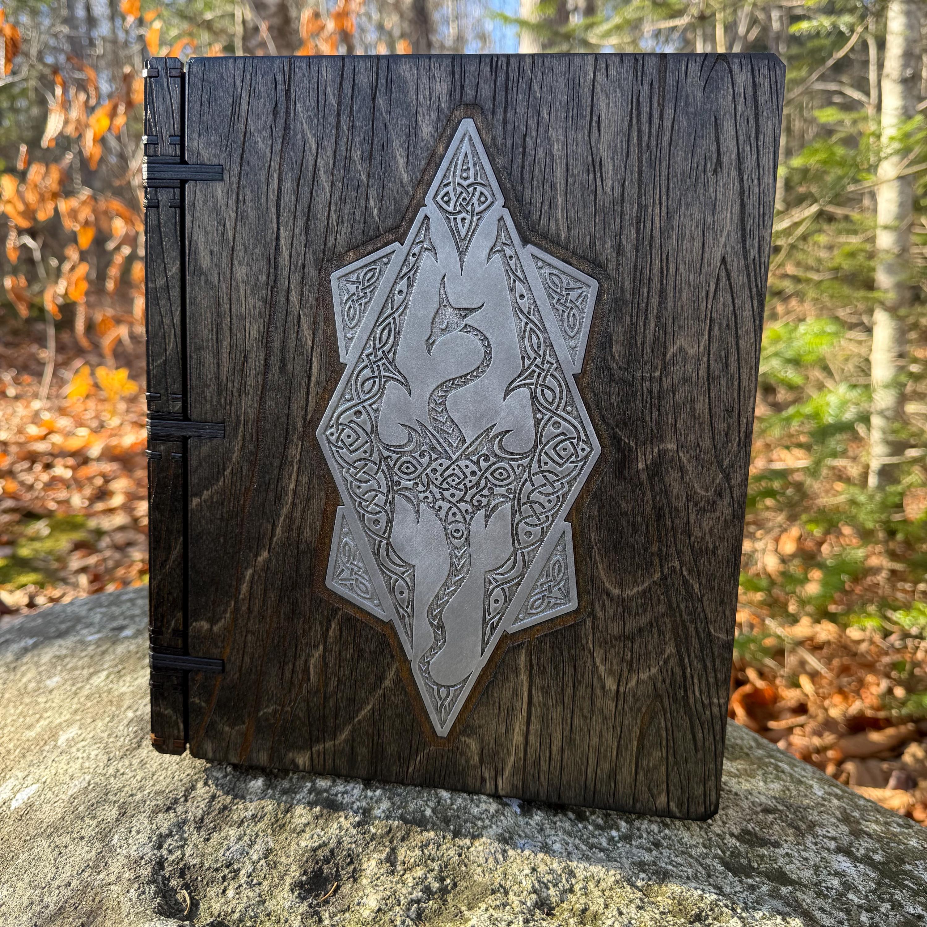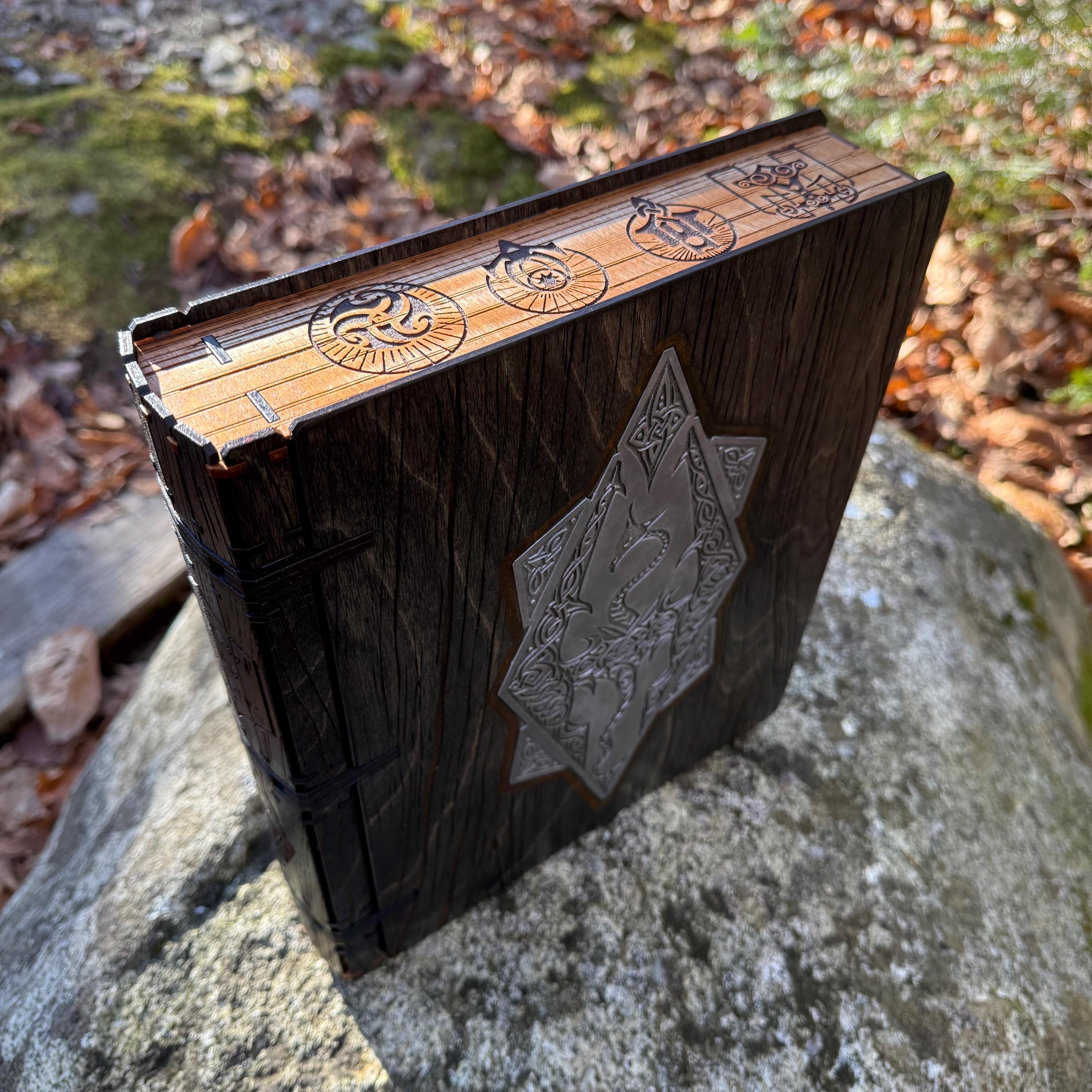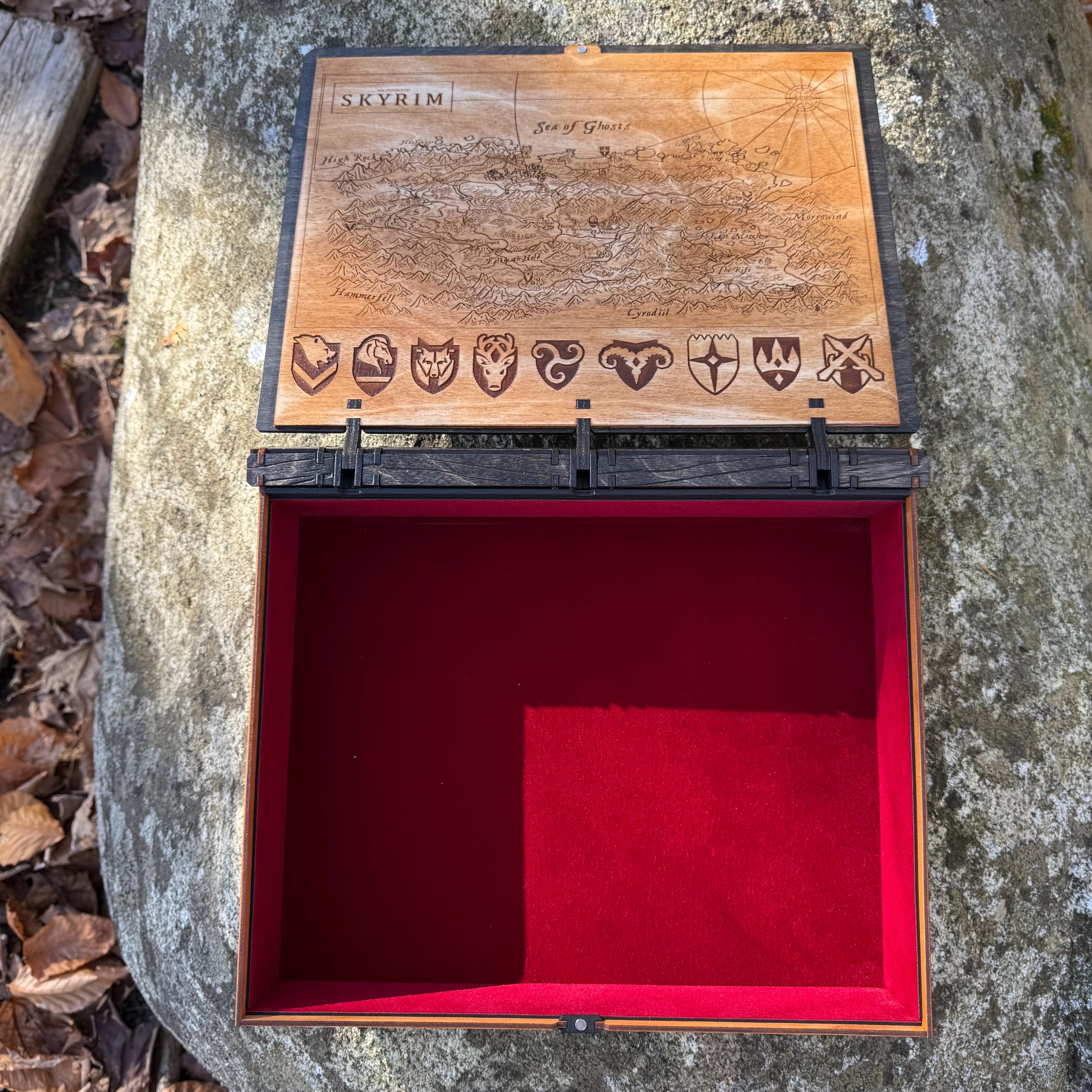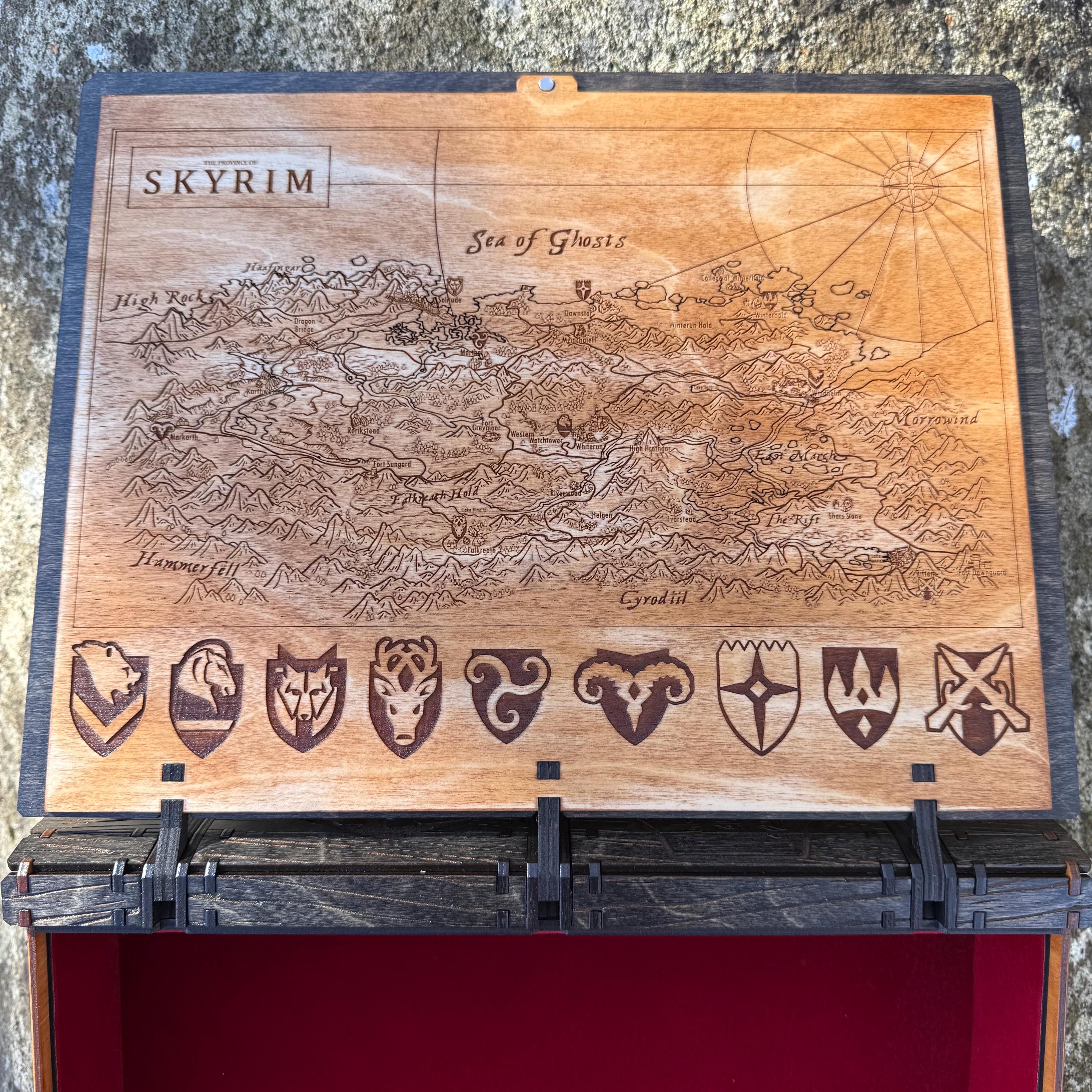A handcrafted wooden case created to resemble an ancient book and decorated with highly detailed artwork from the Elder Scrolls V: Skyrim! Books play an important role in the Elder Scrolls series of games, making this box a perfectly themed gift for all those devoted citizens of Skyrim out there - whether Imperial, Stormcloak, or just an adventurer writing their own saga. A fantastic addition to any bookshelf, this book-box is capable of holding US Letter size sheets of paper within its confines, with still enough space to allow for easy removal and handling of the contents. Engraved in high resolution with the Seal of Akatosh on the front cover, numerous faction icons from the game around the page edges, as well as a labeled binding edge and a large Dragon icon on the back cover. The inside cover is adorned with a detailed map of the Province of Skyrim. This box is very resilient and durable, with double layers that lend greatly to its overall appearance as well as its structural integrity. The top is hinged with a clever integrated wooden hinge system, and the lid stays closed magnetically. The interior is lined in jeweler's velvet to further protect the items stored within.