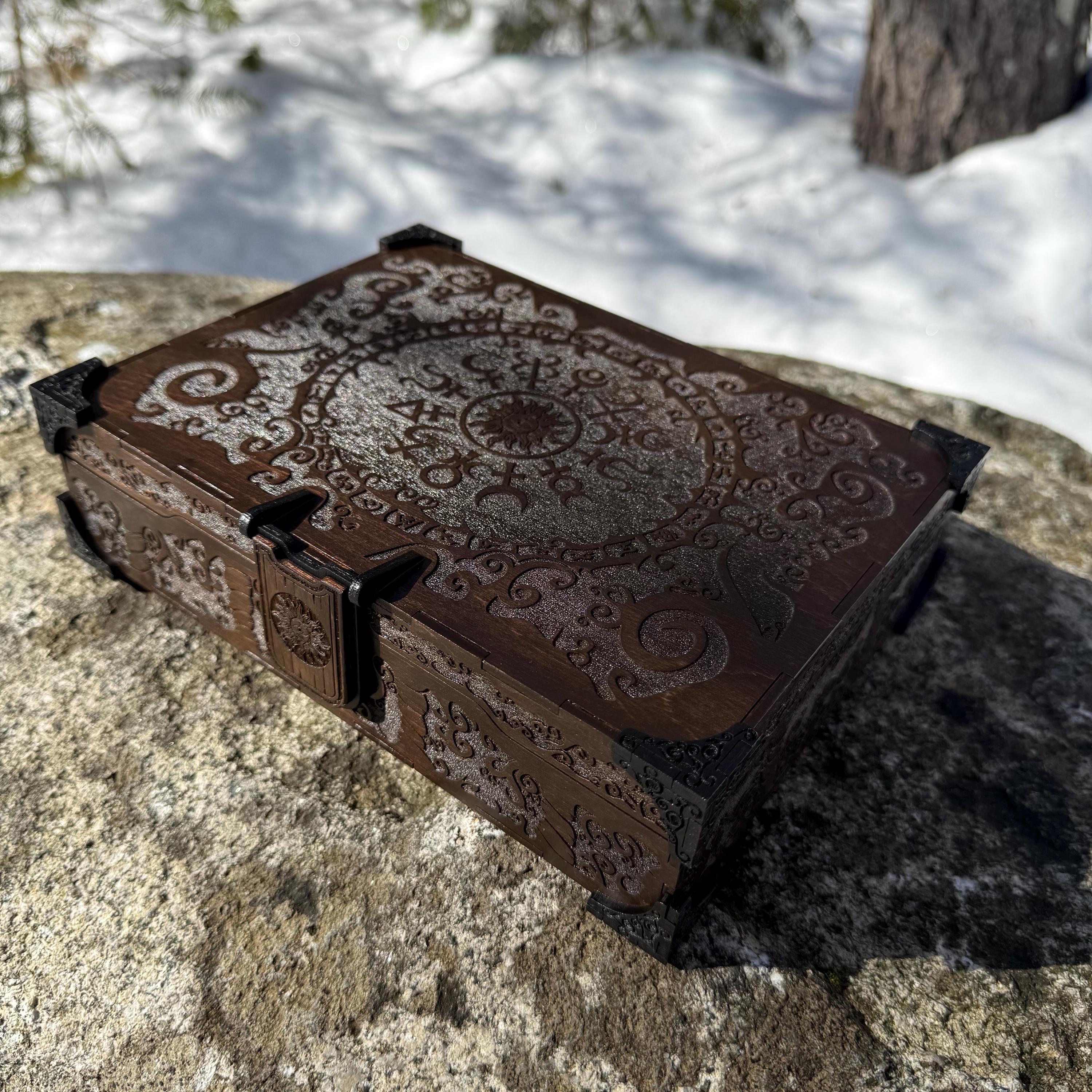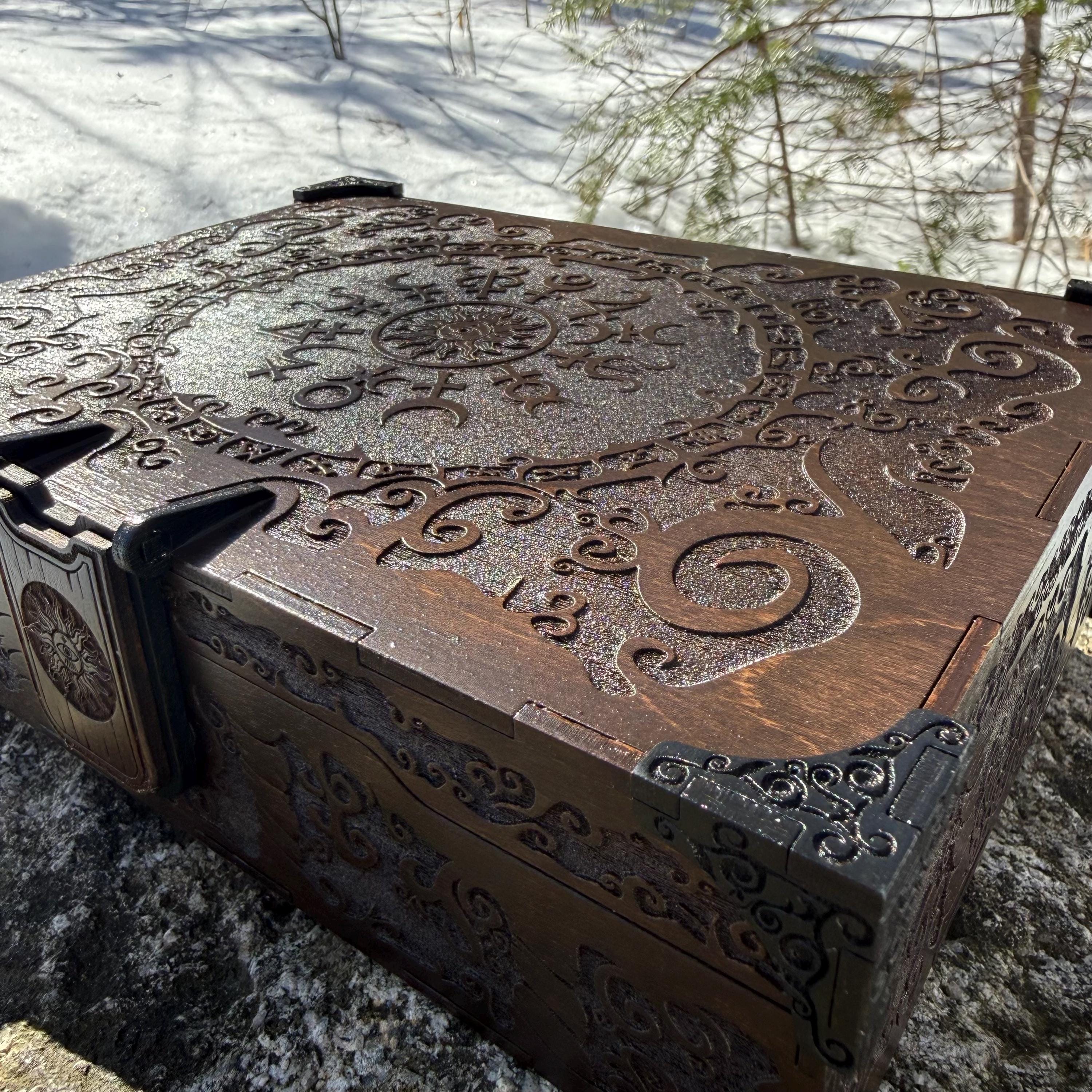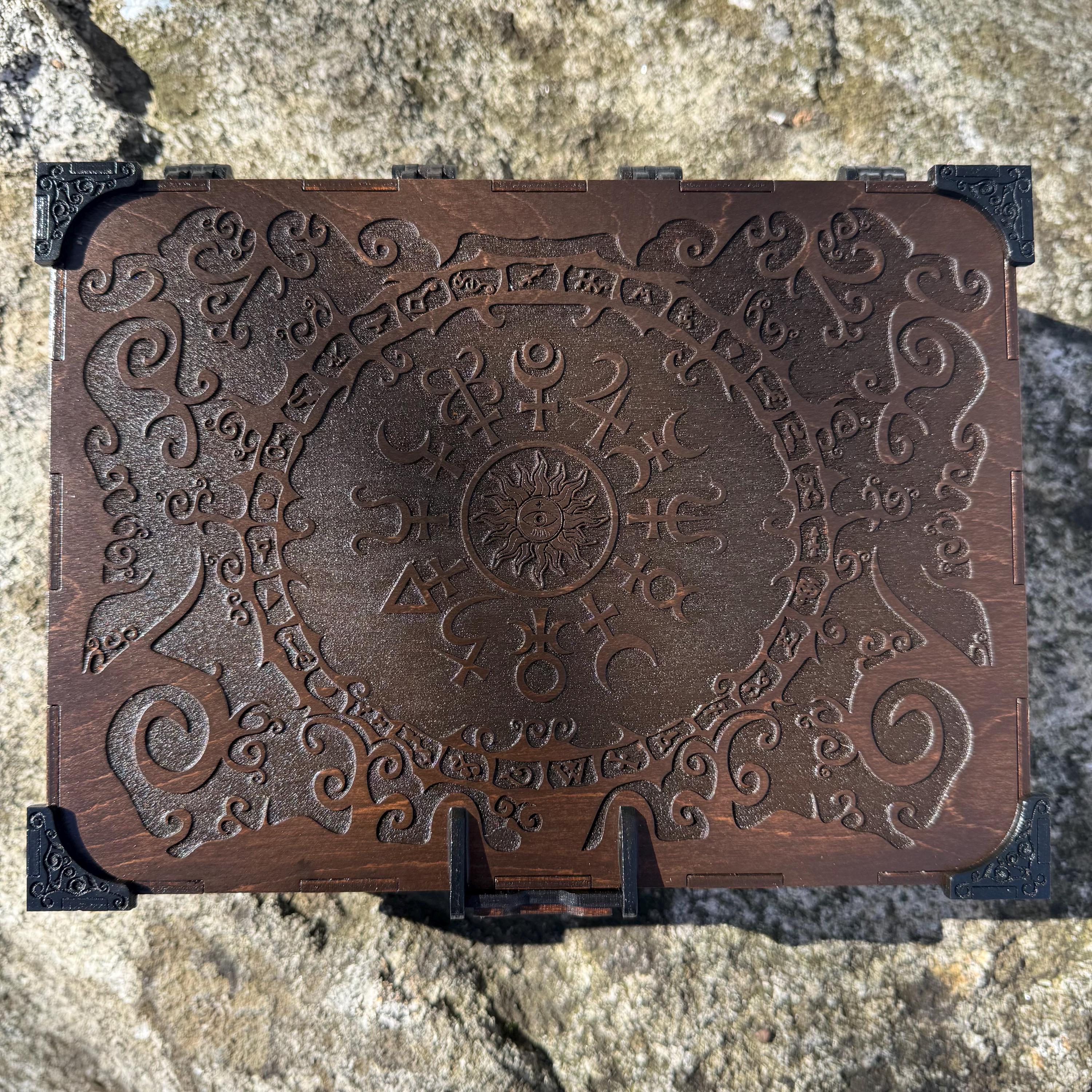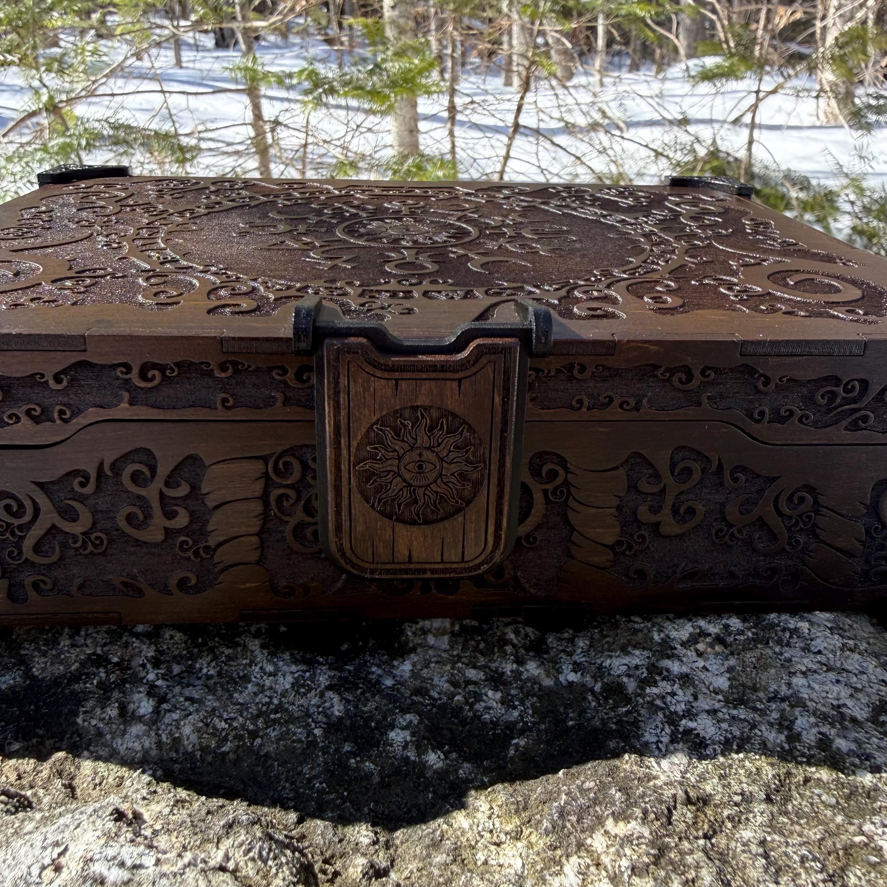 Thoroughly engraved with unique twisting scrollwork-styled art accompanied by curious alchemical symbols, this small wooden jewelry box is perfect for anyone with an appreciation for mysterious sciences as well as a love for handcrafted boxes. This box features a magnetic wooden latch which keeps it securely closed, and the interior has 2 large and 12 small (ring sized) compartments inside, lined with jeweler's velvet as further protection for the items stored within. The compartments are built as trays which are removable or repositionable to allow for more storage options. This box would make a wonderful gift for a loved one or even oneself to store valuable items within its confines, whether those items be prized possessions or simple mementos of wonderful times.