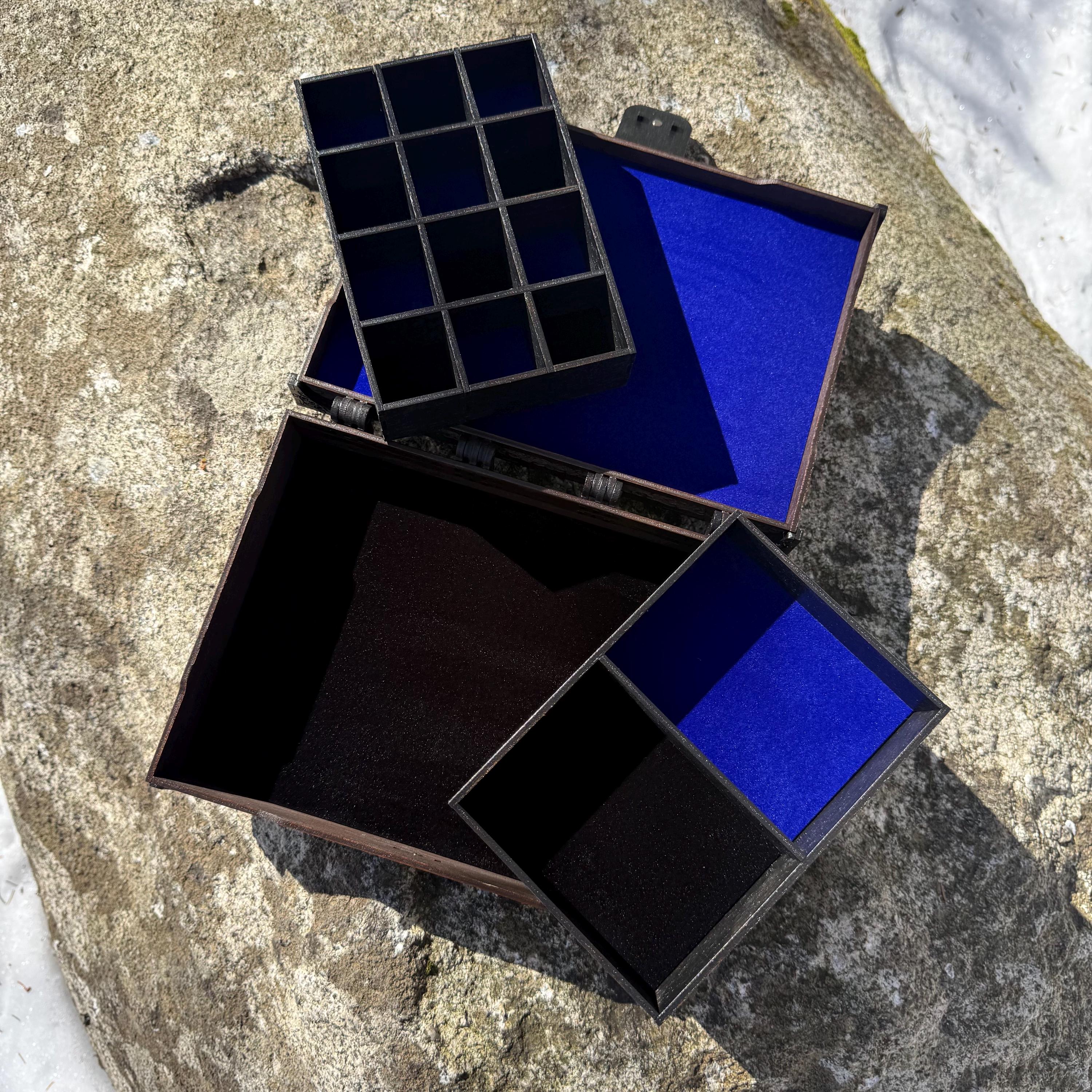 • CUSTOMIZATIONS AVAILABLE: selectable stain color for the box and trays. In all creations, the corner braces will be stained with Black, Clay, or Urban Grey, based upon the customer's stain color selection. Velvet color(s) are at the discretion of the maker, but will complement the stain color of the box.