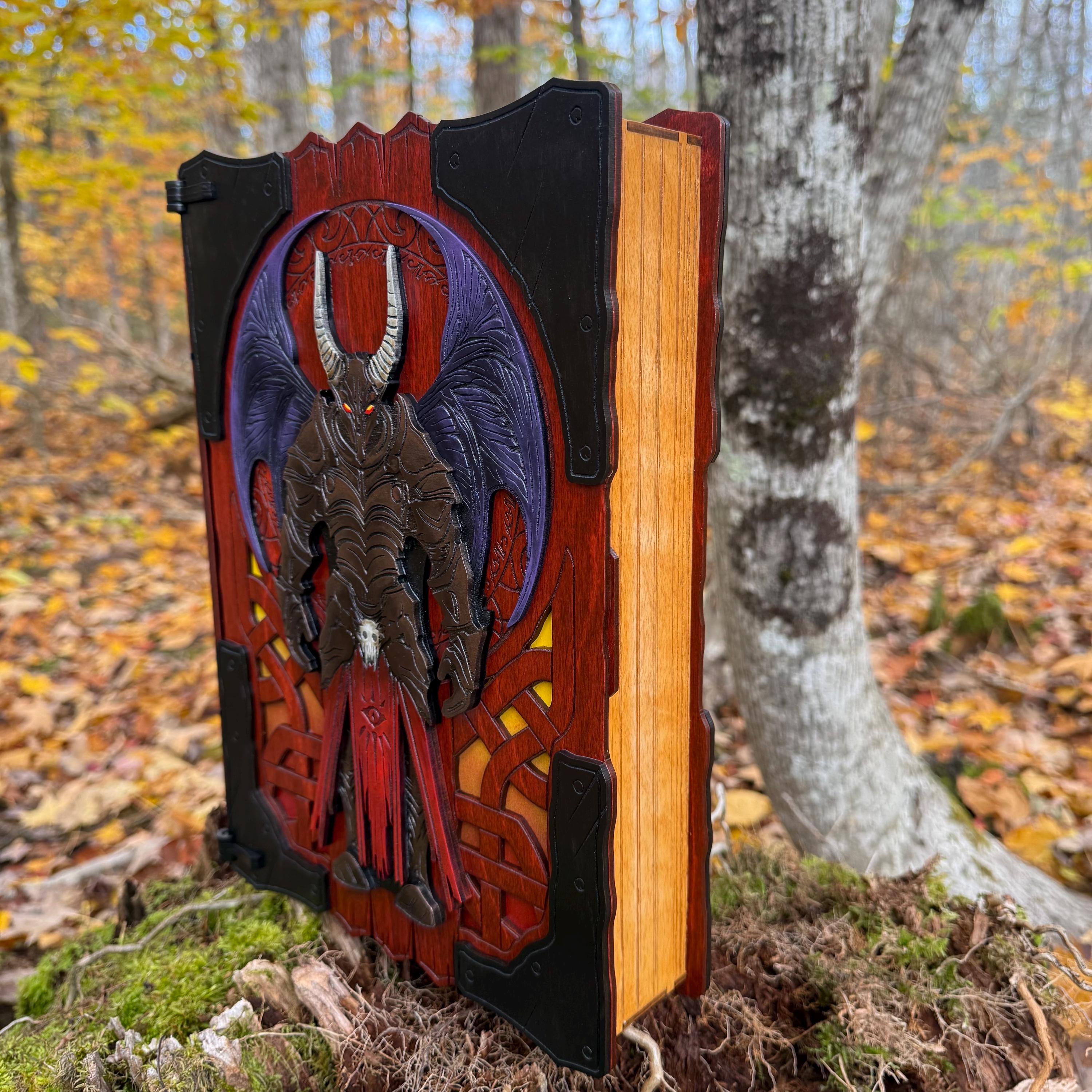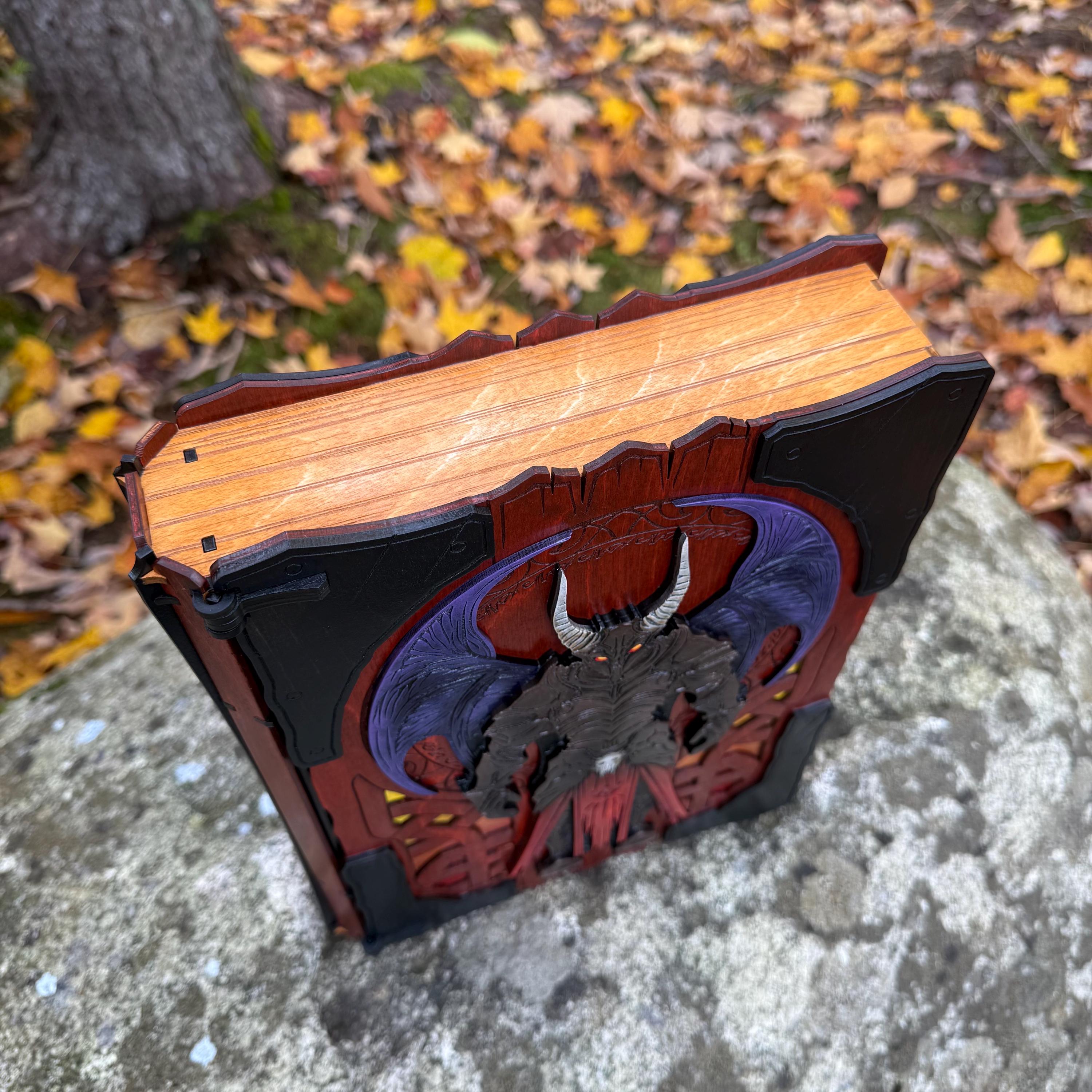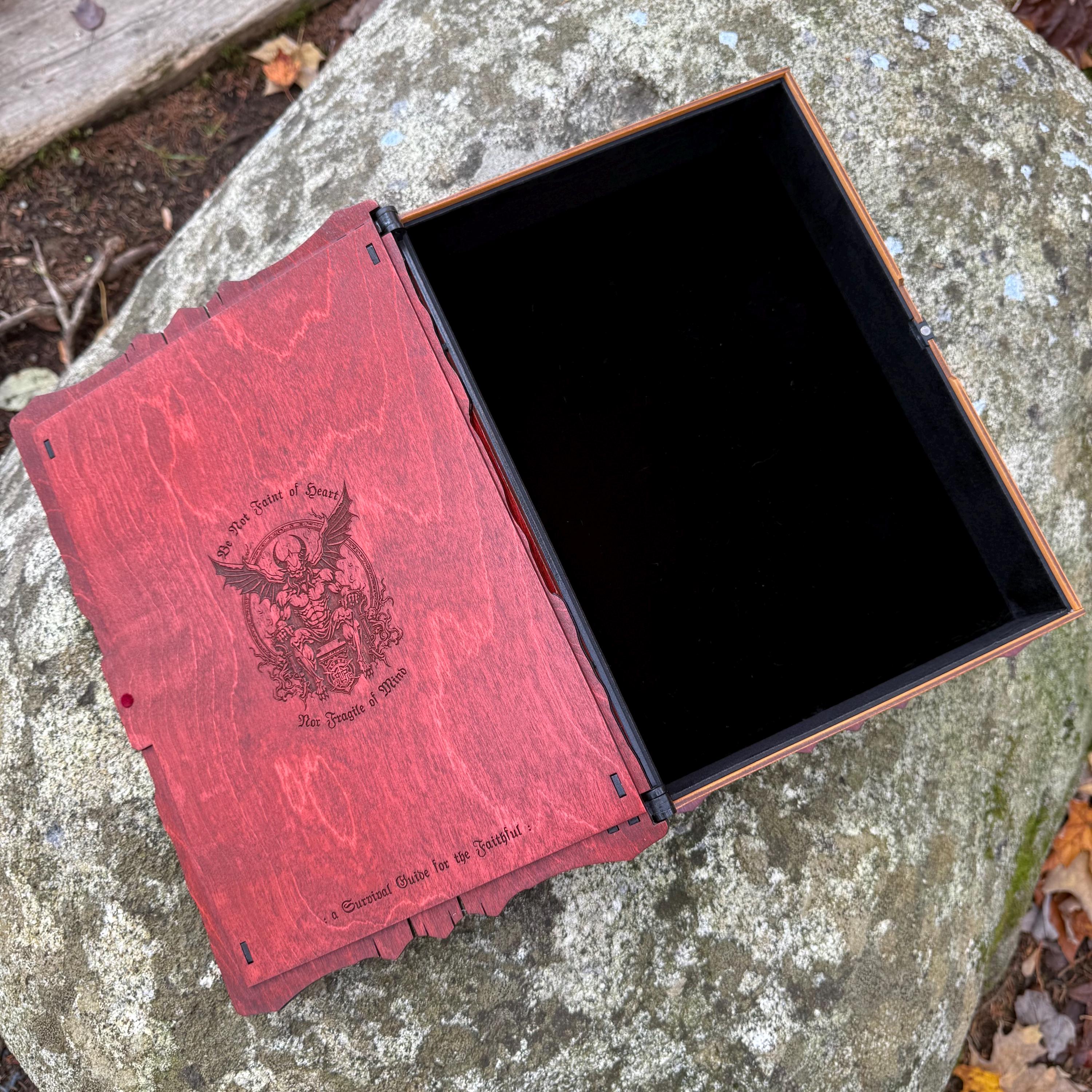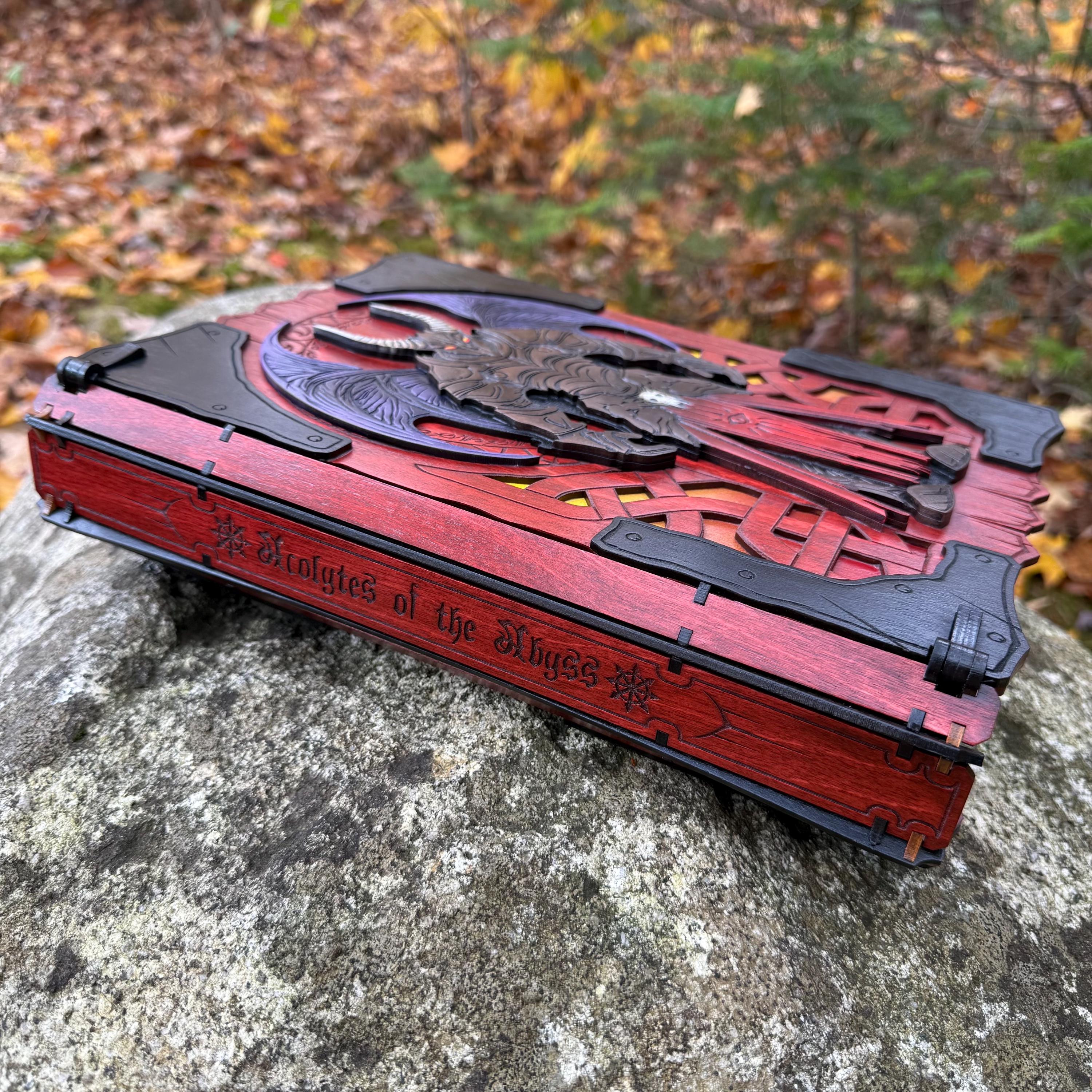 This handcrafted wooden book box features incredibly detailed laser-engraved artwork, a spacious interior lined with jeweler's velvet, and a magnetic closure which allows the box to be displayed upright without spilling its contents. Modelled after an arcane tome from an imagined ancient library, "Acolytes of the Abyss" is a great gift or addition to the collection of anyone who enjoys dark chaotic fantasy and supernatural themes. Each book box created will possess a uniquely hand painted Abyssal Knight on the cover, making each box a one-of-a-kind achievement. Whether used as a box for keepsakes and mementos or as a container for gaming accessories, this creation would be fantastic for either, and looks awesome displayed on a shelf!