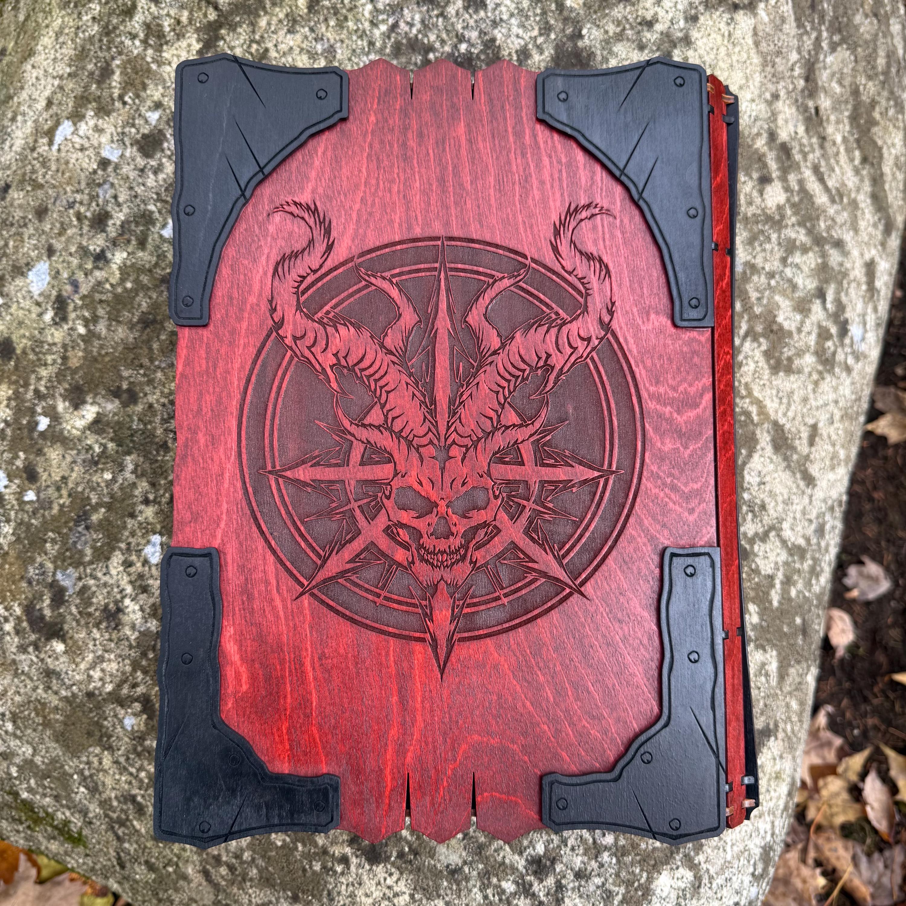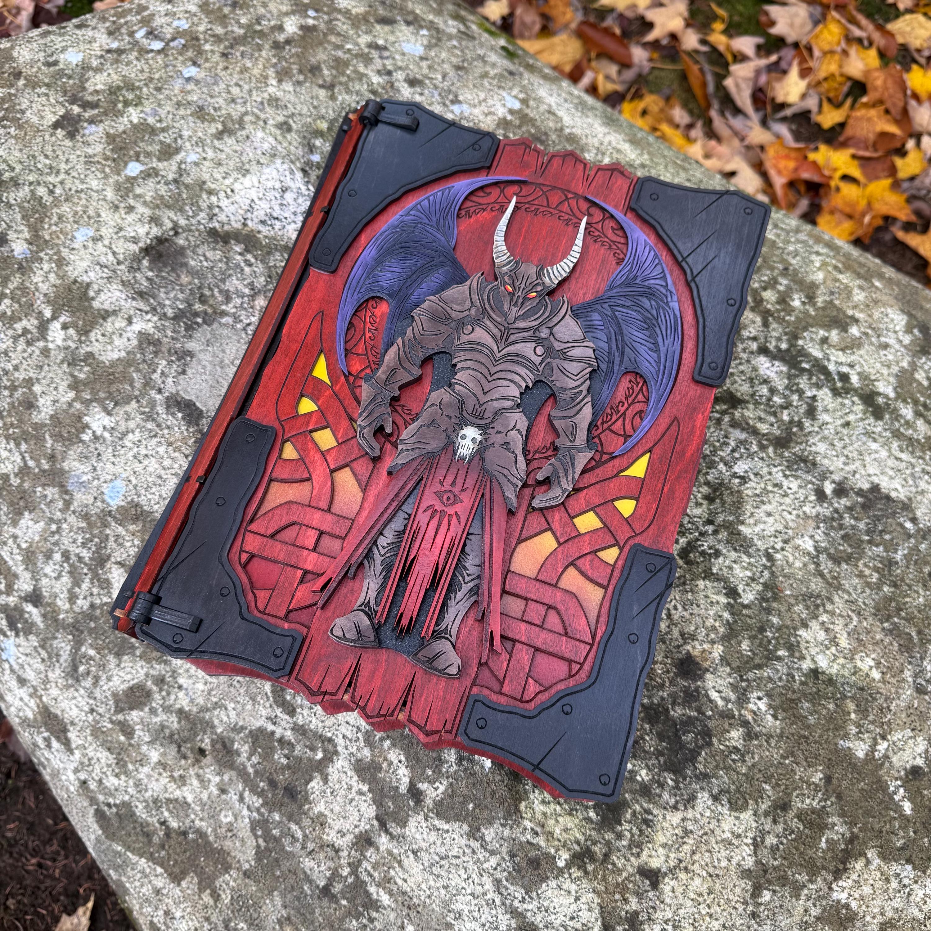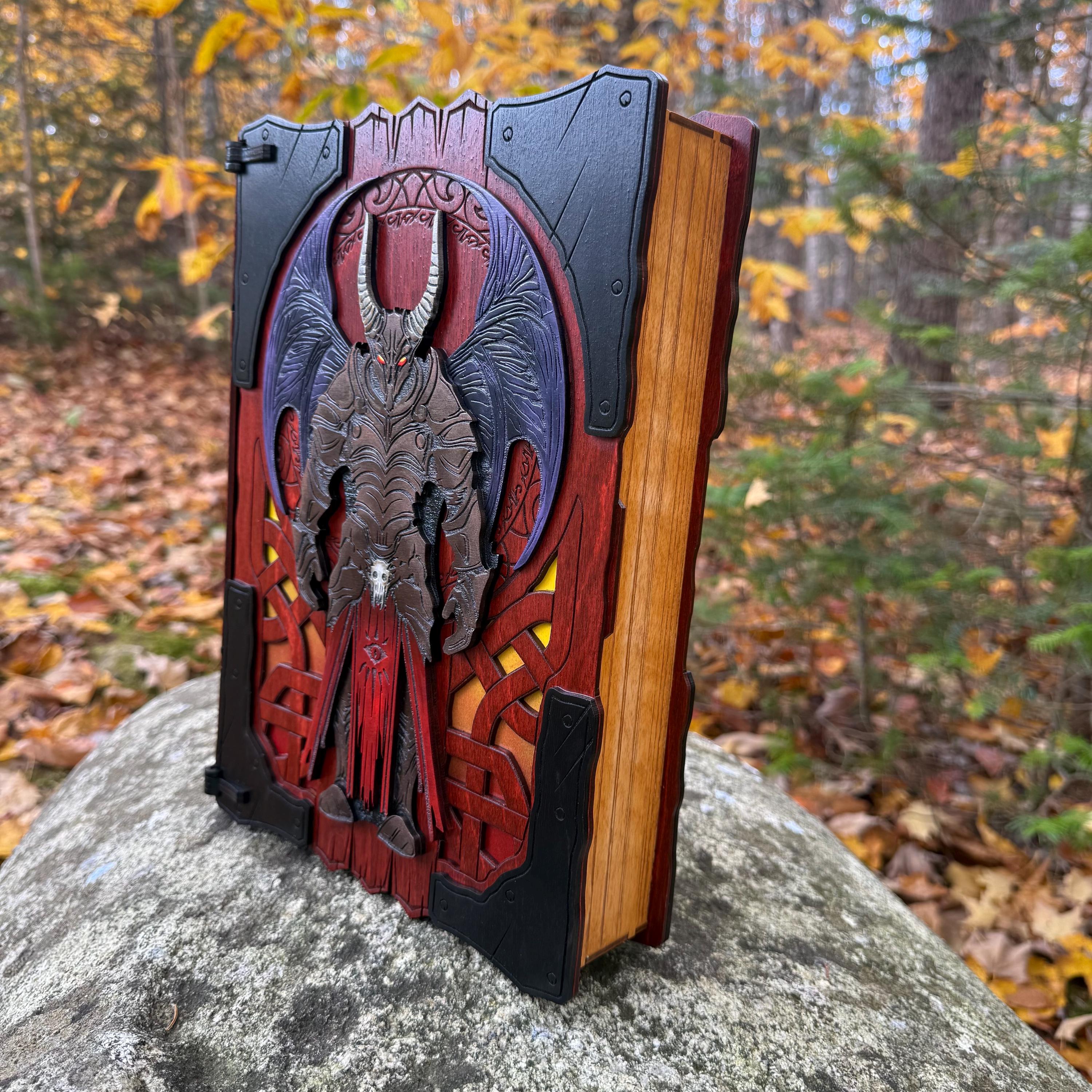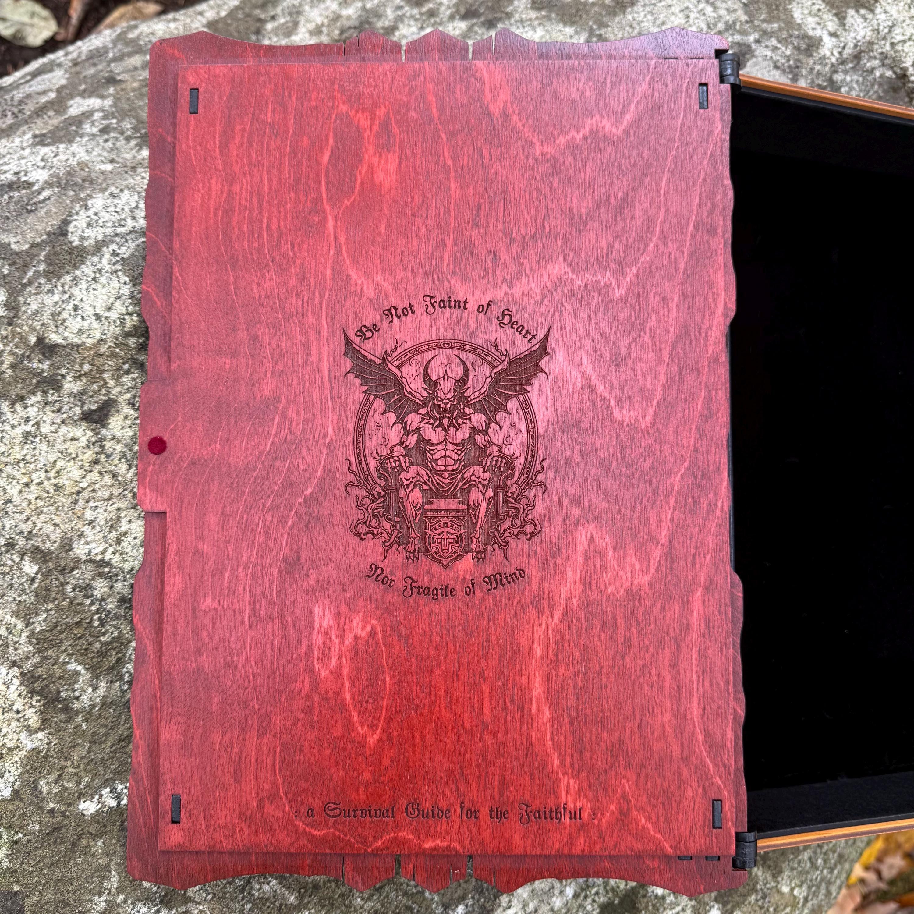This handcrafted wooden book box features incredibly detailed laser-engraved artwork, a spacious interior lined with jeweler's velvet, and a magnetic closure which allows the box to be displayed upright without spilling its contents. Modelled after an arcane tome from an imagined ancient library, "Acolytes of the Abyss" is a great gift or addition to the collection of anyone who enjoys dark chaotic fantasy and supernatural themes. Each book box created will possess a uniquely hand painted Abyssal Knight on the cover, making each box a one-of-a-kind achievement. Whether used as a box for keepsakes and mementos or as a container for gaming accessories, this creation would be fantastic for either, and looks awesome displayed on a shelf!