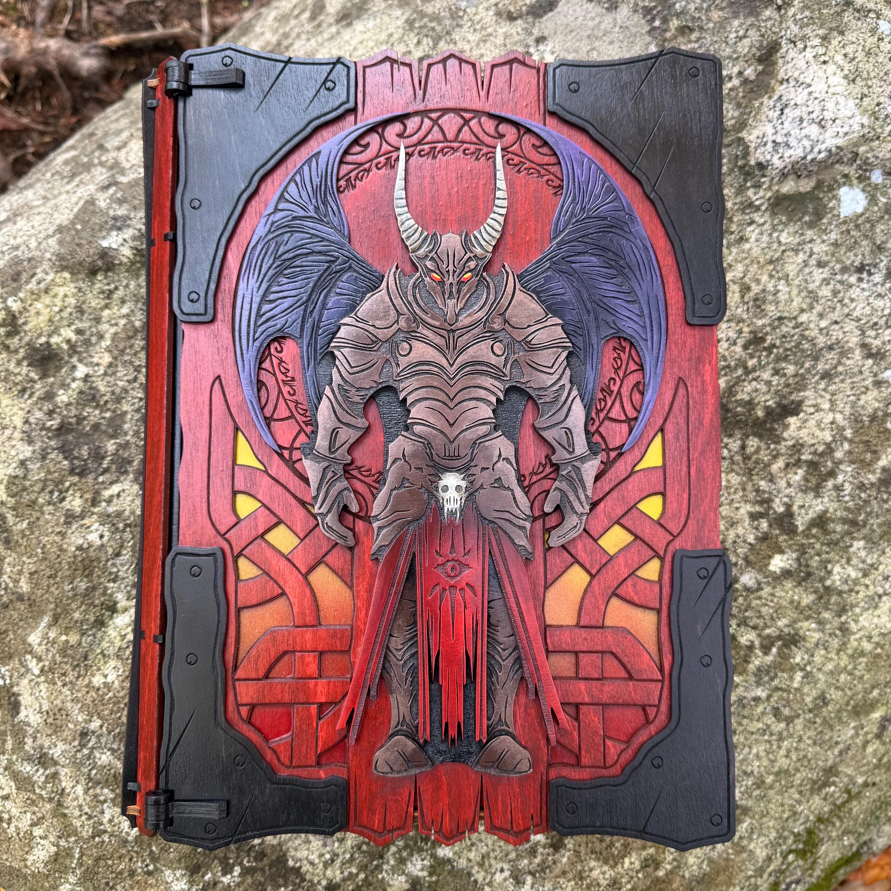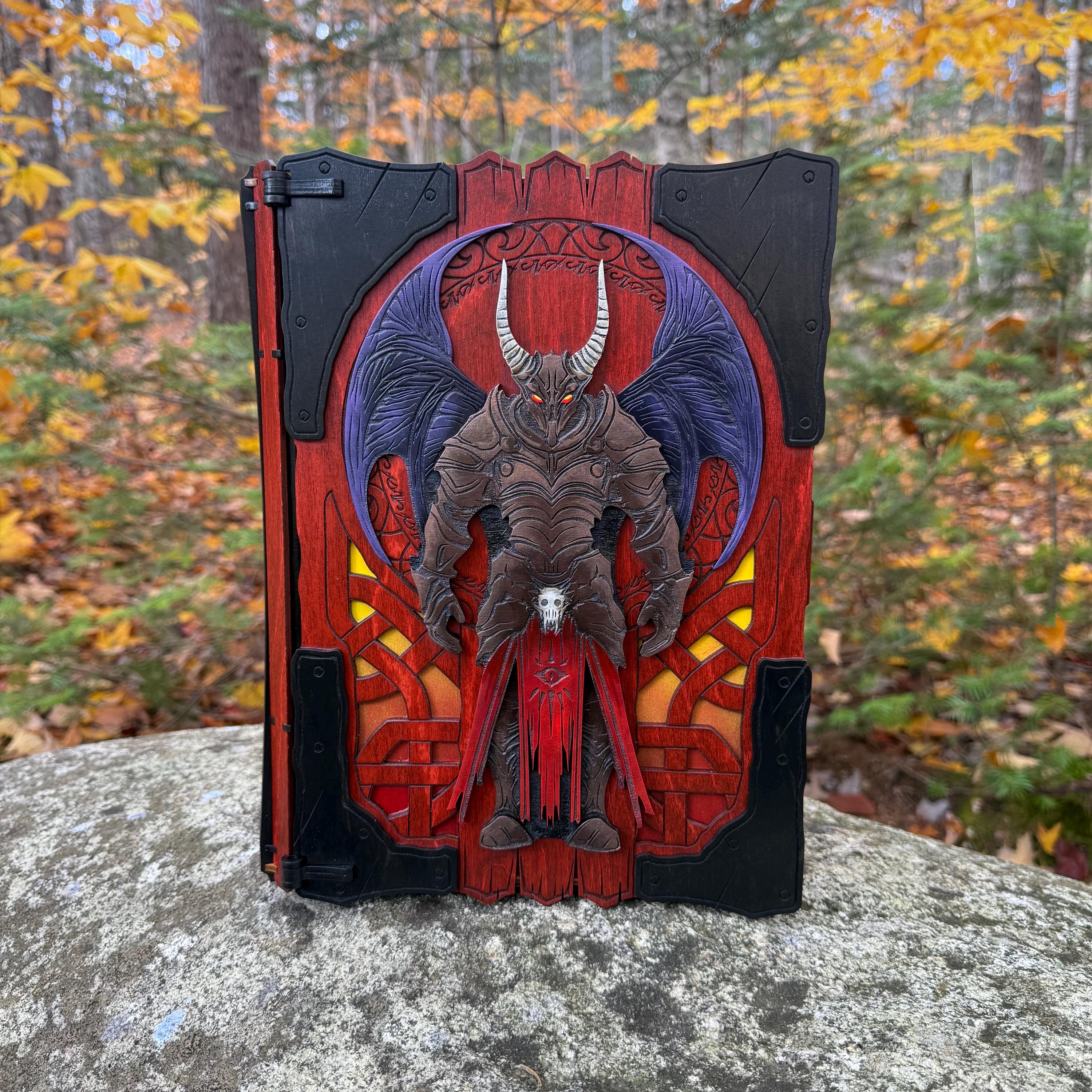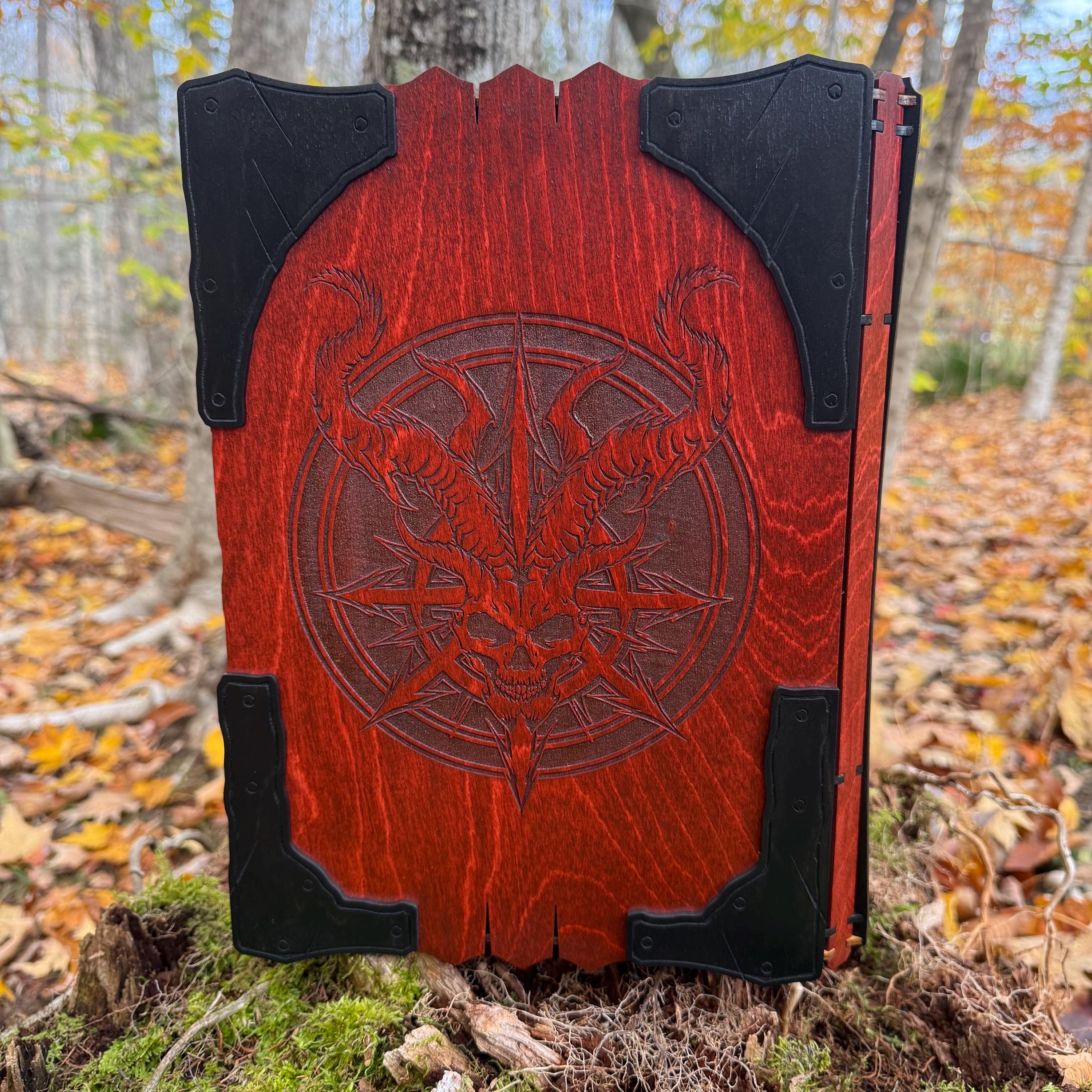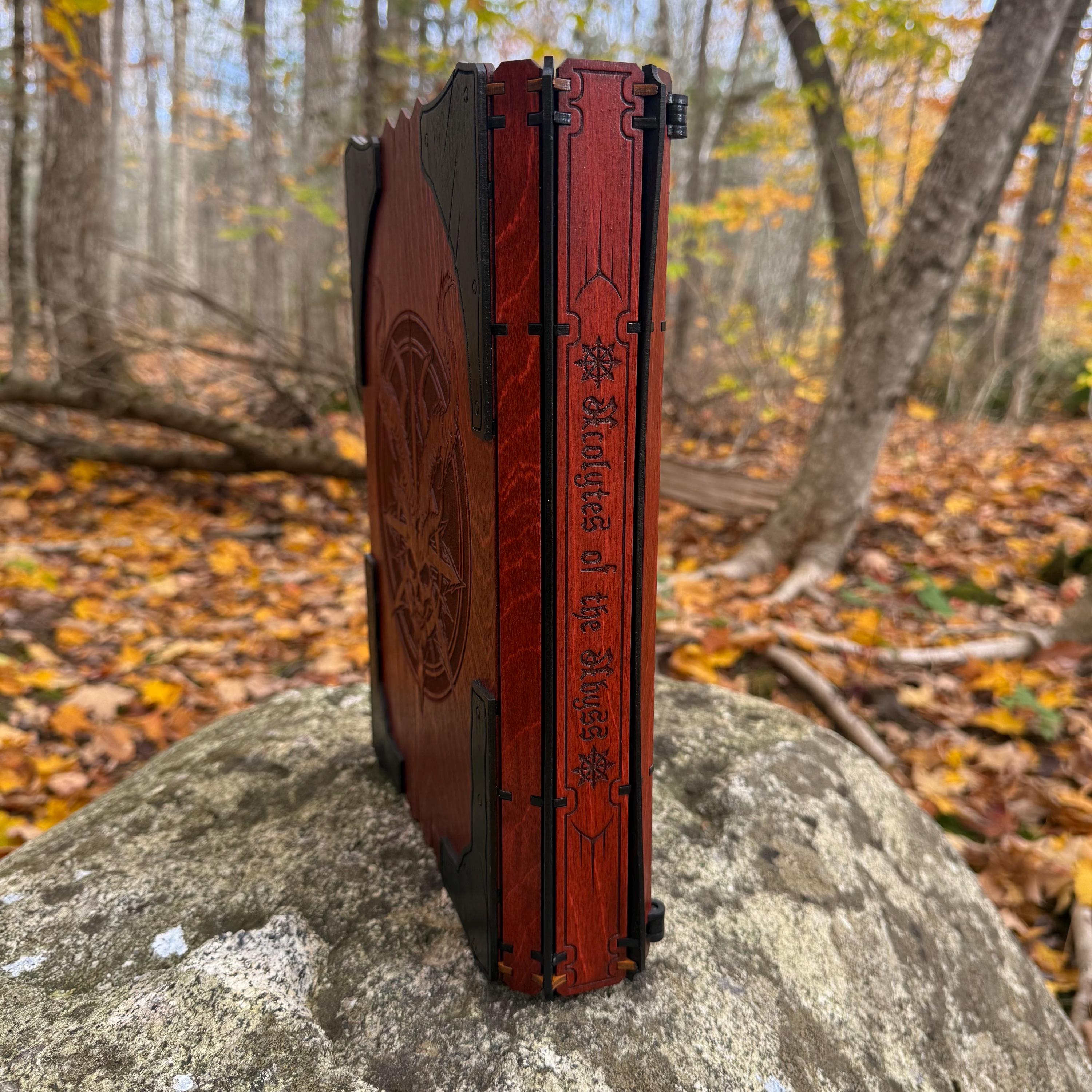This handcrafted wooden book box features incredibly detailed laser-engraved artwork, a spacious interior lined with jeweler's velvet, and a magnetic closure which allows the box to be displayed upright without spilling its contents. Modelled after an arcane tome from an imagined ancient library, "Acolytes of the Abyss" is a great gift or addition to the collection of anyone who enjoys dark chaotic fantasy and supernatural themes. Each book box created will possess a uniquely hand painted Abyssal Knight on the cover, making each box a one-of-a-kind achievement. Whether used as a box for keepsakes and mementos or as a container for gaming accessories, this creation would be fantastic for either, and looks awesome displayed on a shelf!