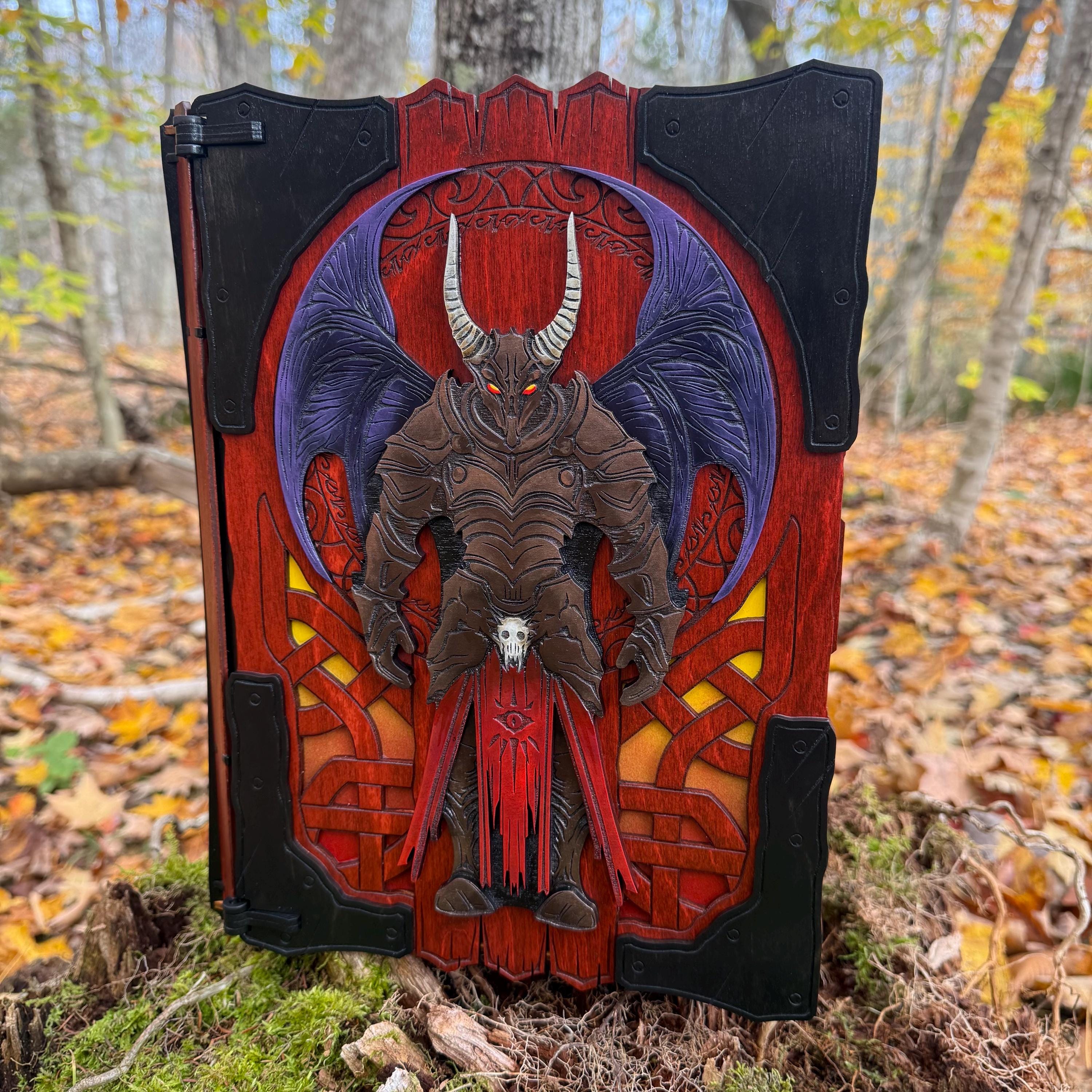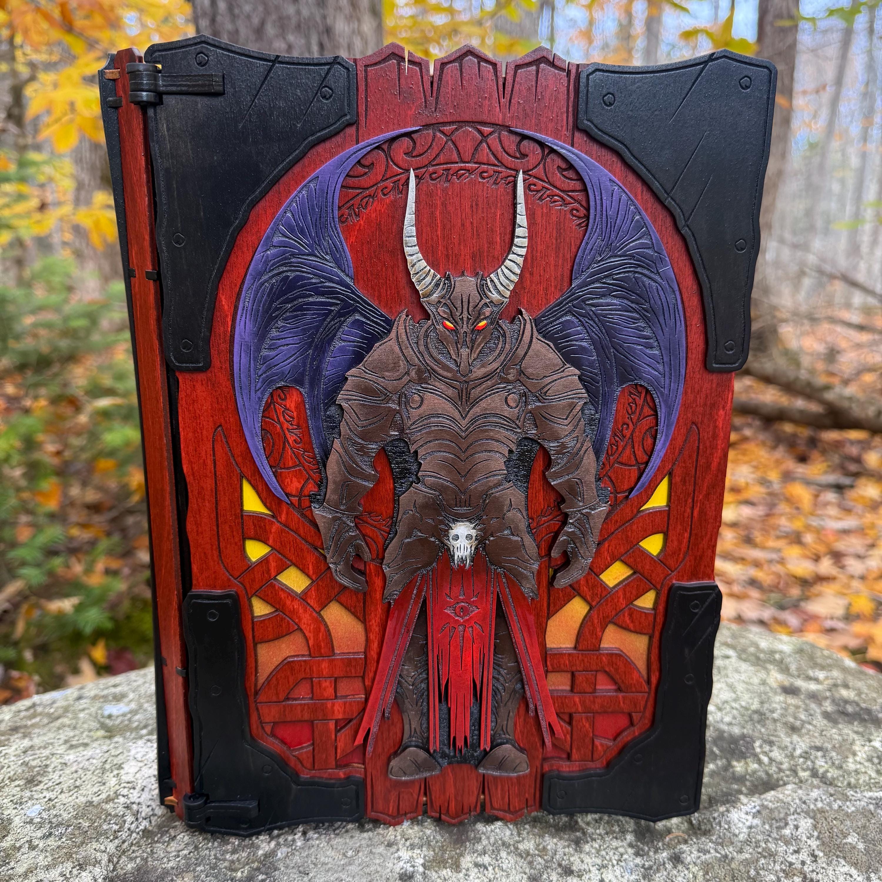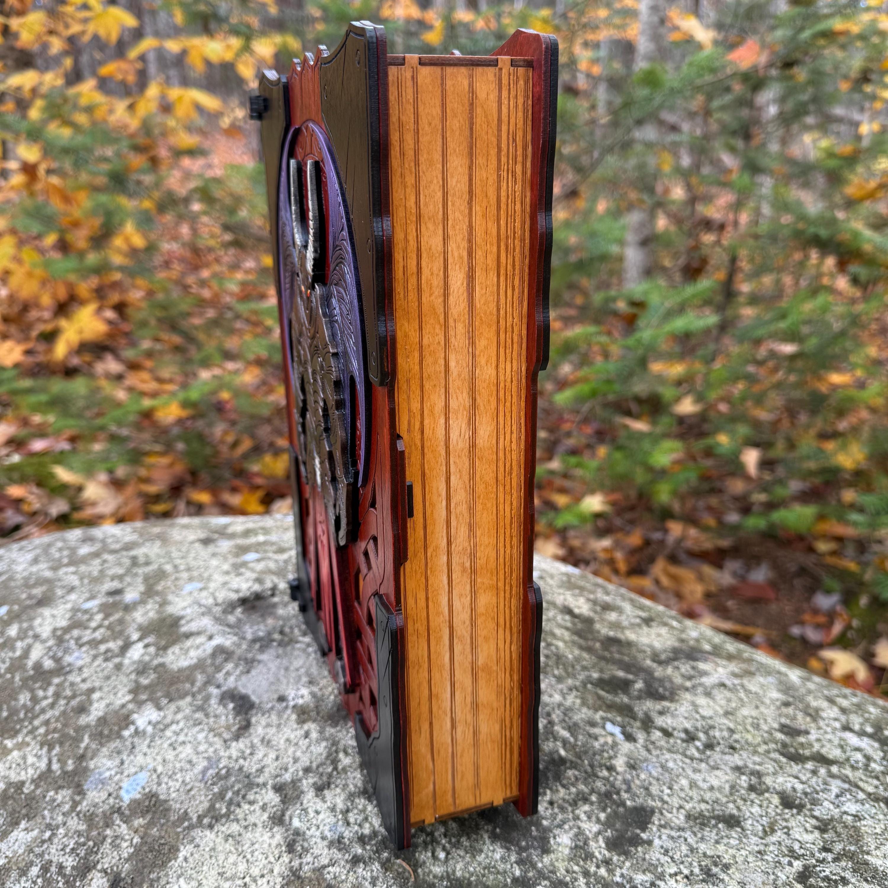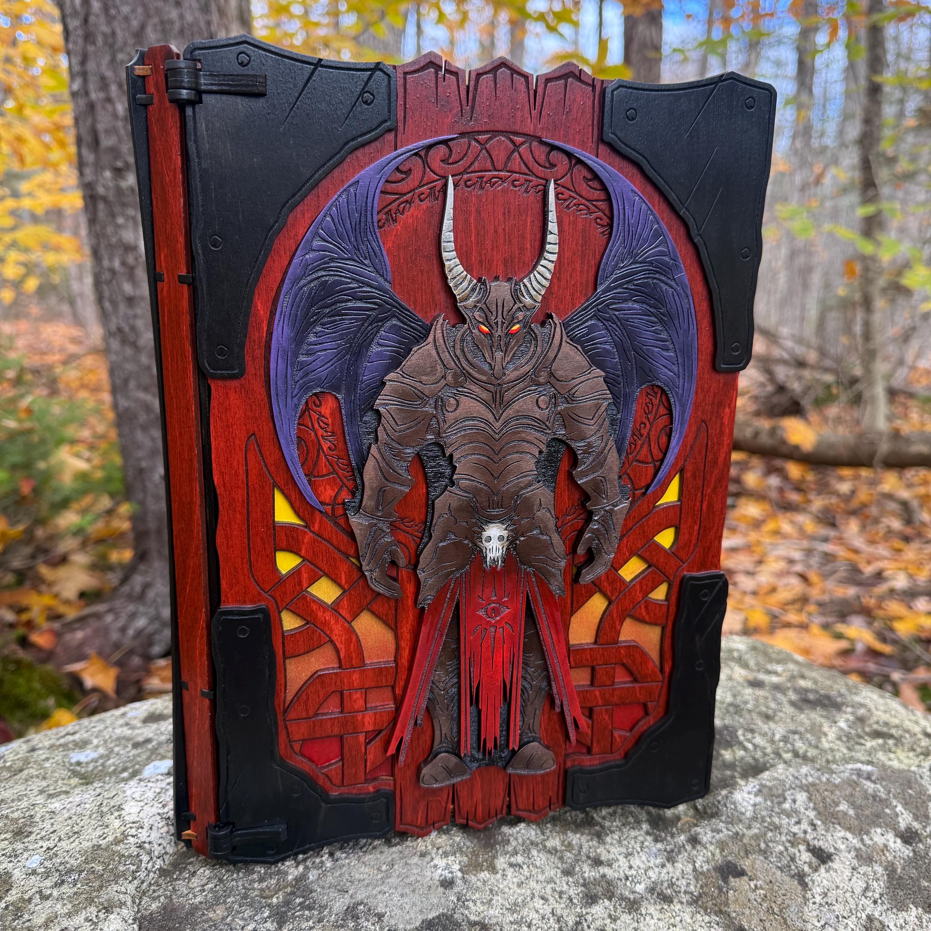 This handcrafted wooden book box features incredibly detailed laser-engraved artwork, a spacious interior lined with jeweler's velvet, and a magnetic closure which allows the box to be displayed upright without spilling its contents. Modelled after an arcane tome from an imagined ancient library, "Acolytes of the Abyss" is a great gift or addition to the collection of anyone who enjoys dark chaotic fantasy and supernatural themes. Each book box created will possess a uniquely hand painted Abyssal Knight on the cover, making each box a one-of-a-kind achievement. Whether used as a box for keepsakes and mementos or as a container for gaming accessories, this creation would be fantastic for either, and looks awesome displayed on a shelf!