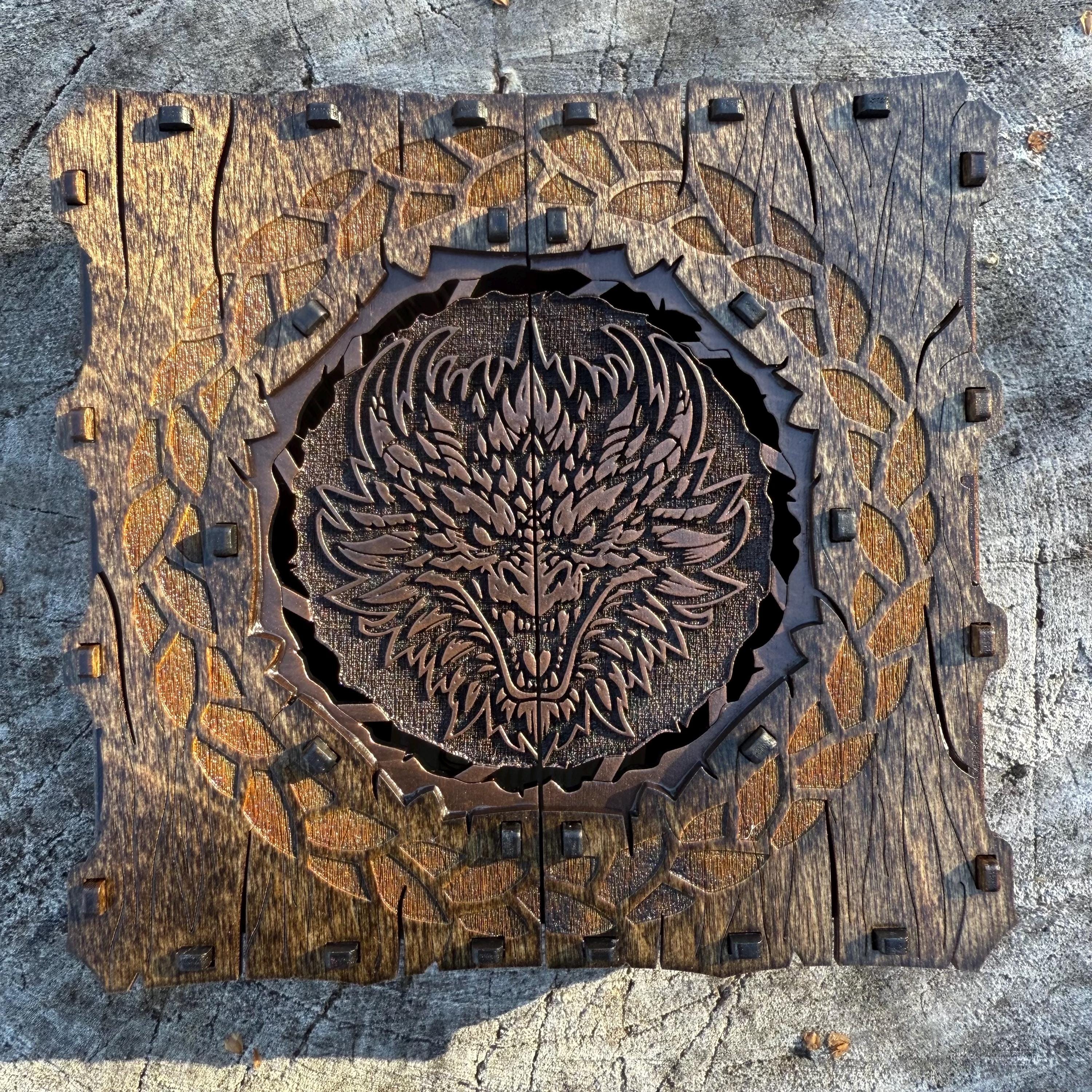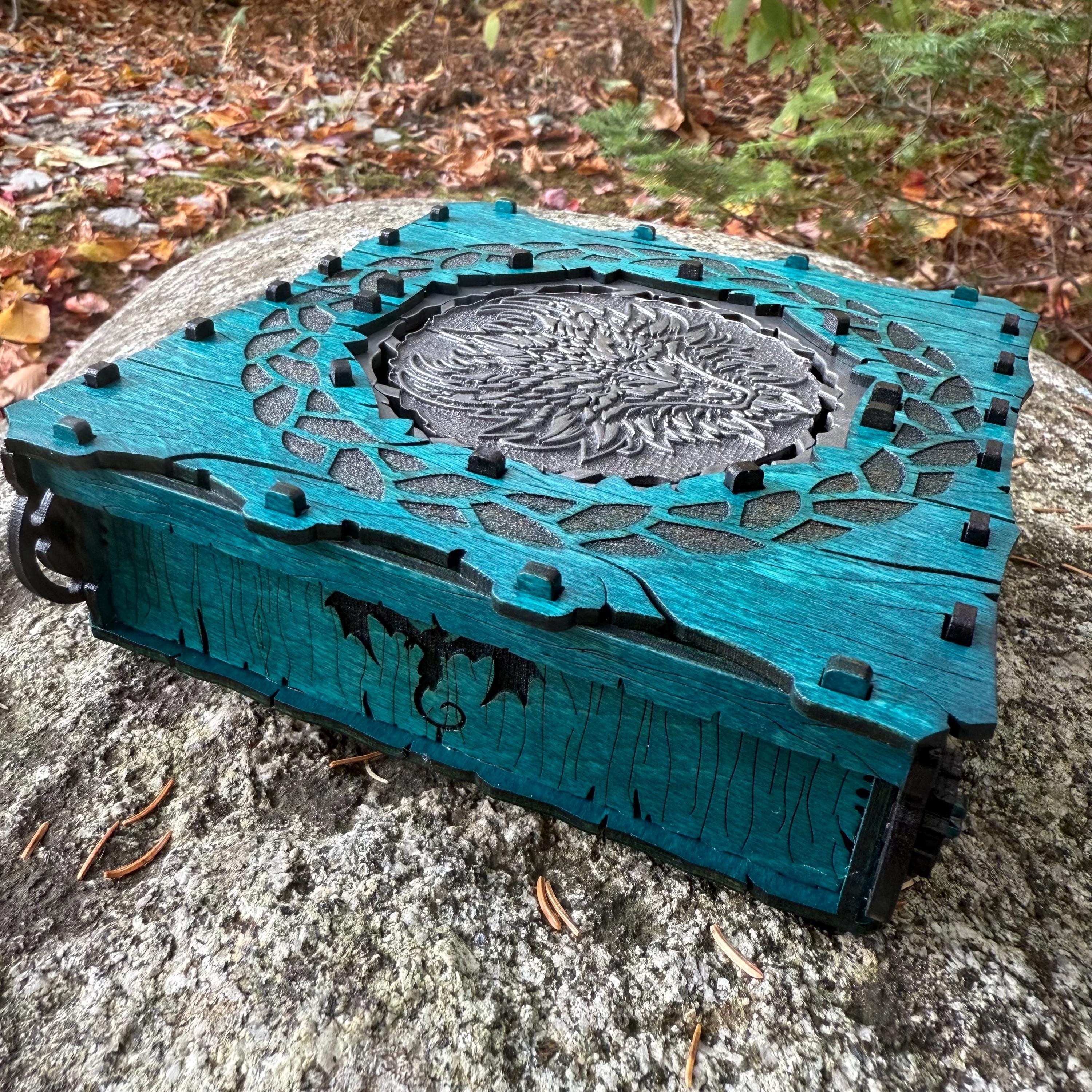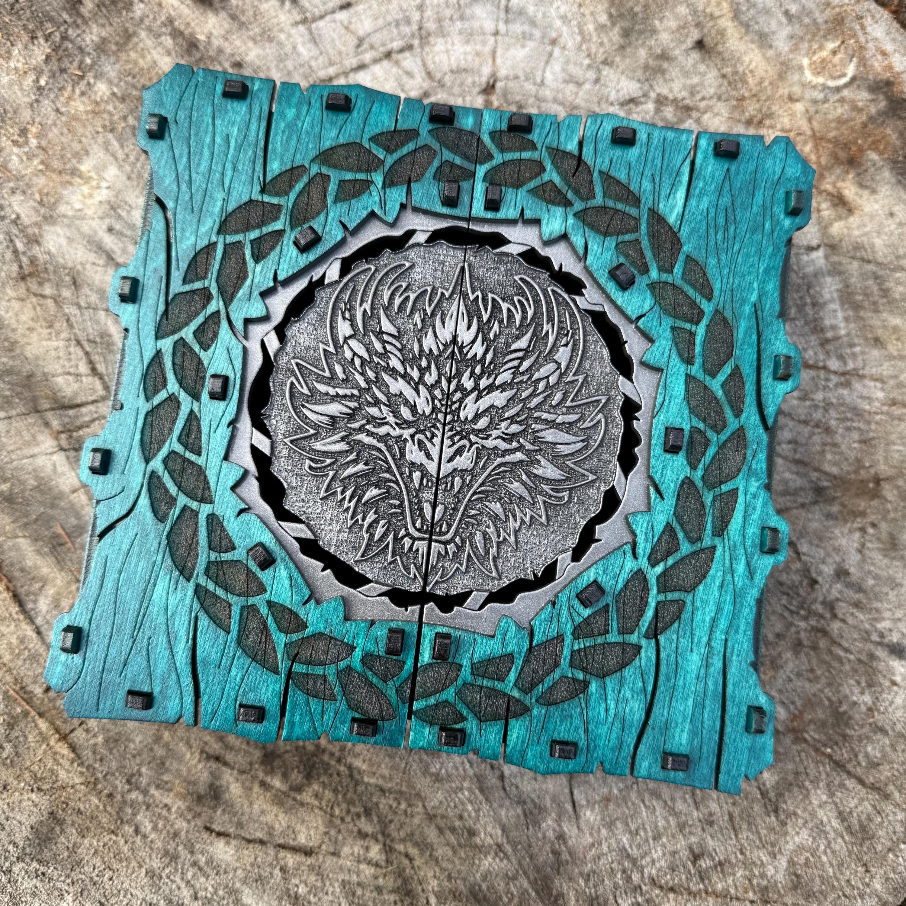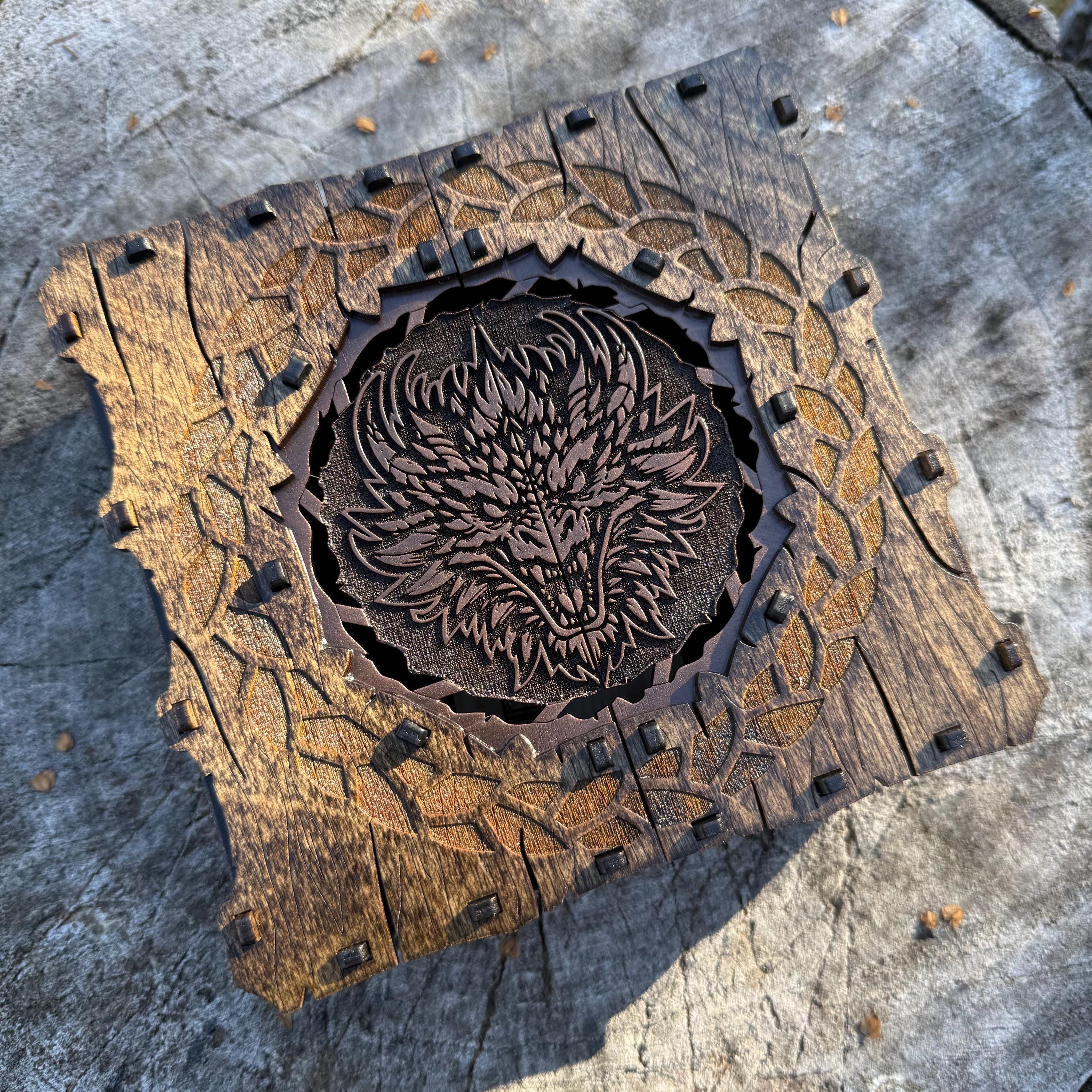 This exceptionally designed and embellished wooden box can be used for jewelry and other small mementos, or by gaming enthusiasts for dice or other game components. Intricate and yet durable, with highly detailed laser-engraved artwork and a dual color staining process for a truly captivating creation. Featuring a velvet-lined interior and shutter style lid, this small box is a great gift idea for anyone fond of fantasy, dragons, or intriguing, functional handcrafted items. It will also make a fine presentation box for any small gift that fits within its confines.