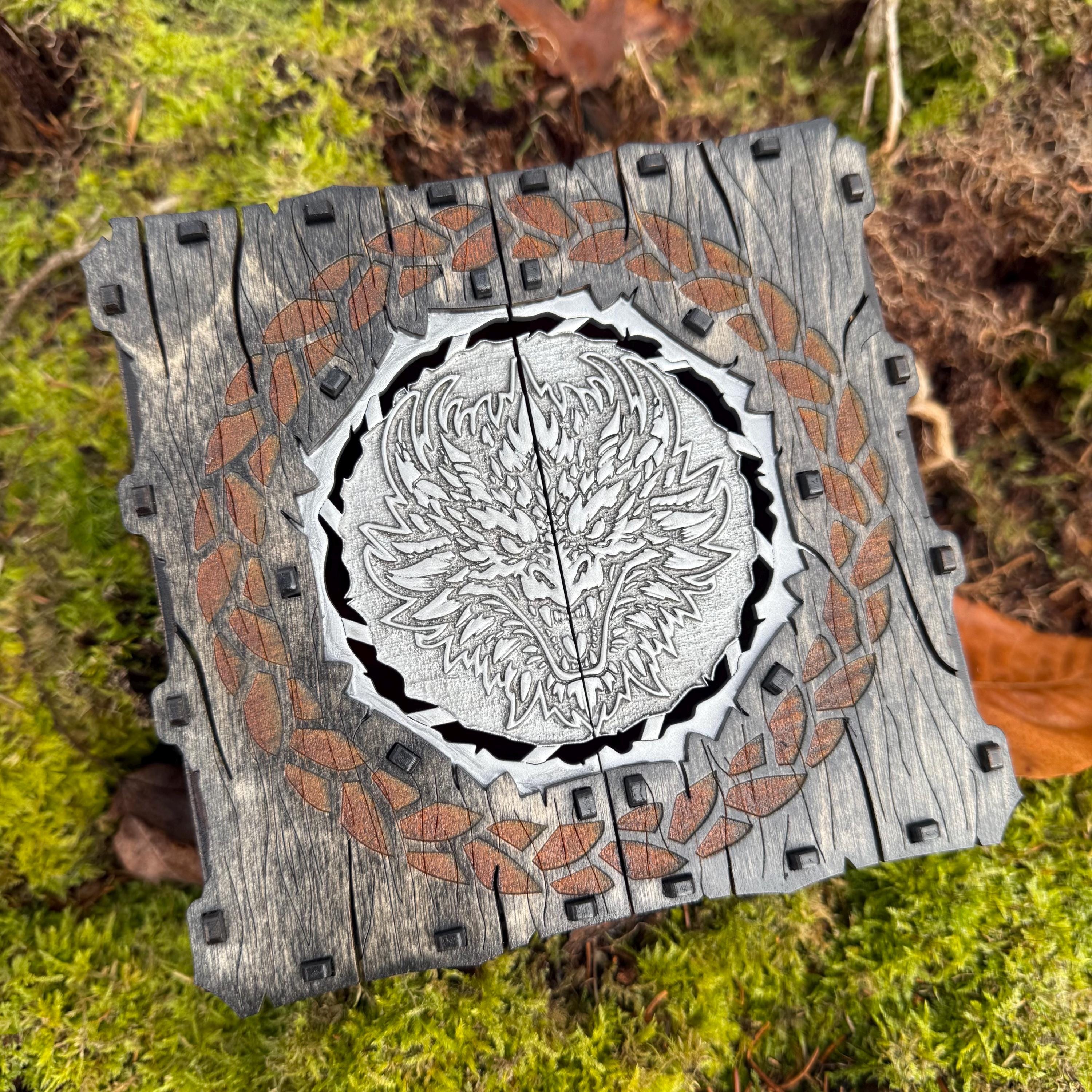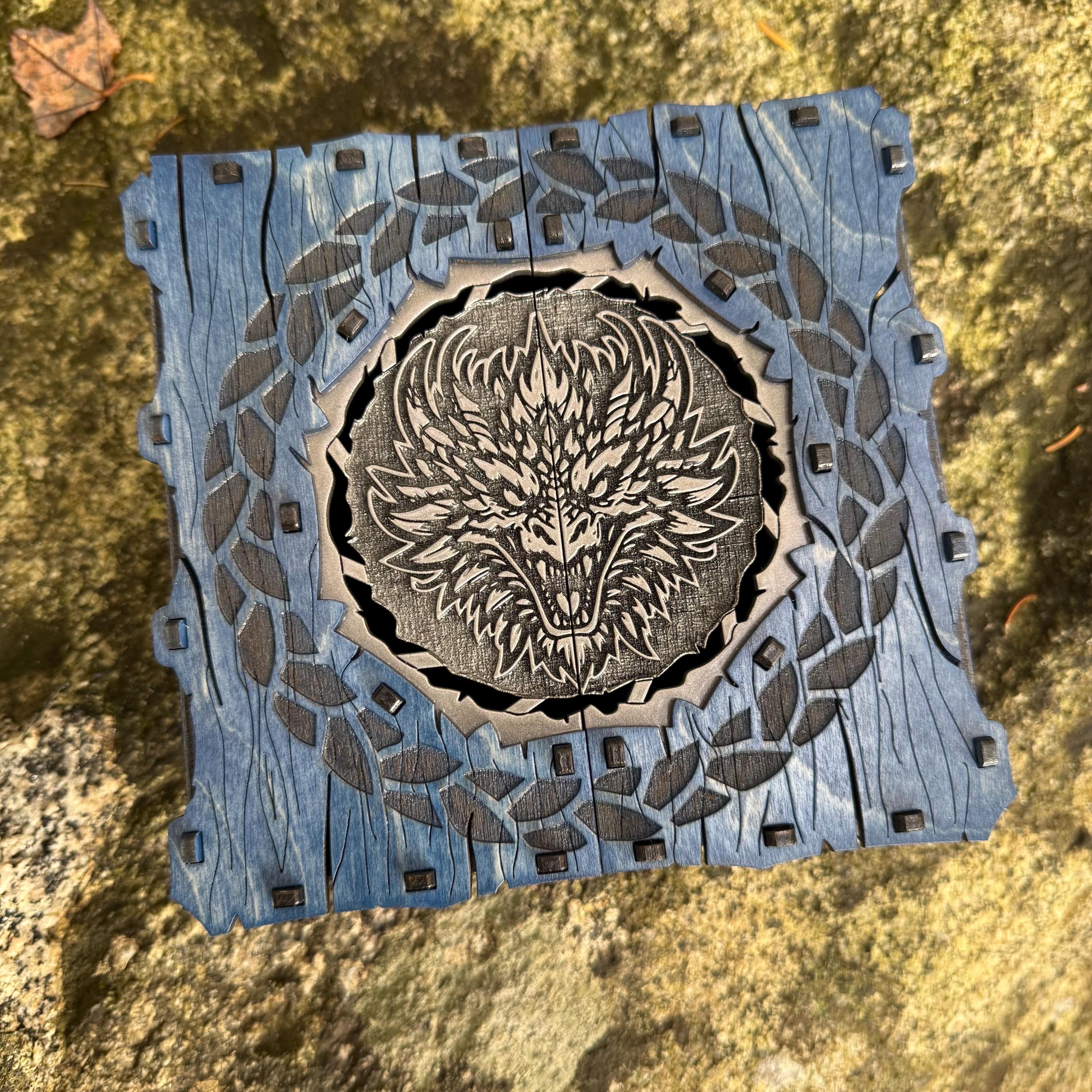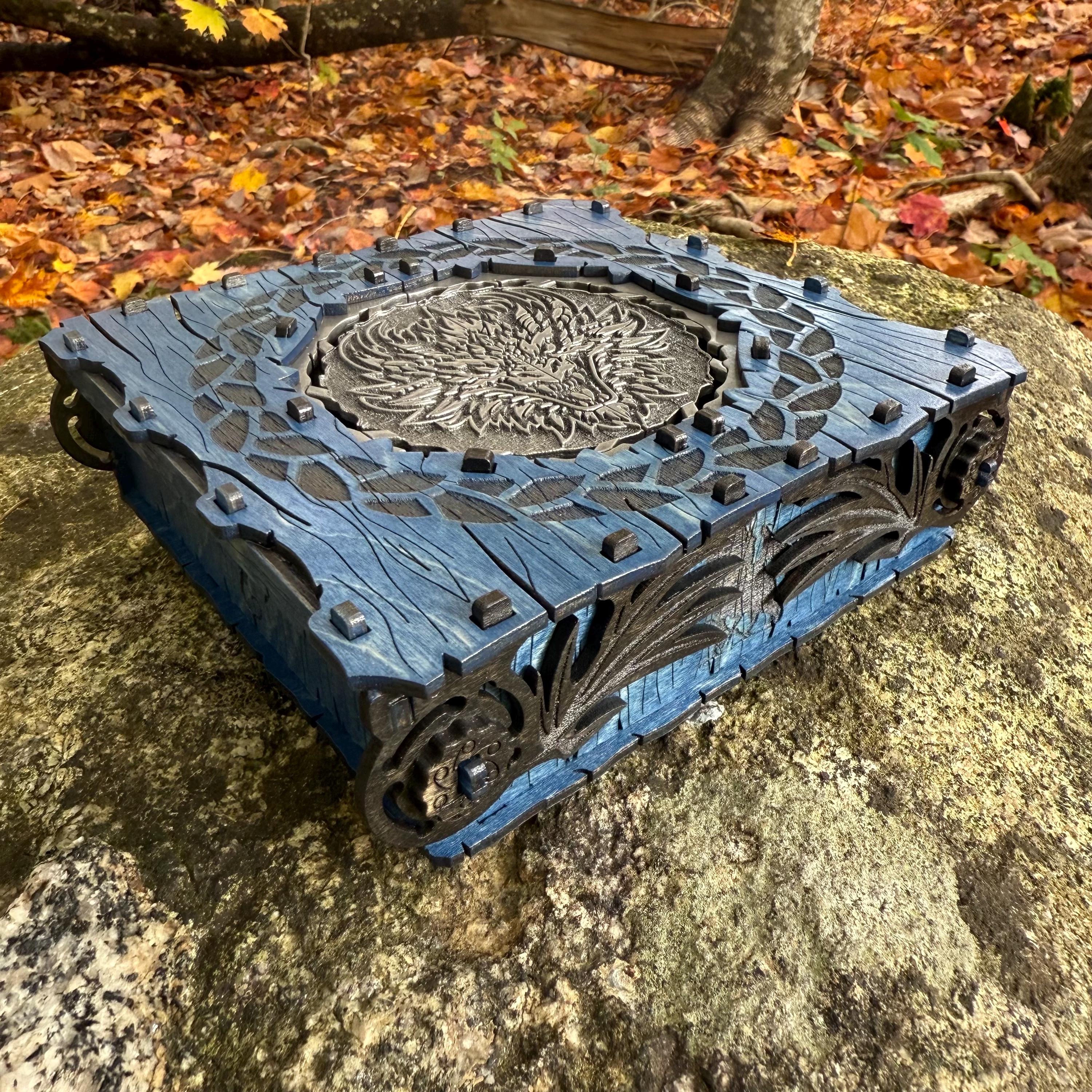This exceptionally designed and embellished wooden box can be used for jewelry and other small mementos, or by gaming enthusiasts for dice or other game components. Intricate and yet durable, with highly detailed laser-engraved artwork and a dual color staining process for a truly captivating creation. Featuring a velvet-lined interior and shutter style lid, this small box is a great gift idea for anyone fond of fantasy, dragons, or intriguing, functional handcrafted items. It will also make a fine presentation box for any small gift that fits within its confines.