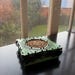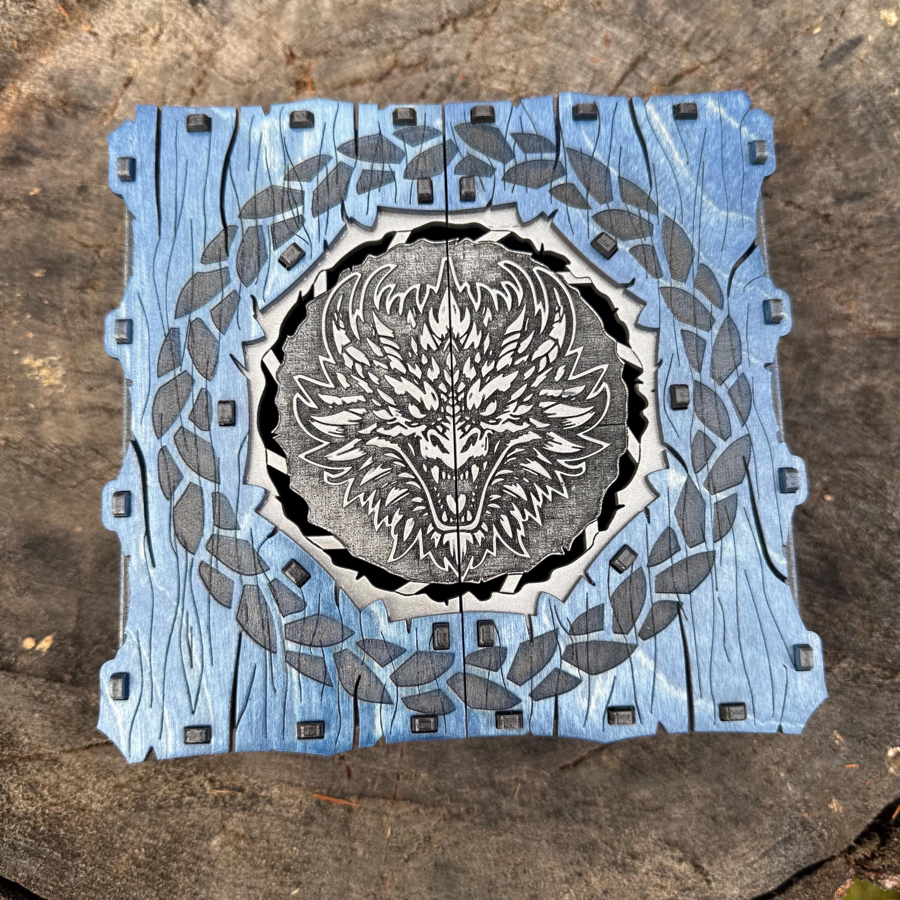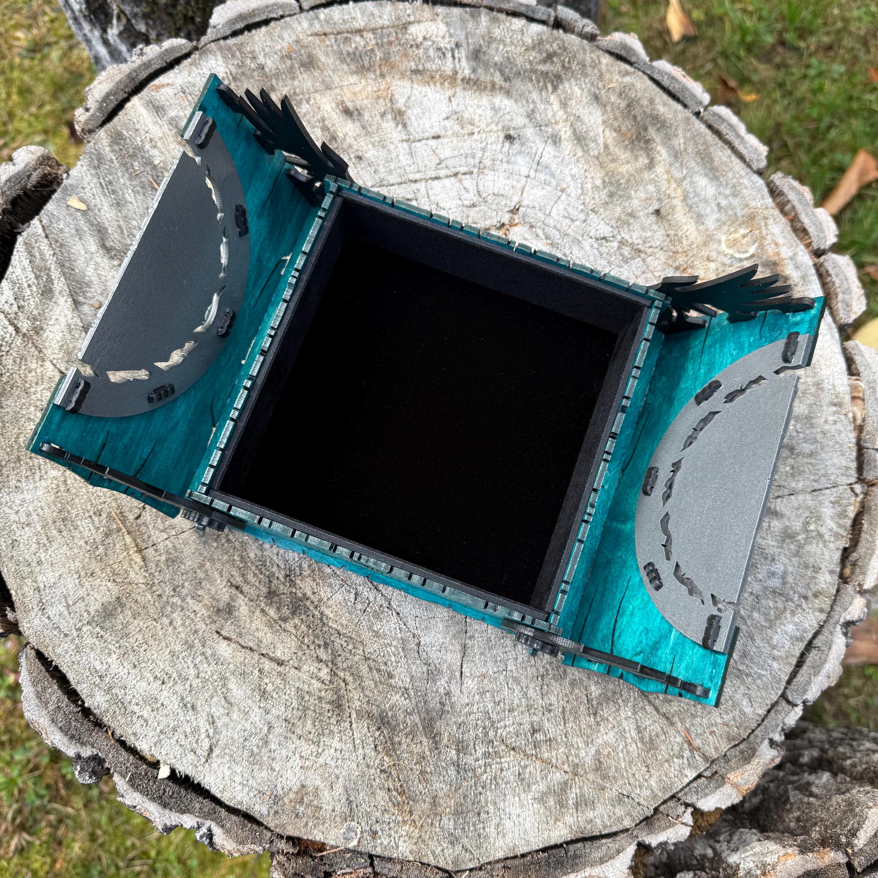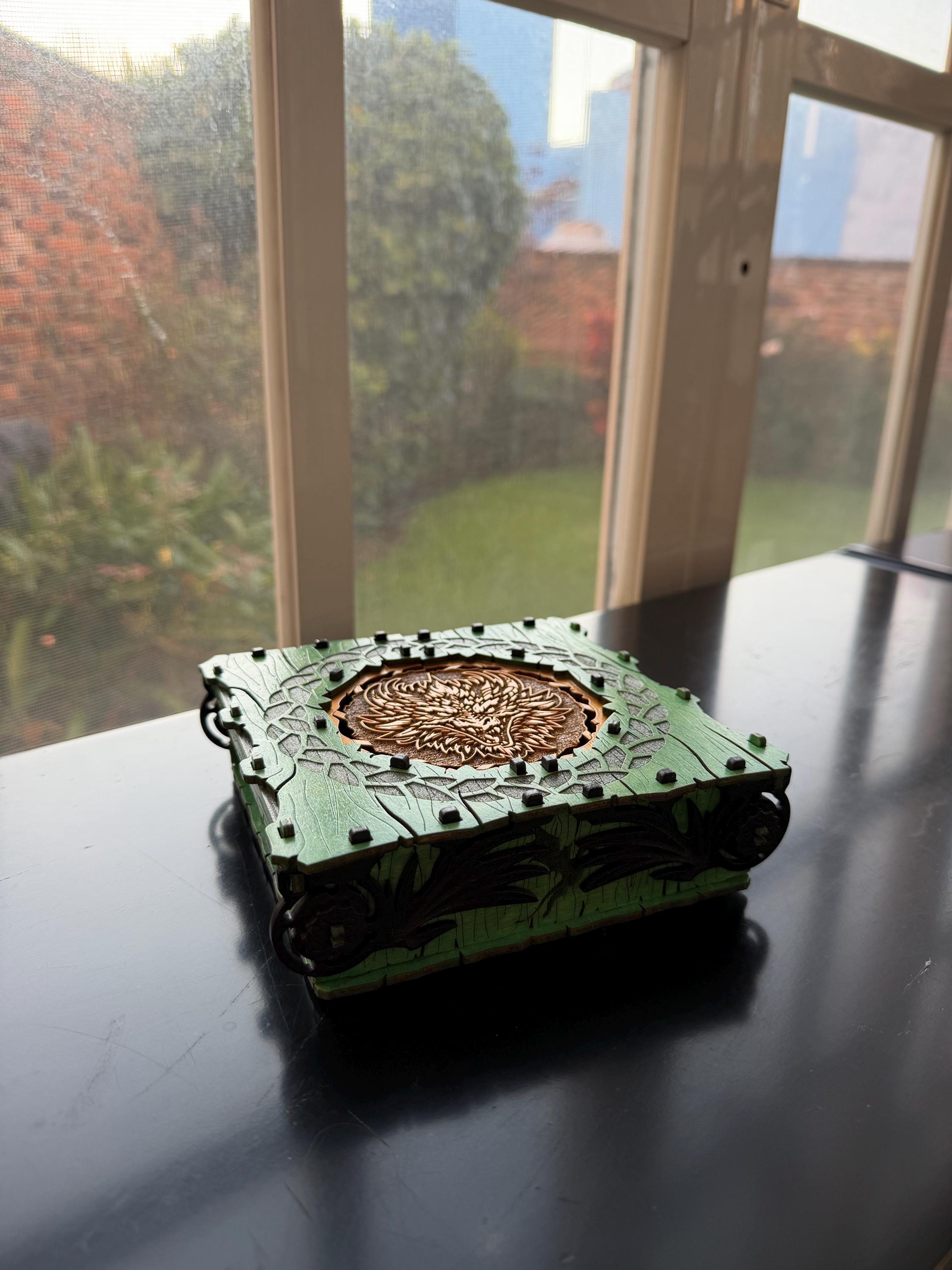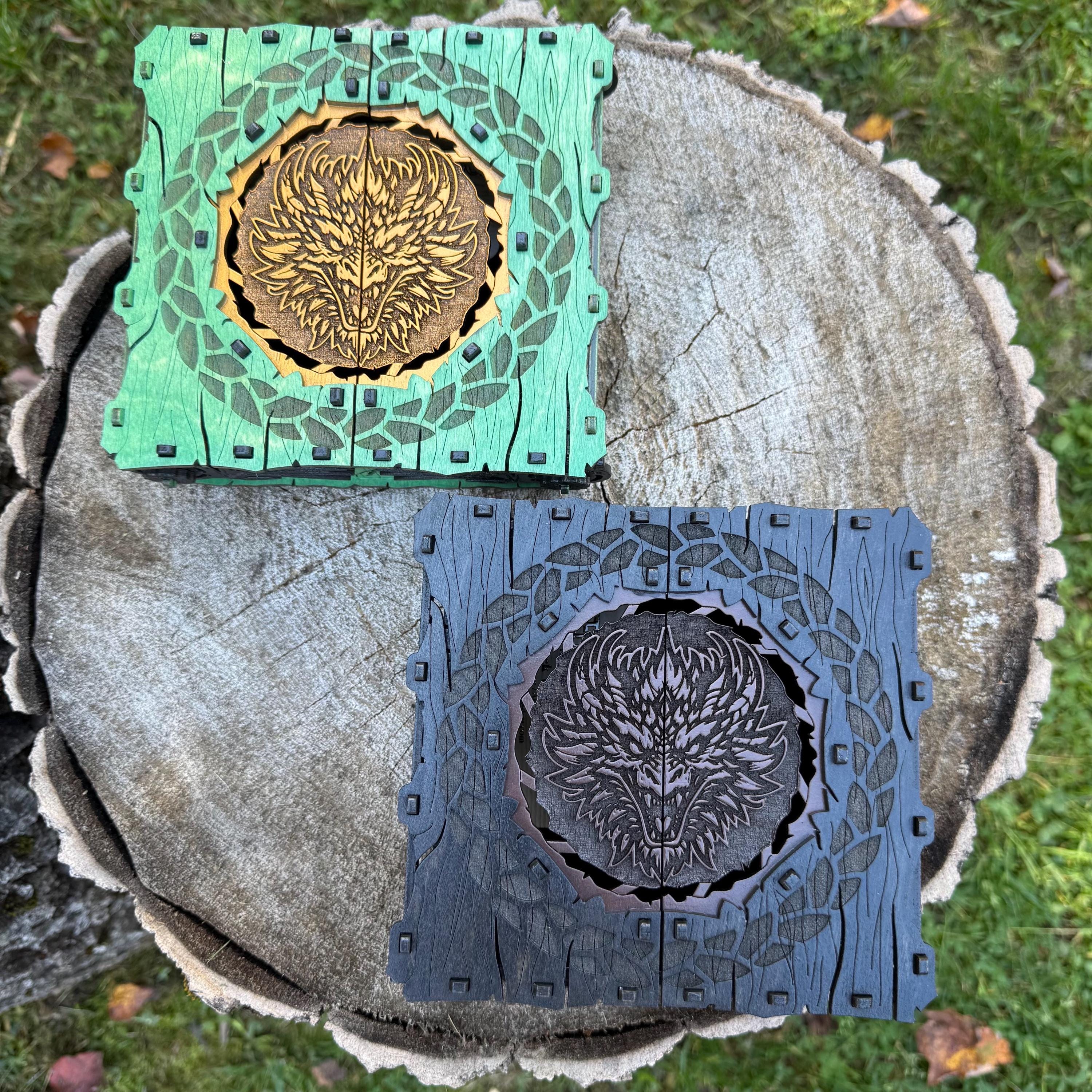 This exceptionally designed and embellished wooden box can be used for jewelry and other small mementos, or by gaming enthusiasts for dice or other game components. Intricate and yet durable, with highly detailed laser-engraved artwork and a dual color staining process for a truly captivating creation. Featuring a velvet-lined interior and shutter style lid, this small box is a great gift idea for anyone fond of fantasy, dragons, or intriguing, functional handcrafted items. It will also make a fine presentation box for any small gift that fits within its confines.