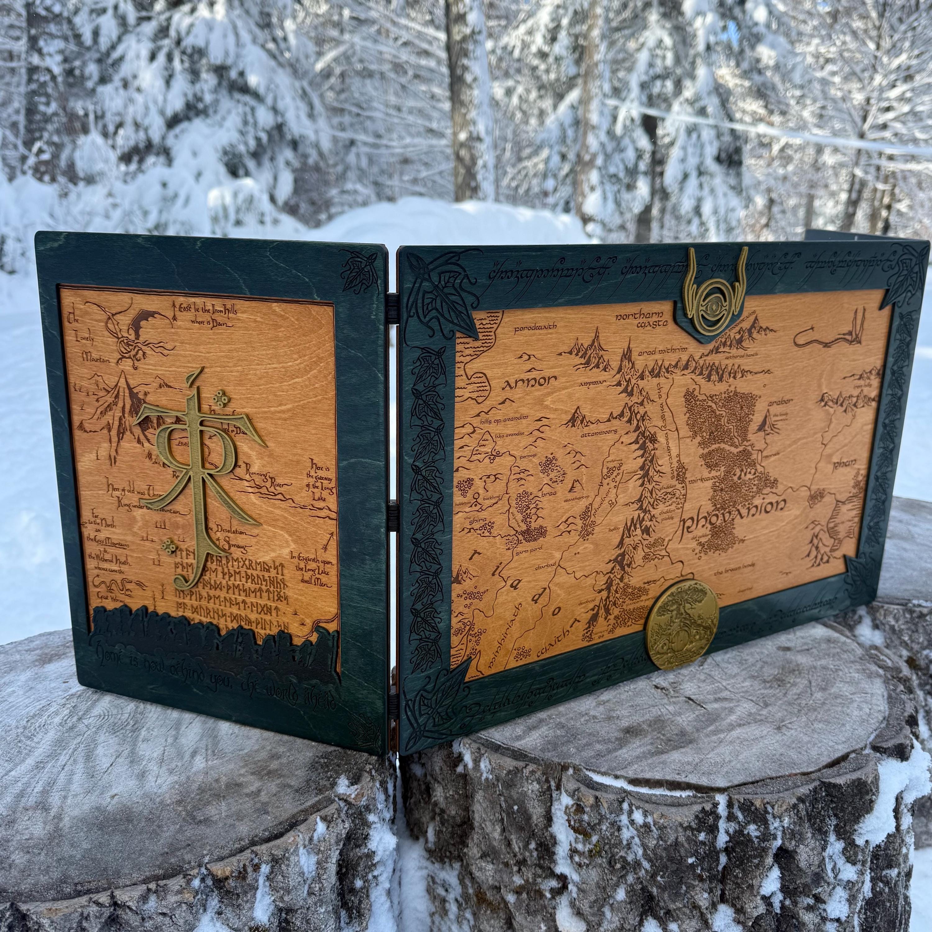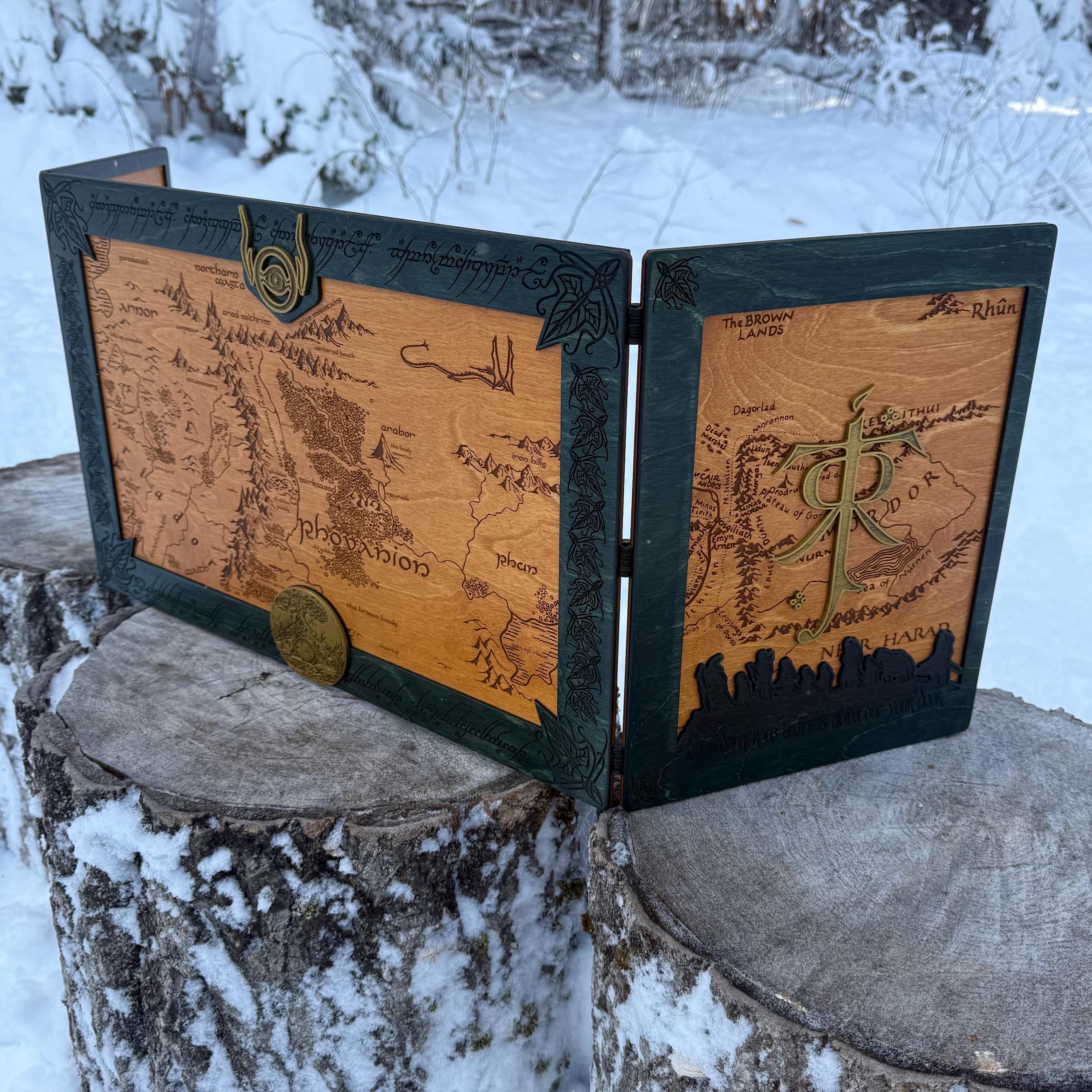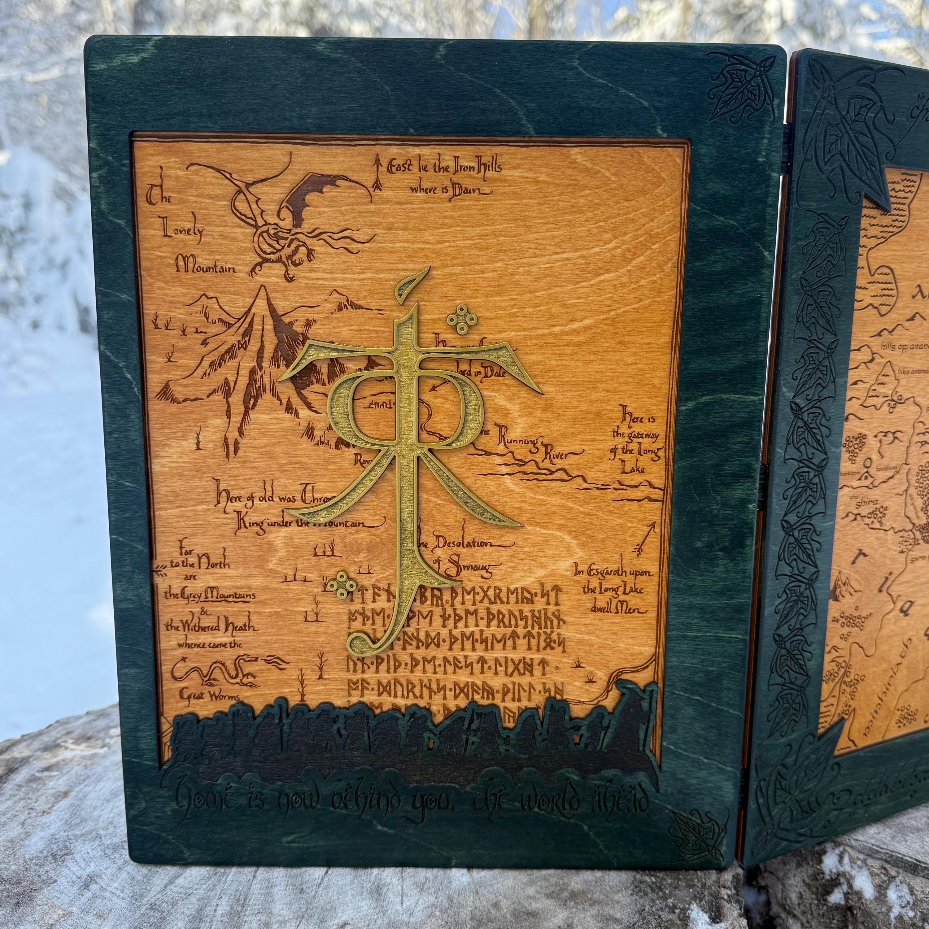 Craft an unforgettable campaign for your players from behind this outstanding wooden Game Master's Screen! Suitable for most fantasy RPGs - such as D&D, Dragonbane, Dragonslayer, Pathfinder, Shadowdark, etc. - this highly detailed, durable and resilient wooden screen will serve to conceal a GM's wickedly clever plots for many campaigns to come. High resolution engravings of Middle Earth map locations decorate the wood panels, framed within cut silhouettes of Thorin's Company and the Fellowship on the fold-out sides, and a border of the One Ring inscription with Lorien leaves on the front. Intricate medallions depicting Sauron's Eye and the Ring, drawn by Tolkien originally, as well as the Professor's runic signature are superimposed over the side maps and front frame, painted with a weathered gold for added detail and contrast.