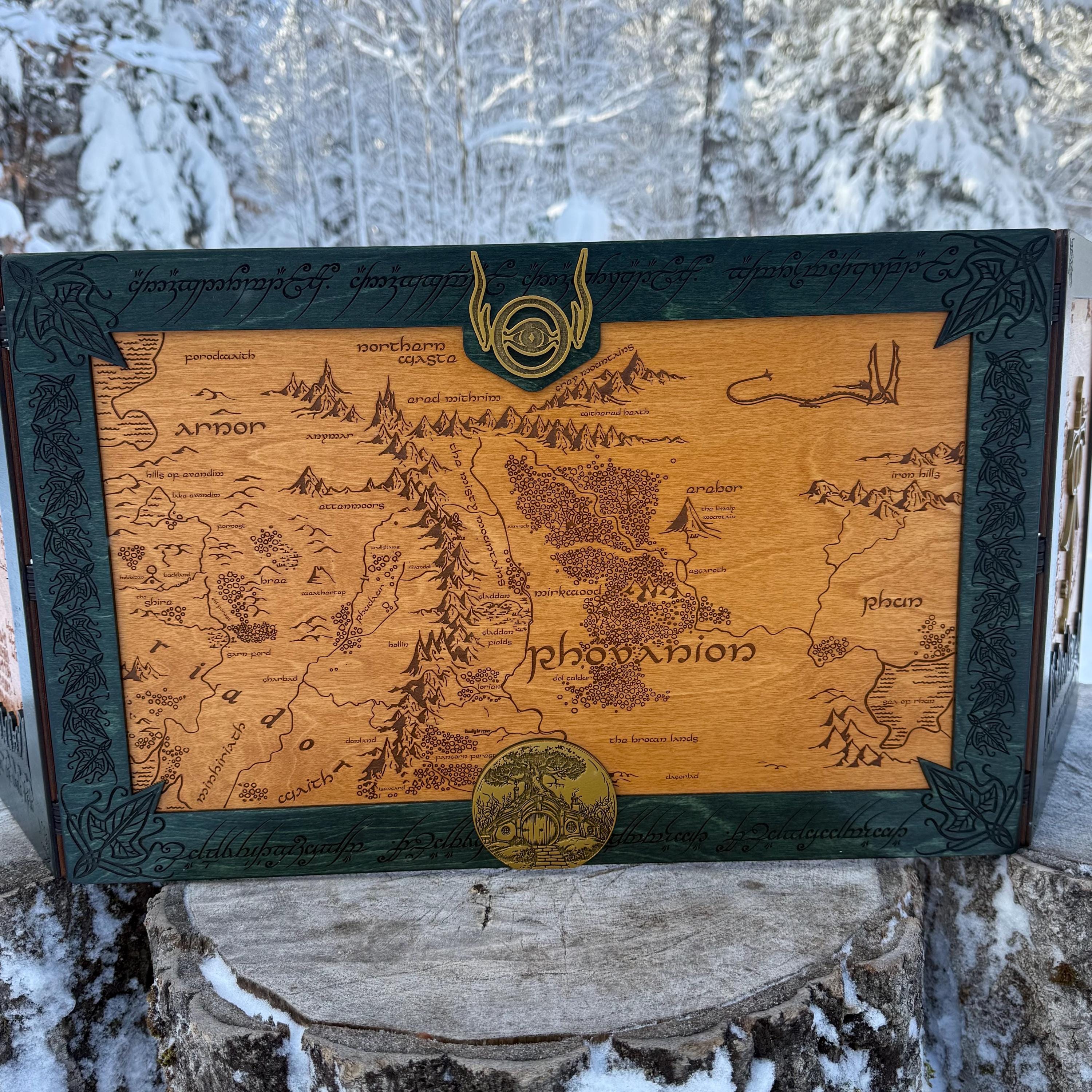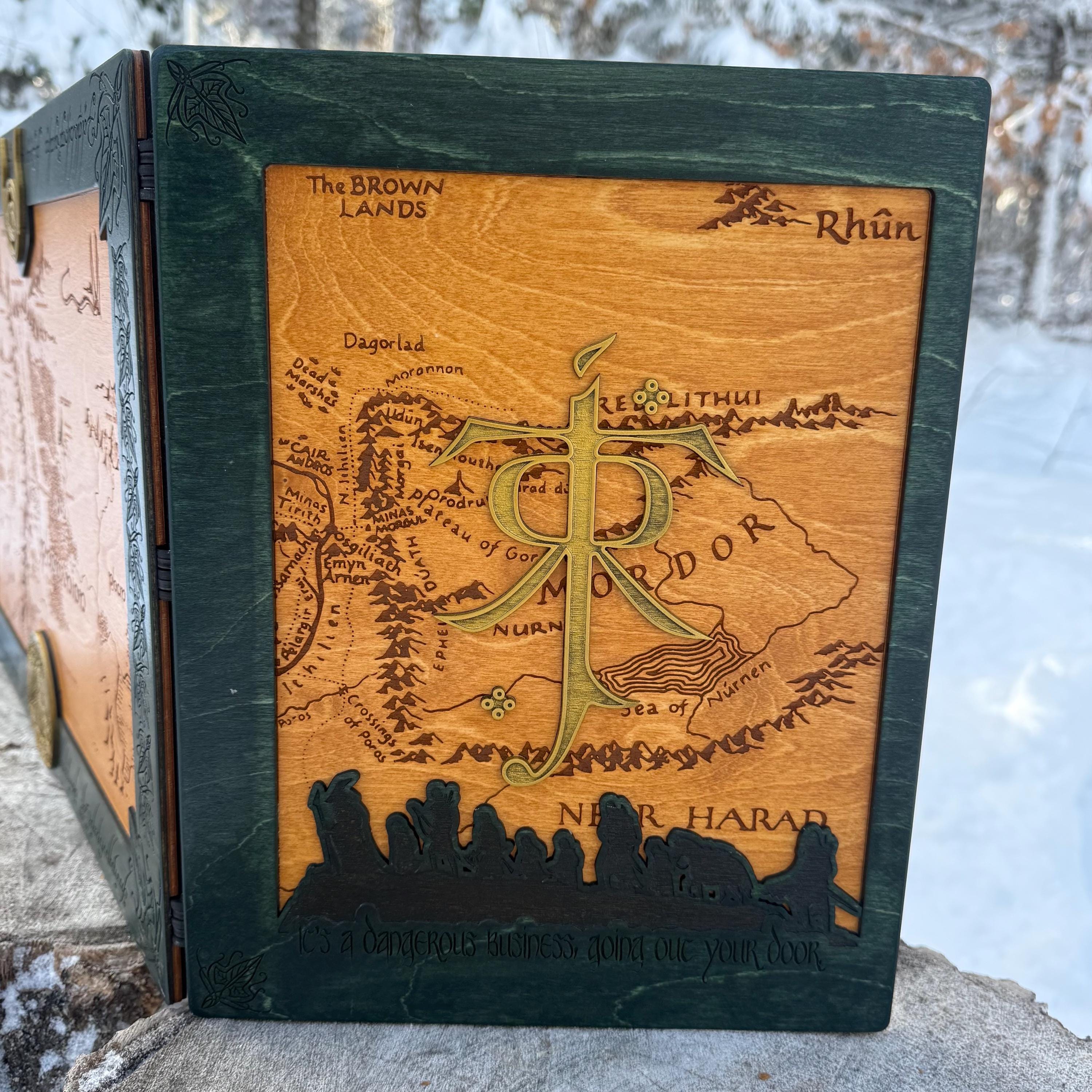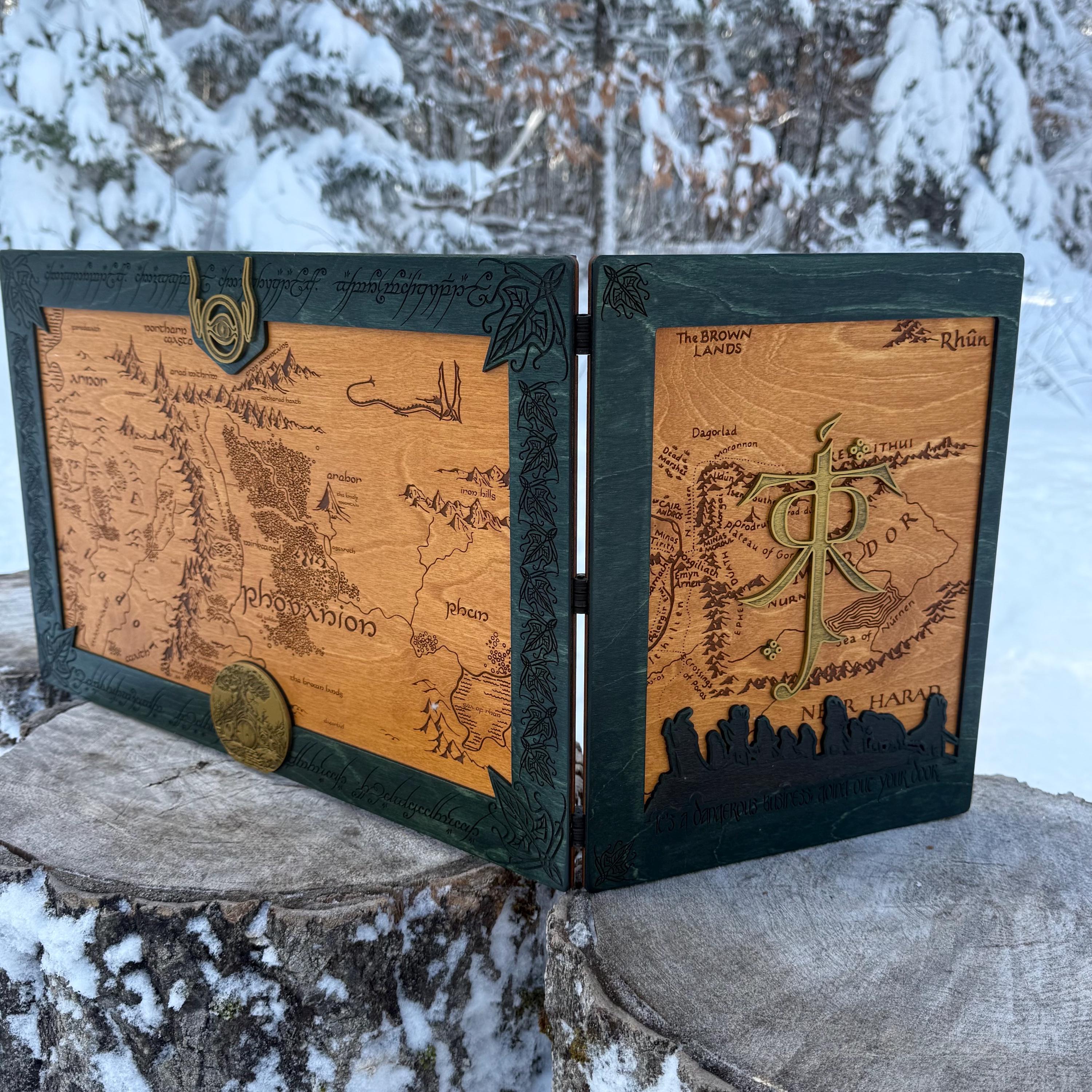 Craft an unforgettable campaign for your players from behind this outstanding wooden Game Master's Screen! Suitable for most fantasy RPGs - such as D&D, Dragonbane, Dragonslayer, Pathfinder, Shadowdark, etc. - this highly detailed, durable and resilient wooden screen will serve to conceal a GM's wickedly clever plots for many campaigns to come. High resolution engravings of Middle Earth map locations decorate the wood panels, framed within cut silhouettes of Thorin's Company and the Fellowship on the fold-out sides, and a border of the One Ring inscription with Lorien leaves on the front. Intricate medallions depicting Sauron's Eye and the Ring, drawn by Tolkien originally, as well as the Professor's runic signature are superimposed over the side maps and front frame, painted with a weathered gold for added detail and contrast.
