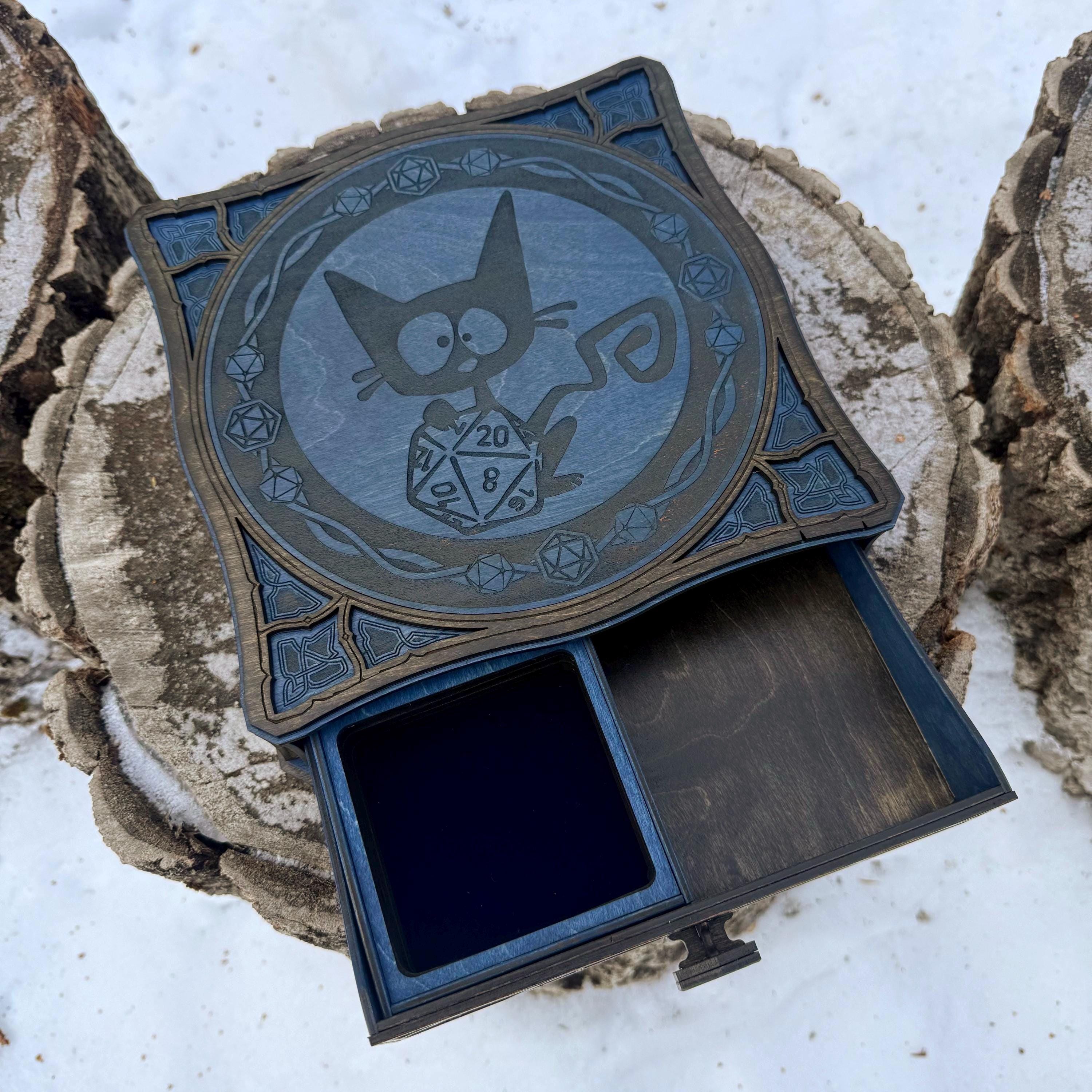 This handcrafted wooden drawer-style box is both intricate in appearance and resilient in construction, and can be a great addition to any gaming enthusiast's collection! Created from durable birch plywood and assembled by hand, this desktop drawer box is laser engraved with thematic high-resolution artwork on the exterior surfaces as well as the sides of the drawer. Available in several designs, with selectable accent colors, this box also features an optional inner storage tray to further organize and stow items. The inner tray is removable, and can be positioned vertically or horizontally in the drawer to best serve the needs of its owner. Whether used as a gaming accessory, an organizer for the desktop, or storage for personal keepsakes, this box is built to last for years of constant use.