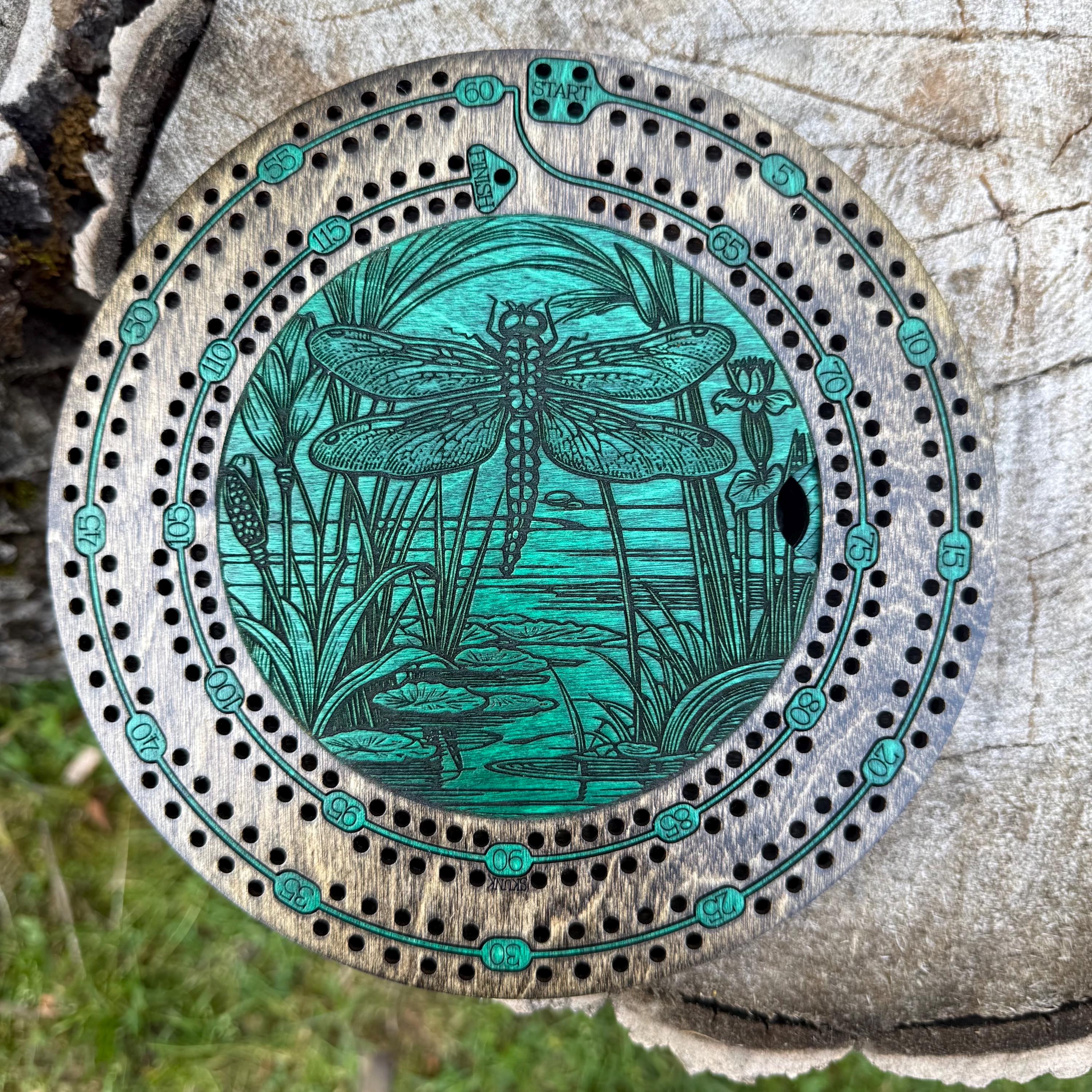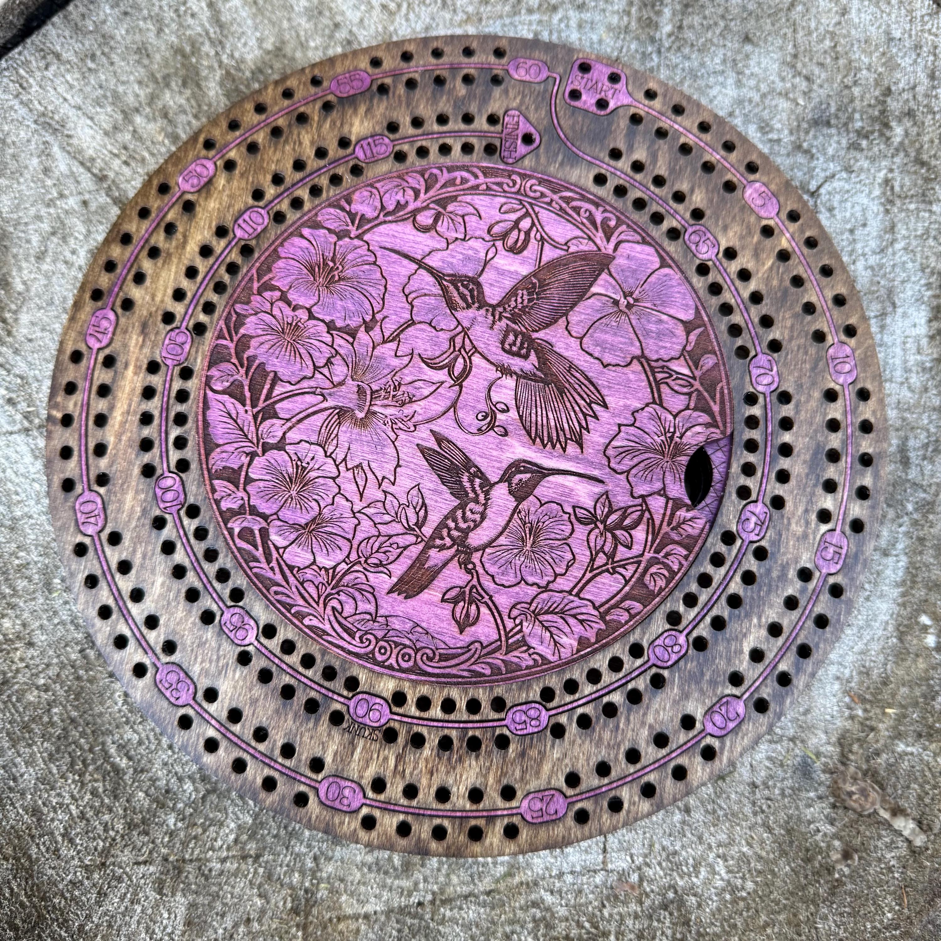 Enjoy a rousing game of cribbage played with a friend or loved one with this handcrafted wooden cribbage round. Featuring a 2-player scoring track, wins tally, and integrated storage for the cards and pegs, this is a wonderful gift for any cribbage aficionado. Laser engraved with high resolution artwork, this cribbage round is further embellished with vibrant color as an accent on the center lid as well as through the scoring track and storage area. The track is finished with a dark wood stain that complements and further enhances the color accents. Created from multiple layers of resilient birch plywood, this round is both visually appealing and quite durable. The center lid magnetizes to the top panel of the storage compartment, creating a secure closure well suited for travel. This fantastic cribbage set is perfect for playing at home or taking with you to play on the go!