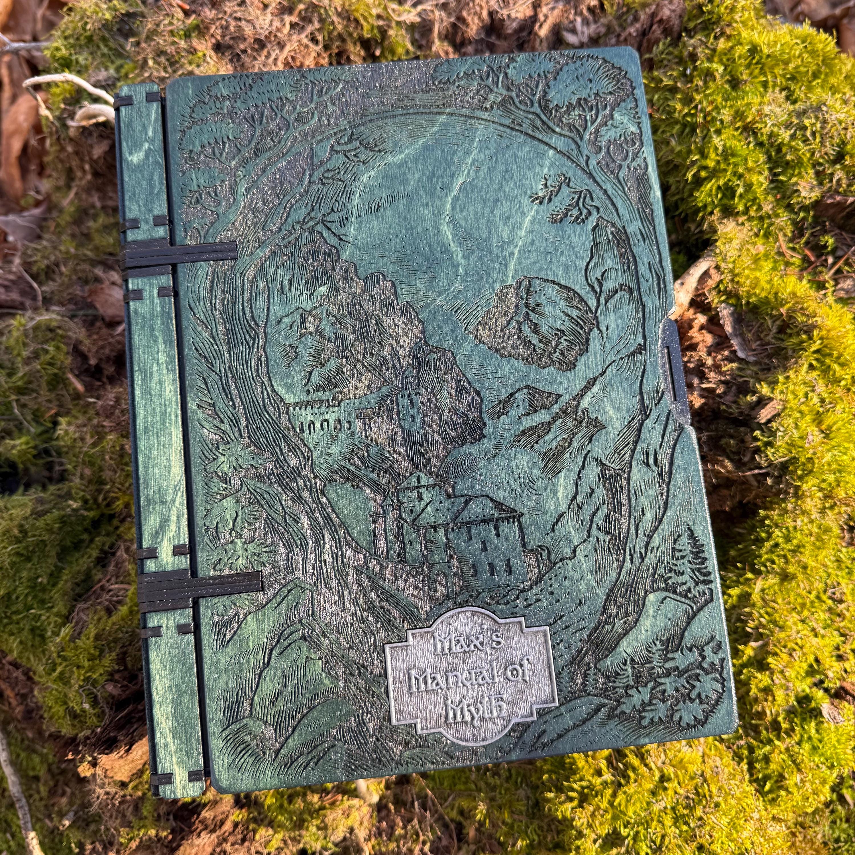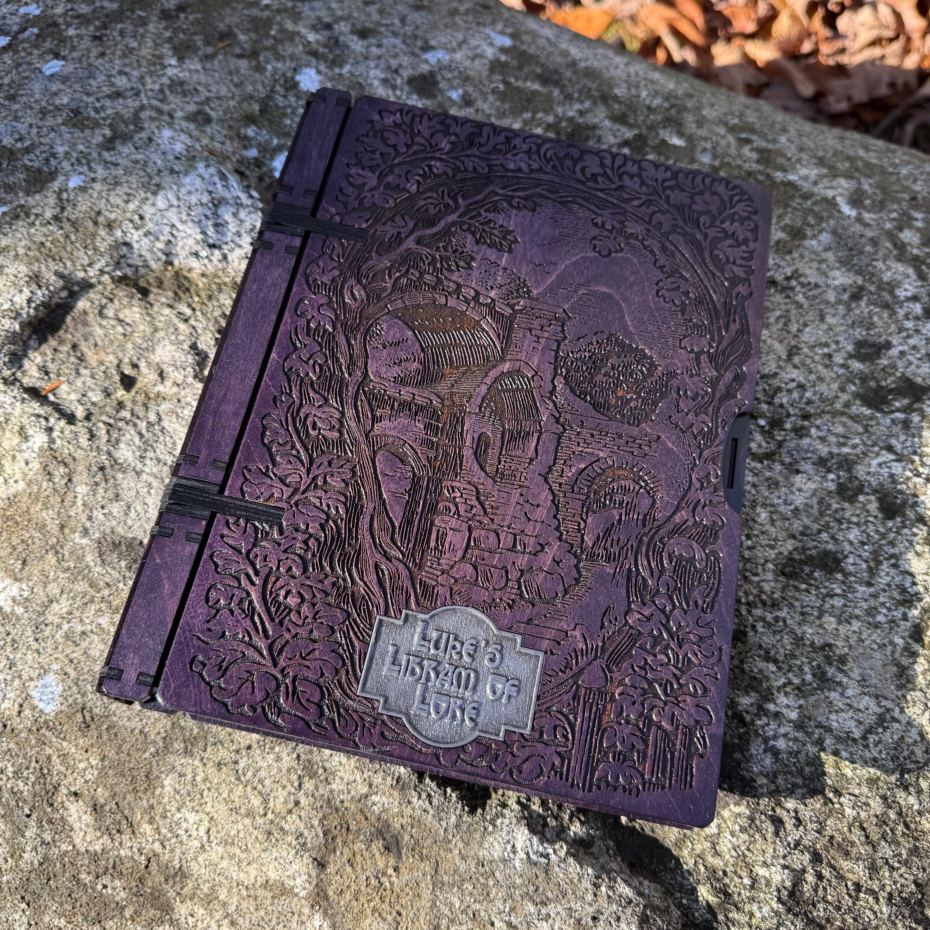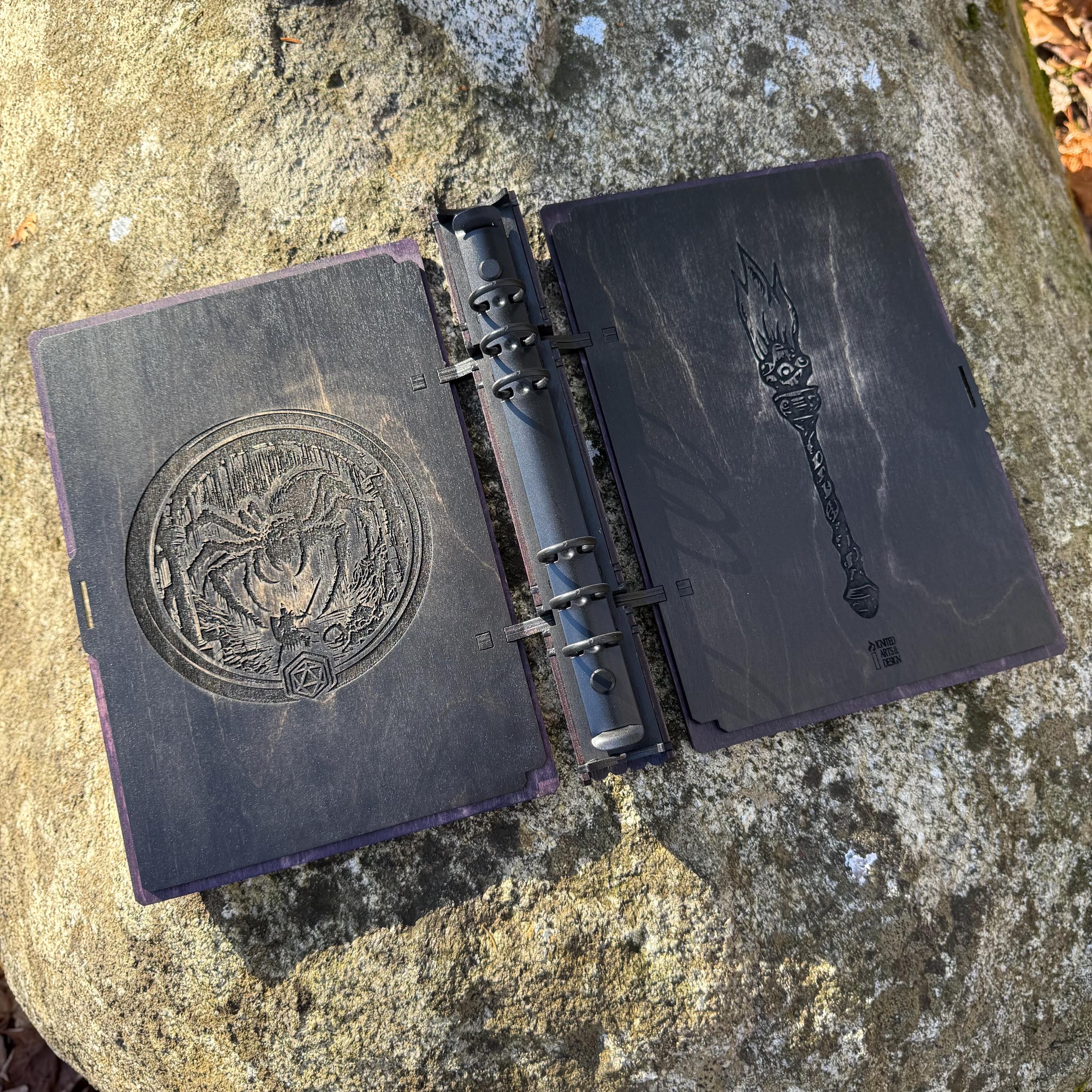 Whether used as a notebook for RPG gaming, as a personal journal, recipe book, or photo album, this handcrafted wooden binder will help to keep campaign info, special notes, recipes, or pictures securely collected within its elaborately engraved covers. This A5-sized binder is created from resilient birch plywood, giving the binder added durability and style, and it has a great solid feel to it. The binder can be fully customized to match any personal style; customers can select from a variety of colors and artwork options, as well as personalize their title. The binder has a .78-inch/20mm ring diameter, which can hold up to 100 sheets of paper with a weight of 100 GSM (much more with a lighter weight paper). A great gift for role-playing game GMs and players, for those who keep handwritten journals, and/or those who appreciate unique and useful wooden creations. This binder is functional and durable, but also looks great on a bookshelf, end table, or desk!