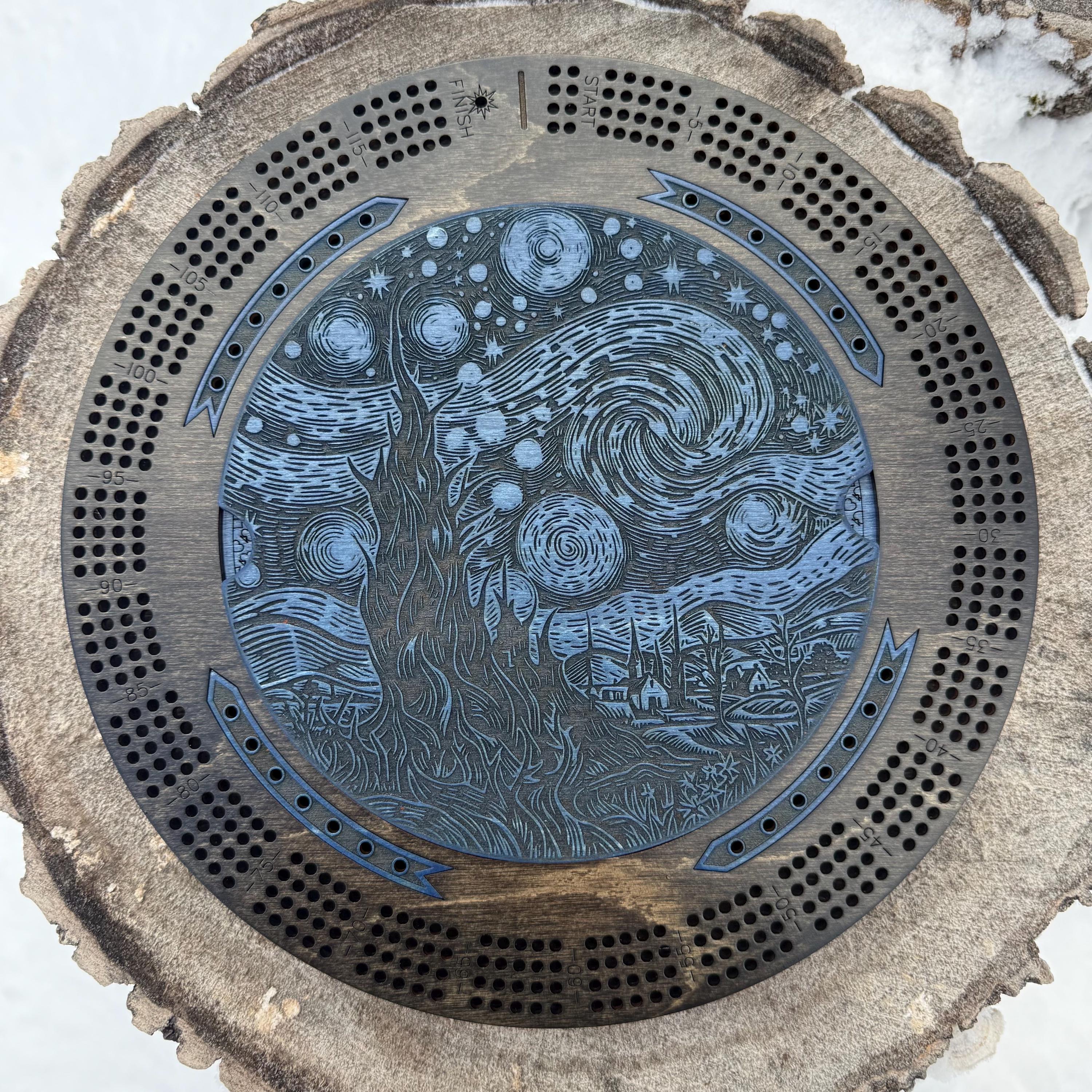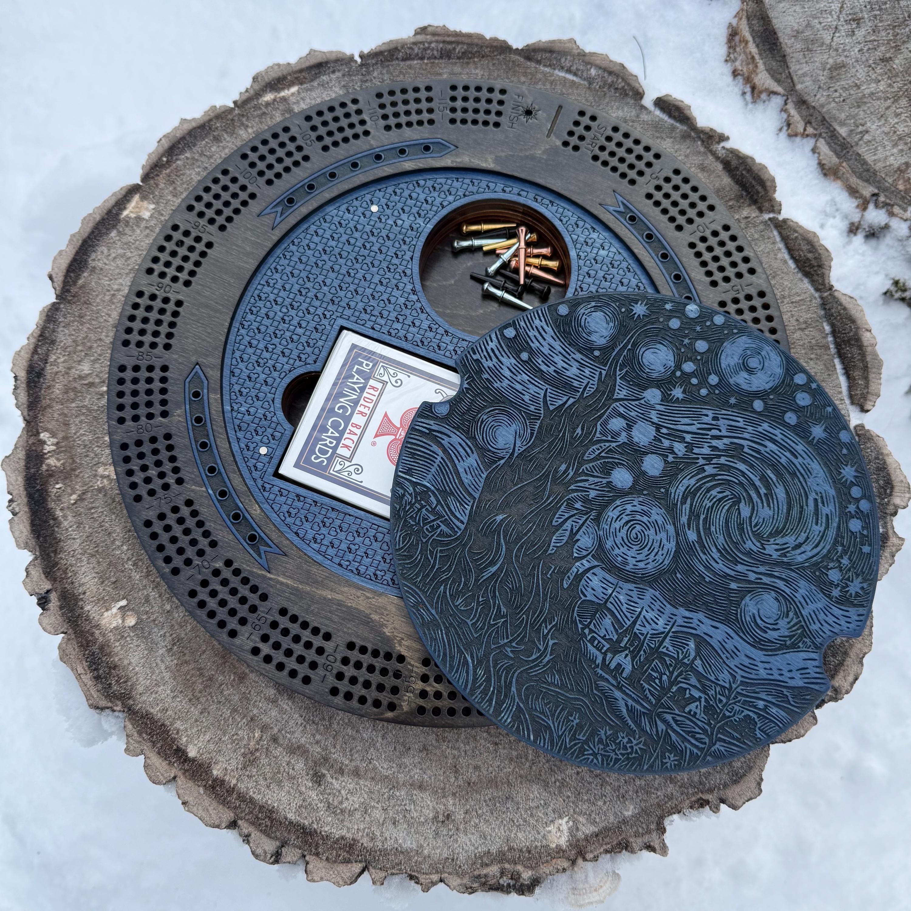 Enjoy an exciting game of cribbage played with friends or family on this handcrafted wooden cribbage round. Featuring a 4-player scoring track, individualized wins tally, and integrated storage for the cards and pegs, this is a fantastic gift for any cribbage enthusiast. Laser engraved with high resolution artwork, this cribbage round is further embellished with vibrant color stain as an accent on the center lid as well as the inlaid wins tally arrows and storage area. The track is finished with a rich, dark wood stain that complements and further enhances the color accents. The center lid magnetizes to the top panel of the storage compartment, creating a secure closure well suited for travel. Created from multiple layers of resilient birch plywood, this round is both visually appealing and quite durable. This impressive cribbage set is perfect for playing at home or taking with you to play on the go!