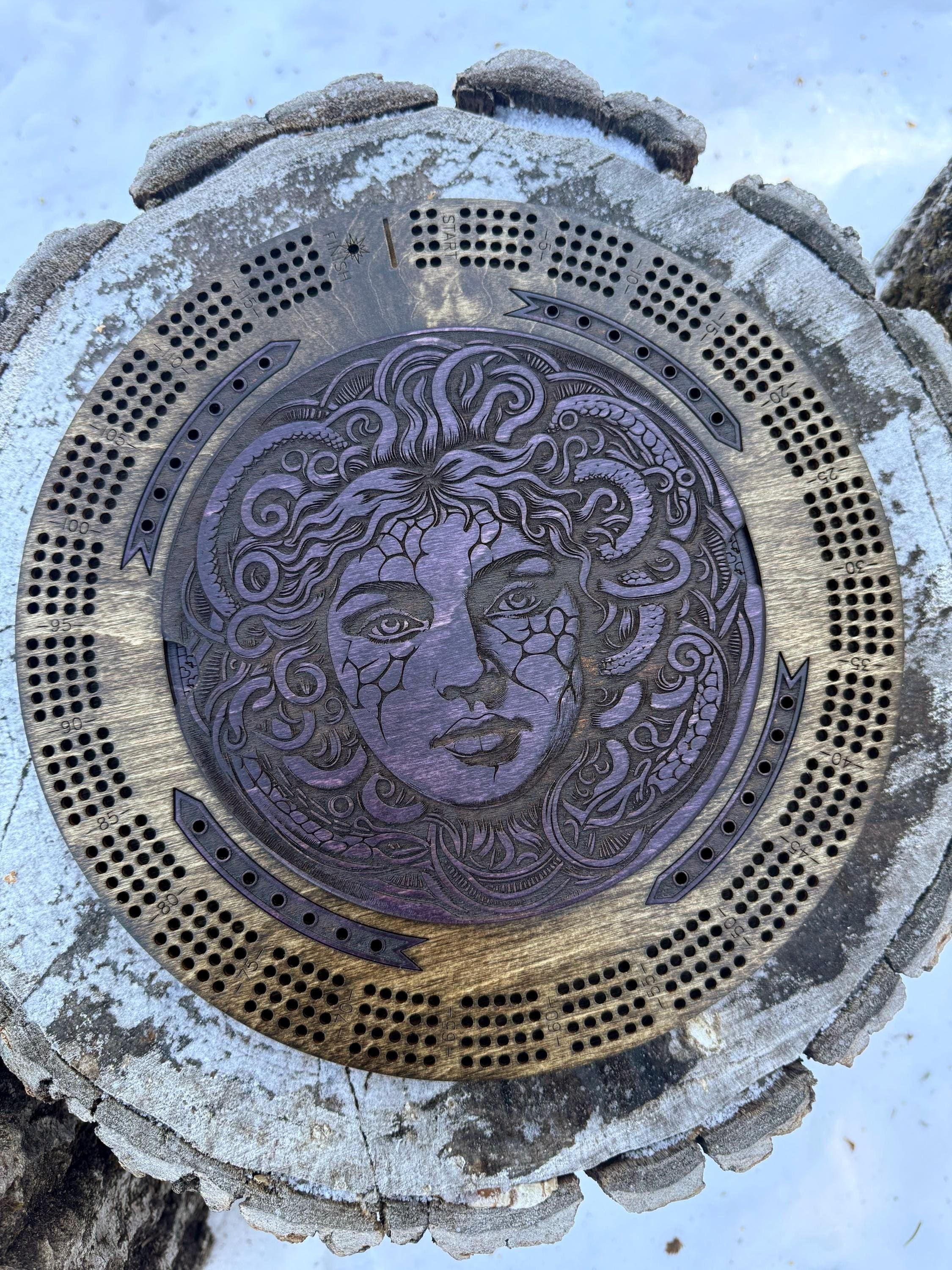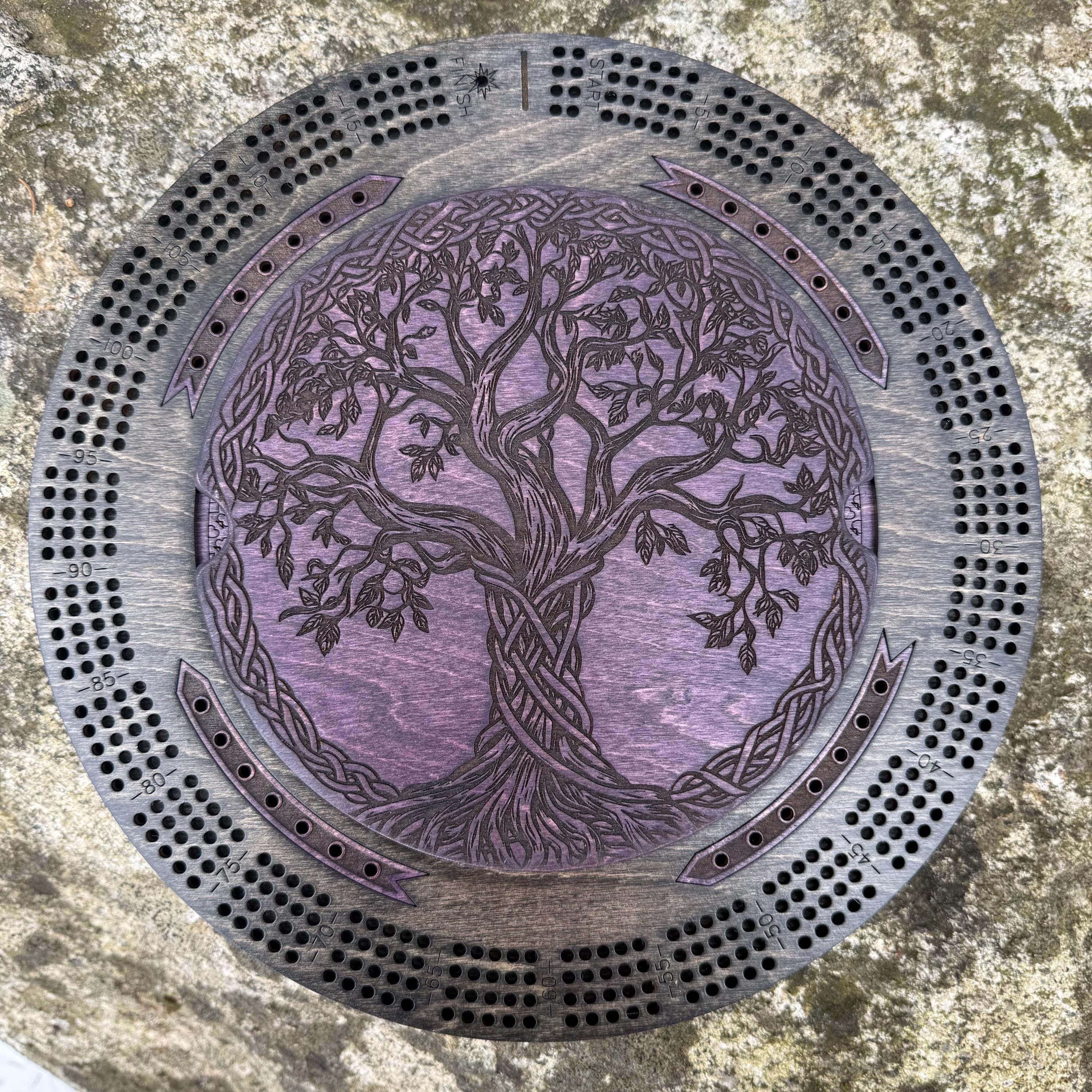 Enjoy an exciting game of cribbage played with friends or family on this handcrafted wooden cribbage round. Featuring a 4-player scoring track, individualized wins tally, and integrated storage for the cards and pegs, this is a fantastic gift for any cribbage enthusiast. Laser engraved with high resolution artwork, this cribbage round is further embellished with vibrant color stain as an accent on the center lid as well as the inlaid wins tally arrows and storage area. The track is finished with a rich, dark wood stain that complements and further enhances the color accents. The center lid magnetizes to the top panel of the storage compartment, creating a secure closure well suited for travel. Created from multiple layers of resilient birch plywood, this round is both visually appealing and quite durable. This impressive cribbage set is perfect for playing at home or taking with you to play on the go!