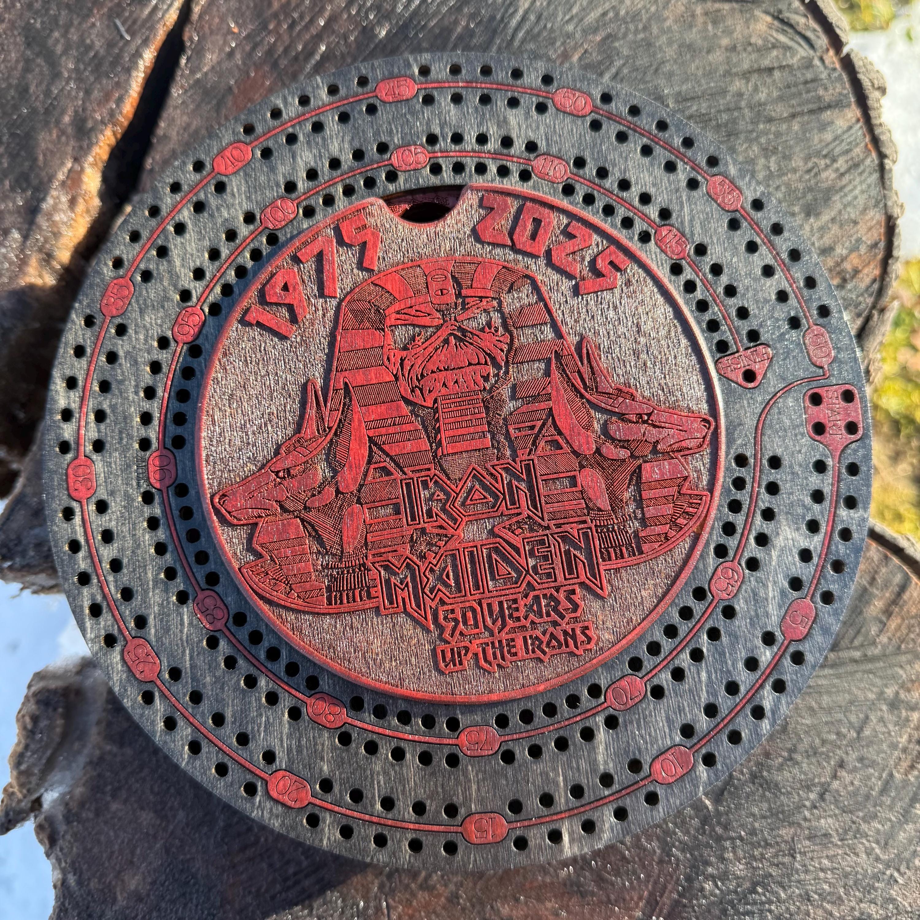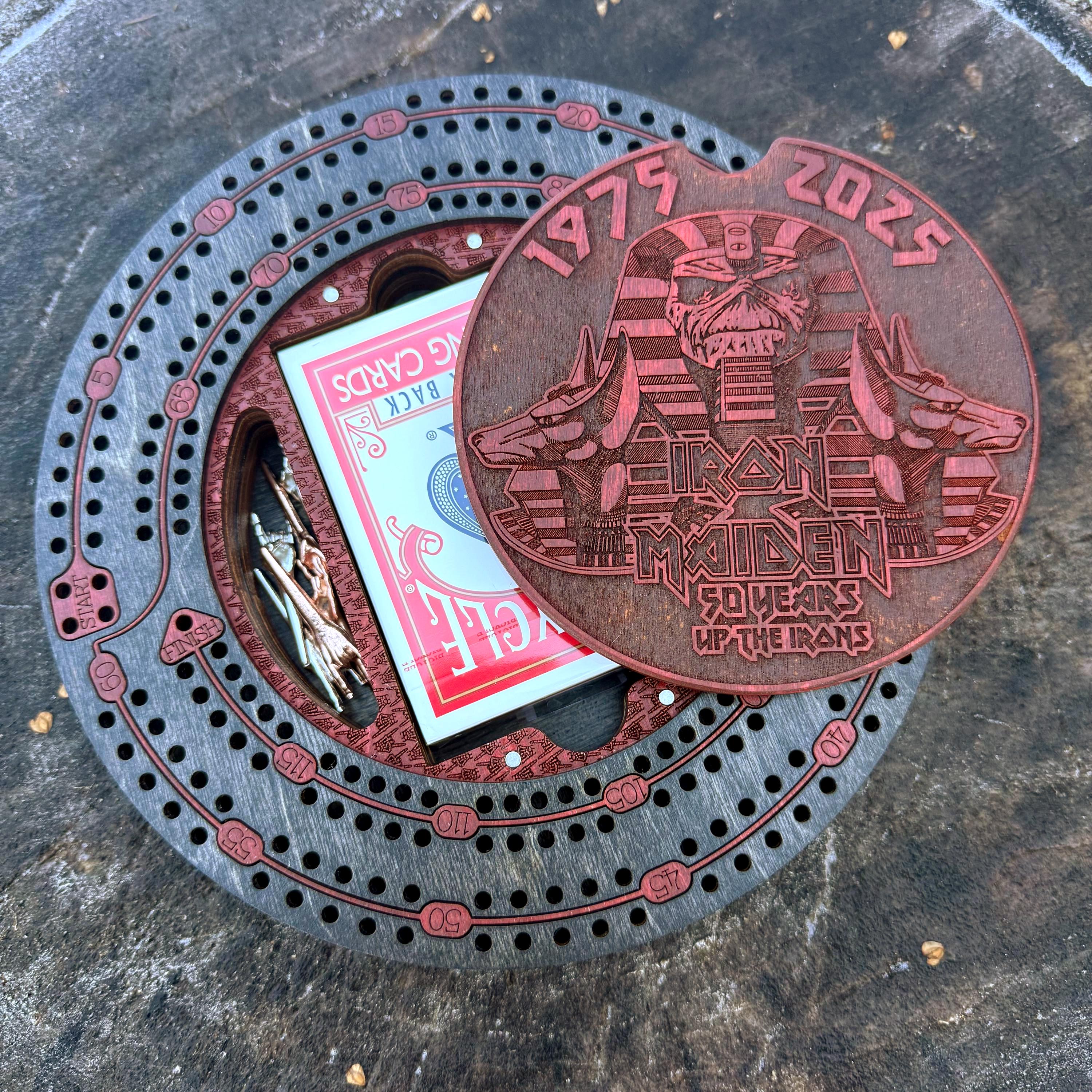 Drop the needle on the vinyl and deal out the cards! Enjoy an entertaining game of cribbage played with a friend or loved one with this handcrafted wooden cribbage round. Featuring a 2-player scoring track, wins tally, and integrated storage for the cards and pegs, this is a wonderful gift for any music/cribbage enthusiast. Laser engraved with high resolution artwork depicting a classic band or musical artist, this cribbage round is further embellished with vibrant color as an accent on the center lid as well as through the scoring track and storage area. The track is finished with a dark wood stain that complements and further enhances the color accents. The cribbage pegs are metal and are molded in the likeness of an upraised hand giving the "sign of the horns" - a gesture every metalhead will recognize! Created from multiple layers of resilient birch plywood, this round is both visually appealing and quite durable. The center lid magnetizes to the top panel of the storage compartment, creating a secure closure well suited for travel. This musically-inspired cribbage set is perfect for playing at home or taking with you to play on the go!