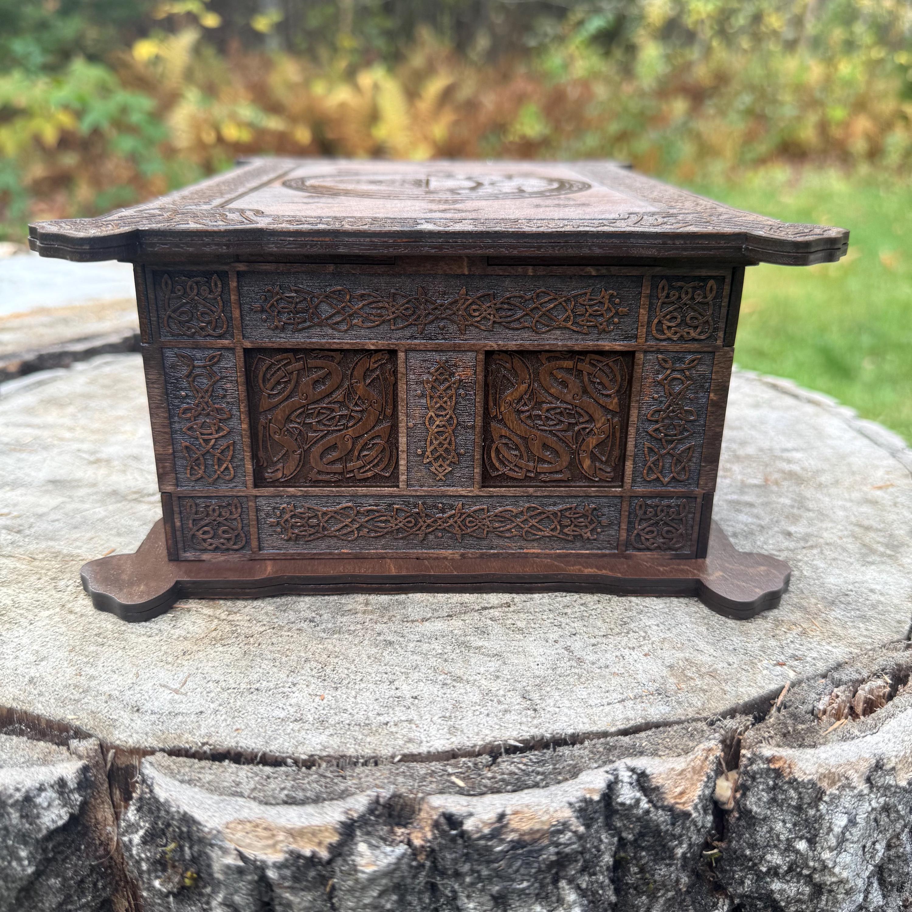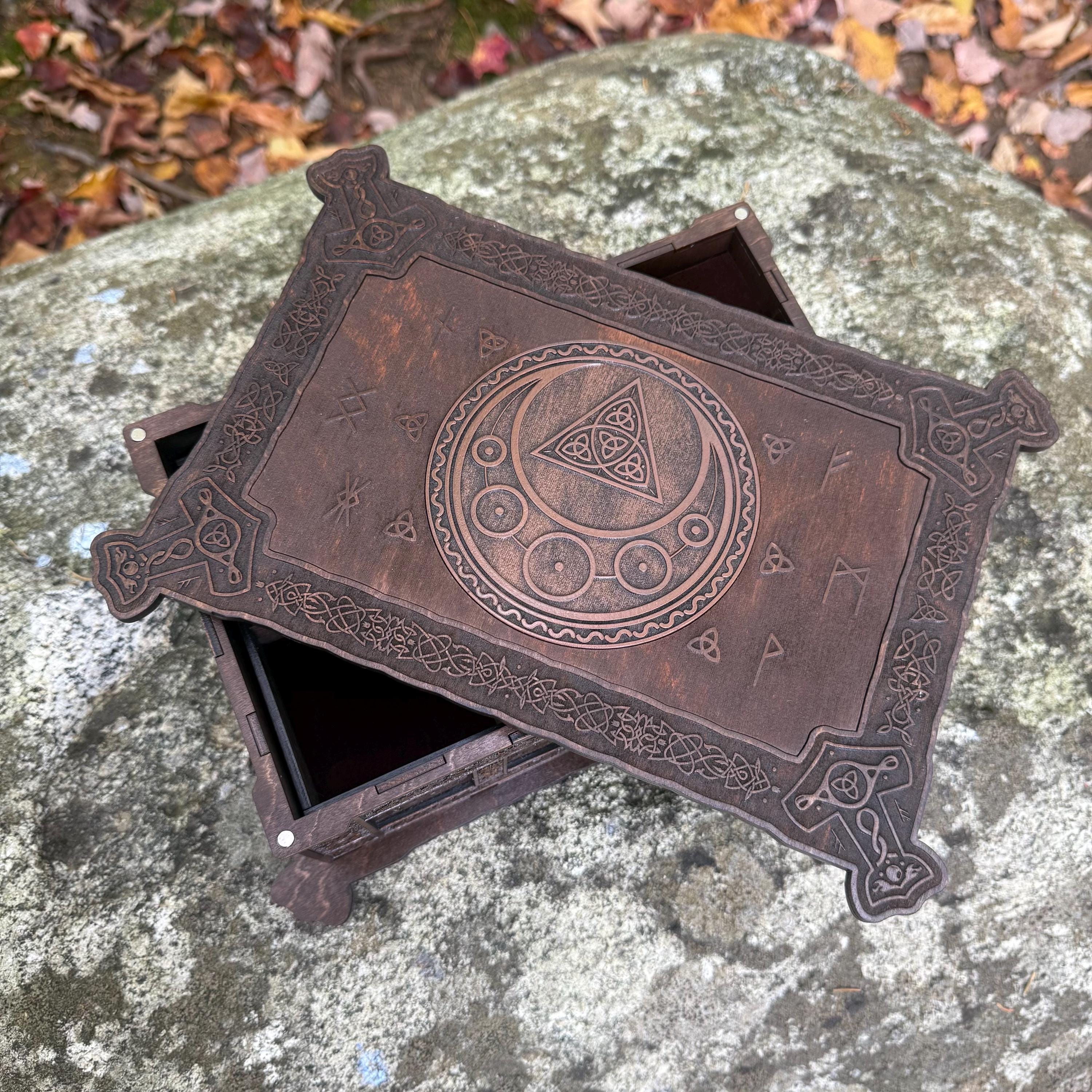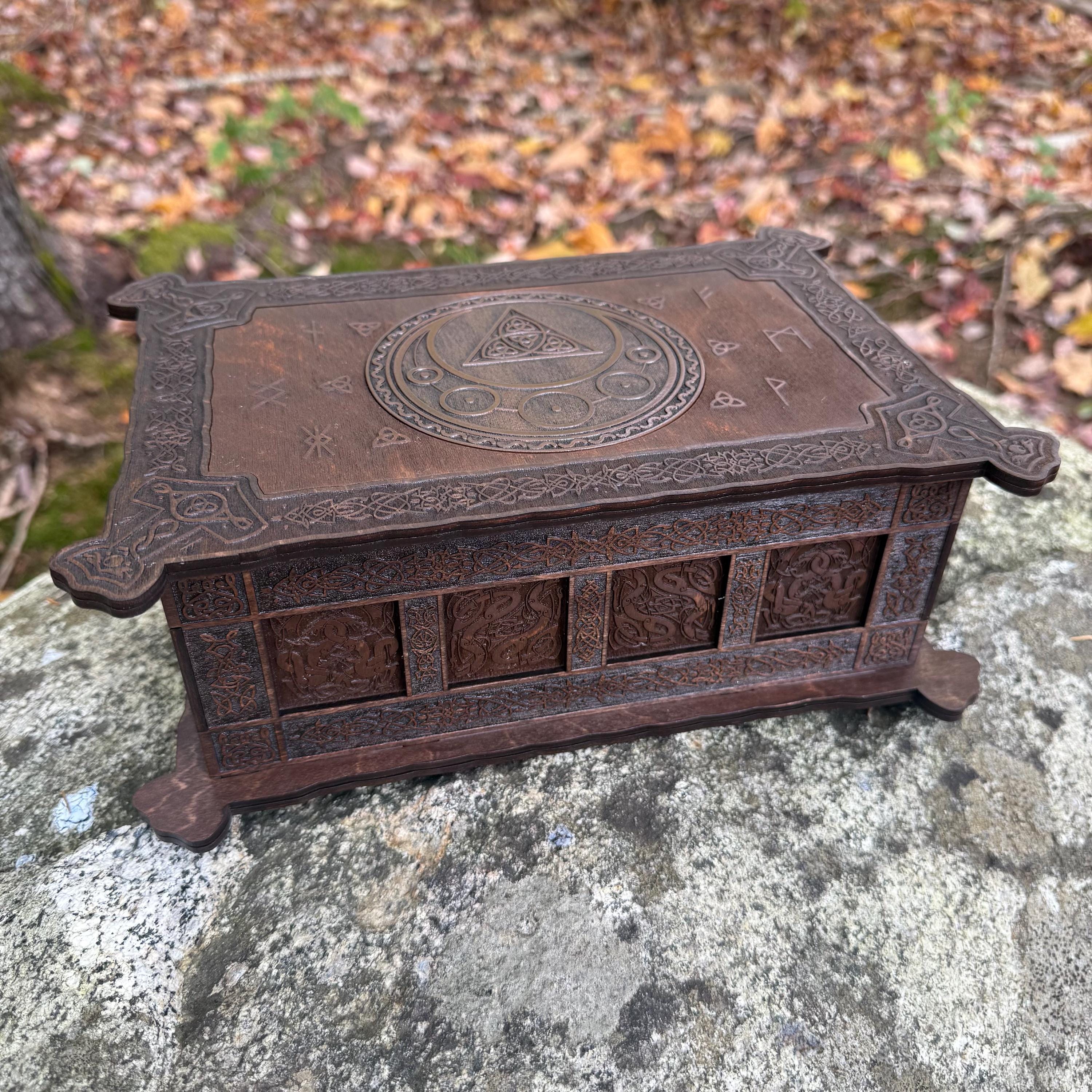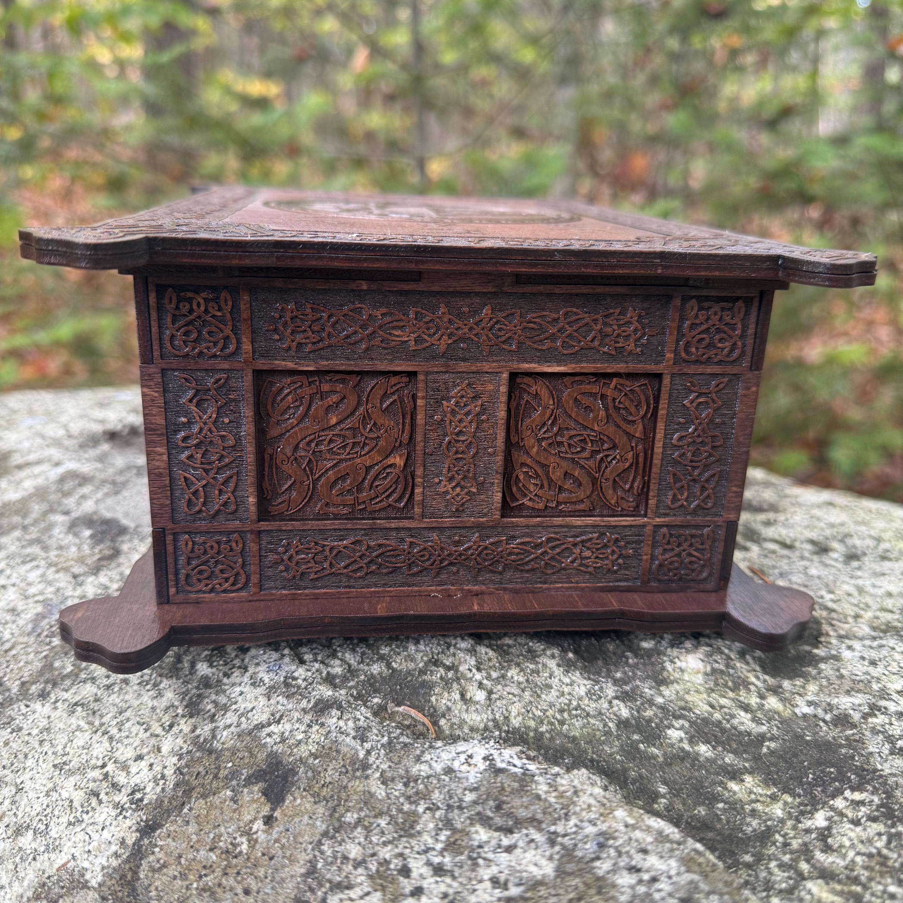 This incredibly detailed wooden chest, "Mystic Musings", is the perfect jewelry box for those interested in mystical and Celtic/Gaelic/Nordic themes. Handcrafted from birch plywood, with high resolution laser-engraved artwork and a dual staining process for an extra level of detail, this chest is very resilient and durable, with double layers that also lend greatly to its overall appearance. The box features a magnetized lid that is fully removable, as well as two nesting trays within for storage of different jewelry types. The nesting trays can be altered or eliminated to suit a customer's tastes and/or needs - please message me with your requirements should a different configuration be necessary. Whether they be literal or sentimental, this chest is sure to hold many valuables over the years.