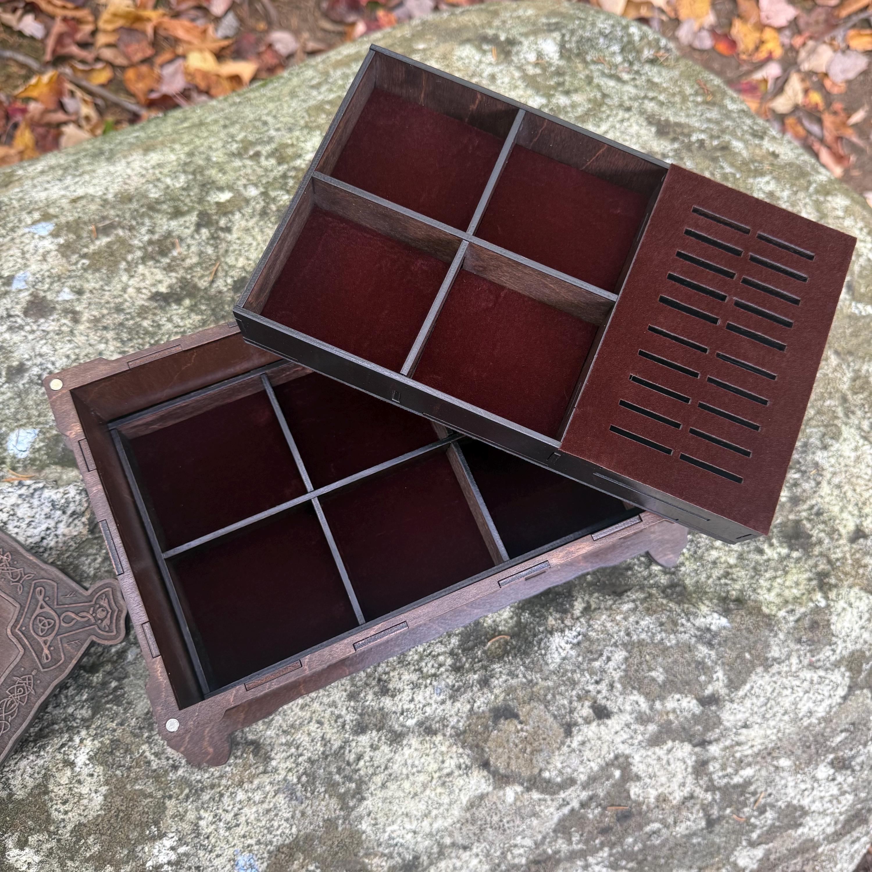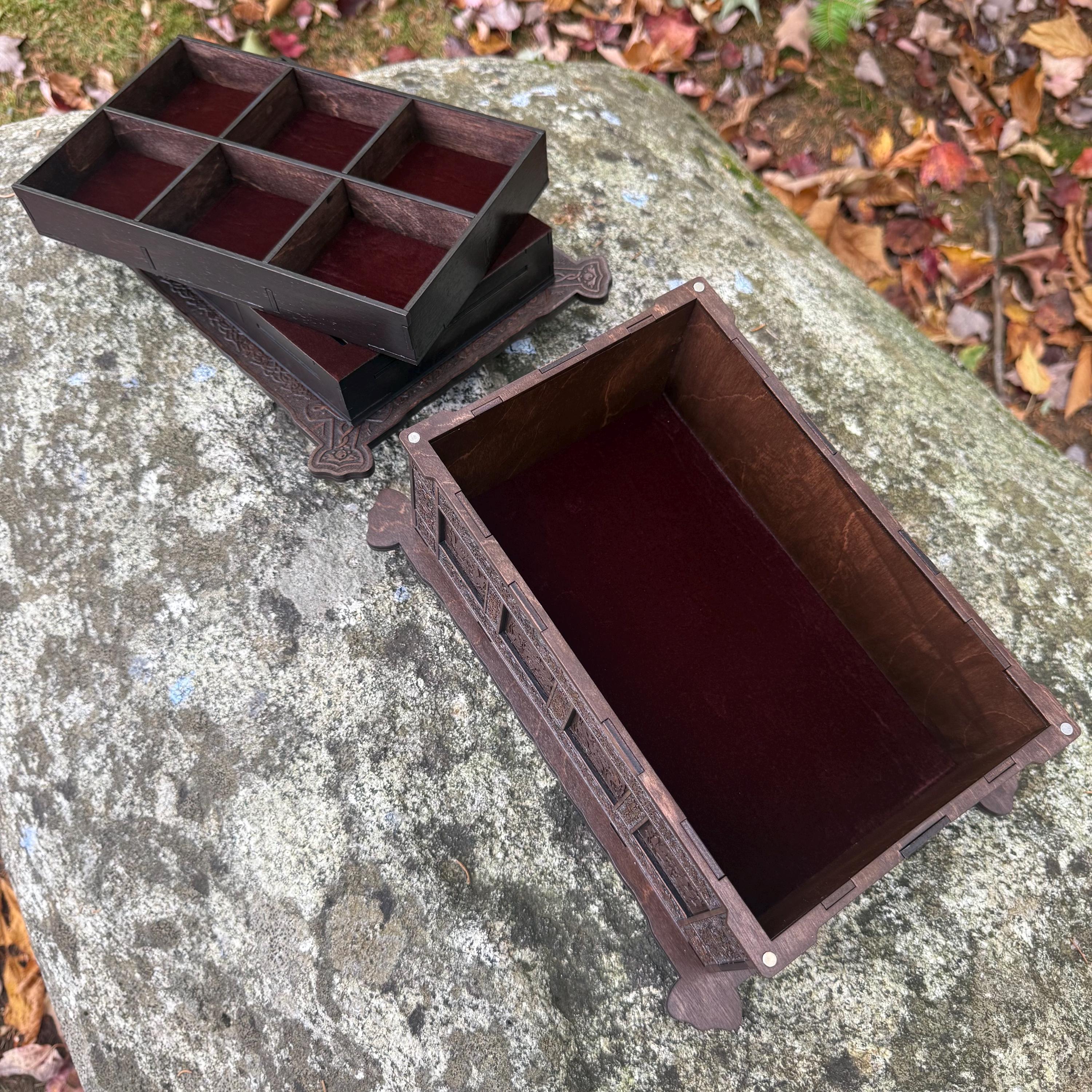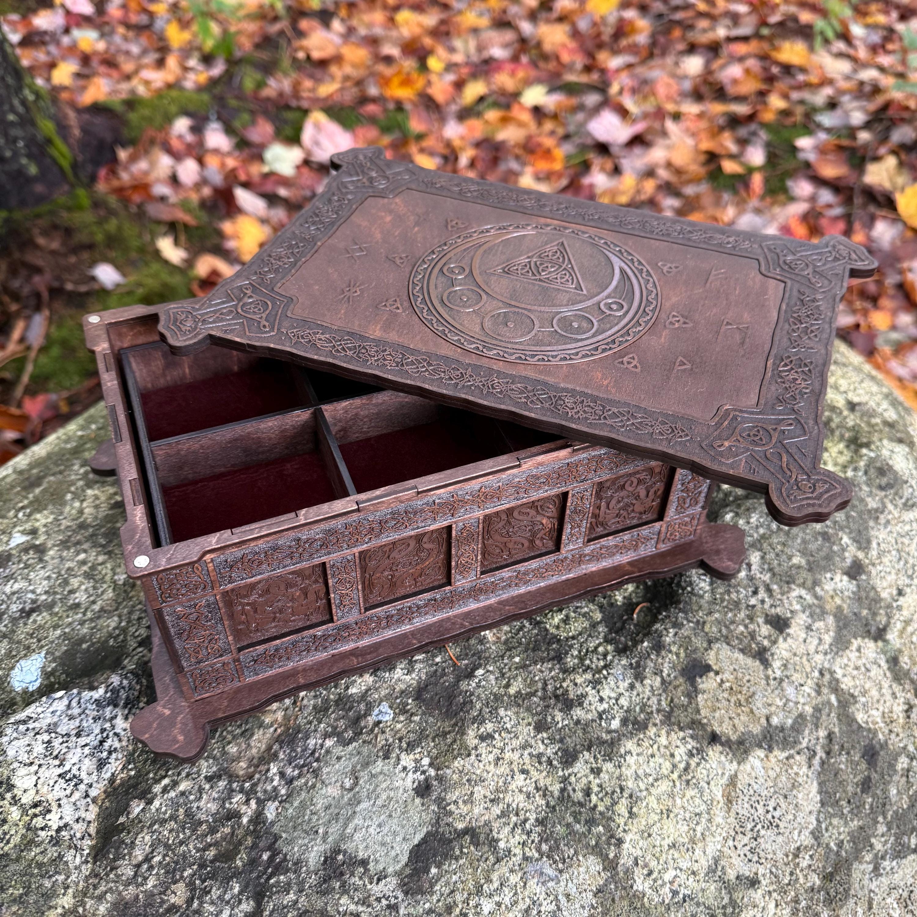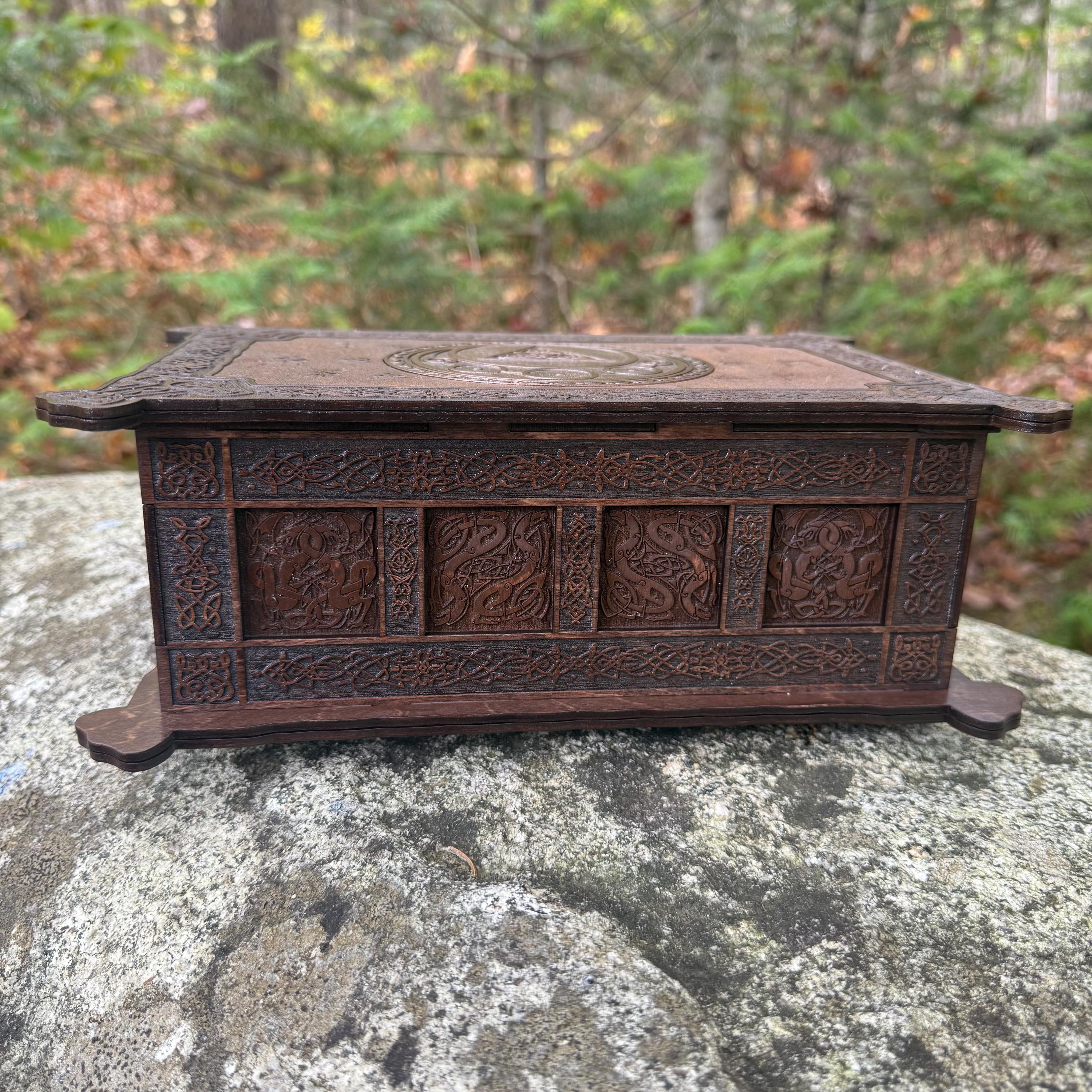 This incredibly detailed wooden chest, "Mystic Musings", is the perfect jewelry box for those interested in mystical and Celtic/Gaelic/Nordic themes. Handcrafted from birch plywood, with high resolution laser-engraved artwork and a dual staining process for an extra level of detail, this chest is very resilient and durable, with double layers that also lend greatly to its overall appearance. The box features a magnetized lid that is fully removable, as well as two nesting trays within for storage of different jewelry types. The nesting trays can be altered or eliminated to suit a customer's tastes and/or needs - please message me with your requirements should a different configuration be necessary. Whether they be literal or sentimental, this chest is sure to hold many valuables over the years.