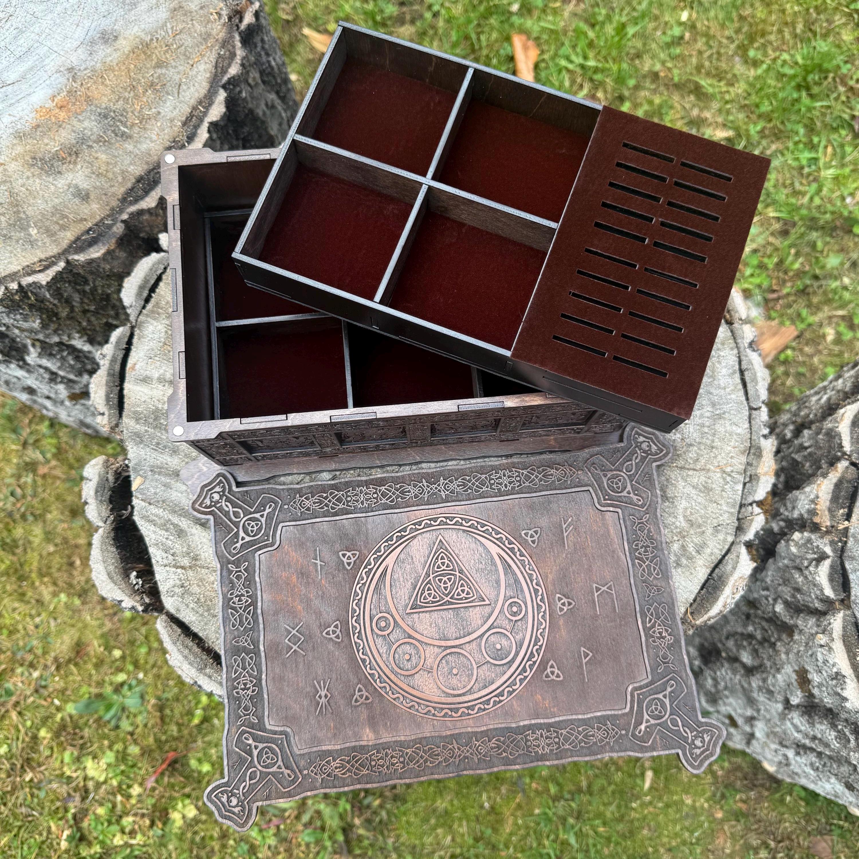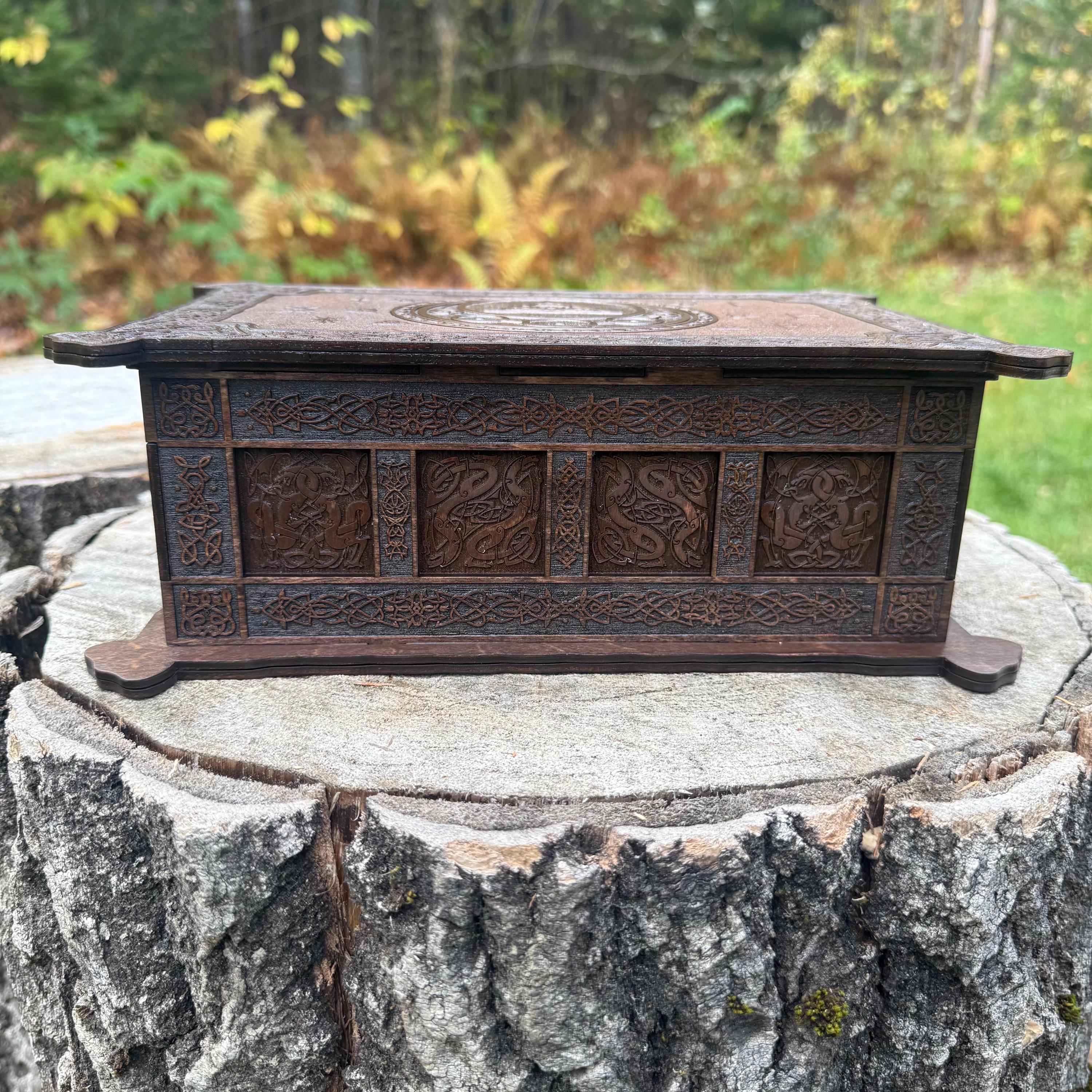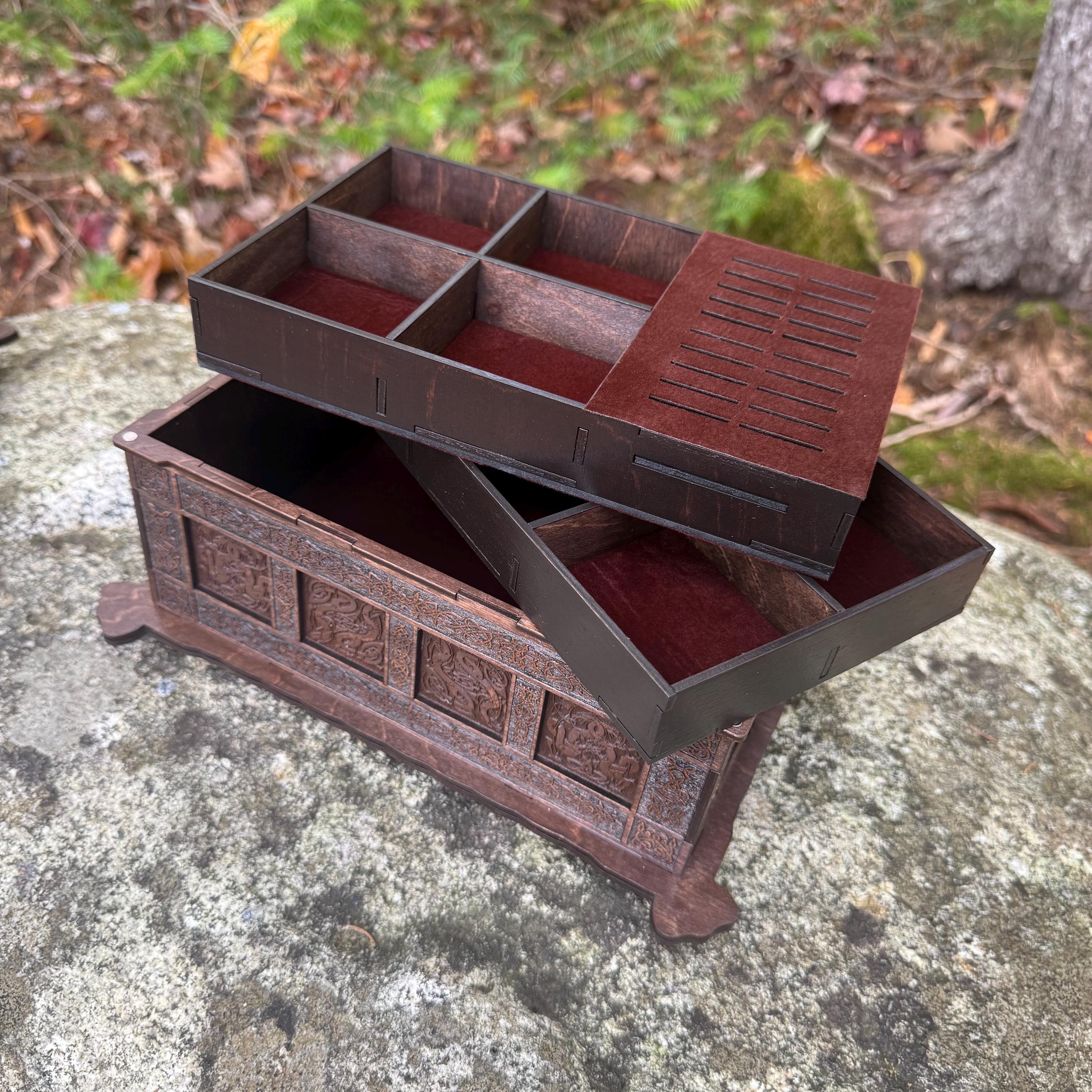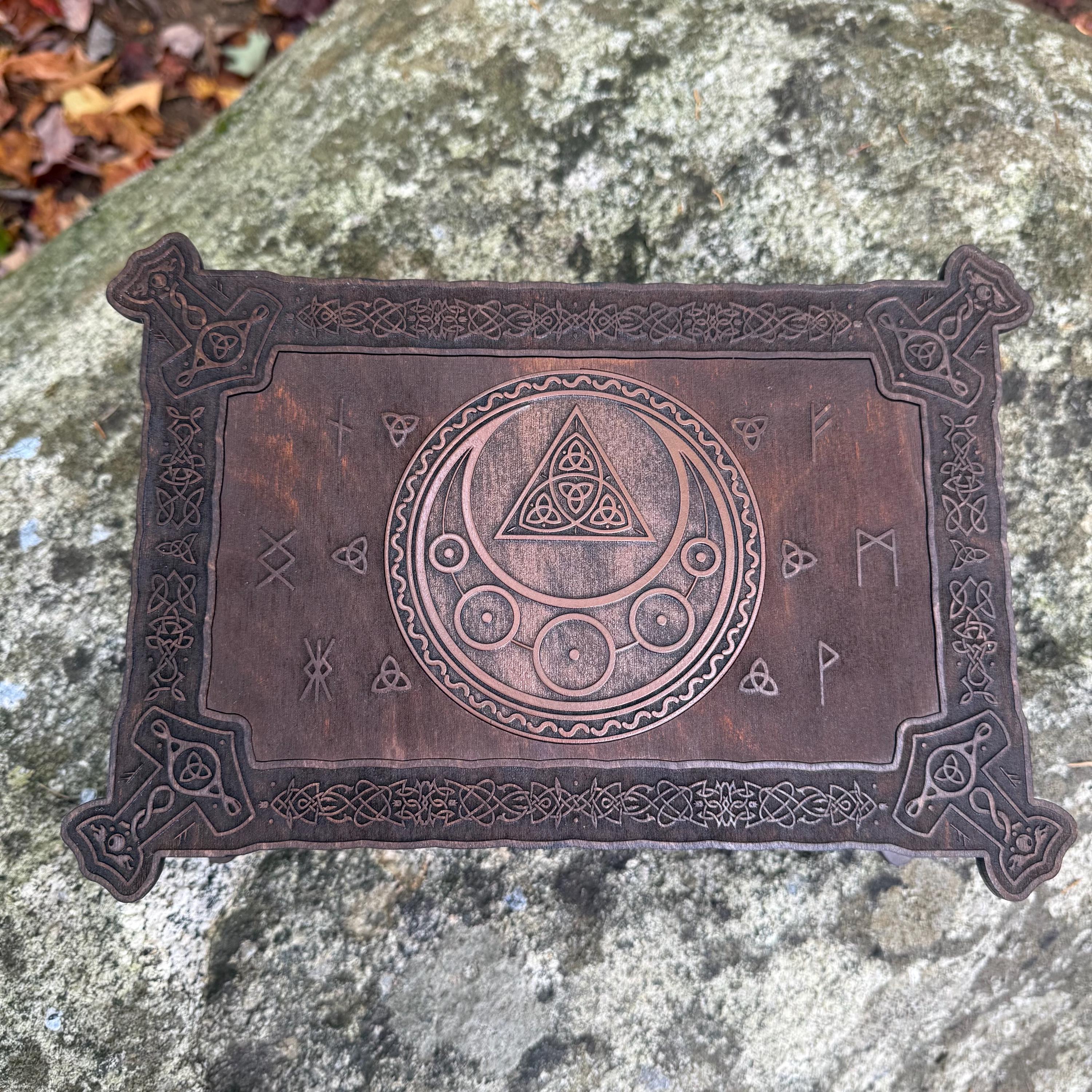 This incredibly detailed wooden chest, "Mystic Musings", is the perfect jewelry box for those interested in mystical and Celtic/Gaelic/Nordic themes. Handcrafted from birch plywood, with high resolution laser-engraved artwork and a dual staining process for an extra level of detail, this chest is very resilient and durable, with double layers that also lend greatly to its overall appearance. The box features a magnetized lid that is fully removable, as well as two nesting trays within for storage of different jewelry types. The nesting trays can be altered or eliminated to suit a customer's tastes and/or needs - please message me with your requirements should a different configuration be necessary. Whether they be literal or sentimental, this chest is sure to hold many valuables over the years.
