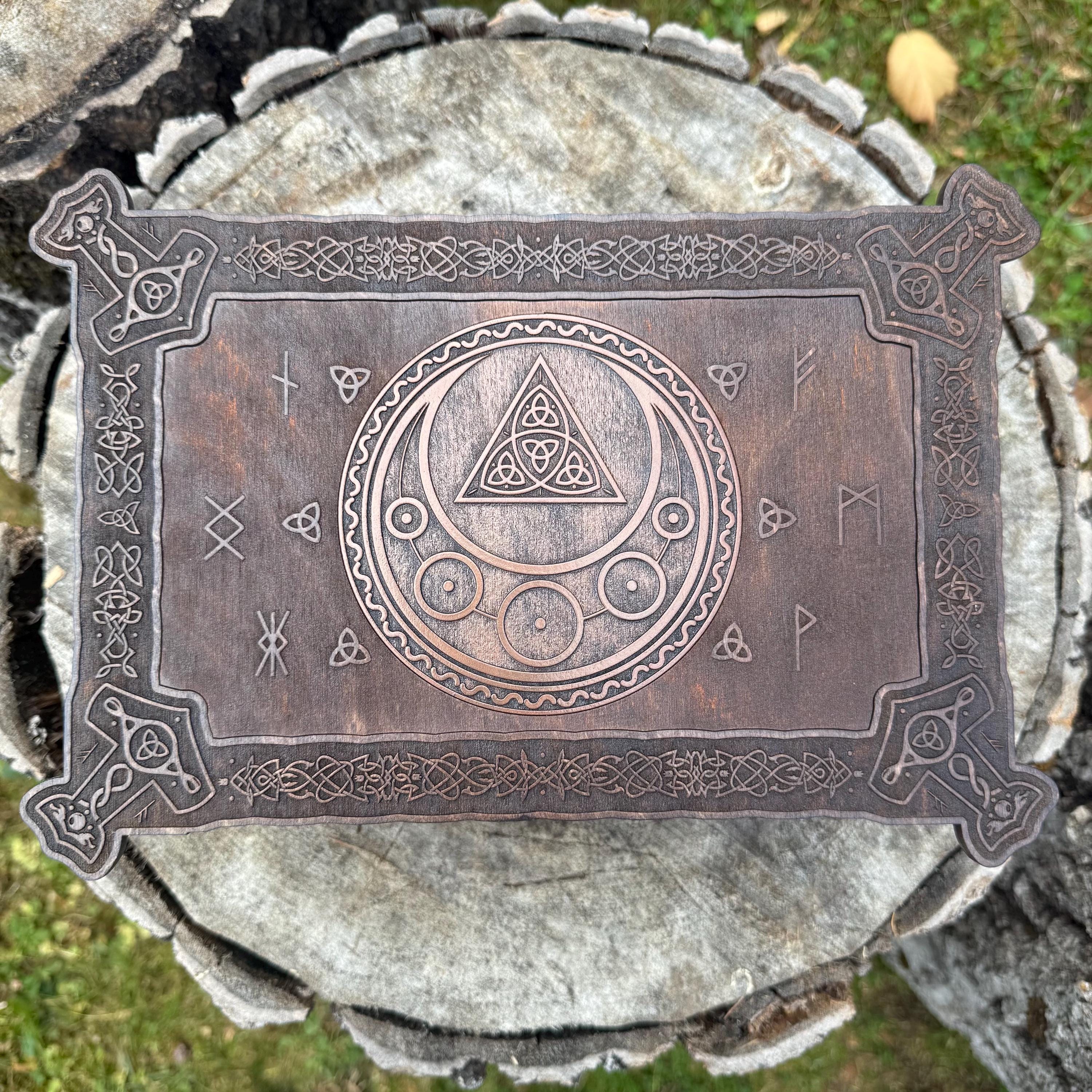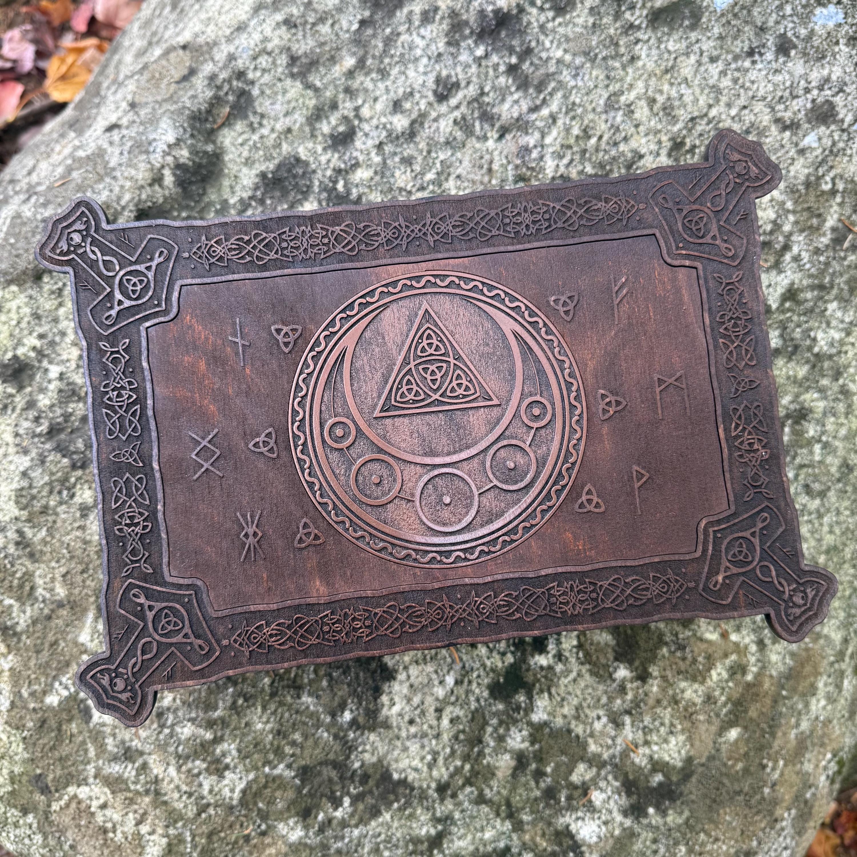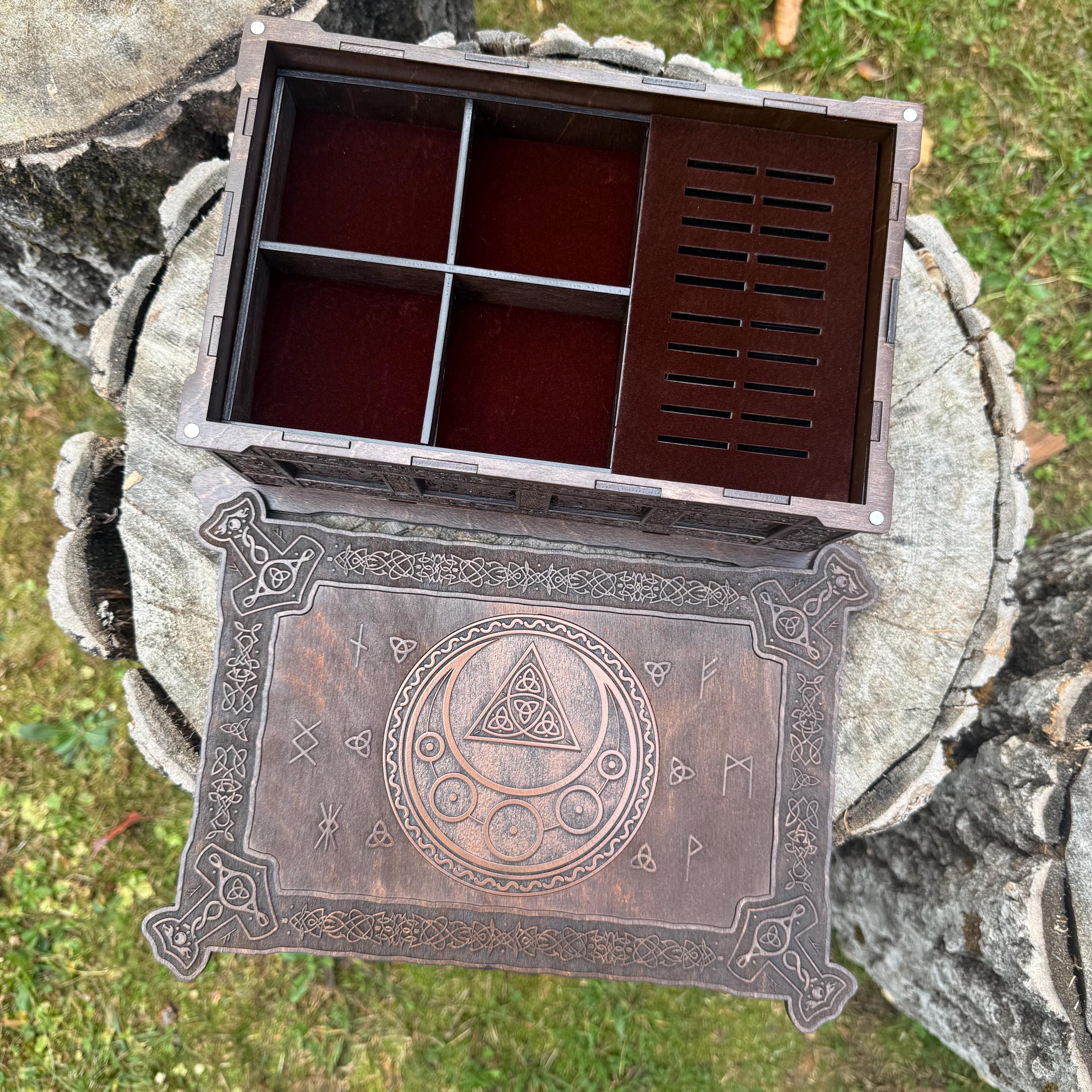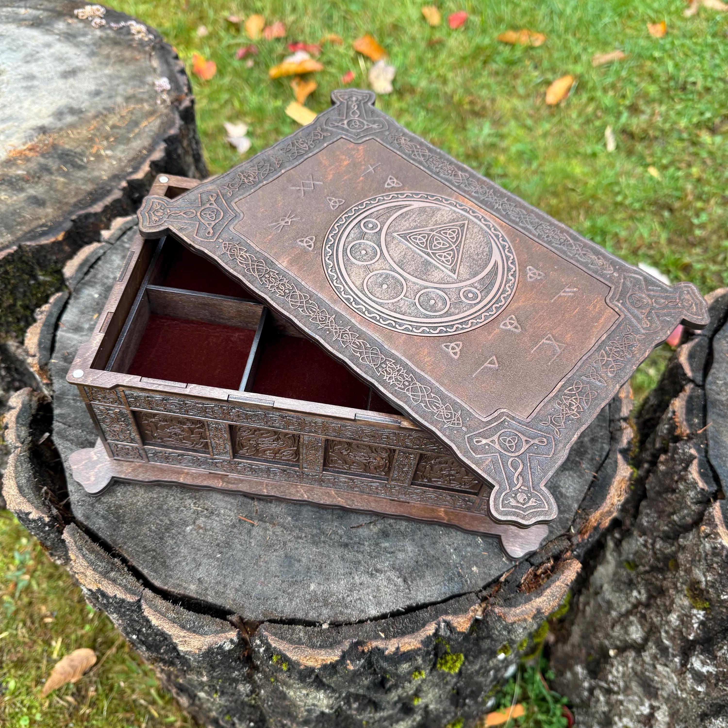 This incredibly detailed wooden chest, "Mystic Musings", is the perfect jewelry box for those interested in mystical and Celtic/Gaelic/Nordic themes. Handcrafted from birch plywood, with high resolution laser-engraved artwork and a dual staining process for an extra level of detail, this chest is very resilient and durable, with double layers that also lend greatly to its overall appearance. The box features a magnetized lid that is fully removable, as well as two nesting trays within for storage of different jewelry types. The nesting trays can be altered or eliminated to suit a customer's tastes and/or needs - please message me with your requirements should a different configuration be necessary. Whether they be literal or sentimental, this chest is sure to hold many valuables over the years.