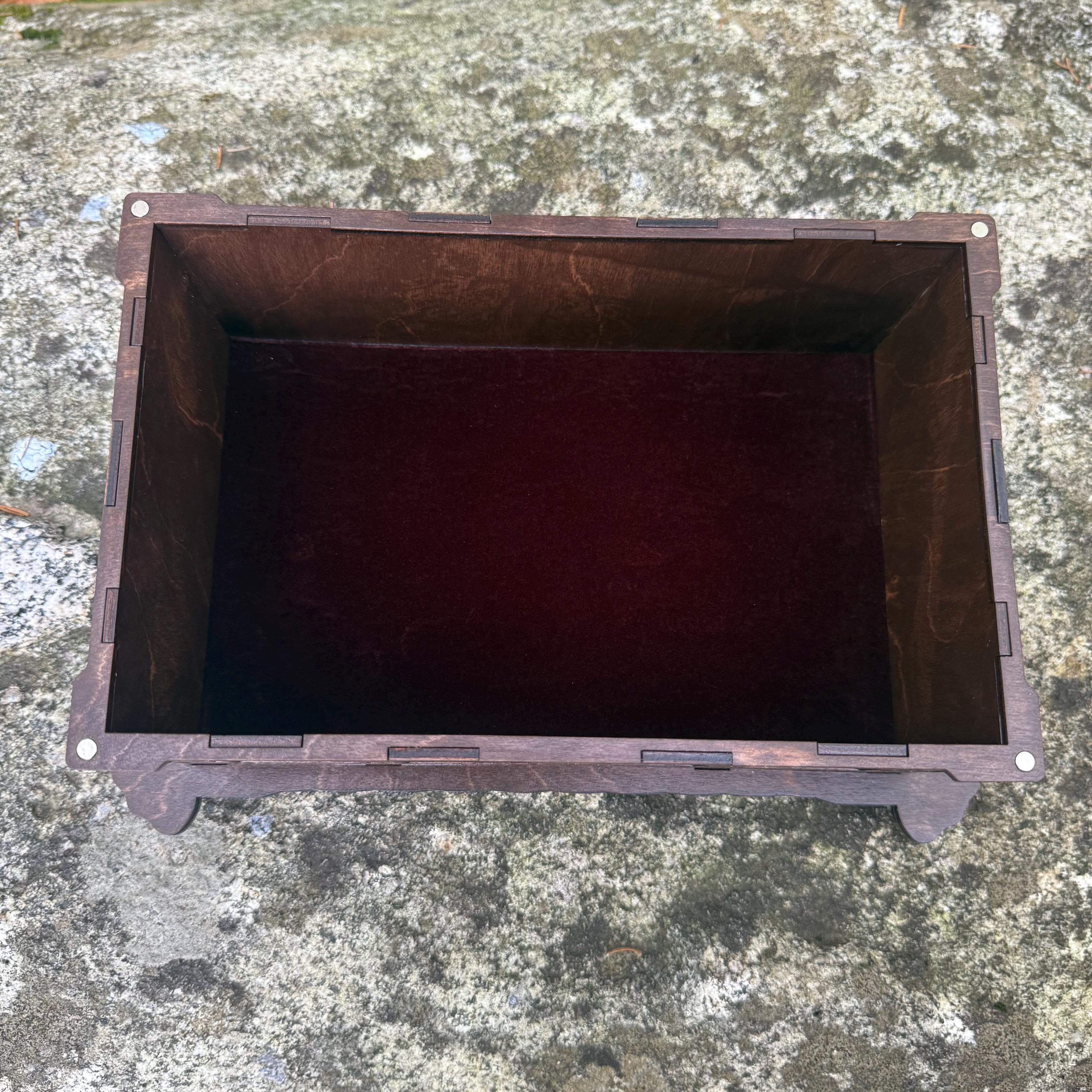 💥 The sample chest featured in the Photos has Dark Oak inset panels with Walnut frames, as well as a Bronze lid inlay and Deep Brown velvet interior.