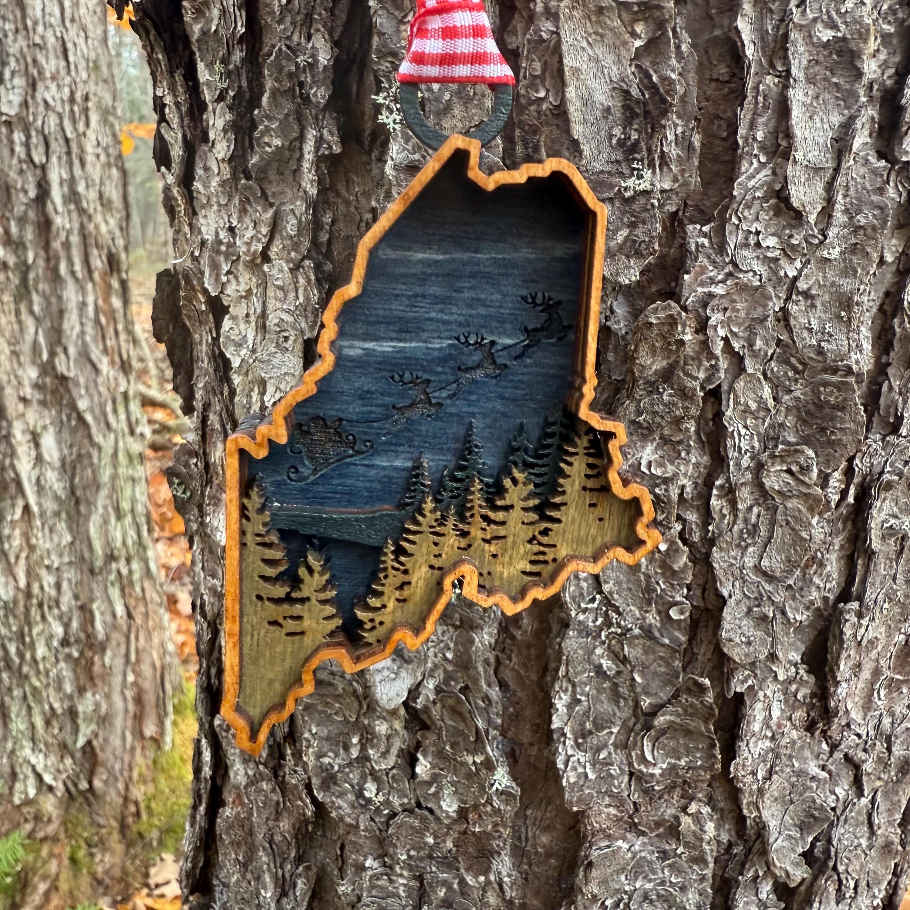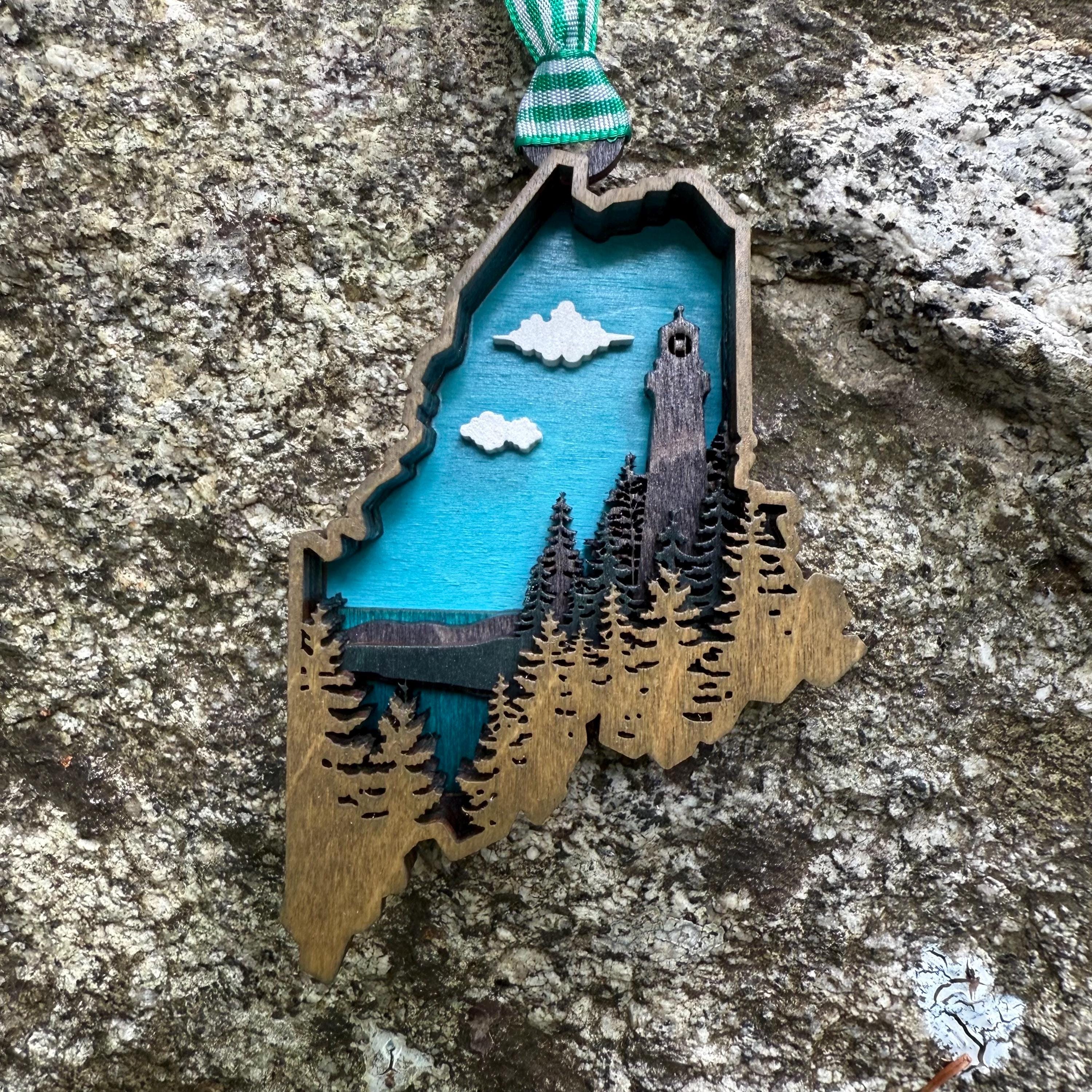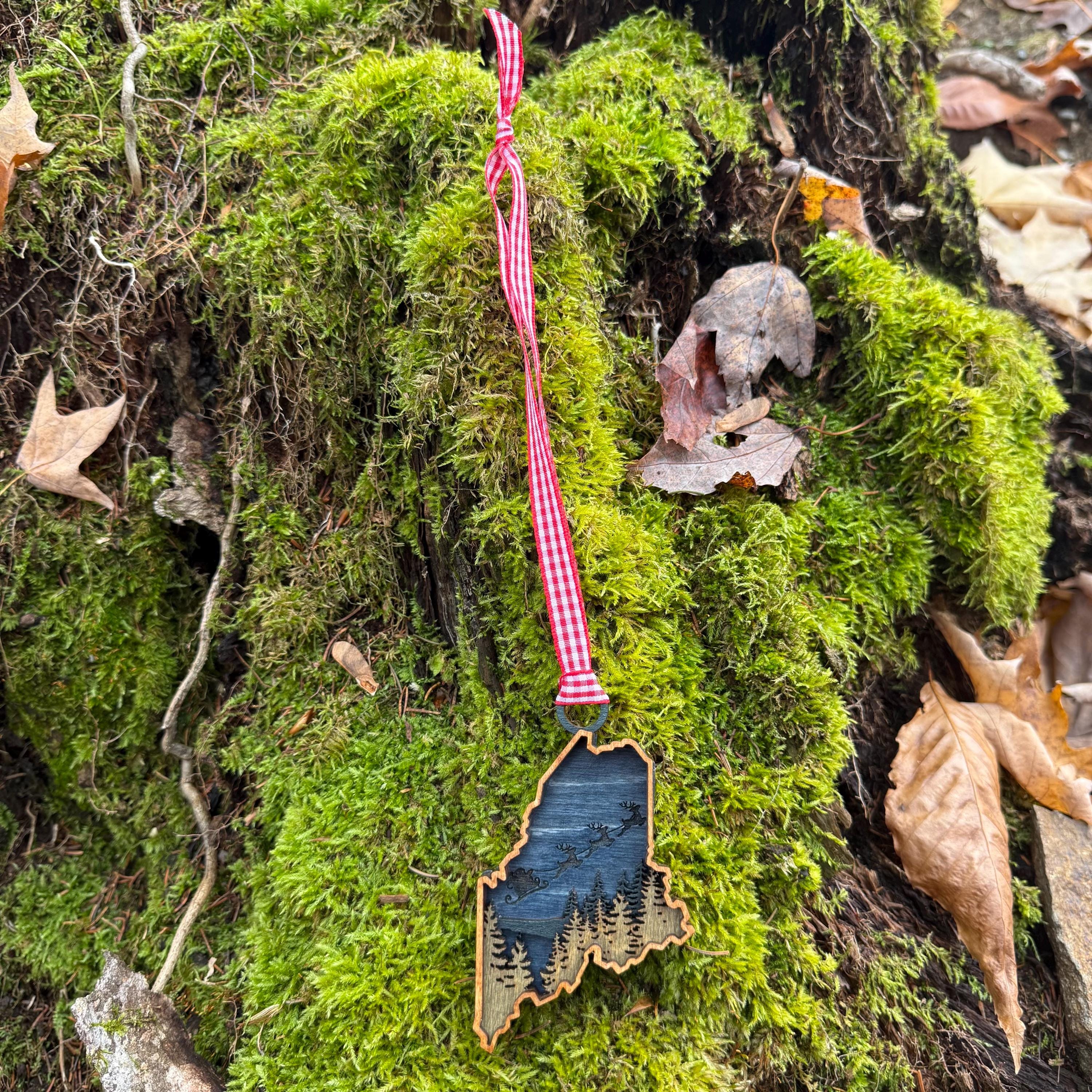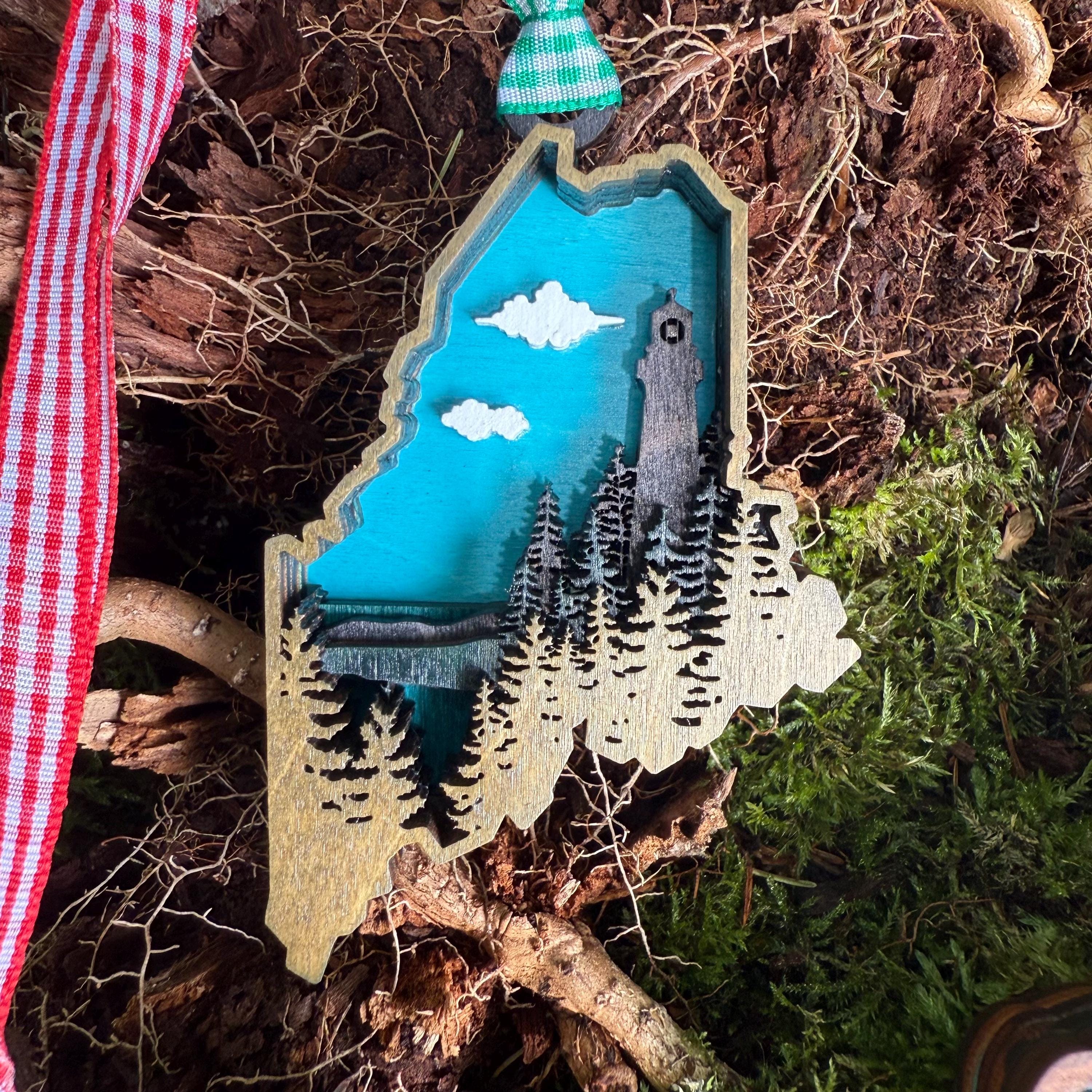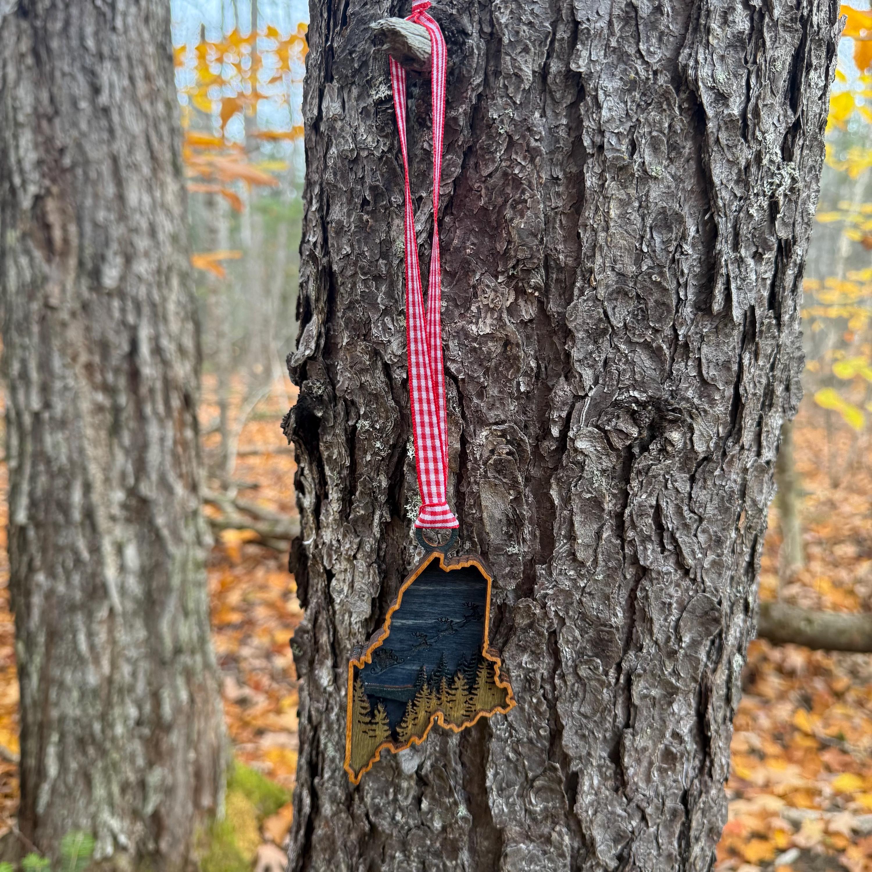 Add a bit of New England and Maine to your holiday decor with one of these handcrafted wooden ornaments! Created from 5-6 stacked layers of precisely cut and stained birch plywood, these rustically-styled ornaments are colorful and captivating, with checkered ribbon lanyards to complete the festive holiday look. Each and every ornament varies in some small detail from the next, making each one unique! Handcrafted in DownEast Maine - limited quantities available!