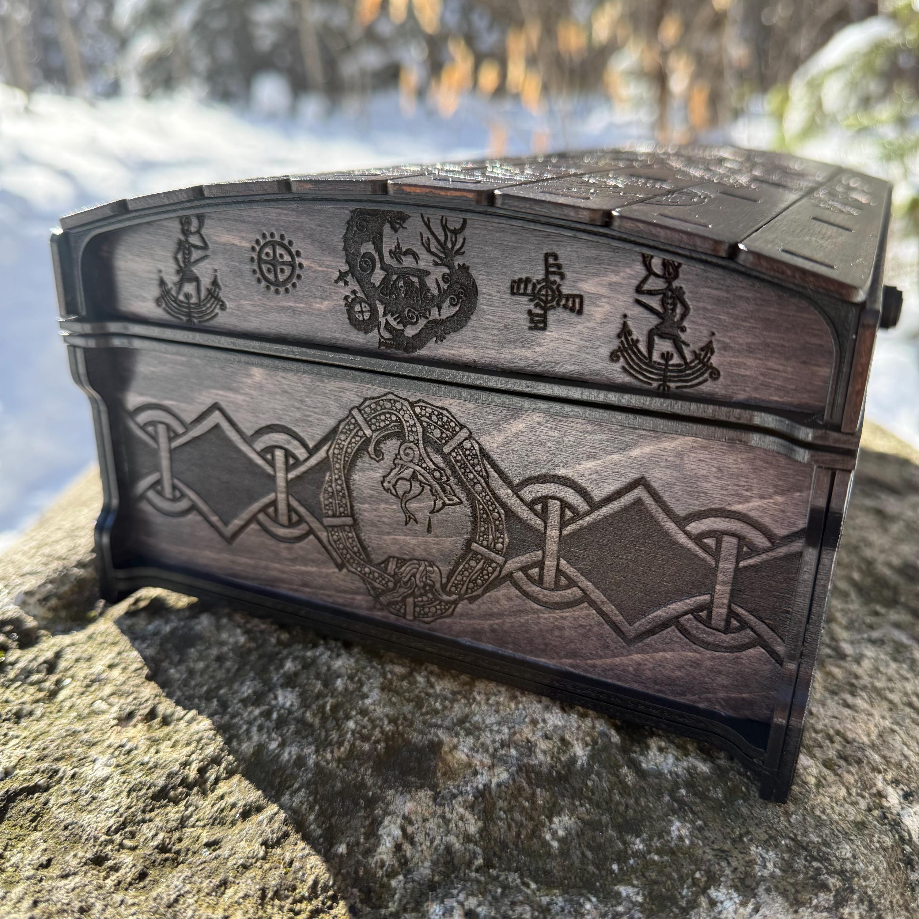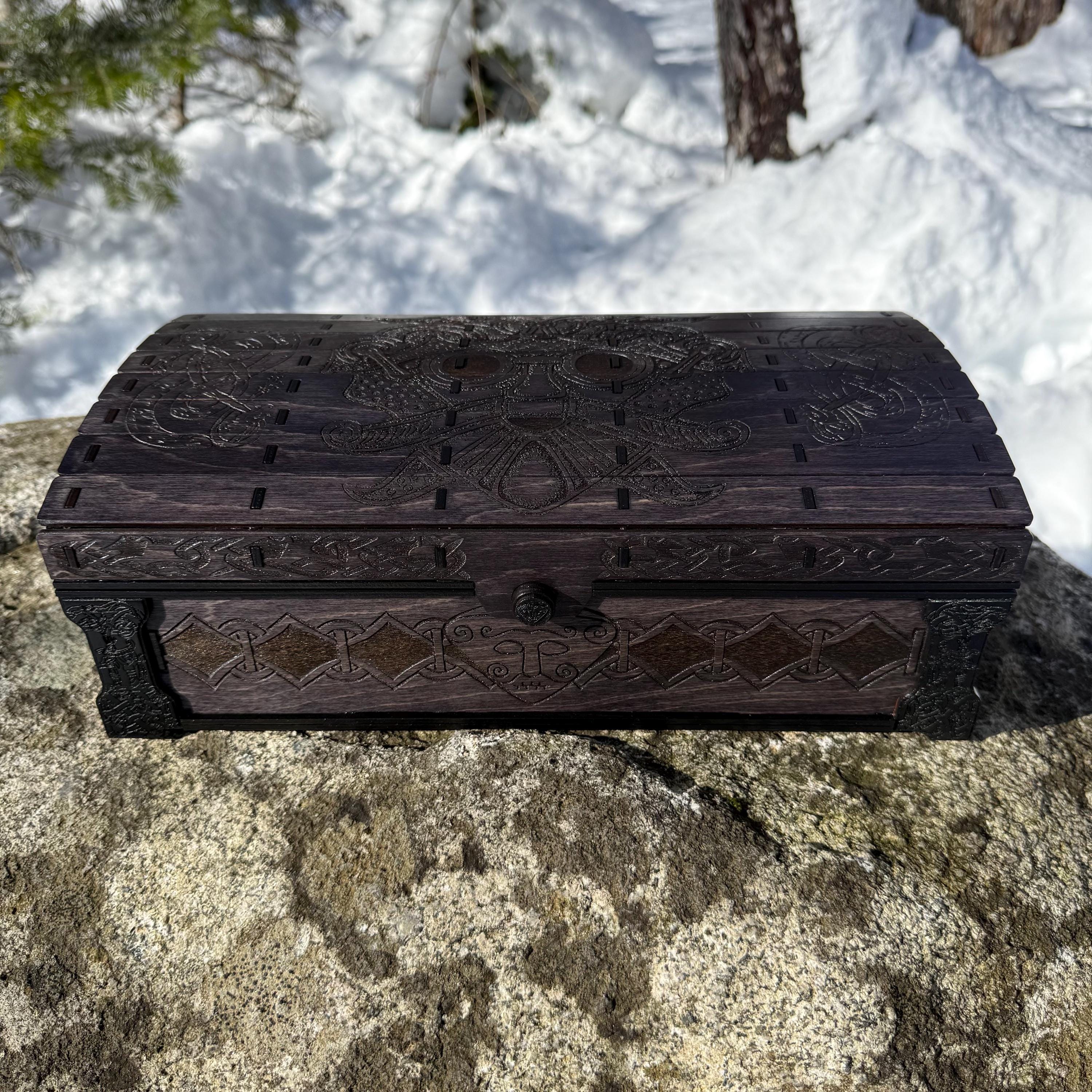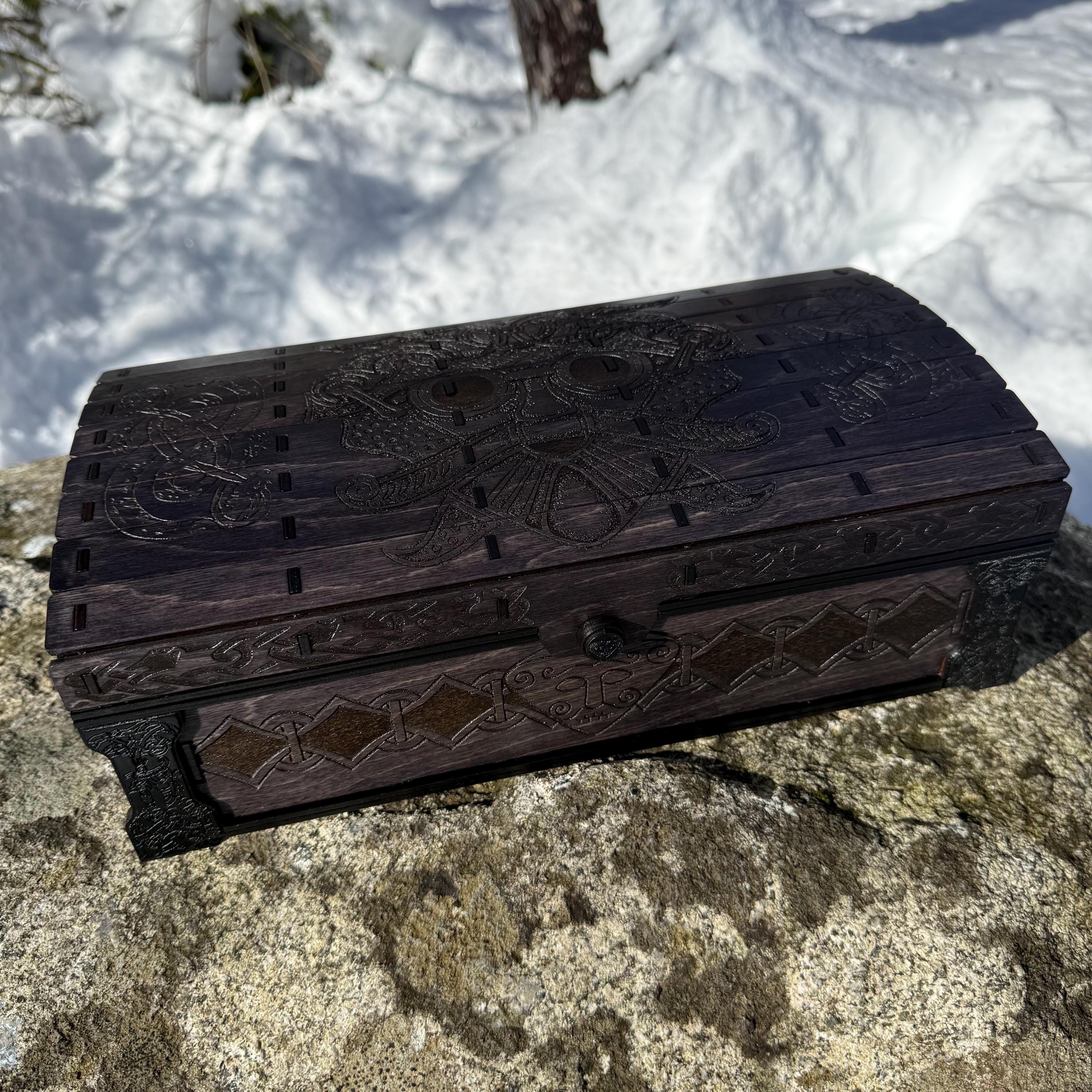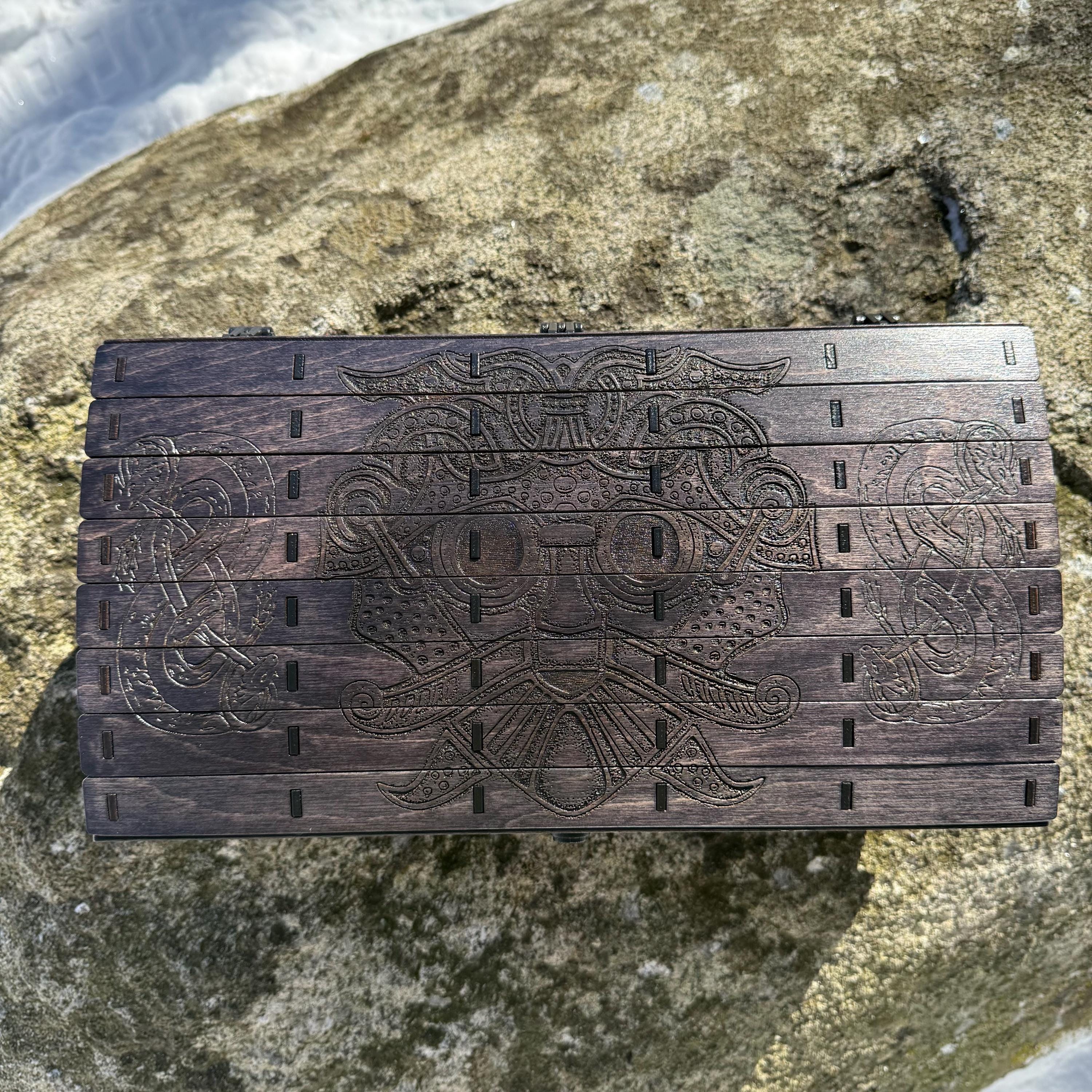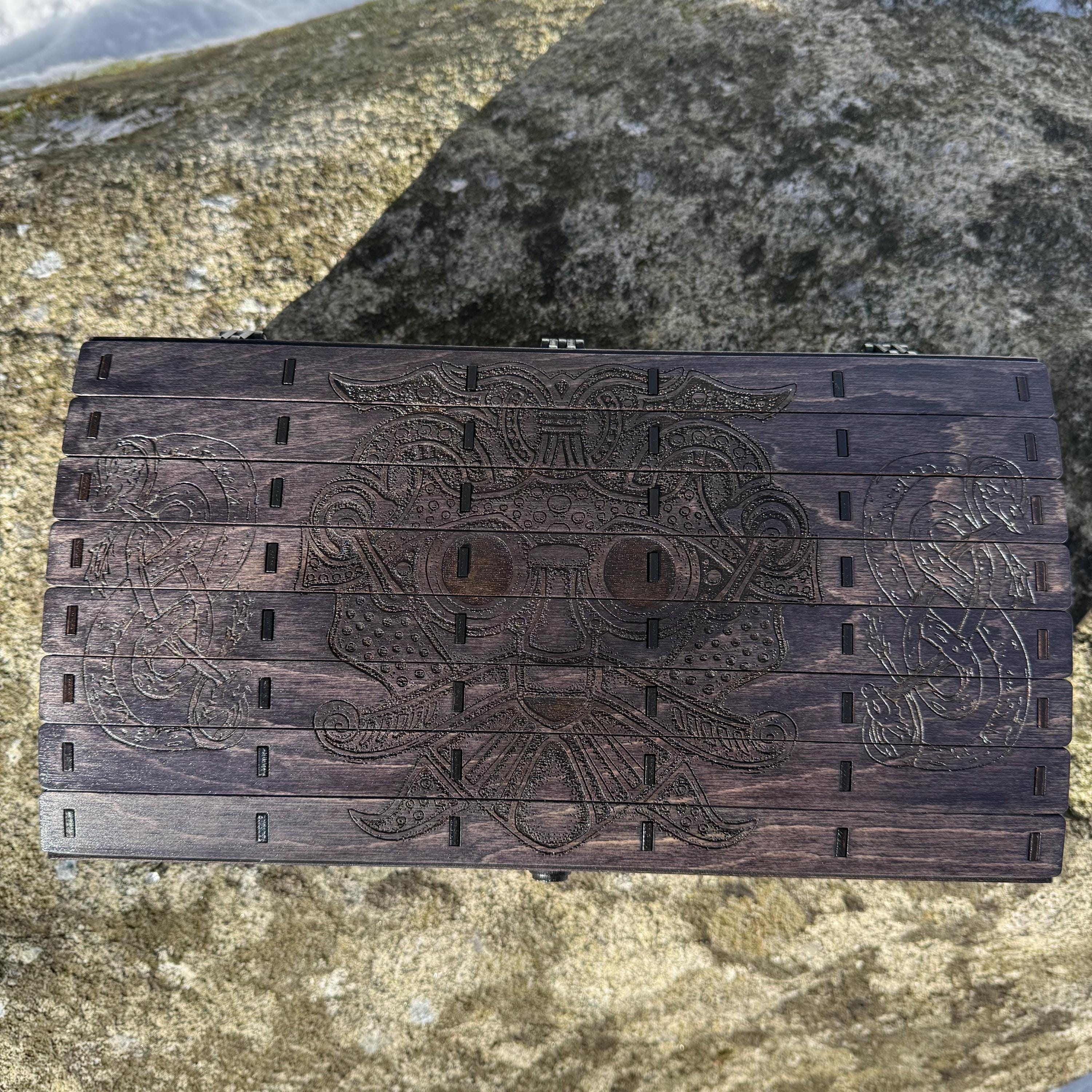 This chest-style box with Nordic design elements representing Loki the Trickster is perfect as a keepsake box, gaming component case, or any other function a small treasure chest could fulfill. Created from 1/8-inch birch plywood, with high resolution laser engraved artwork and a dual staining process for an extra level of detail. Due to the manner of its construction, this chest is very resilient and durable, with double layers at important structural points and bracing that also lends greatly to its appearance. The chest also features a velvet-lined interior and magnets which keep the lid securely closed. This chest is constructed to last many generations and hold many valuables, whether literal or sentimental, over the years.