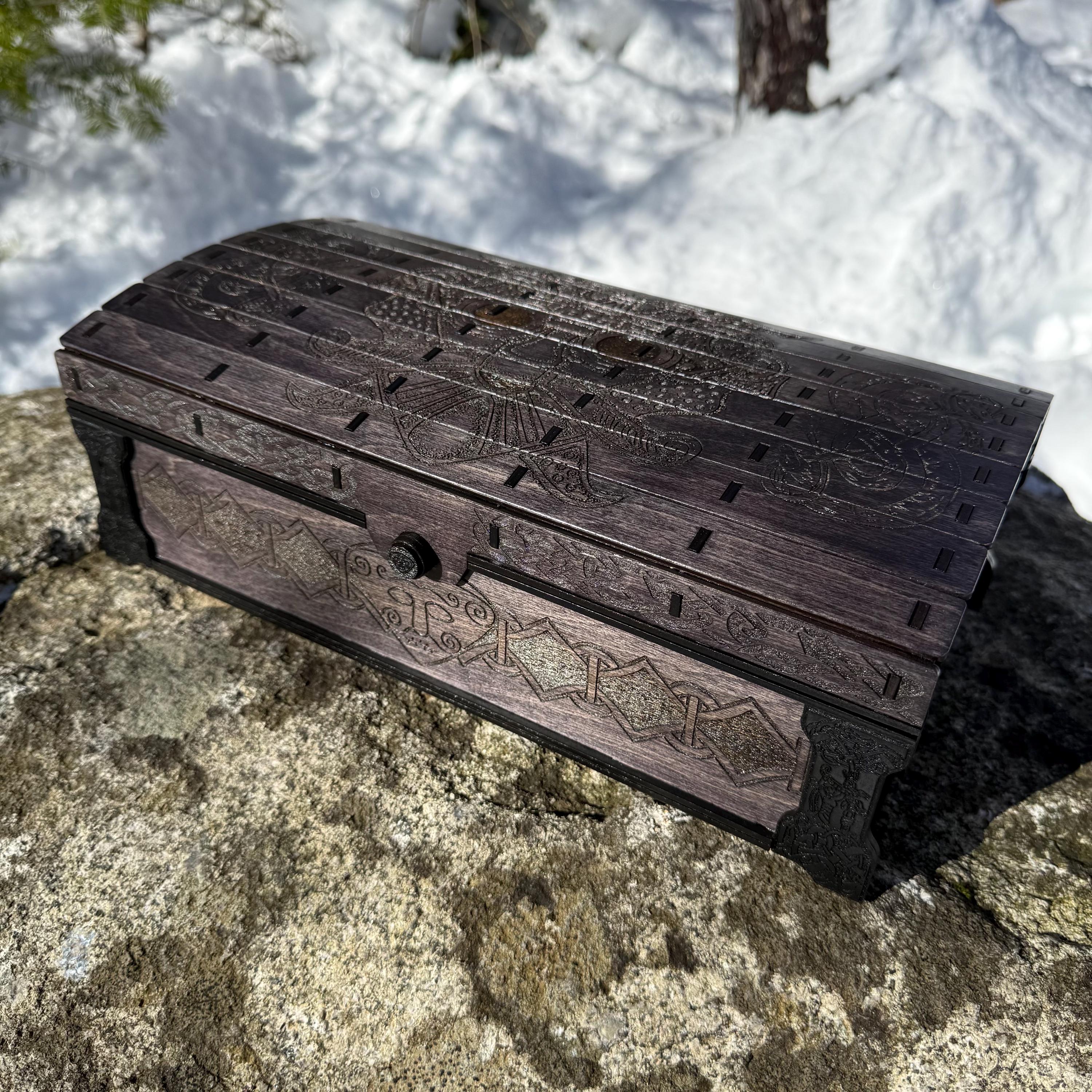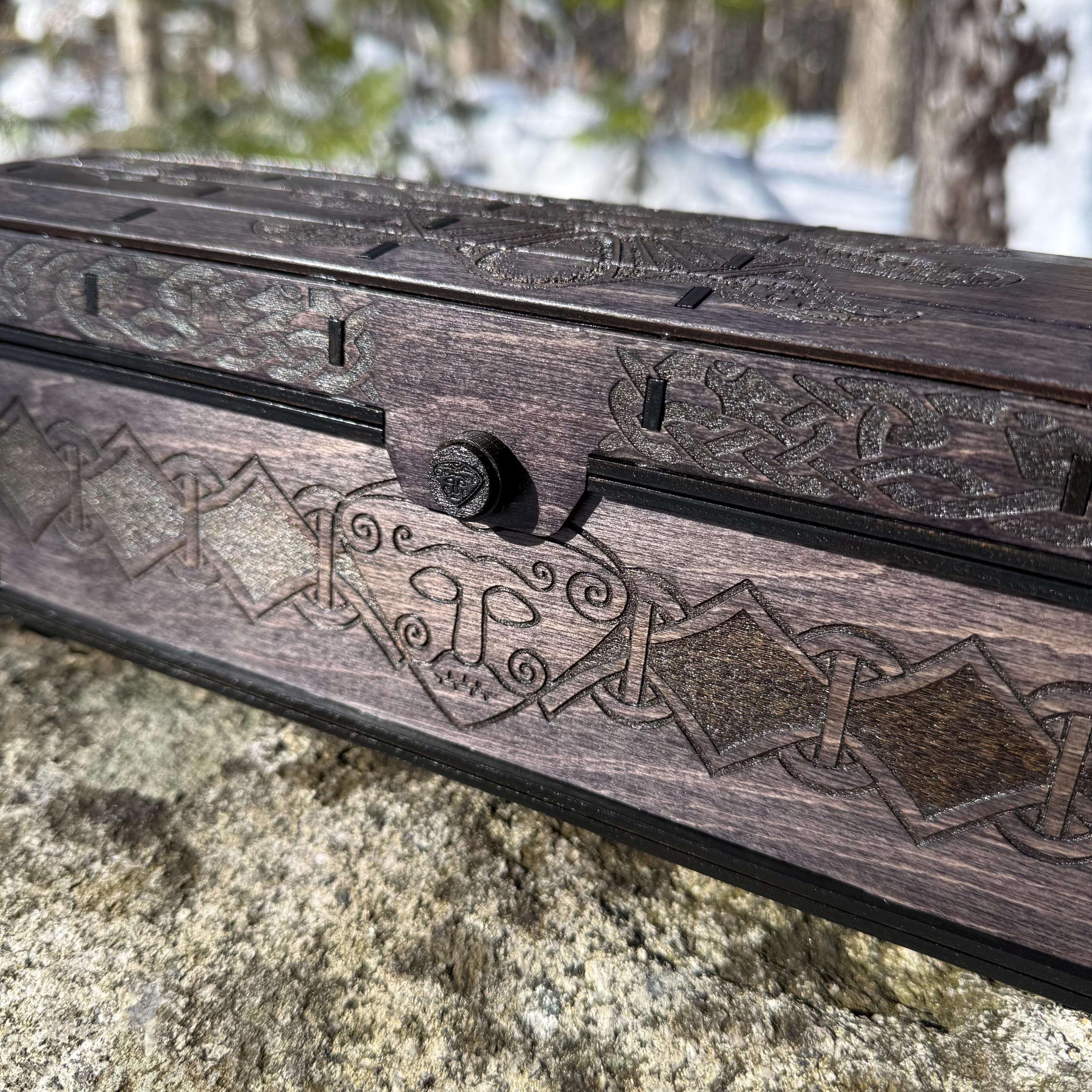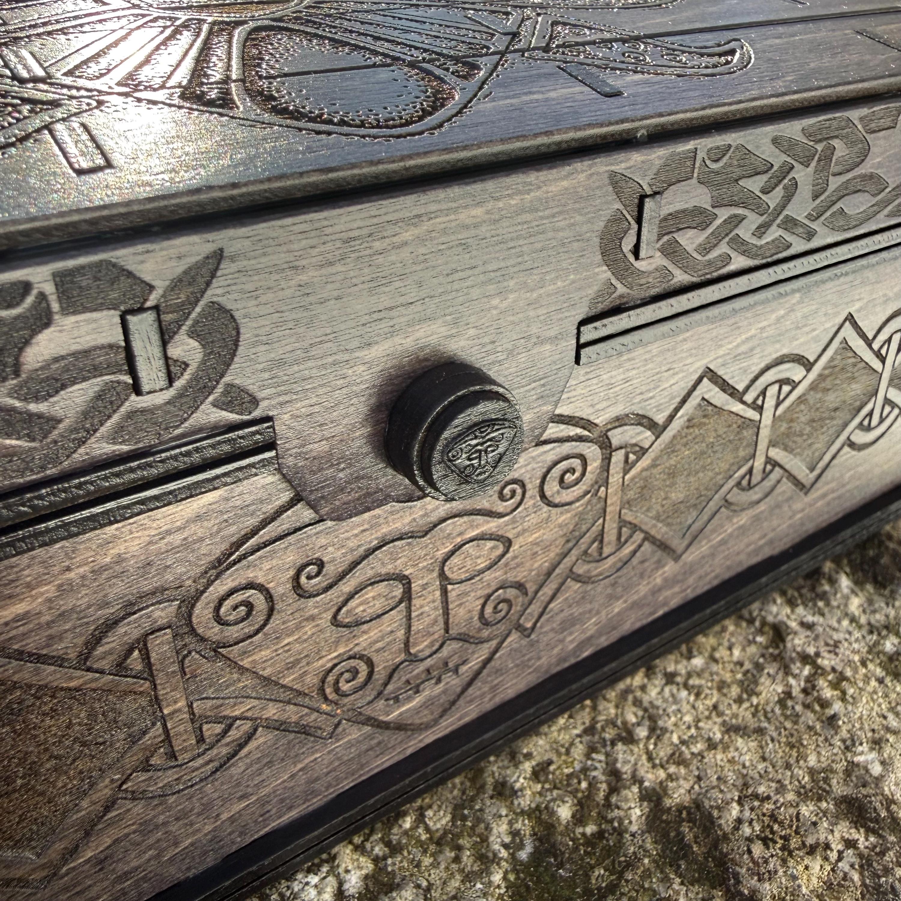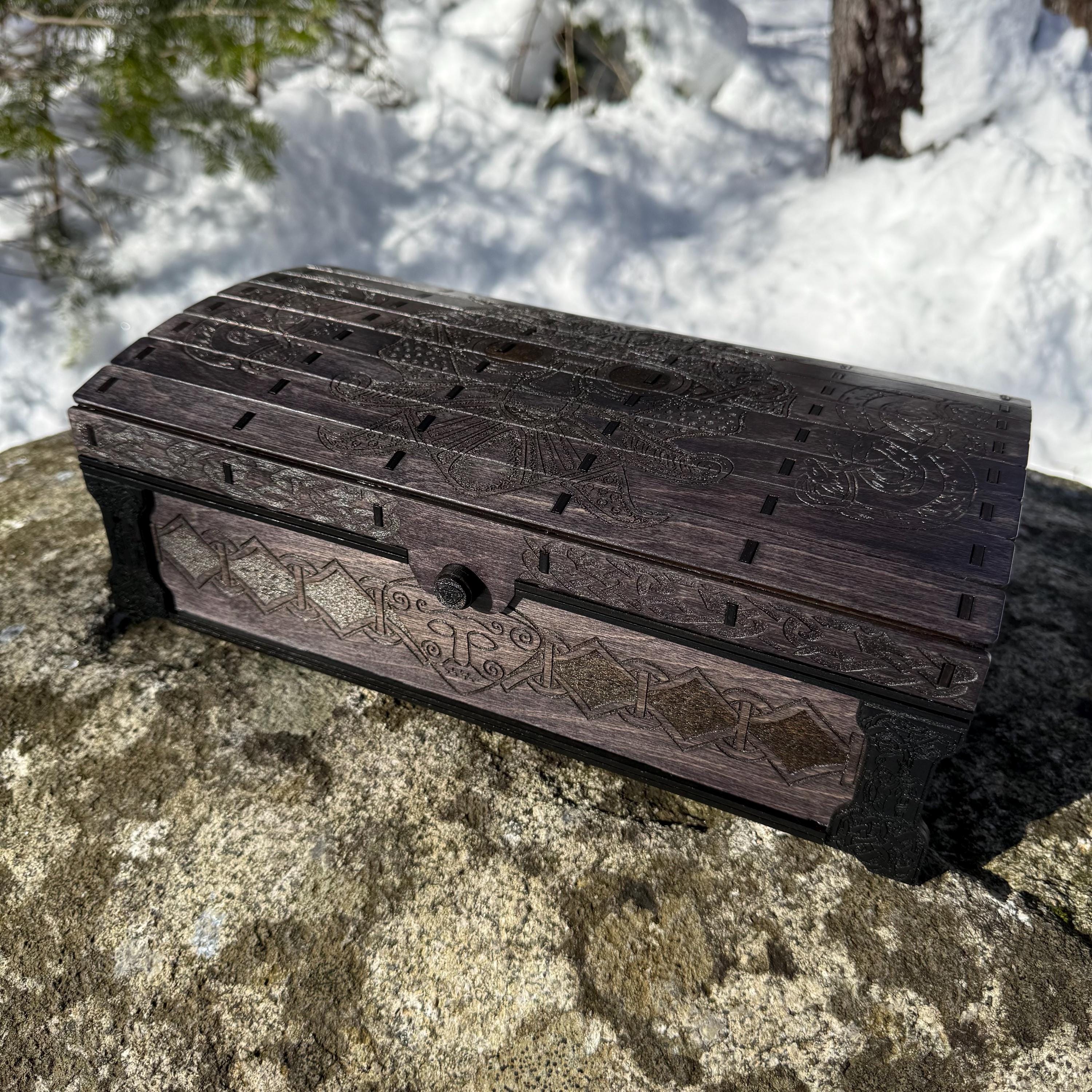 This chest-style box with Nordic design elements representing Loki the Trickster is perfect as a keepsake box, gaming component case, or any other function a small treasure chest could fulfill. Created from 1/8-inch birch plywood, with high resolution laser engraved artwork and a dual staining process for an extra level of detail. Due to the manner of its construction, this chest is very resilient and durable, with double layers at important structural points and bracing that also lends greatly to its appearance. The chest also features a velvet-lined interior and magnets which keep the lid securely closed. This chest is constructed to last many generations and hold many valuables, whether literal or sentimental, over the years.