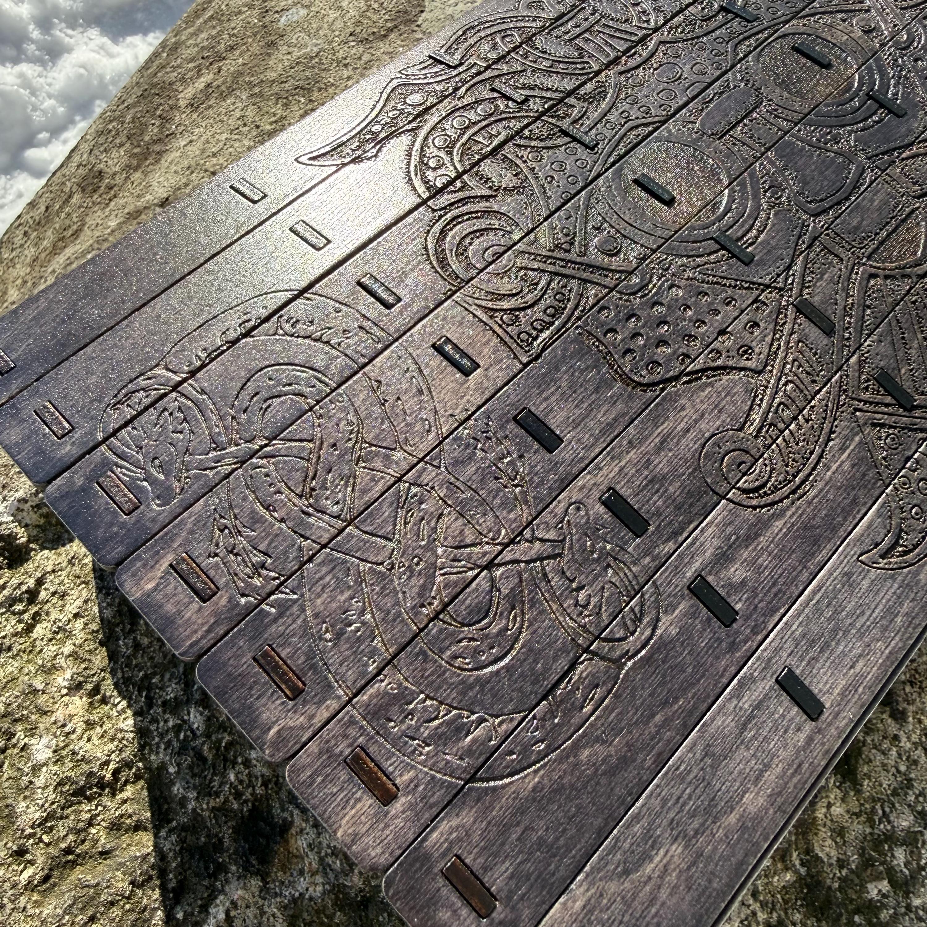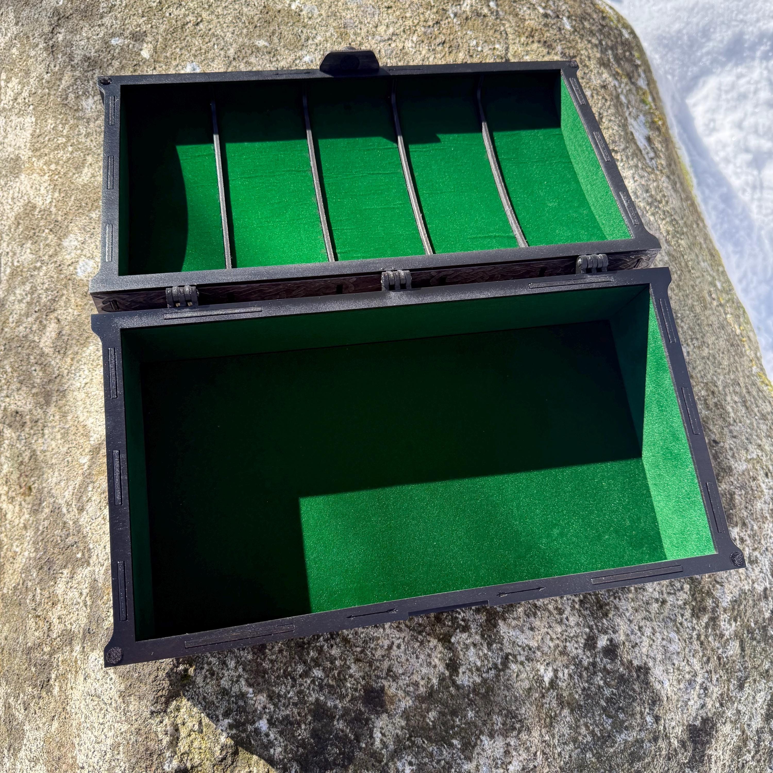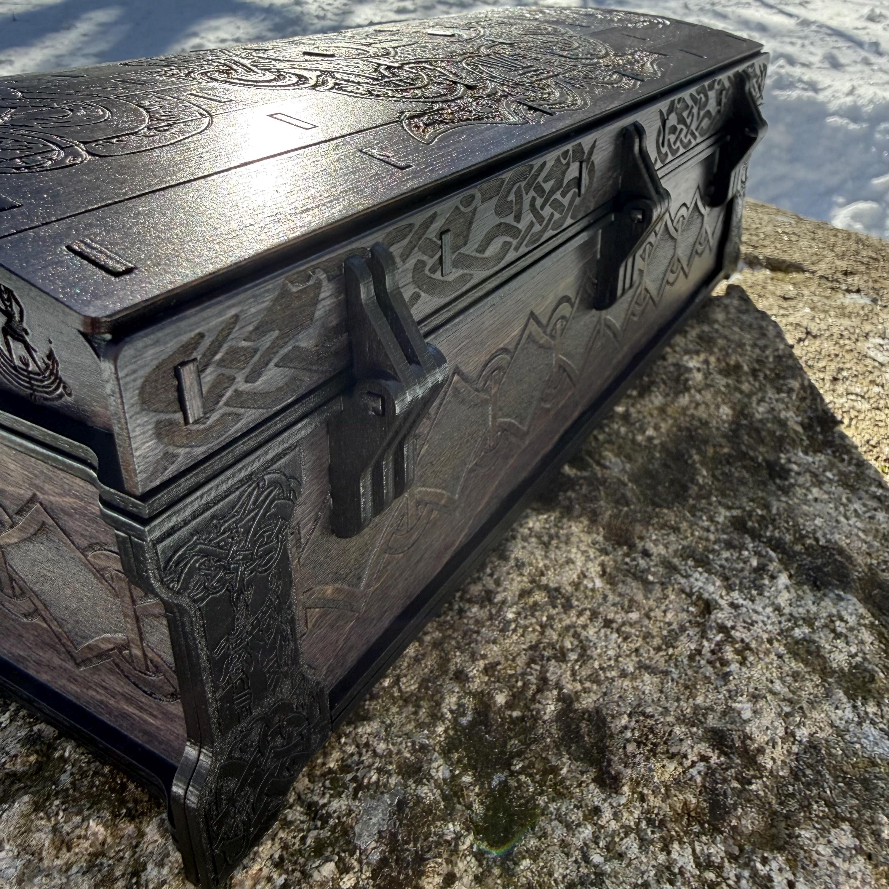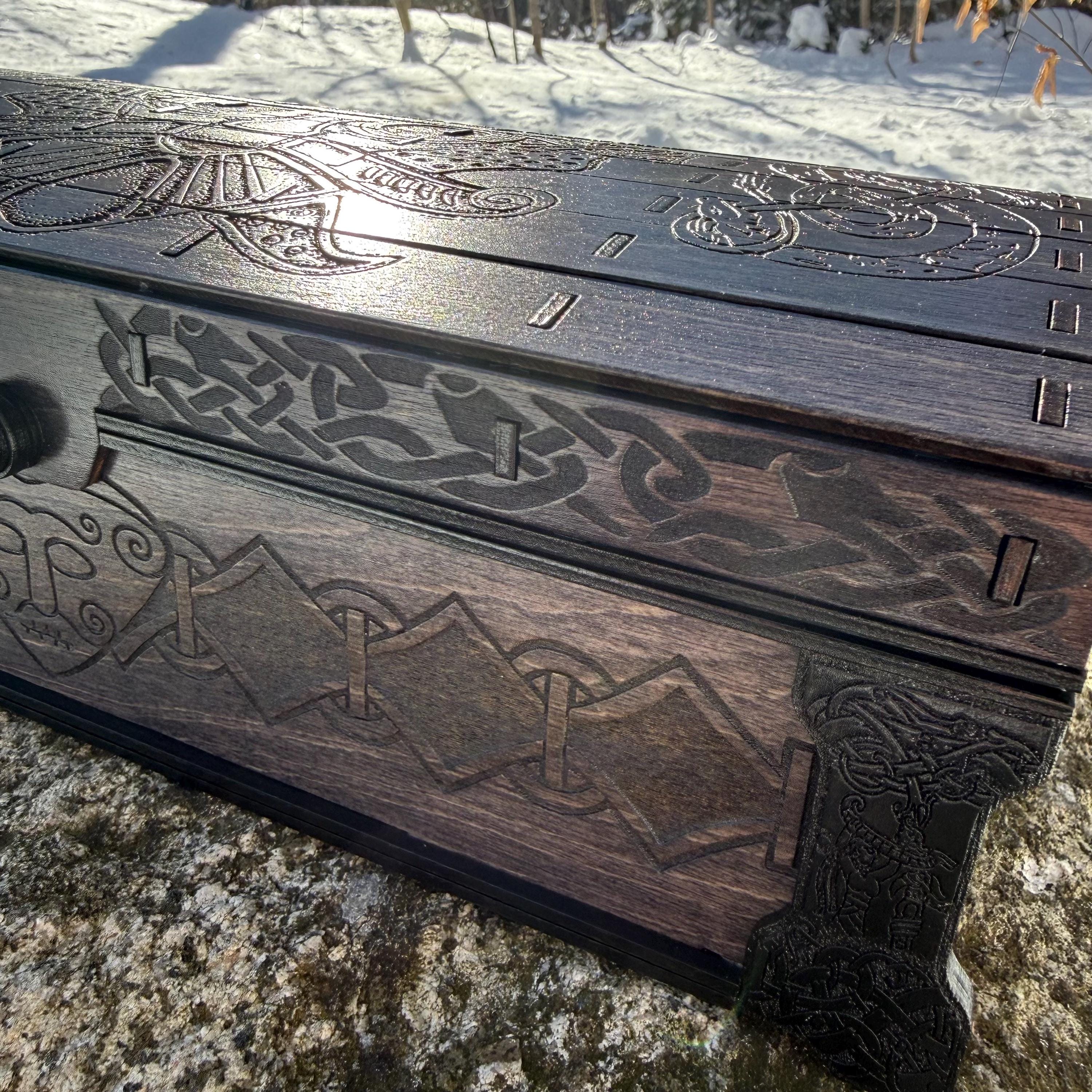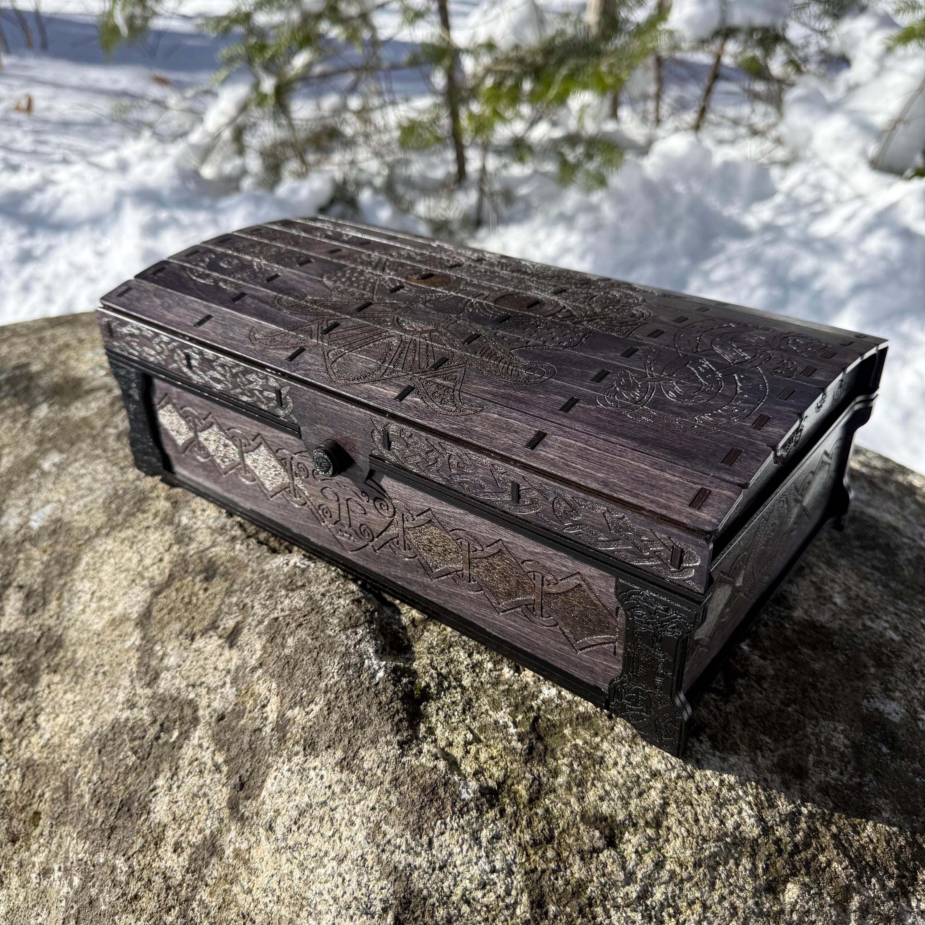 This chest-style box with Nordic design elements representing Loki the Trickster is perfect as a keepsake box, gaming component case, or any other function a small treasure chest could fulfill. Created from 1/8-inch birch plywood, with high resolution laser engraved artwork and a dual staining process for an extra level of detail. Due to the manner of its construction, this chest is very resilient and durable, with double layers at important structural points and bracing that also lends greatly to its appearance. The chest also features a velvet-lined interior and magnets which keep the lid securely closed. This chest is constructed to last many generations and hold many valuables, whether literal or sentimental, over the years.