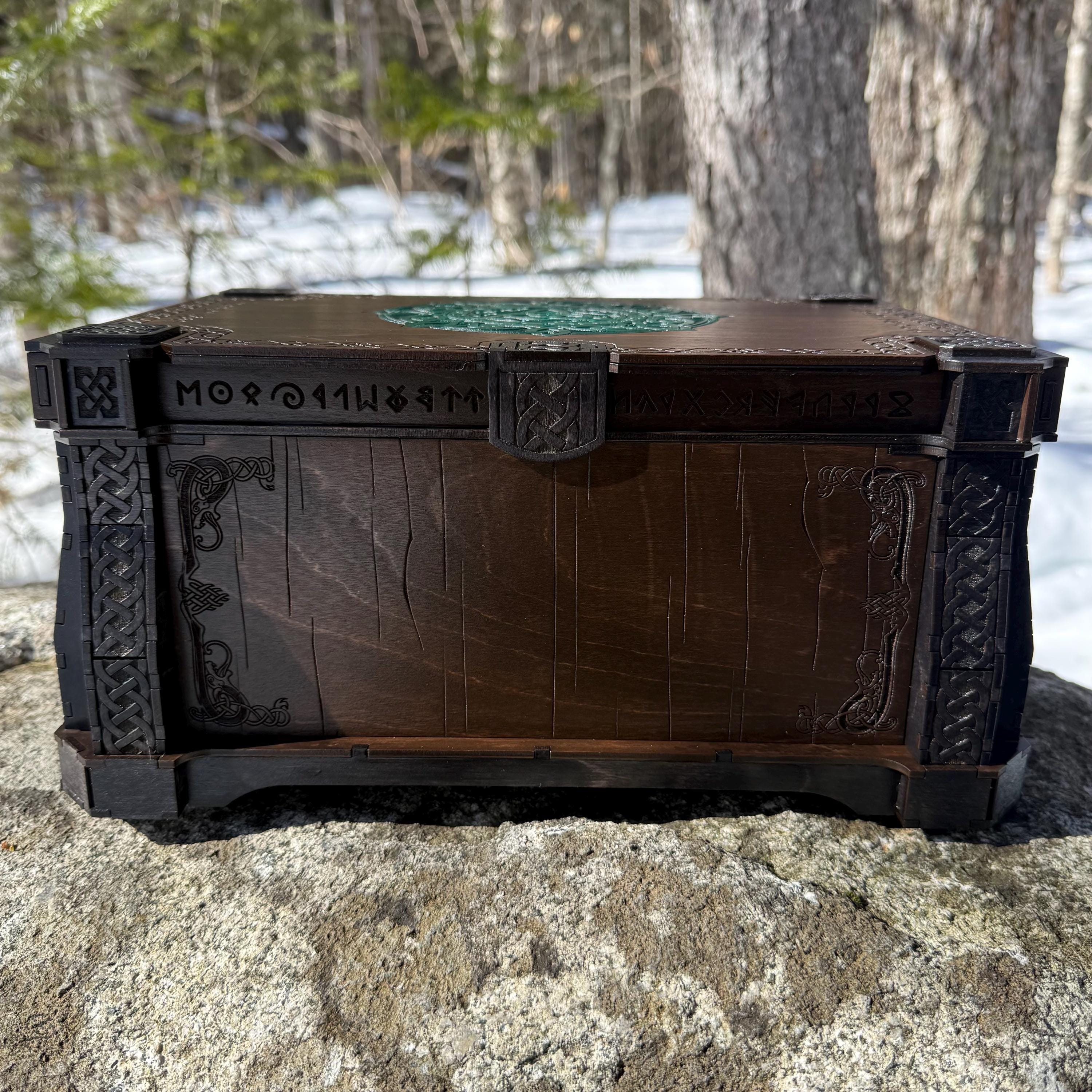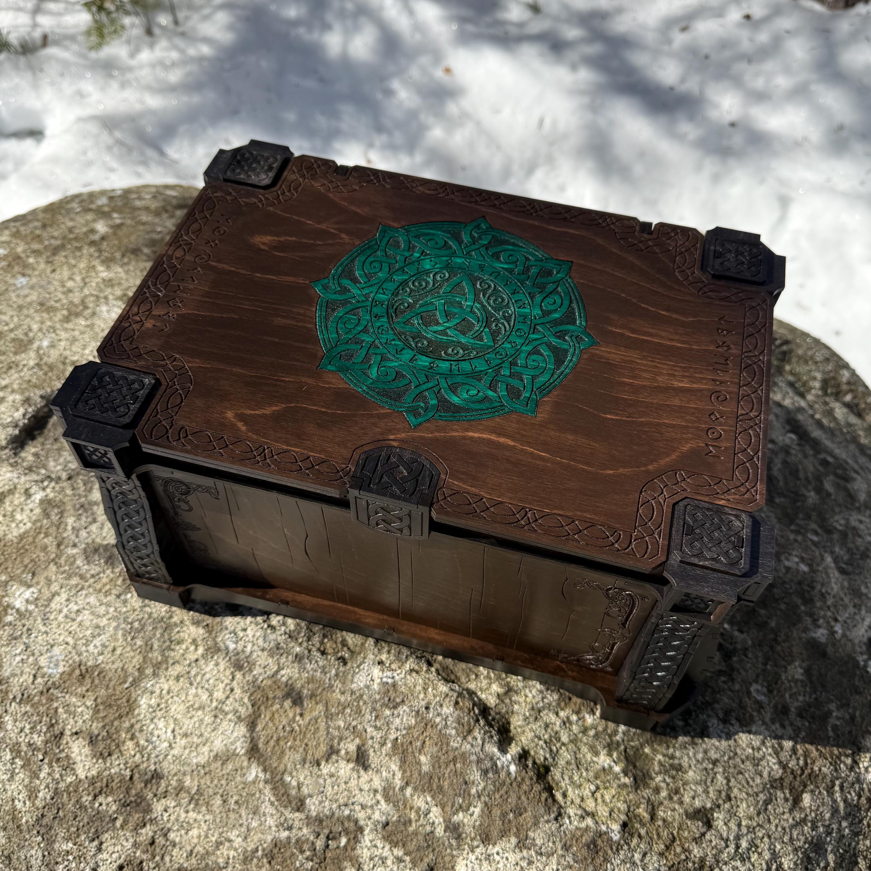This large wooden chest or desktop trunk boasts a spacious, velvet-lined interior and a meticulously engraved exterior, sure to captivate the eye with its enchanting presence in any room. The "Glyphed Arcanum" trunk of holding is crafted from birch plywood and is ornamented by Celtic-themed knotwork paired with glyphs and runes, further enhanced by a dual staining process for intricate detail. The trunk's robust construction, featuring double layers at key structural points and decorative bracing, ensures exceptional resilience and durability. Customers can customize their order with options such as accent stain color for the lid emblem and corner knotwork, and mirrored acrylic for the interior lid (see "CUSTOMIZATIONS AVAILABLE" below). This trunk is built to last for generations, preserving your most treasured possessions, both literal and sentimental, for years to come.
