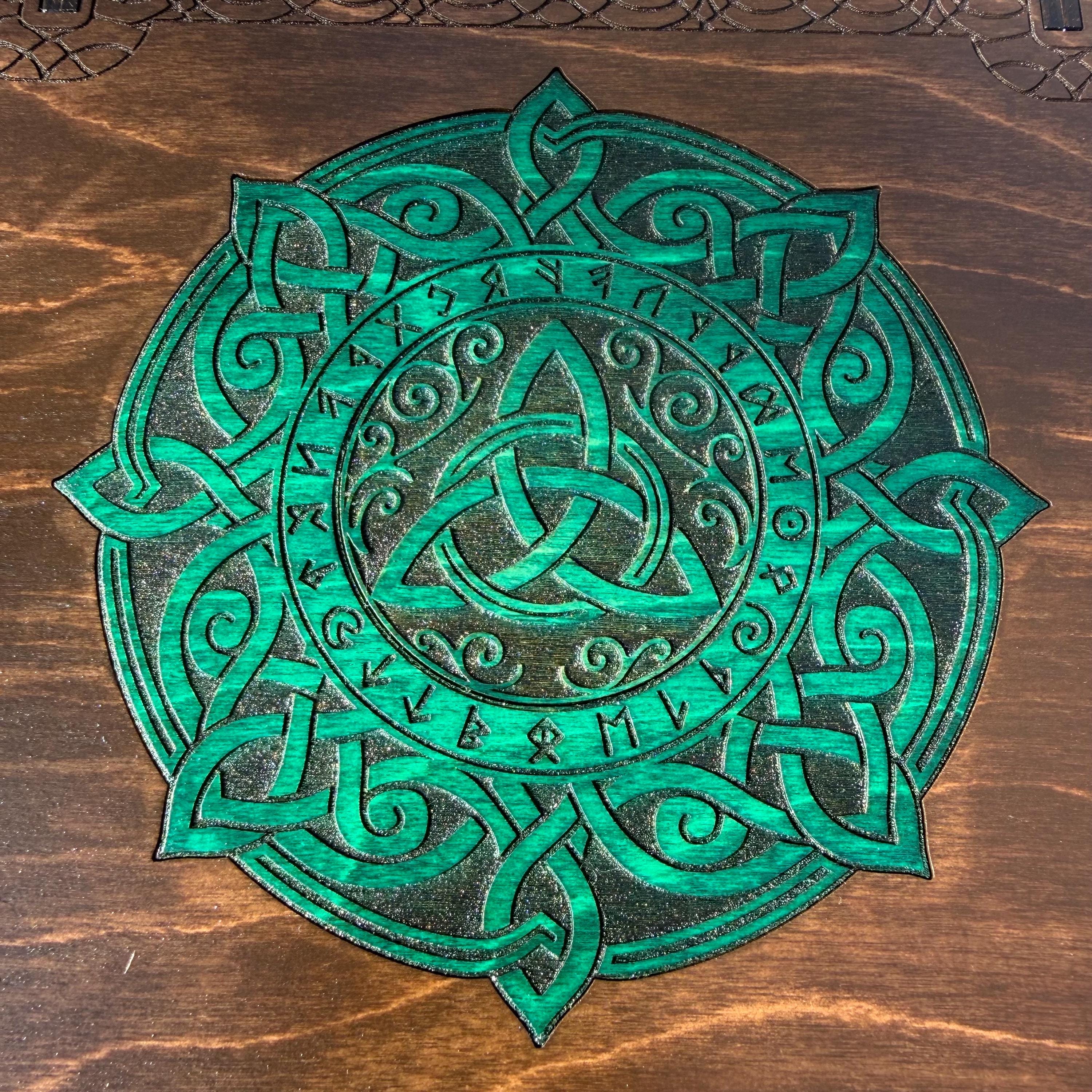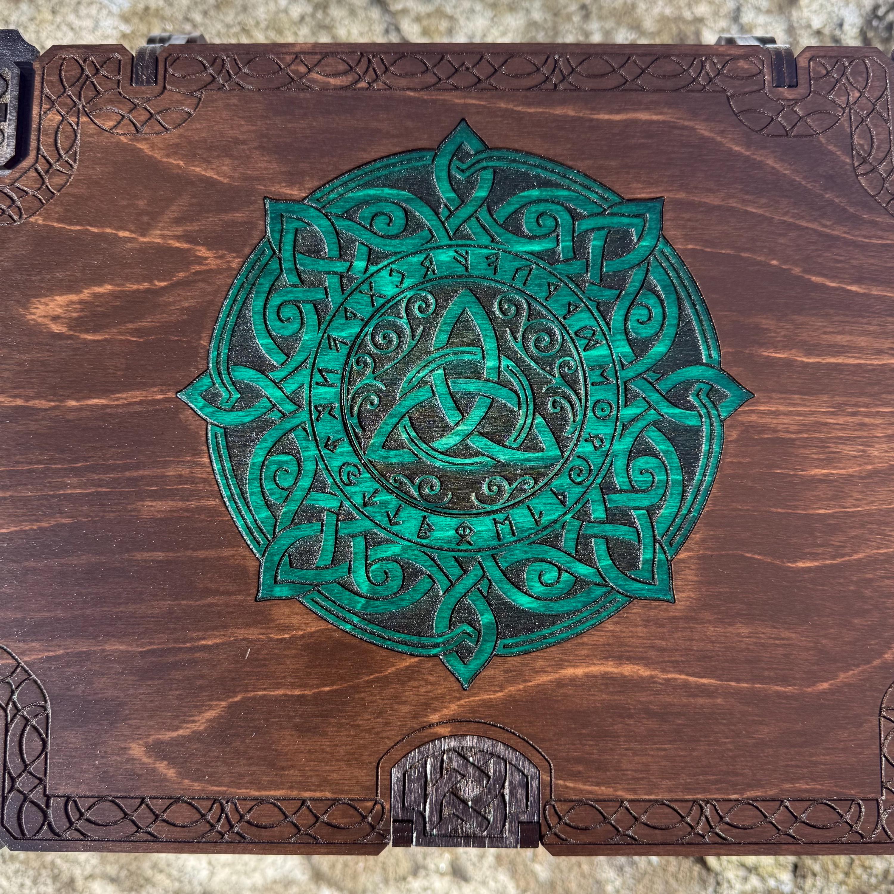 🧙♂️ Creator's Note - 03/06/26: In all future creations, the inlaid medallion on the lid will be engraved in greater detail than that depicted in several of the sample Photos, with engraved 'void' areas to make the knotwork designs more distinct, as shown in the Photos depicting the Emerald-stained medallion.