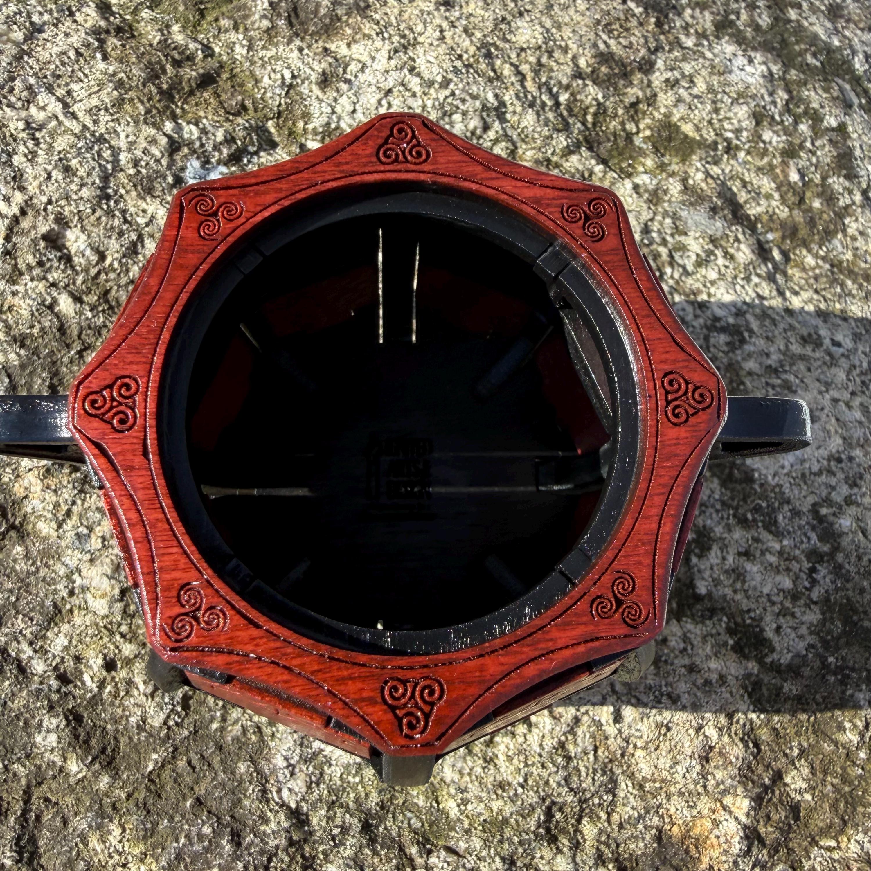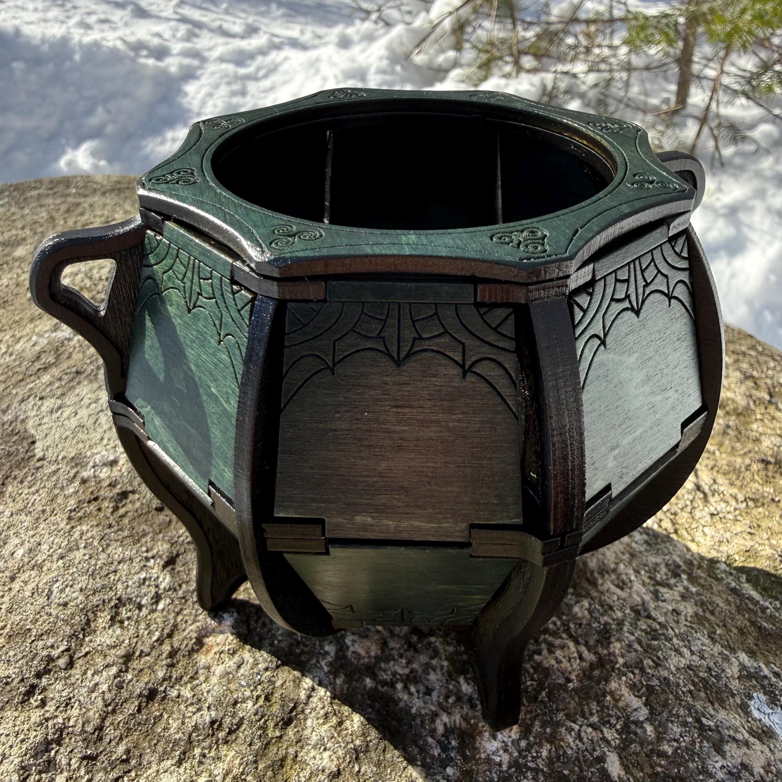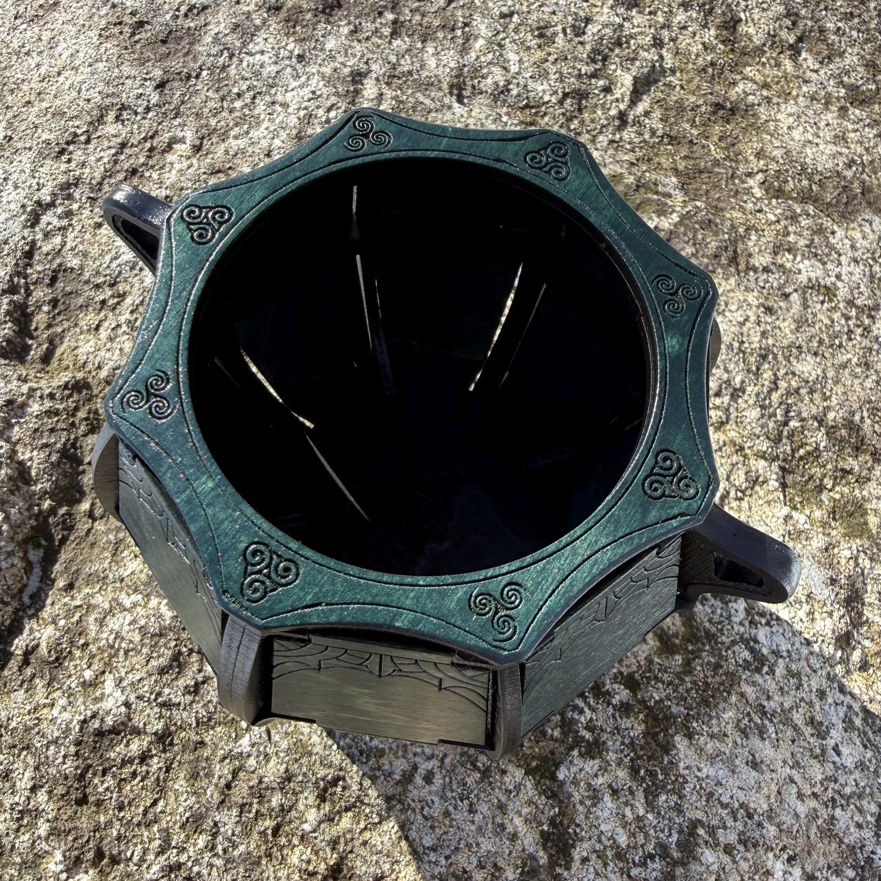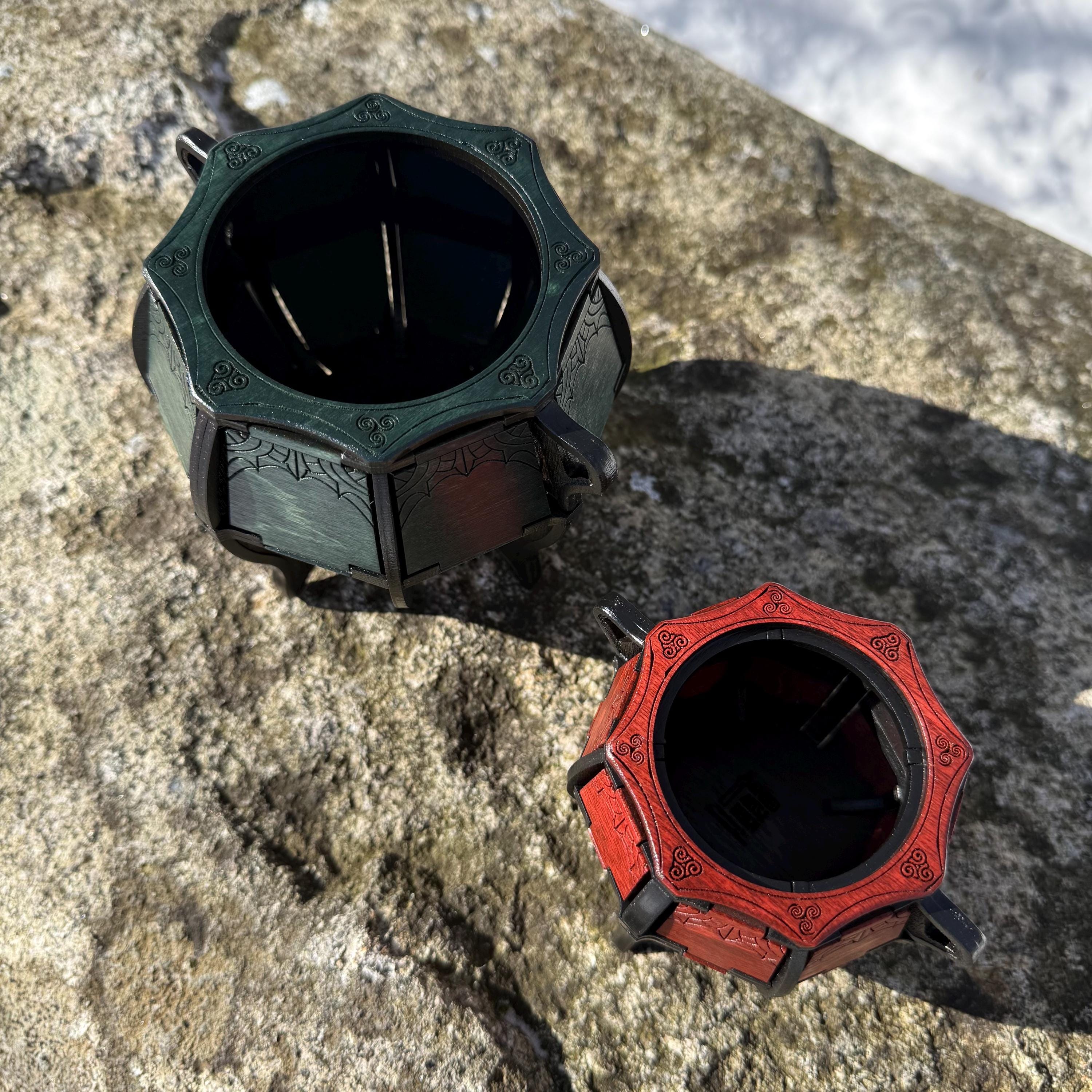 Elevate your game nights and create a warm, inviting ambience in any room with this beautifully crafted wooden cauldron! Laser engraved and handcrafted from birch plywood, this cauldron features a beautifully designed framework with delicately decorated walls and top ring. Alternatively, this cauldron makes a great container for holding small items, change, writing utensils, or any other treasured artifacts! A perfect addition for fans of medieval fantasy and old-timey aesthetics, or for someone who appreciates unique, handcrafted, and functional home decor. Available in two sizes (see "MEASUREMENTS", below).